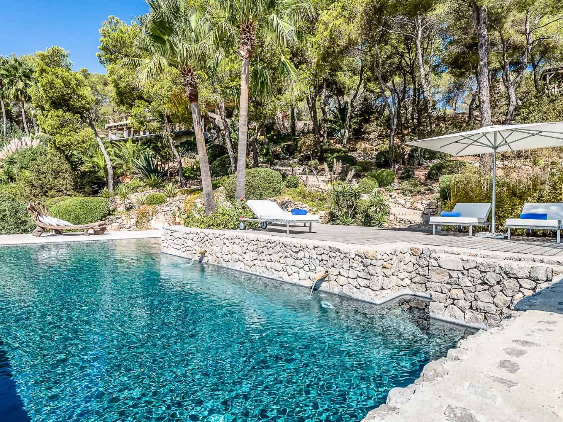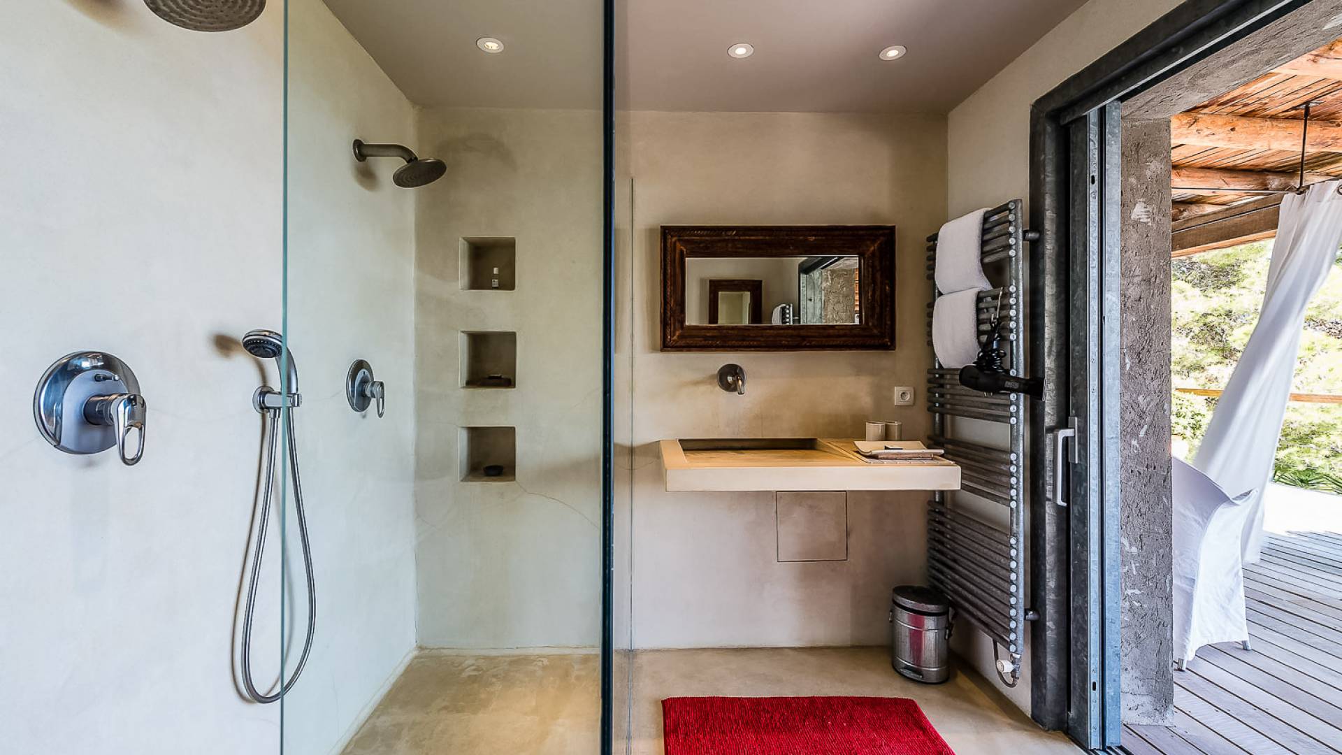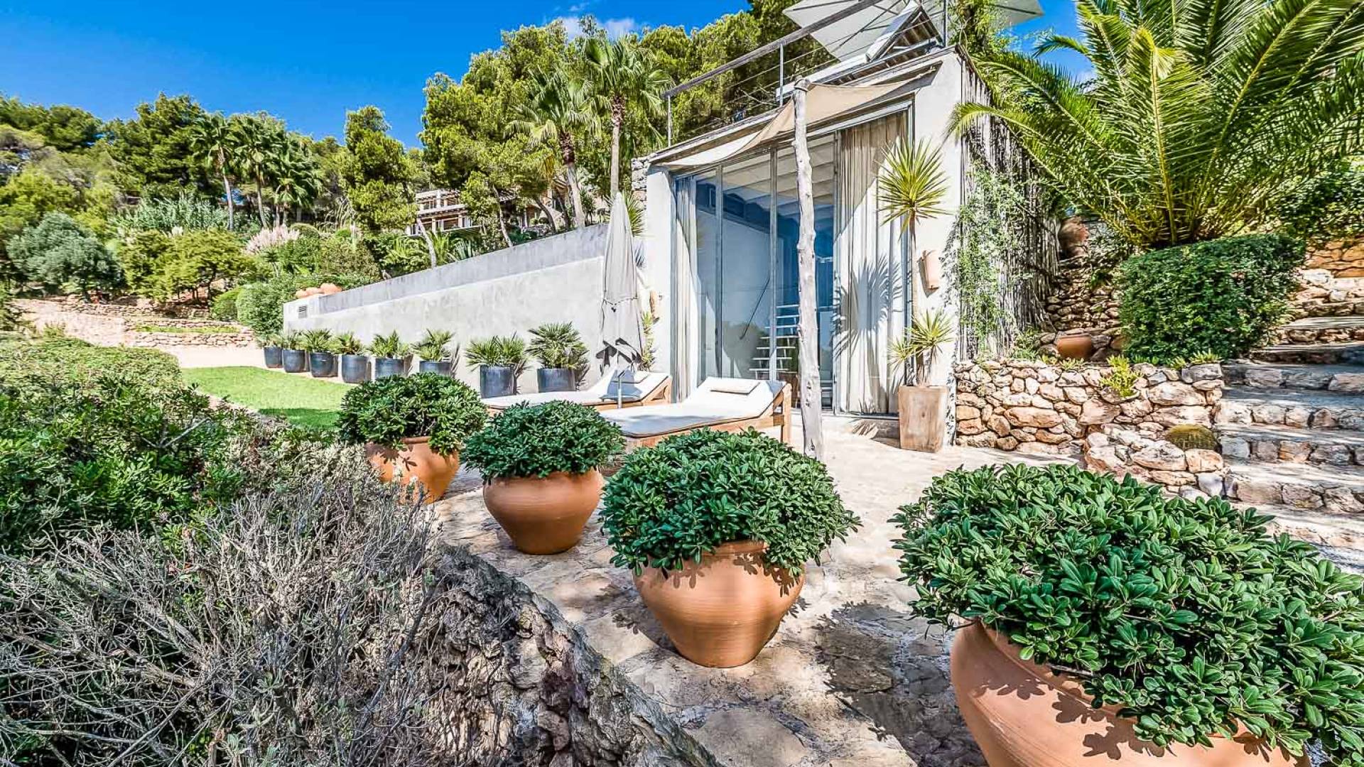 À l'extérieur, il y a un jardin fabuleux, plusieurs terrasses où vous pourrez profiter du soleil autour de la grande piscine, de nombreux coins salons et repas, une cuisine équipée, un garde-manger, des toilettes et une douche.