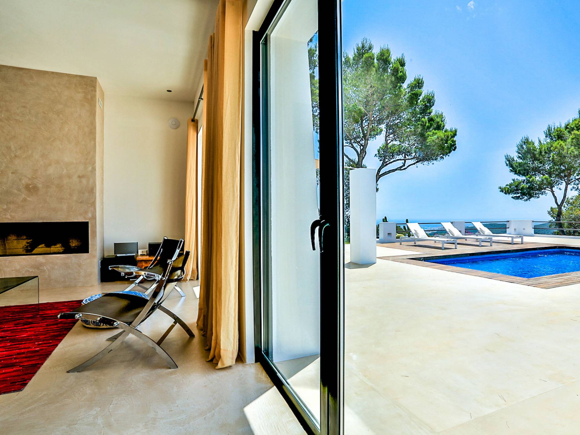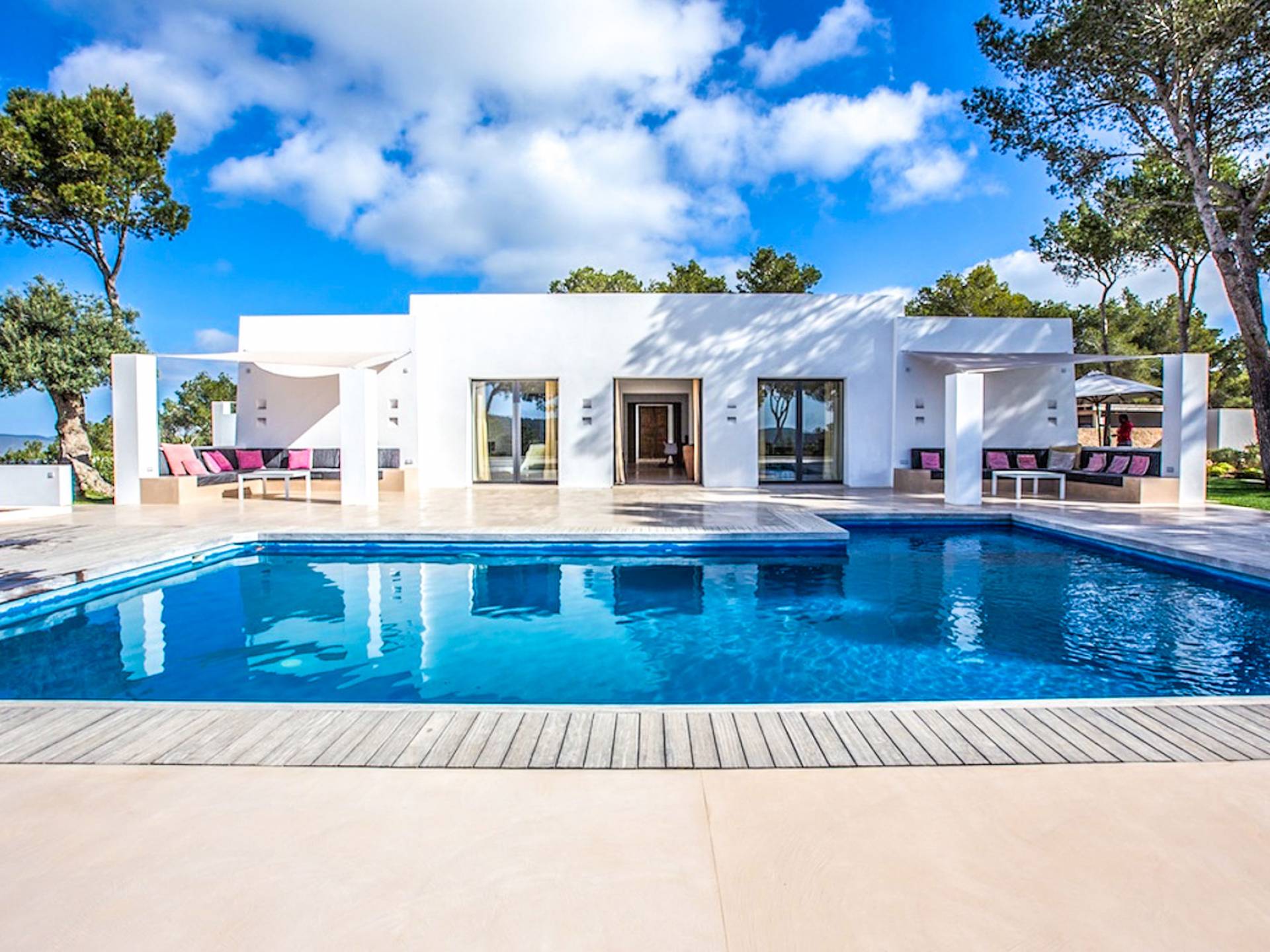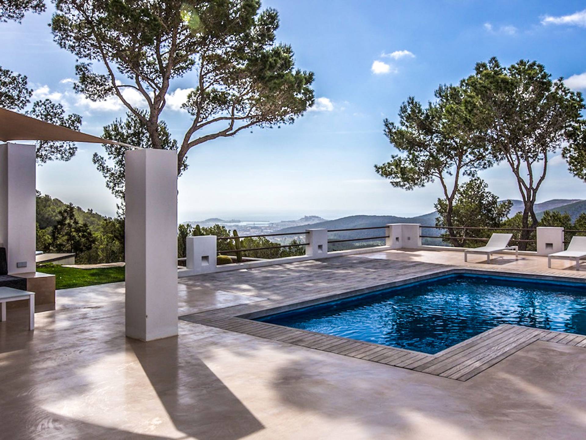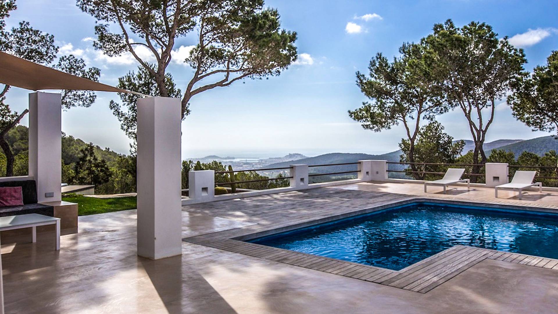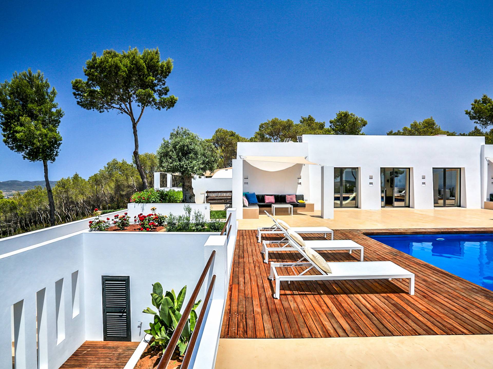 Villa Bella Vista est une location de villa de luxe avec 7 chambres et piscine privée. Idéalement situé au sommet de la montagne moderne Villa Bella Vista Ibiza qui offre une vue sur le coucher et le lever du soleil. La Villa Bella Vista est située dans de superbes jardins juste à l'extérieur de la ville d'Ibiza et offre une vue panoramique fantastique sur la mer, la ville d'Ibiza, Formentera et les couchers de soleil de l'ouest. Il est très bien situé à moins de 10 minutes de certains des meilleurs restaurants et plages de l'île.