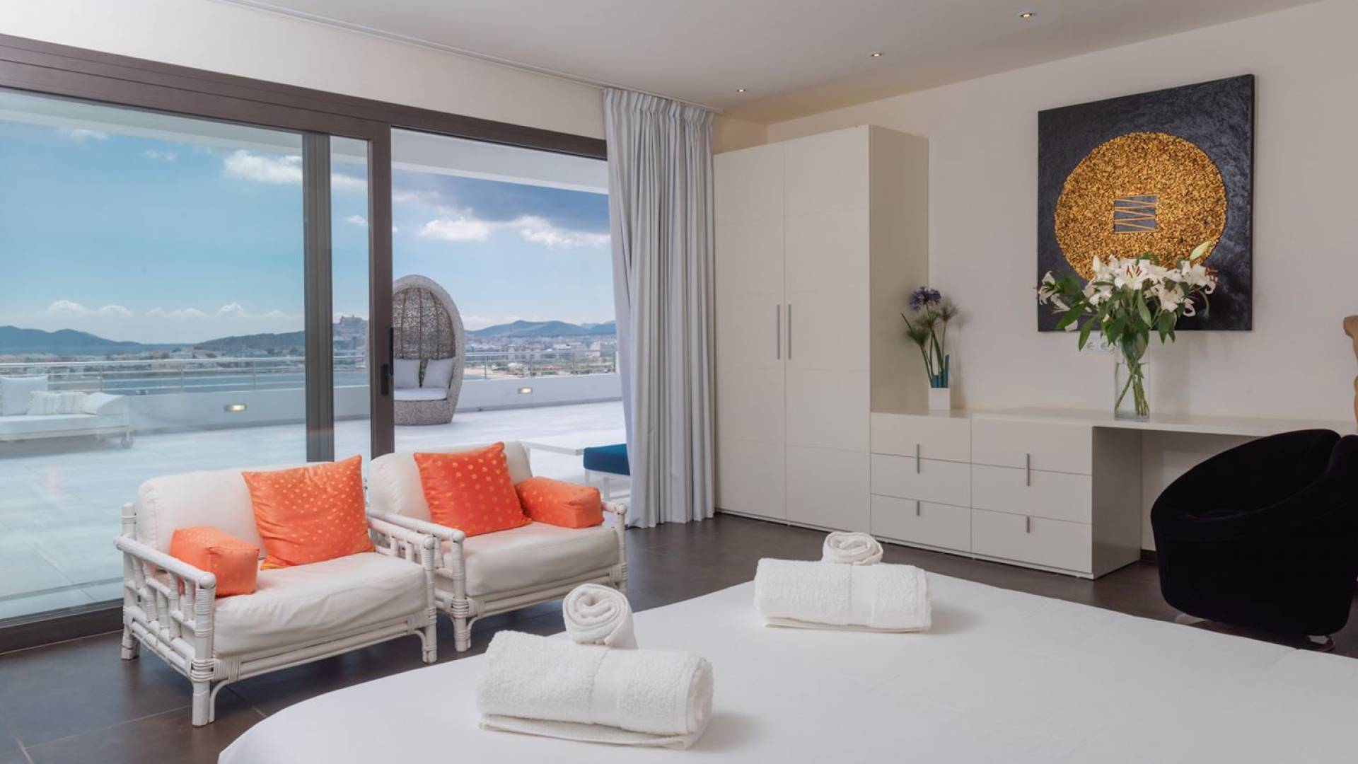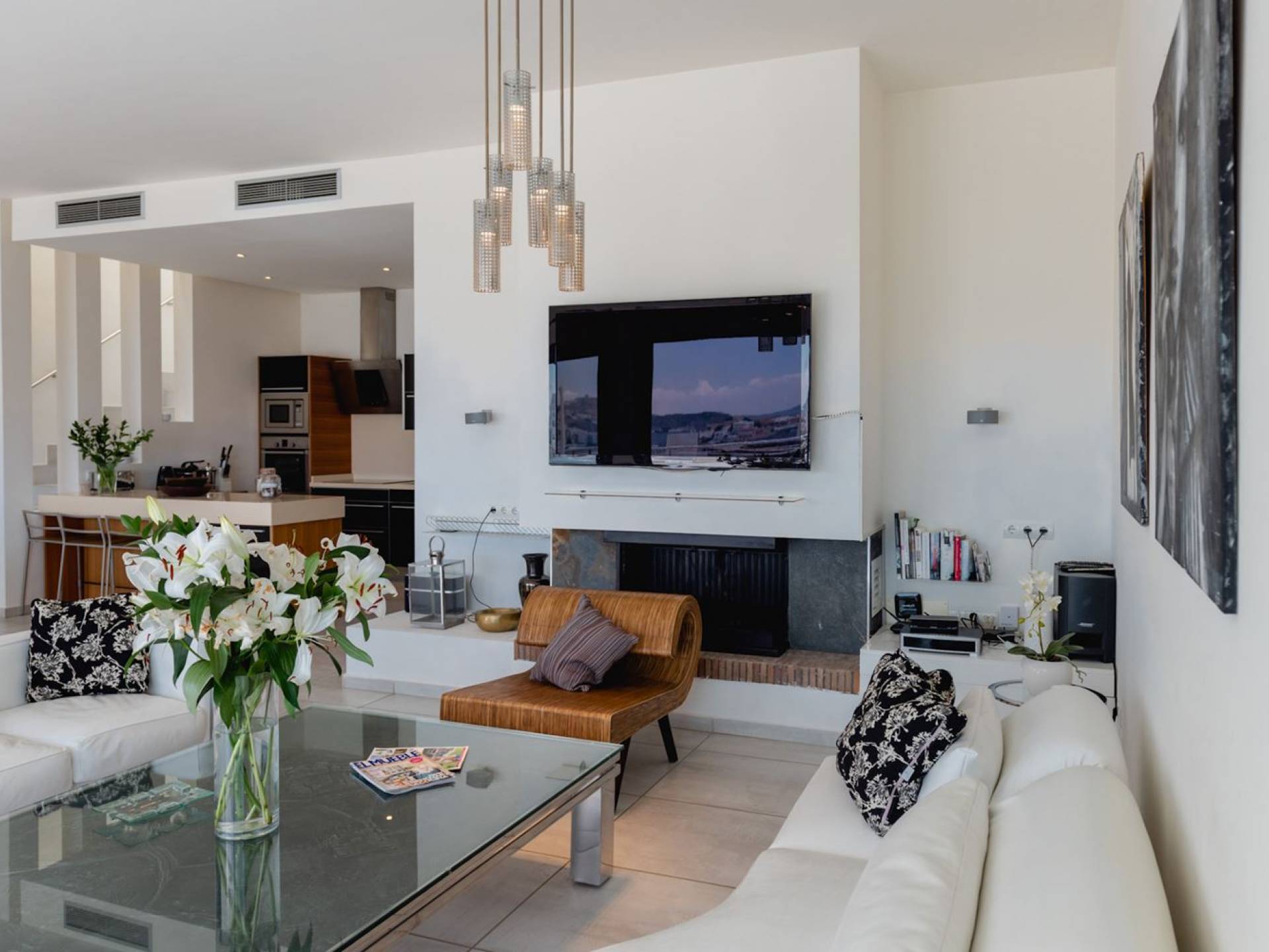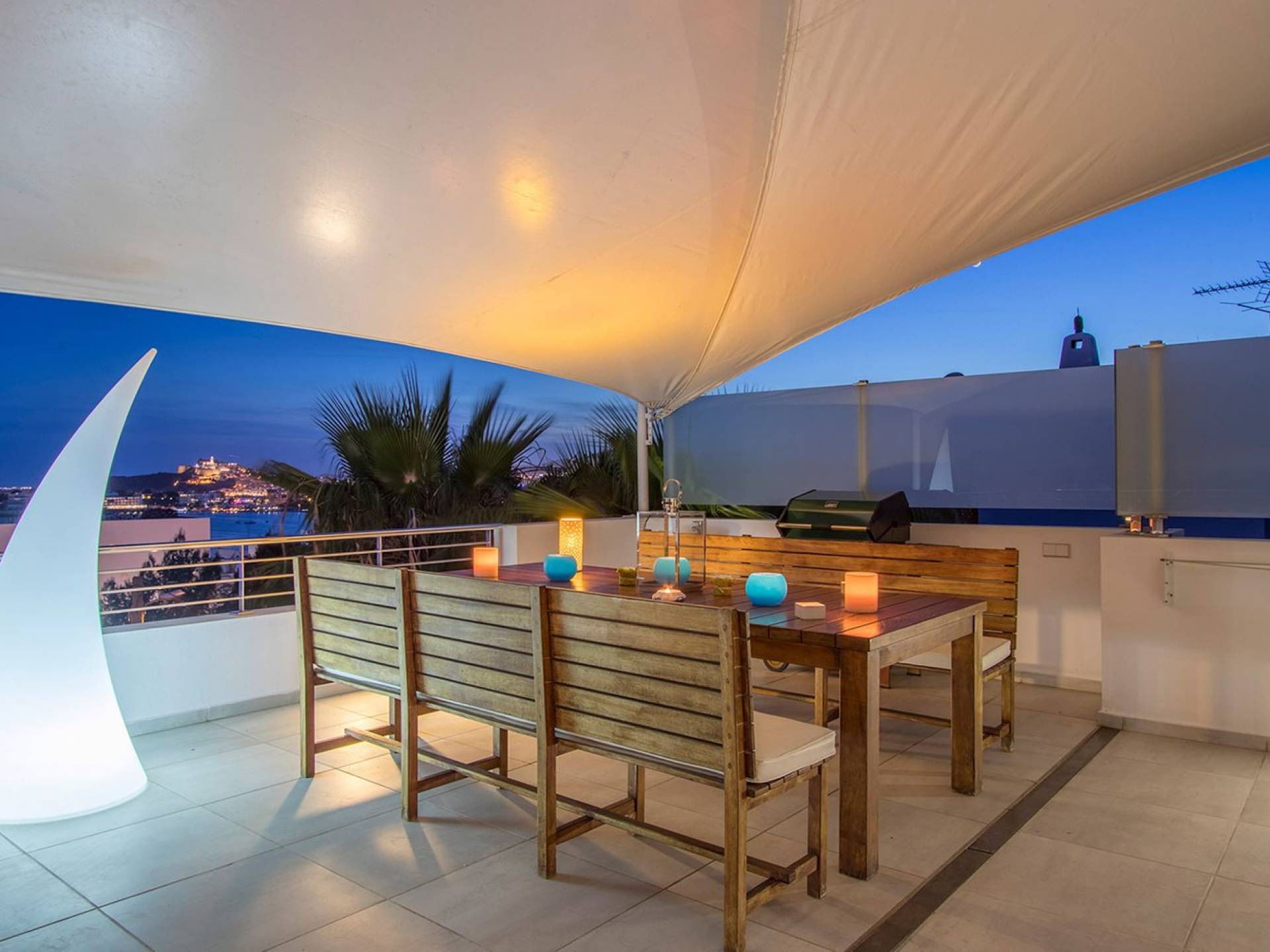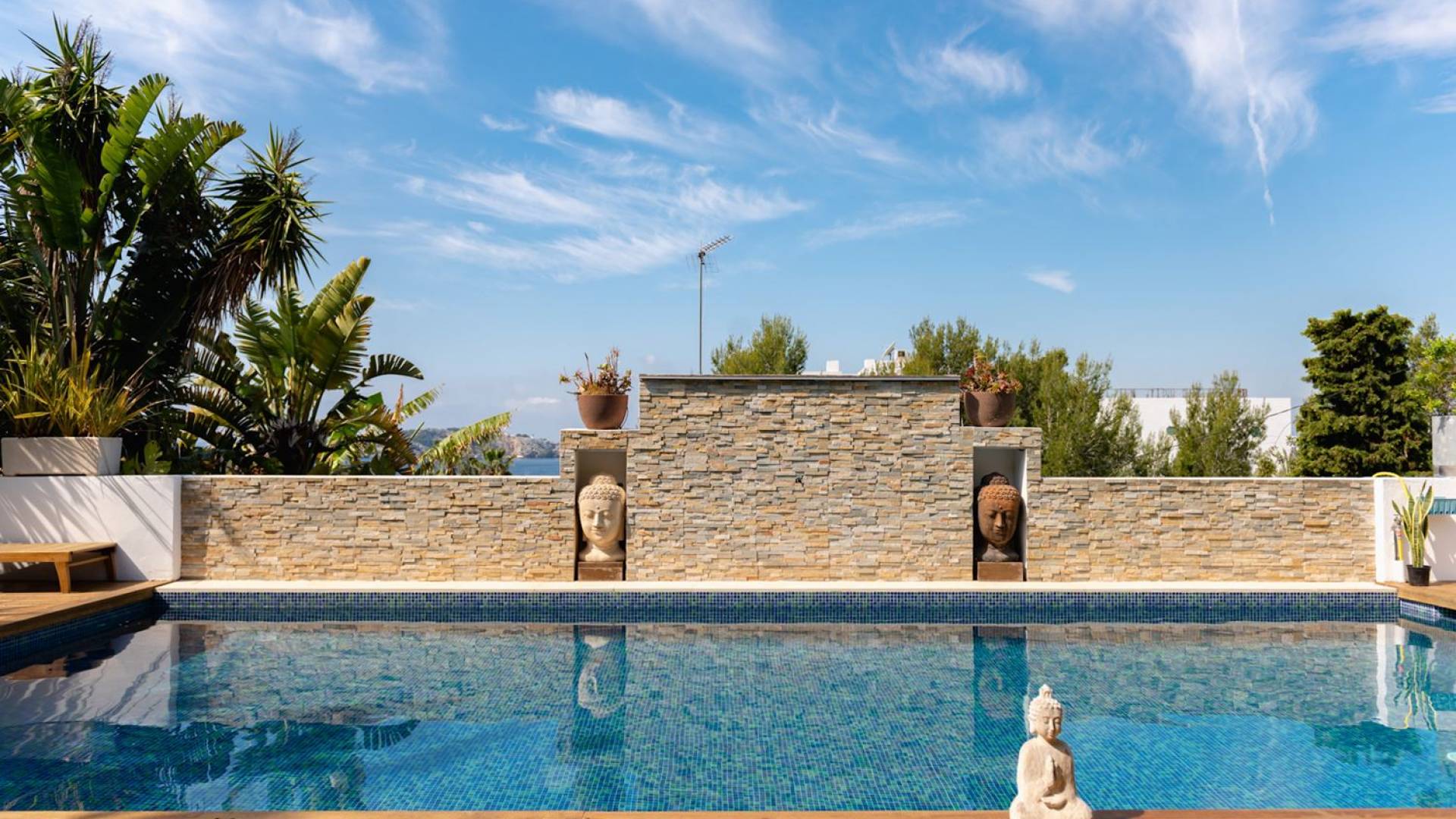 Rez-de-chaussée Grande entrée/salon, cuisine entièrement équipée avec bar, terrasse, 1 salle de bain invité. Deuxième étage Salle de bain invité, grand salon/salle à manger avec accès direct à la terrasse. Le salon est équipé d'un Bose Sound System fixe et d'une autre connexion Bluetooth Bowers & Wilkins portable, d'une télévision, d'une cheminée, d'une kitchenette entièrement équipée et d'une buanderie. Grande terrasse avec salon extérieur, salle à manger d'été équipée d'un barbecue à gaz et d'un évier et vue imprenable sur la ville d'Ibiza. La piscine dispose d'une terrasse en bois entourant la piscine de 9m x 5m, il y a aussi un bar, des hamacs et un grand parasol. Cette zone a également une zone ombragée importante.