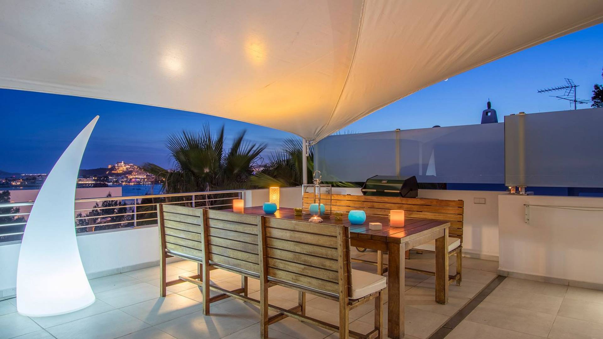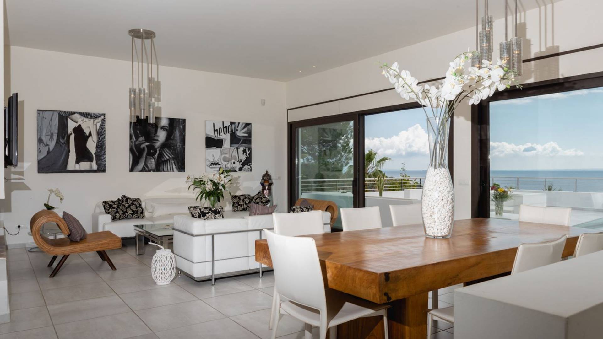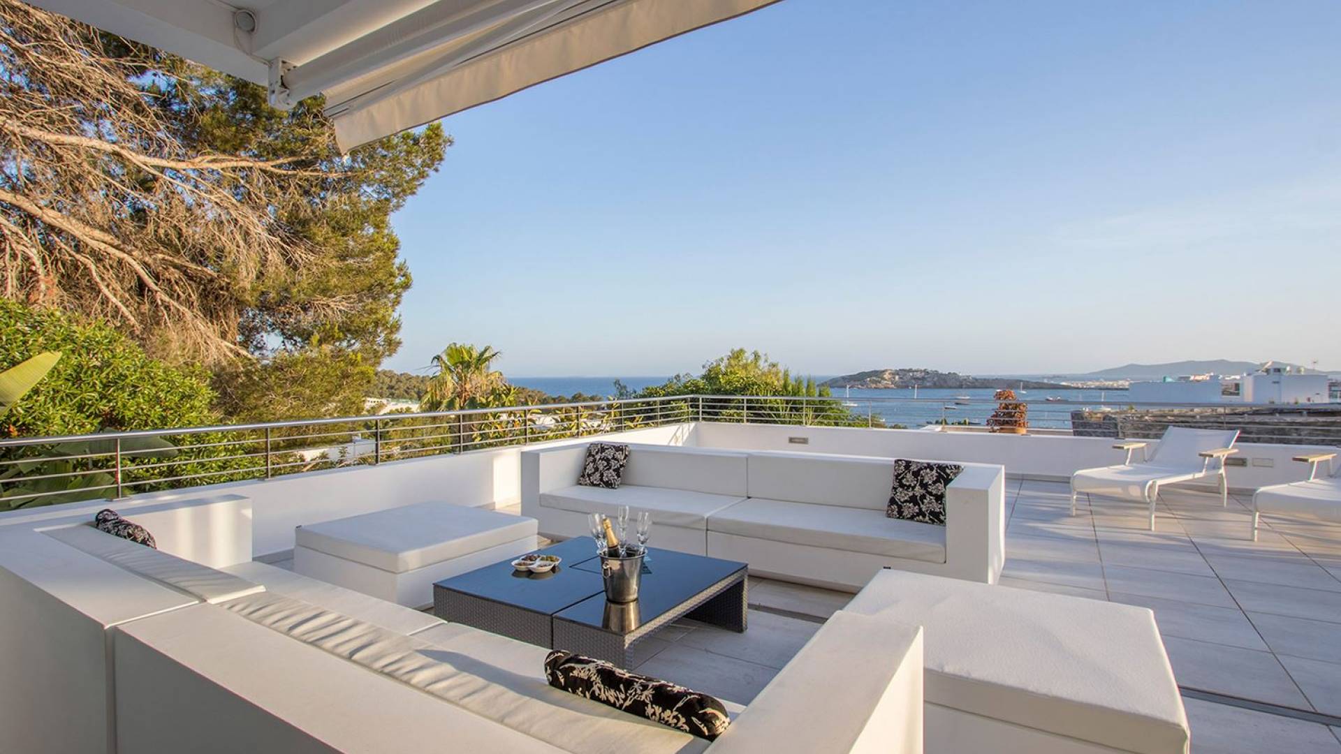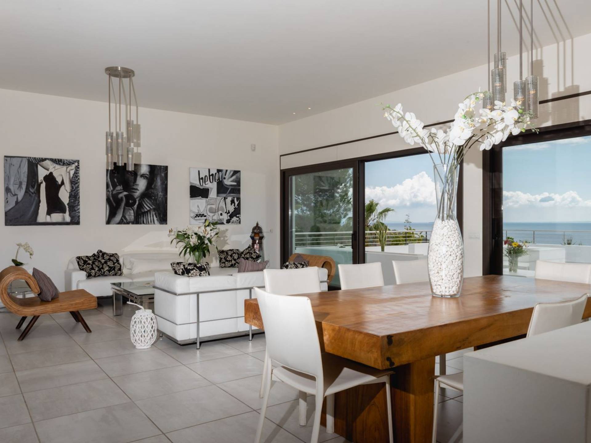 Rez-de-chaussée Grande entrée/salon, cuisine entièrement équipée avec bar, terrasse, 1 salle de bain invité. Deuxième étage Salle de bain invité, grand salon/salle à manger avec accès direct à la terrasse. Le salon est équipé d'un Bose Sound System fixe et d'une autre connexion Bluetooth Bowers & Wilkins portable, d'une télévision, d'une cheminée, d'une kitchenette entièrement équipée et d'une buanderie. Grande terrasse avec salon extérieur, salle à manger d'été équipée d'un barbecue à gaz et d'un évier et vue imprenable sur la ville d'Ibiza. La piscine dispose d'une terrasse en bois entourant la piscine de 9m x 5m, il y a aussi un bar, des hamacs et un grand parasol. Cette zone a également une zone ombragée importante.