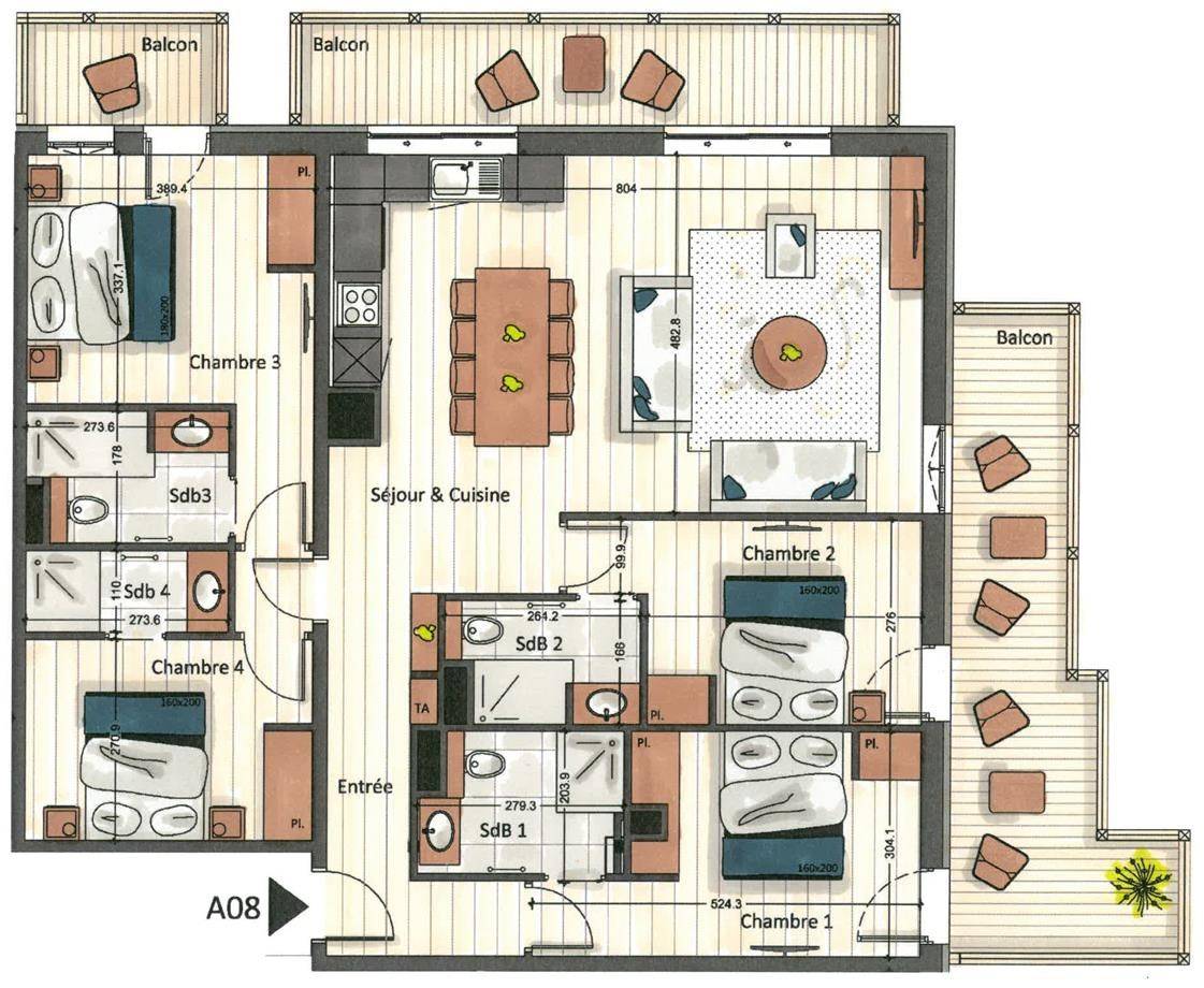 La suite Hanuman, située au 4ème étage de la Résidence Manali Lodge, d'une superficie de 120 m², est parfaite pour accueillir jusqu'à 8 personnes. Cette suite dispose de quatre chambres avec un lit double et de quatre salles de bains privatives. Le séjour avec TV dispose également d'une cuisine entièrement équipée et d'un grand balcon avec vue sur le front de neige de Courchevel 1650. Pendant vos vacances, vous pourrez bénéficier d'une place de parking dans le parking privé, d'un casier à skis et du Wi-Fi. Accès Wi-Fi.