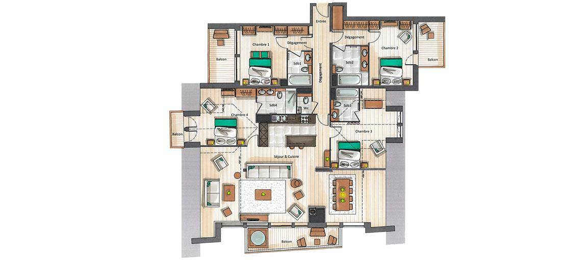 Le penthouse C15, situé au 4ème étage de la Résidence Keystone Lodge Courchevel 1650, d'une superficie de 207 m², est parfait pour accueillir jusqu'à 8 personnes.