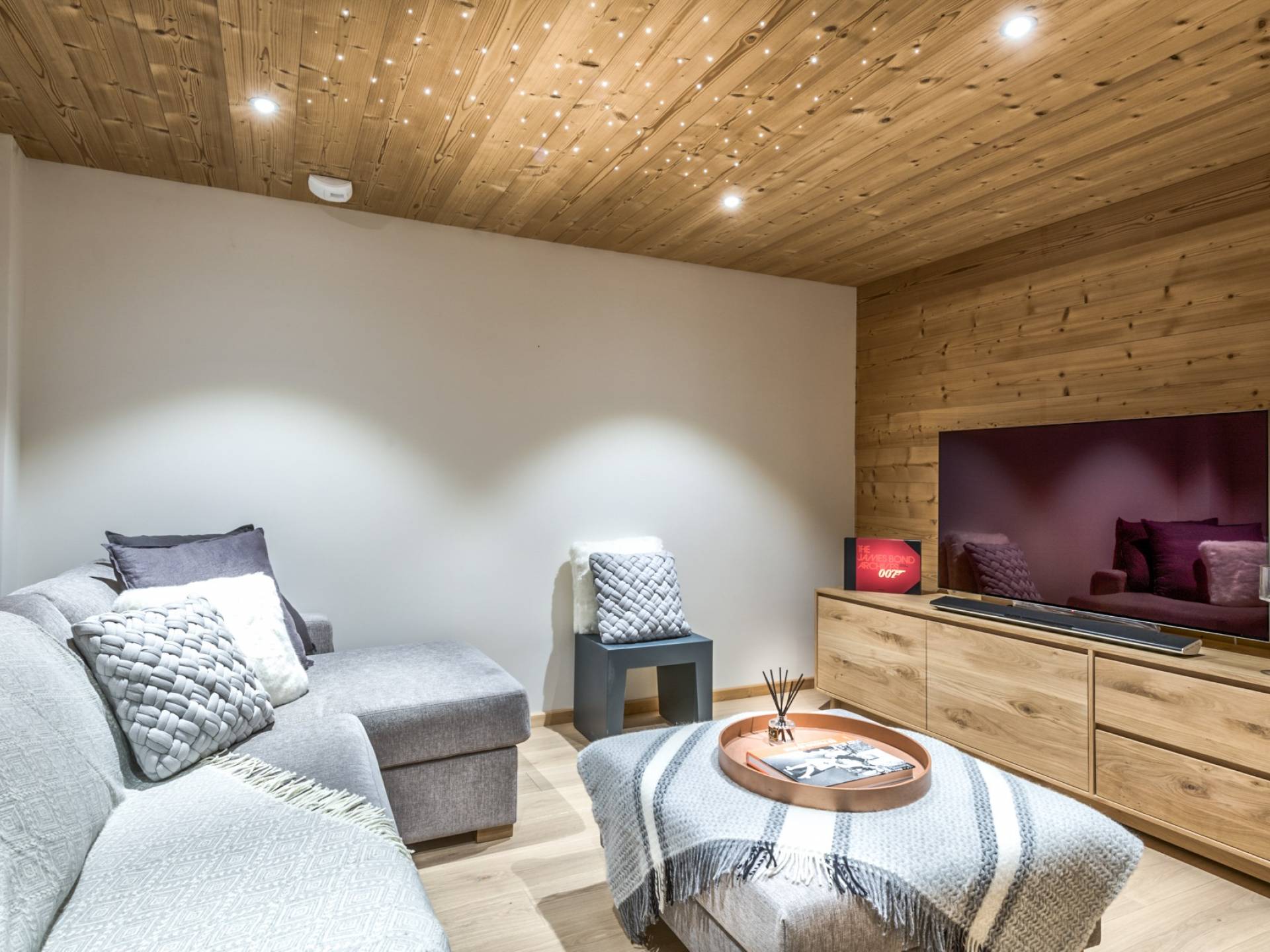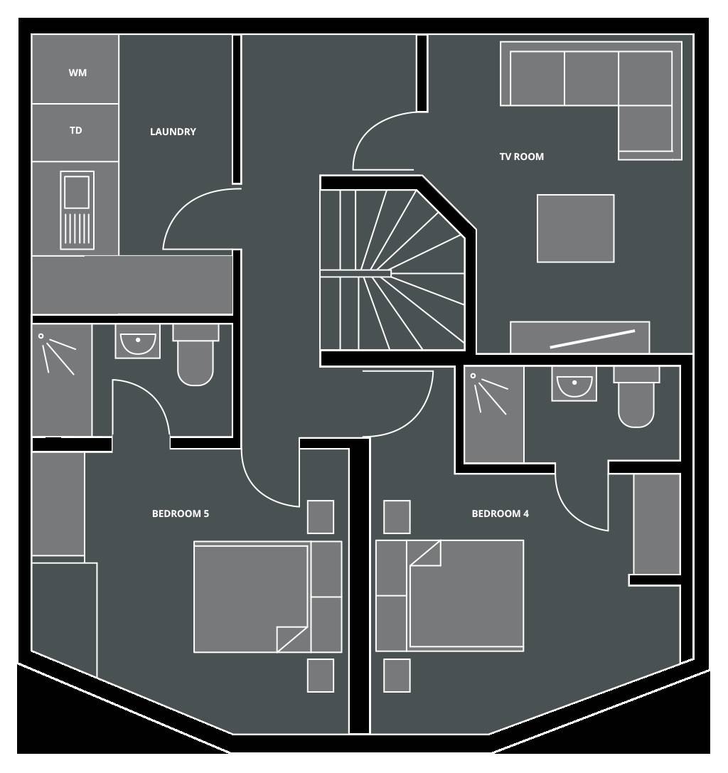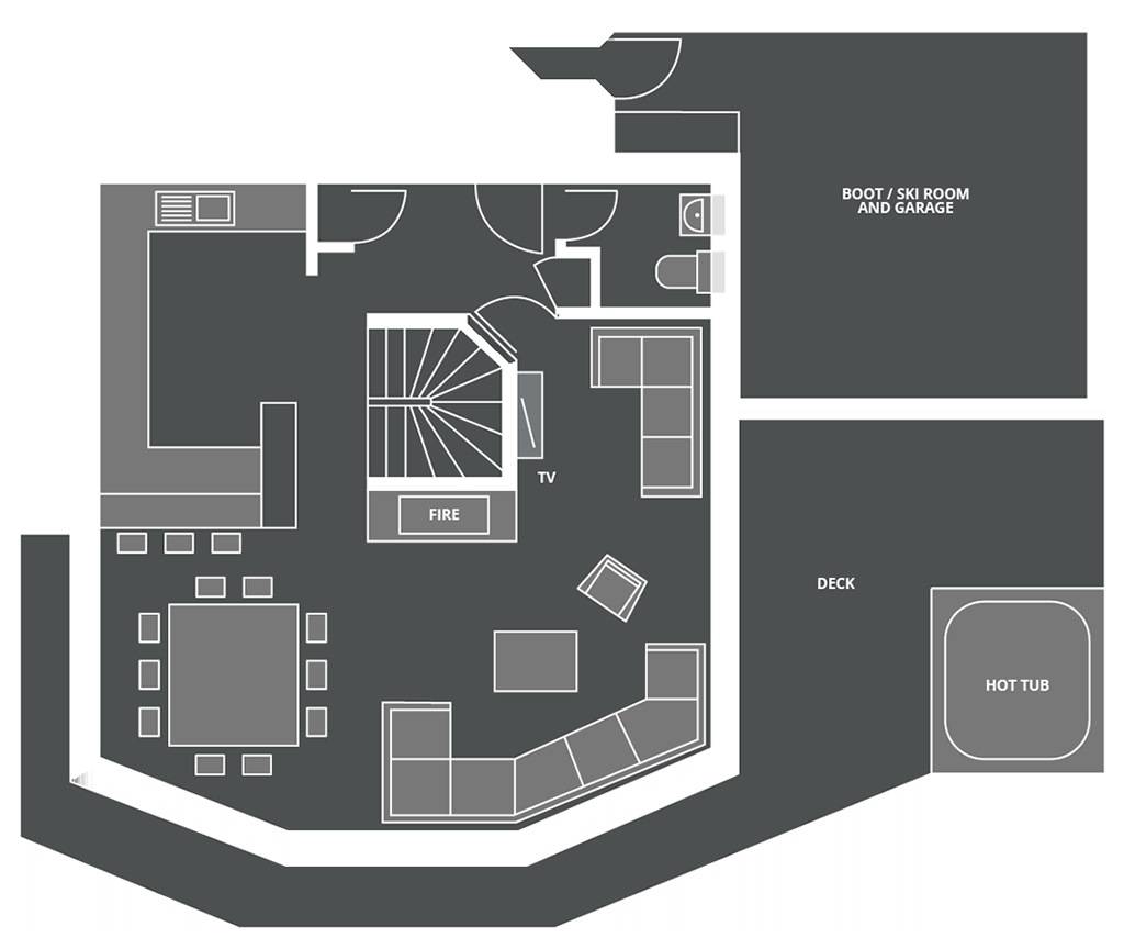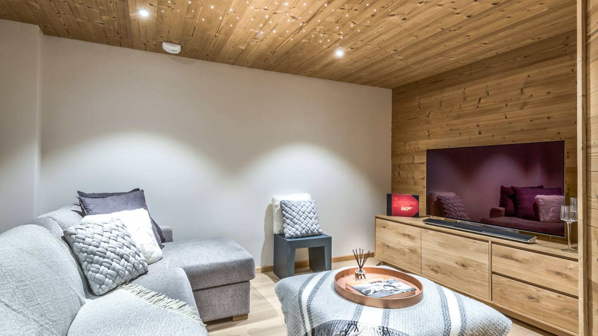 Au niveau inférieur du chalet, il y a deux chambres, une salle de cinéma et une buanderie. Avec ses plafonniers scintillants et sa télévision UK Sky, la salle de cinéma est parfaite pour se détendre et regarder un film après une journée à la montagne. Le canapé ici est convertible offrant des couchages flexibles pour les invités et peut être configuré en lit double si nécessaire. Les chambres du rez-de-chaussée peuvent toutes être aménagées en lits jumeaux ou en super king et chacune a sa propre salle de douche attenante. La buanderie est un espace d'accueil et pratique pour les familles et dispose d'un lave-linge et d'un sèche-linge à disposition des clients.