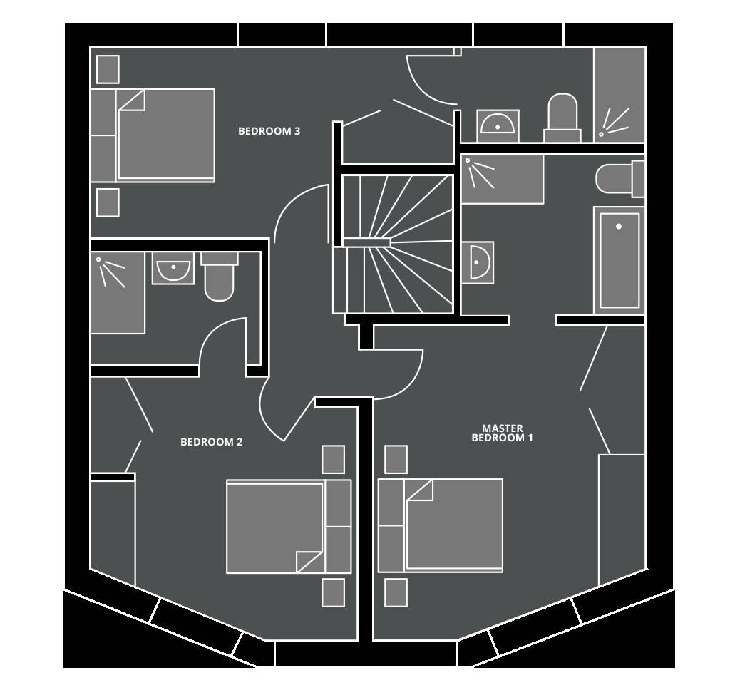 Le niveau supérieur mène à trois chambres spacieuses, toutes avec salle de bains privative. Deux chambres peuvent être configurées en chambre lits jumeaux ou en chambre super king tandis que la troisième dispose d'un lit king-size permanent. La chambre lit king-size dispose d'une salle de douche, tout comme l'une des autres chambres, tandis que la chambre principale dispose à la fois d'une baignoire et d'une douche dans la salle de bains.