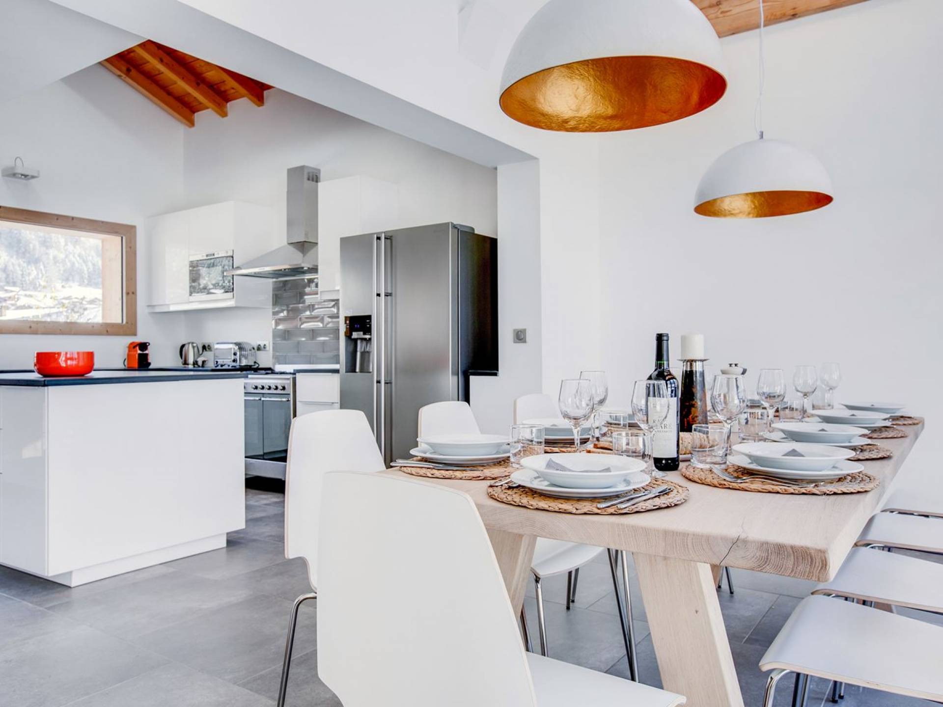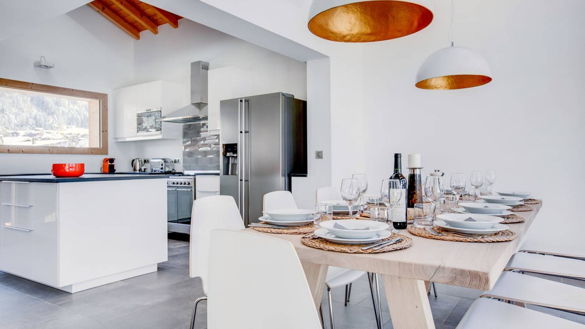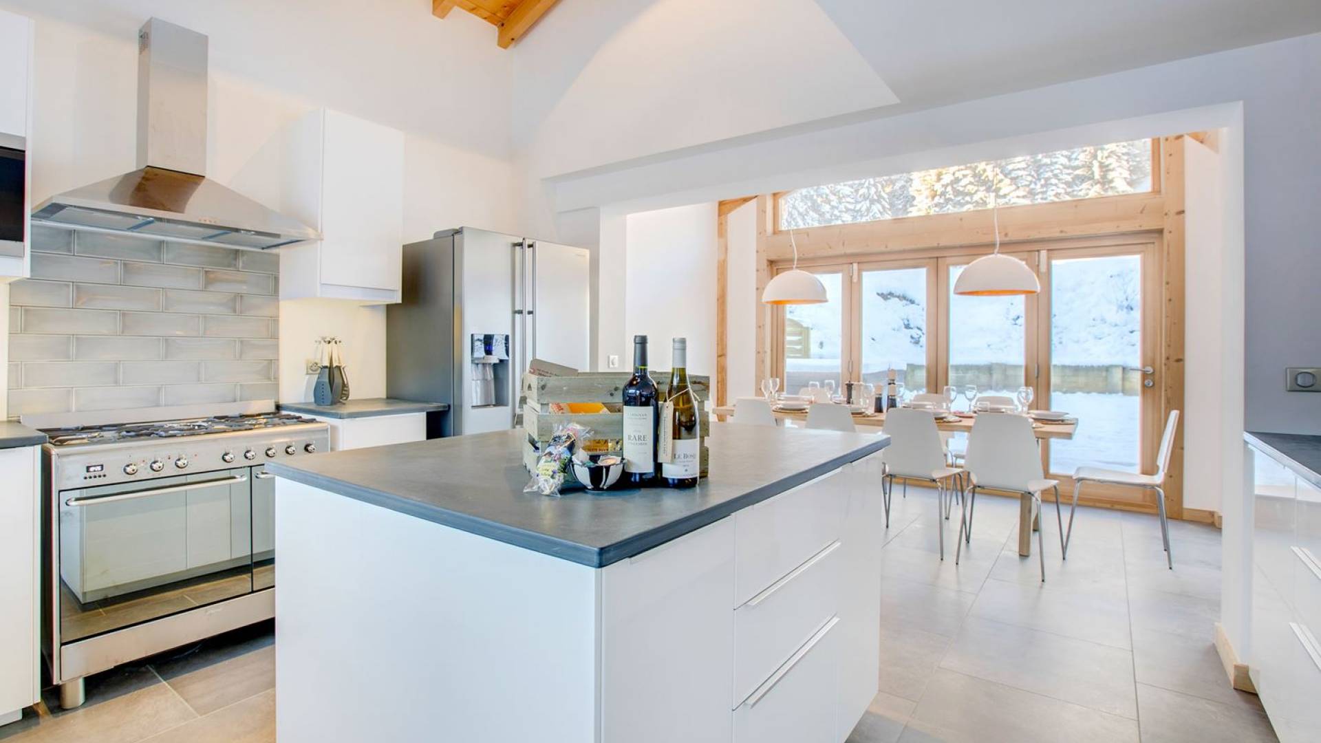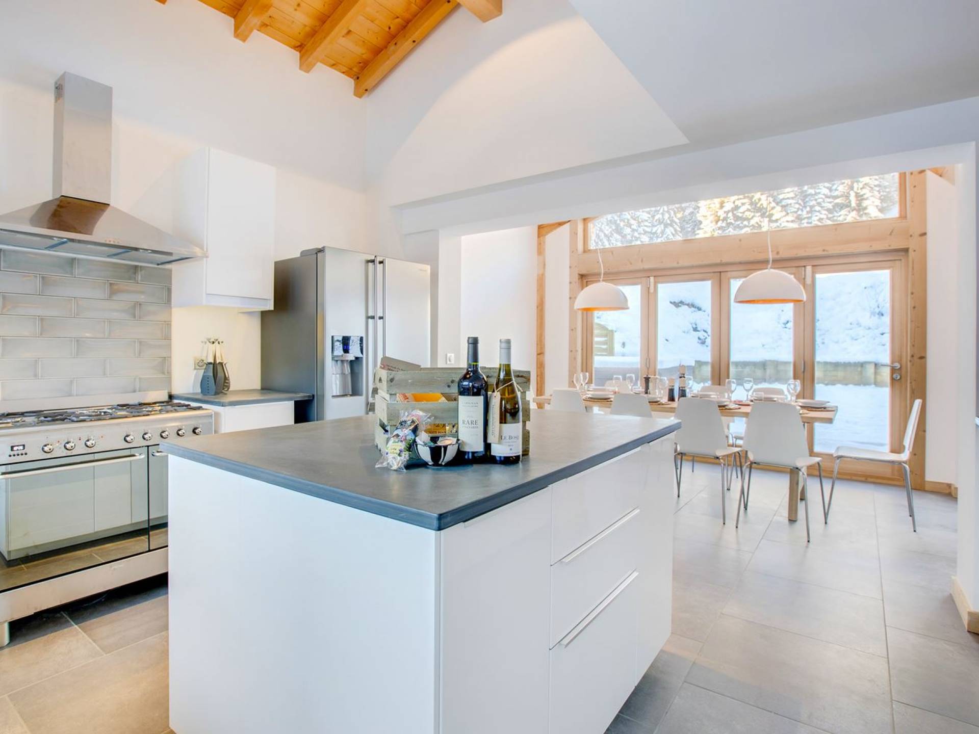 La cuisine moderne du chalet est entièrement équipée et dispose d'un îlot avec beaucoup d'espace de surface, parfait pour se divertir après une journée amusante à la montagne. Parmi les nombreux appareils, il y a une gamme Smeg, une machine Nespresso, un grille-pain Dualit et un réfrigérateur-congélateur américain, c'est donc vraiment votre maison loin de chez vous.
