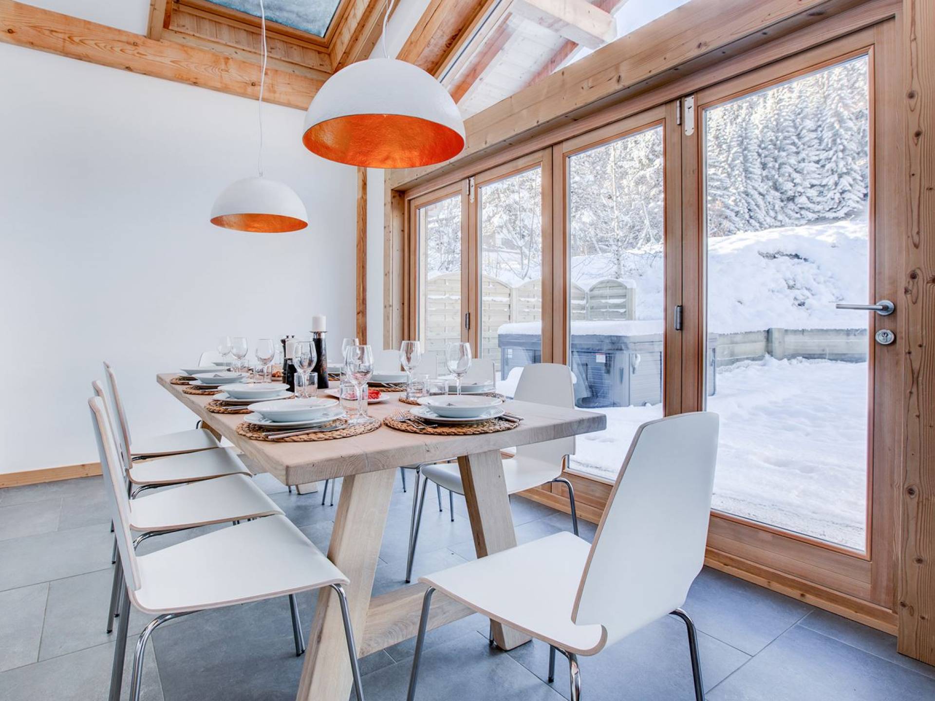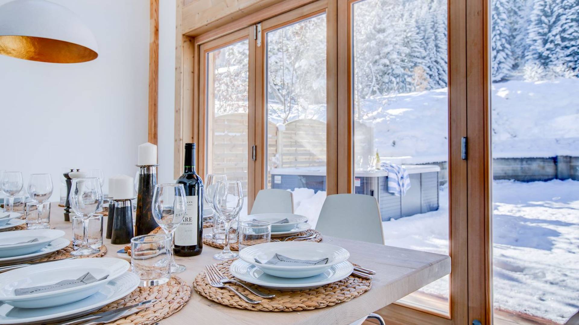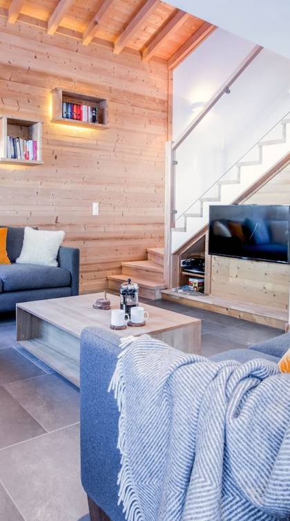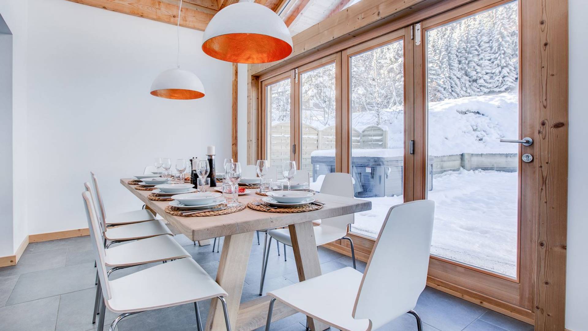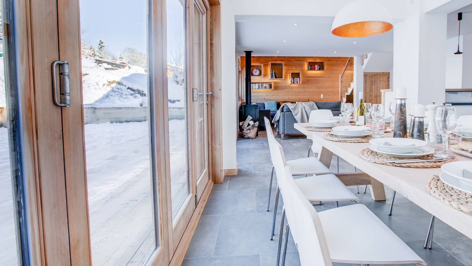 En montant les escaliers, vous arrivez dans le salon lumineux et spacieux. Votre attention est immédiatement attirée par les fabuleuses vues sur les montagnes affichées à travers les grandes fenêtres et le plafond voûté. À côté de la table à manger en chêne massif, les portes vitrées pliantes donnent sur un magnifique jardin privé avec terrasse où vous trouverez le bain à remous extérieur. Comme il n'y a pas de chalets directement derrière Les Trois Bonheurs, le jardin a une belle sensation isolée.
