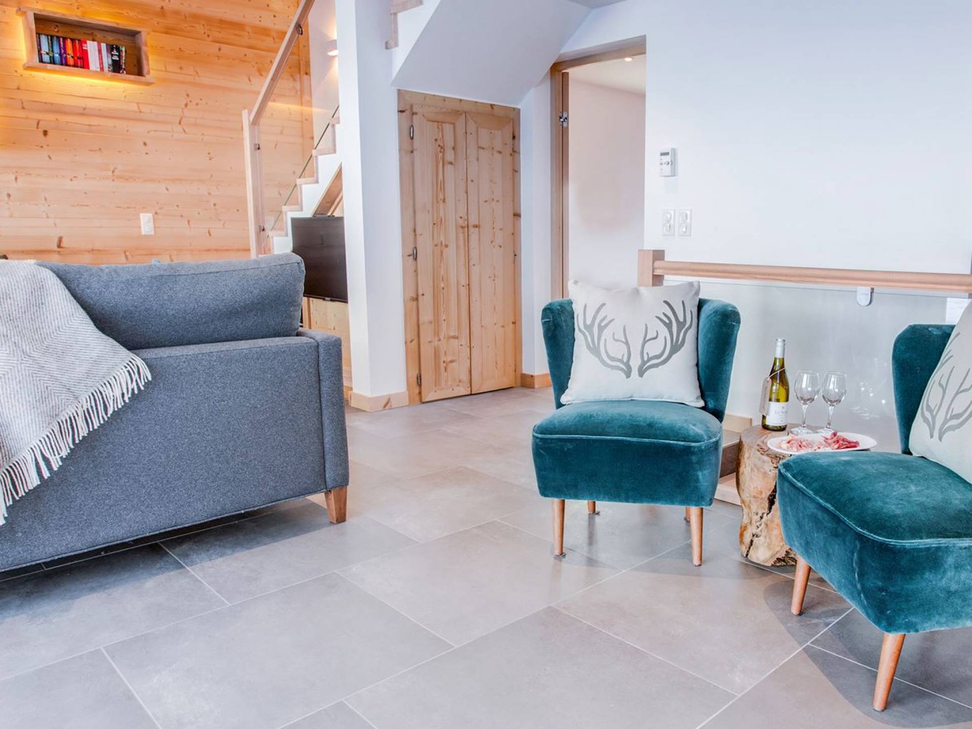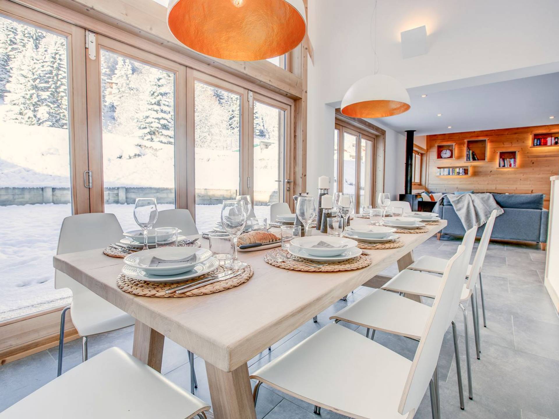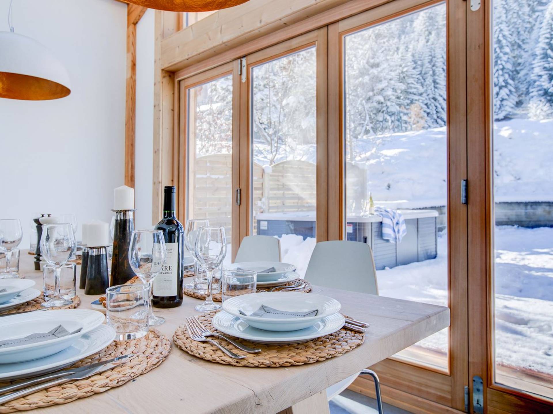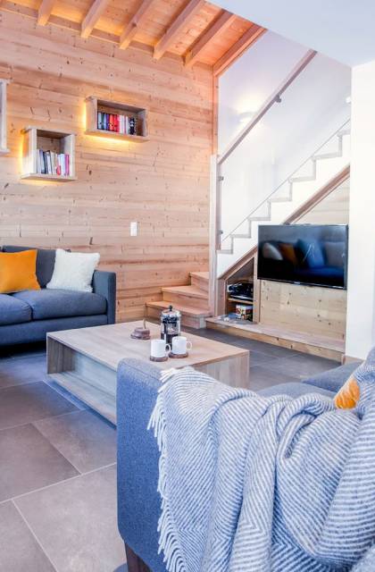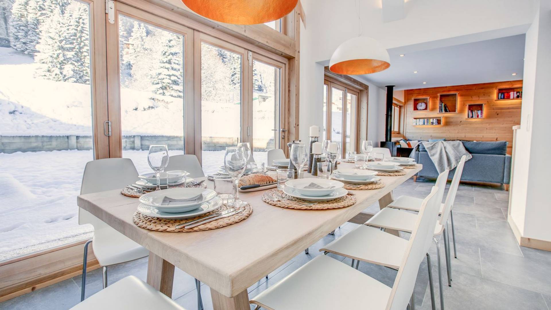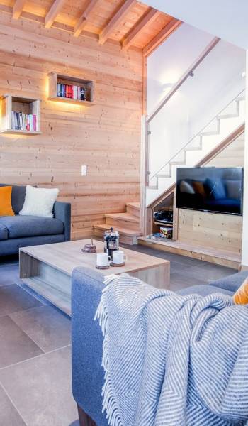 En montant les escaliers, vous arrivez dans le salon lumineux et spacieux. Votre attention est immédiatement attirée par les fabuleuses vues sur les montagnes affichées à travers les grandes fenêtres et le plafond voûté. À côté de la table à manger en chêne massif, les portes vitrées pliantes donnent sur un magnifique jardin privé avec terrasse où vous trouverez le bain à remous extérieur. Comme il n'y a pas de chalets directement derrière Les Trois Bonheurs, le jardin a une belle sensation isolée.
