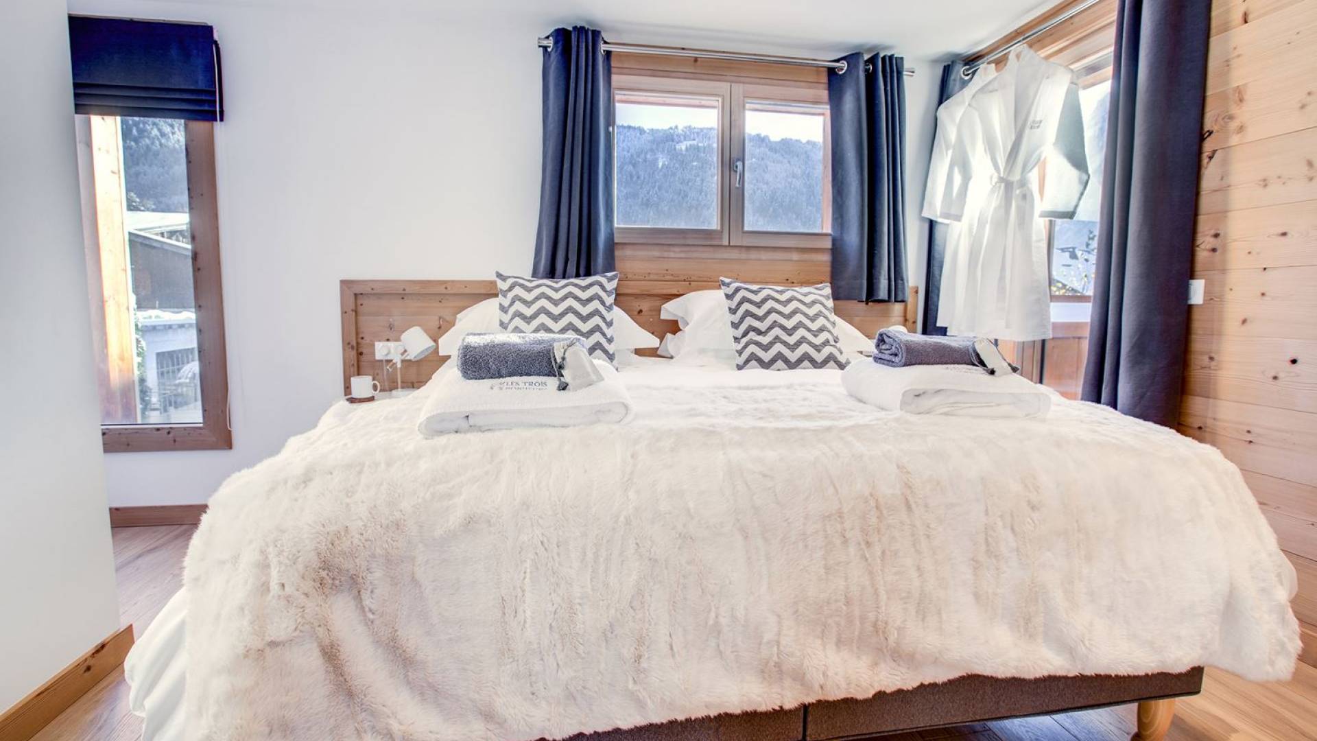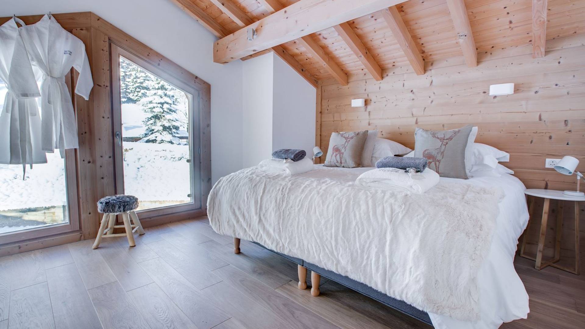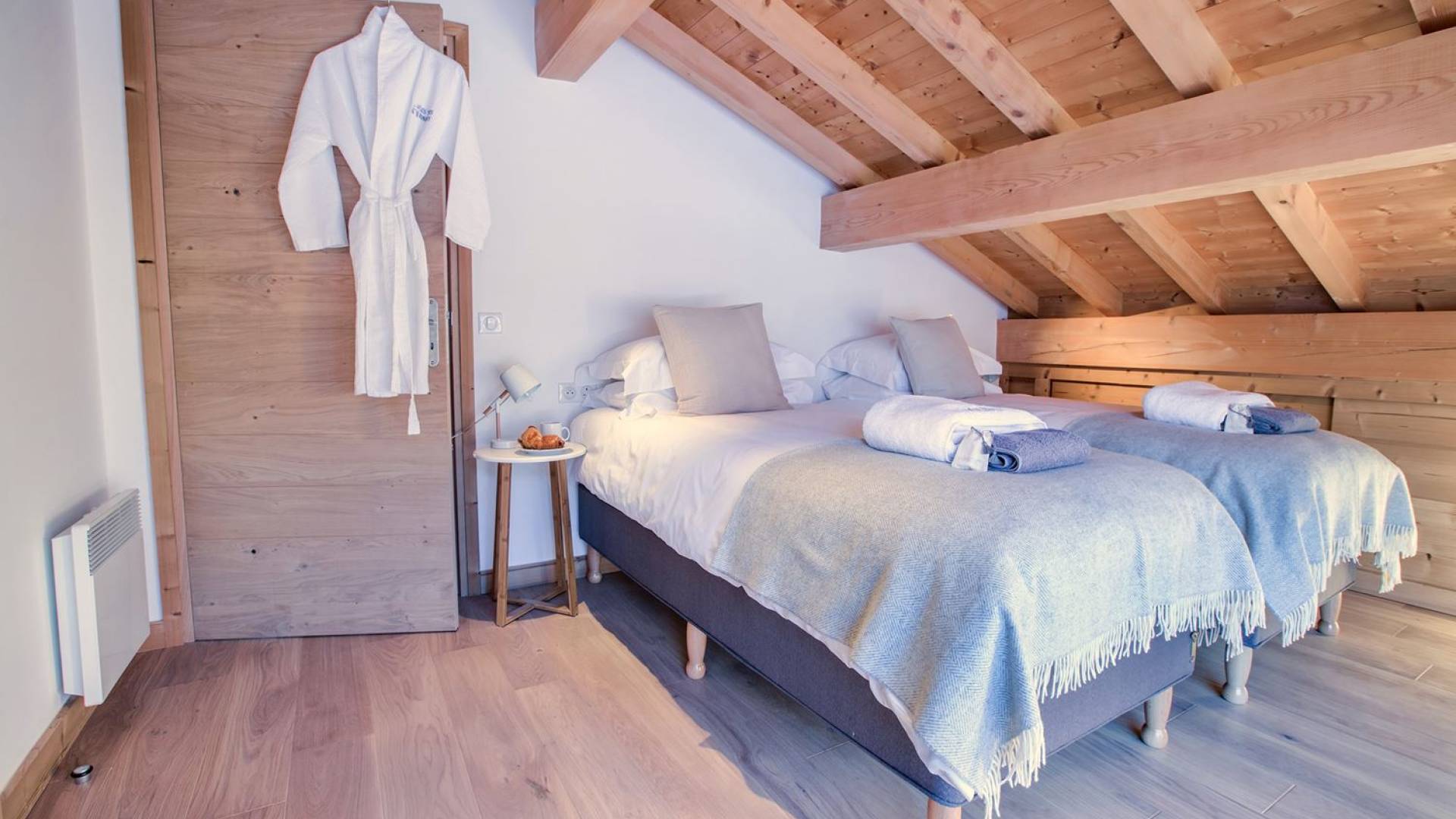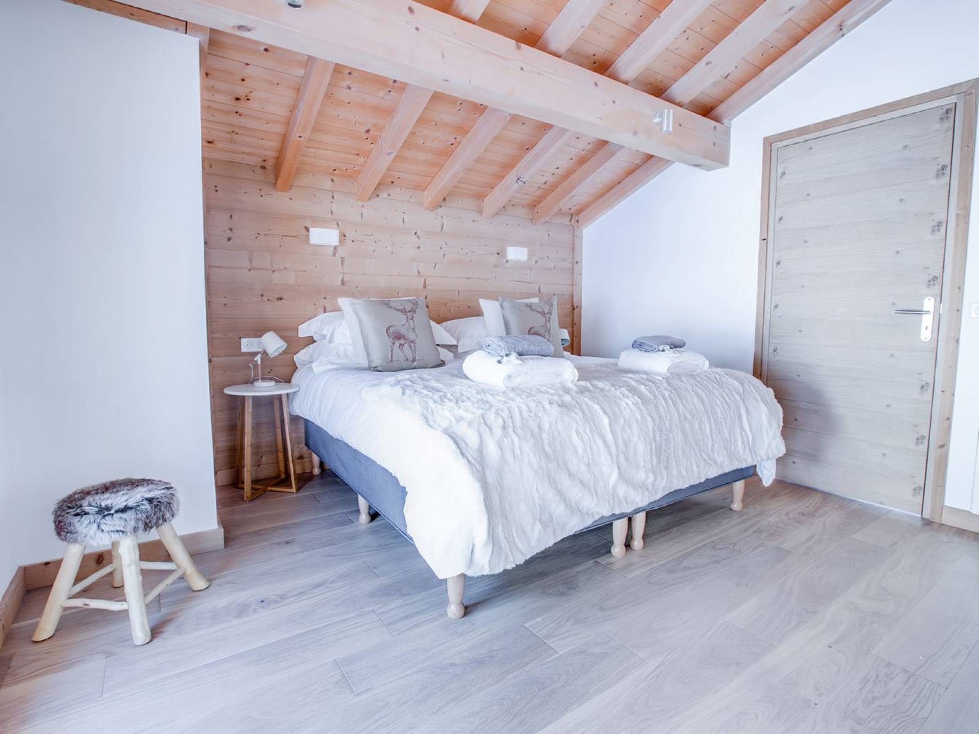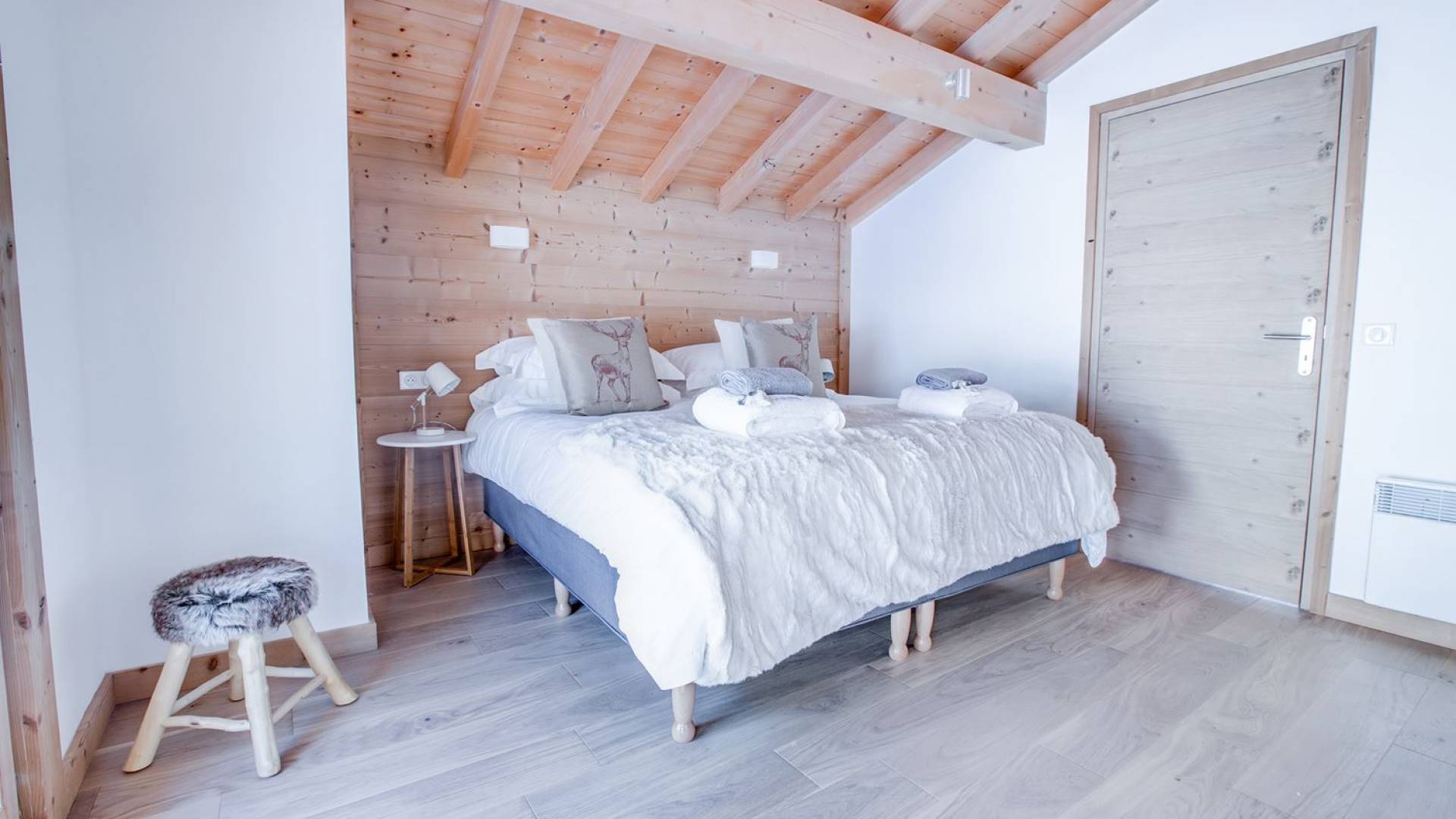 Les chambres 4 et 5 sont situées à l'étage dans le haut toit en pente et ces chambres lumineuses offrent de superbes vues. La chambre 4 a un balcon Juliette avec des doubles portes donnant sur le jardin et les montagnes derrière le chalet. Le balcon de la chambre 5 est privé et couvert et offre une vue sur l'avant du chalet.