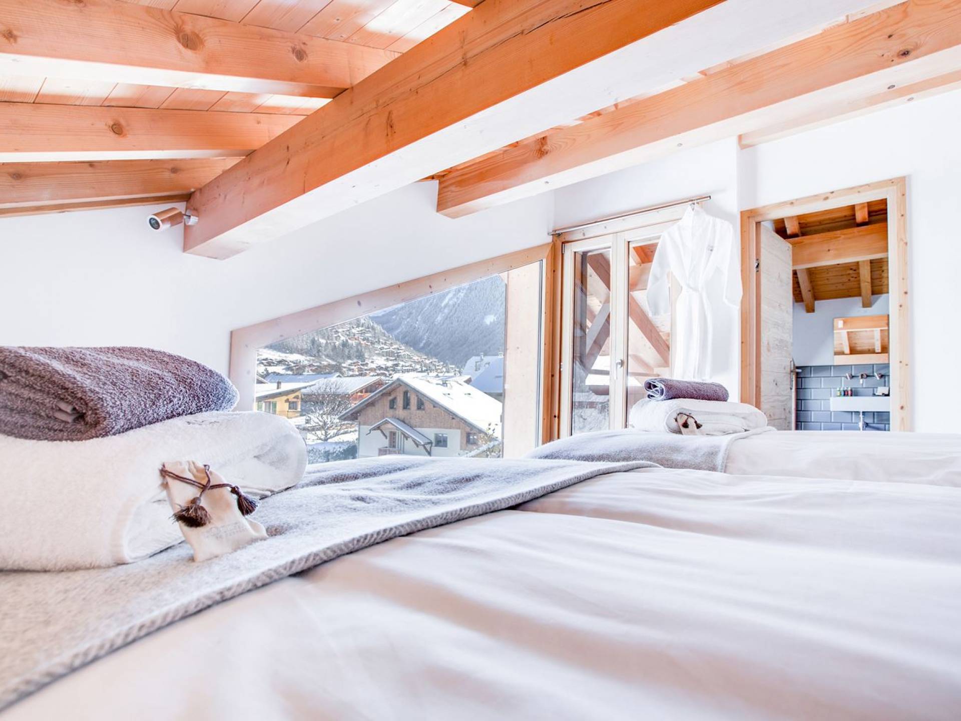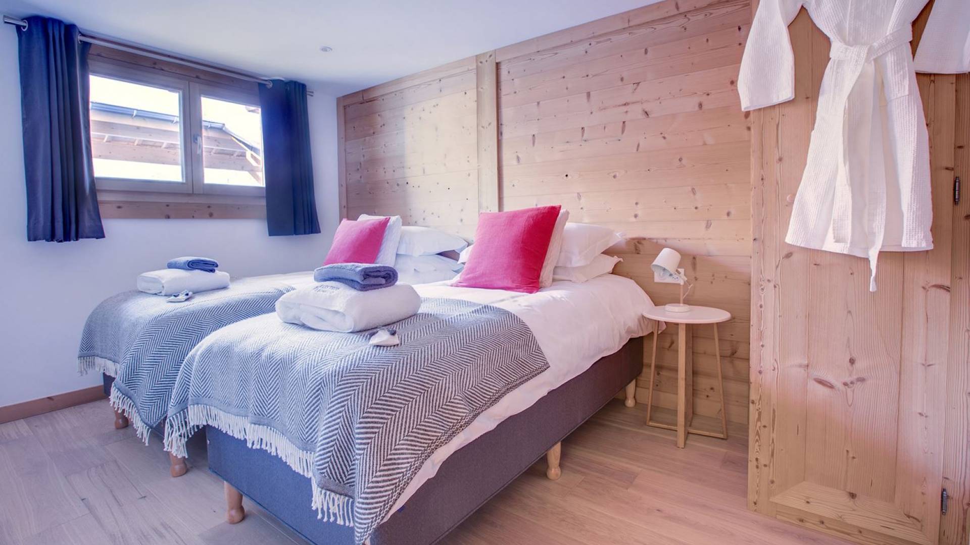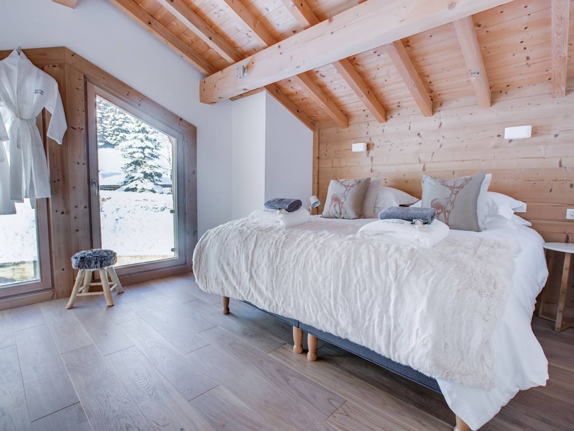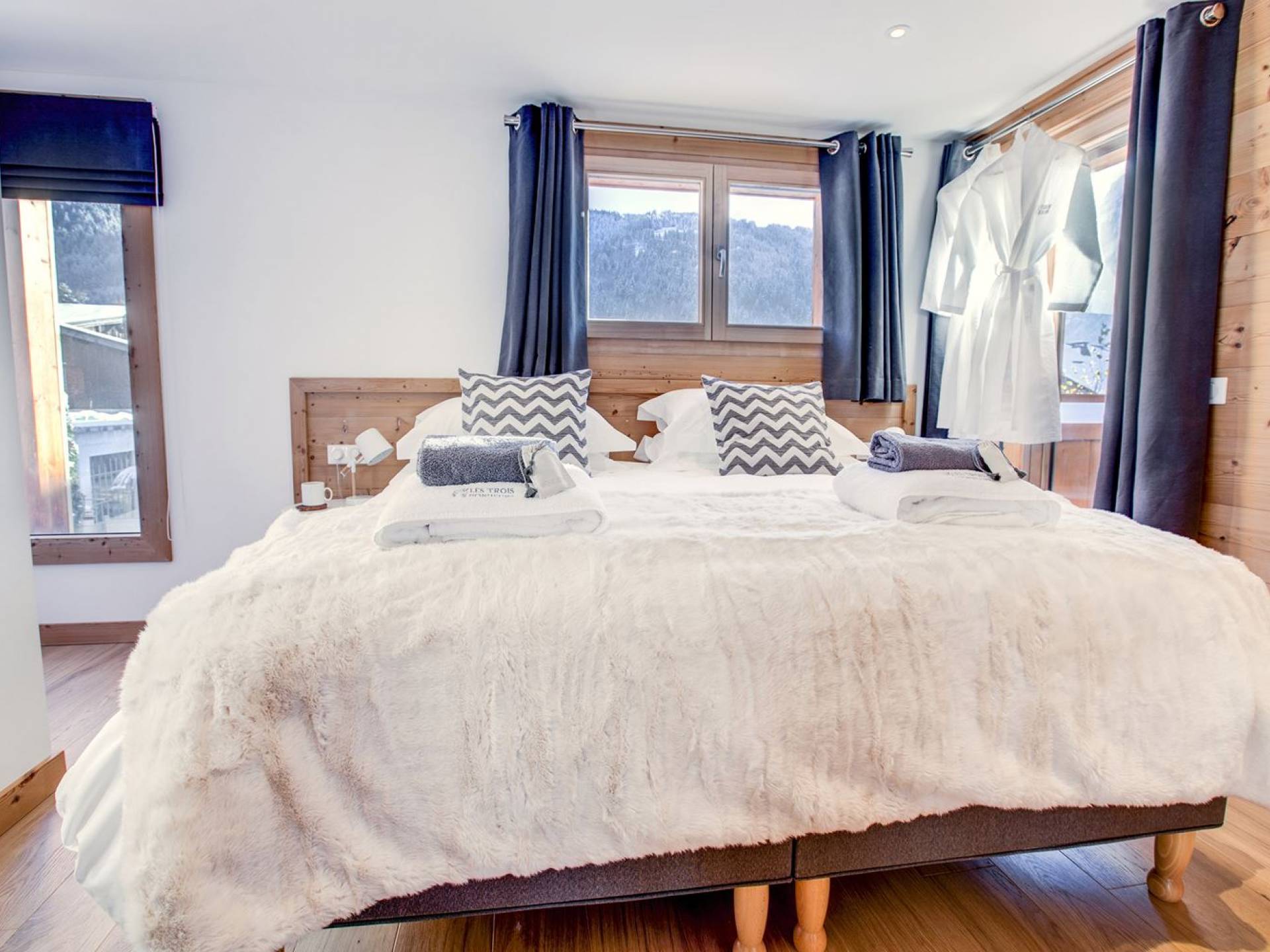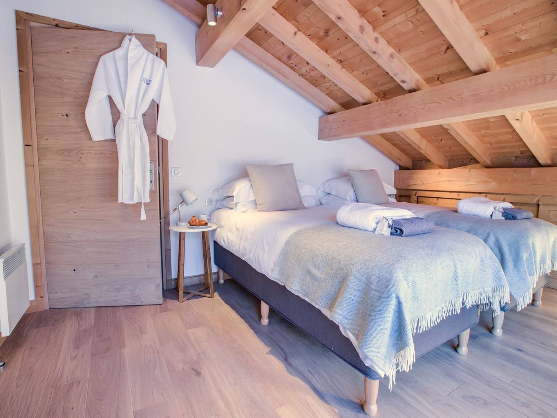 Les chambres 4 et 5 sont situées à l'étage dans le haut toit en pente et ces chambres lumineuses offrent de superbes vues. La chambre 4 a un balcon Juliette avec des doubles portes donnant sur le jardin et les montagnes derrière le chalet. Le balcon de la chambre 5 est privé et couvert et offre une vue sur l'avant du chalet.