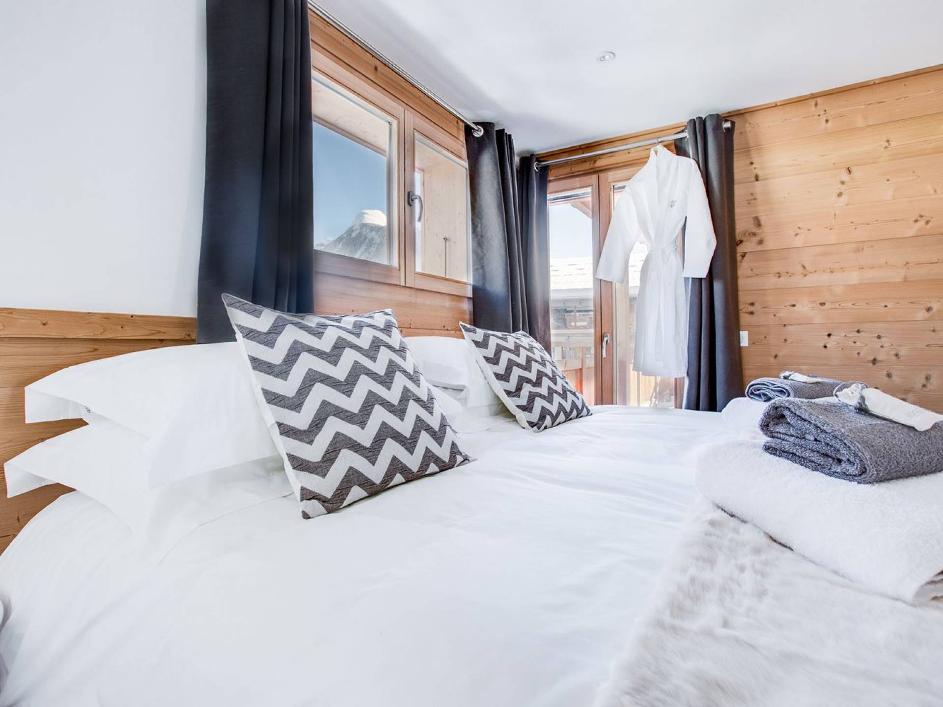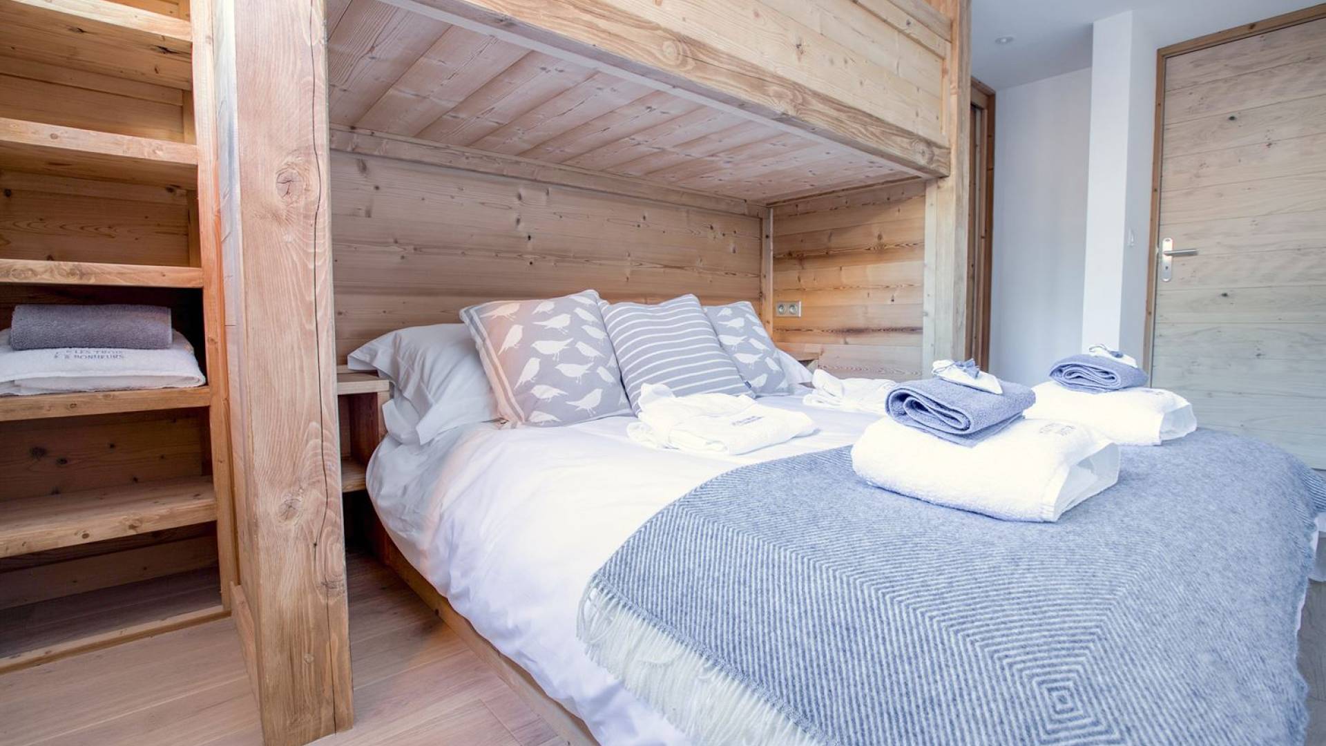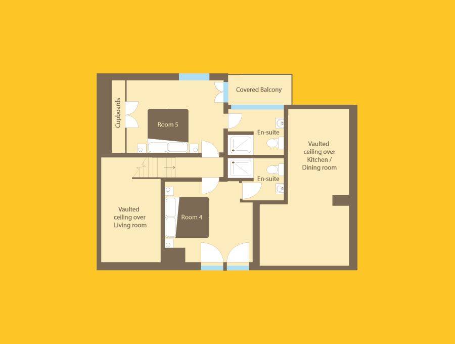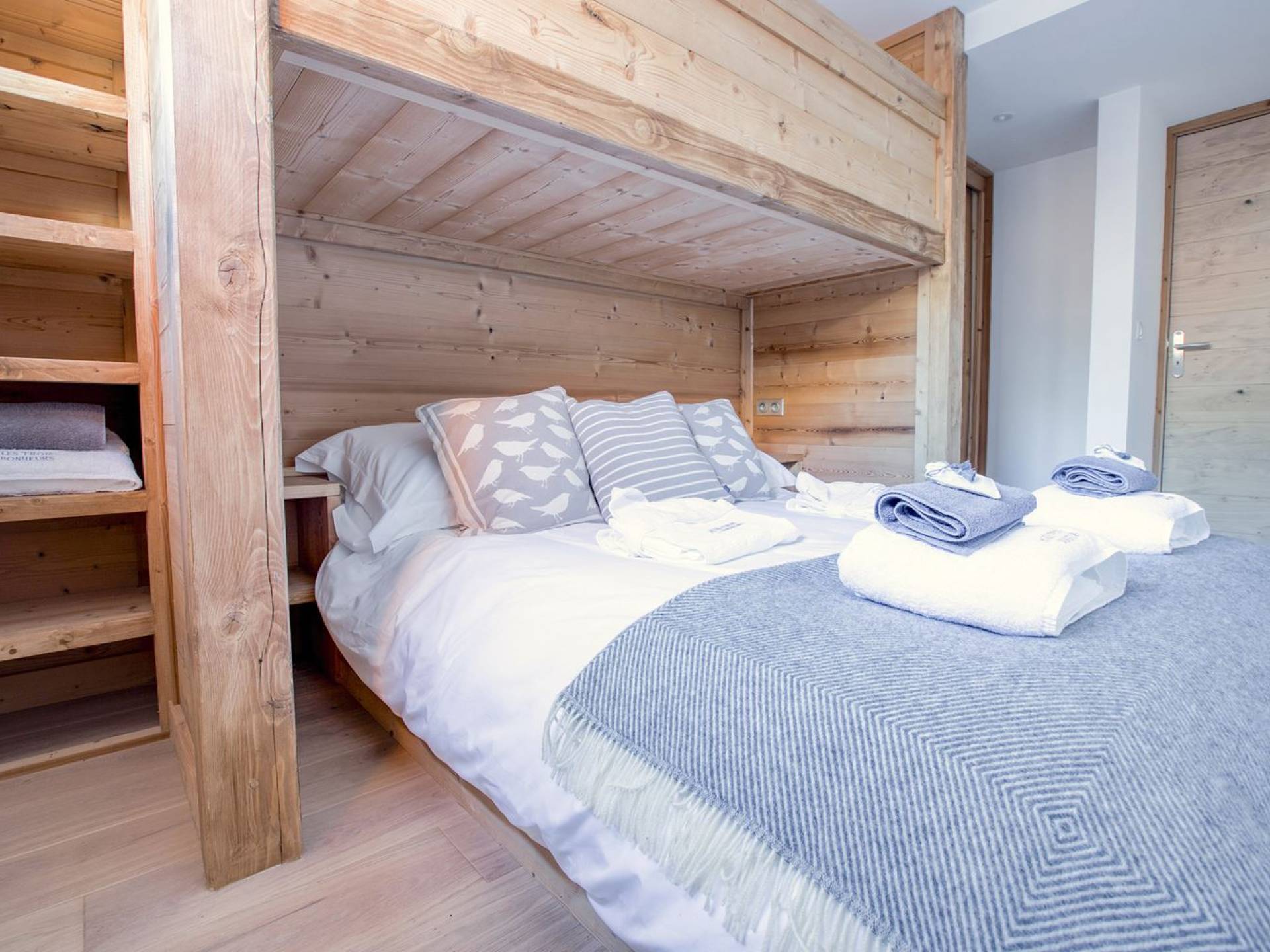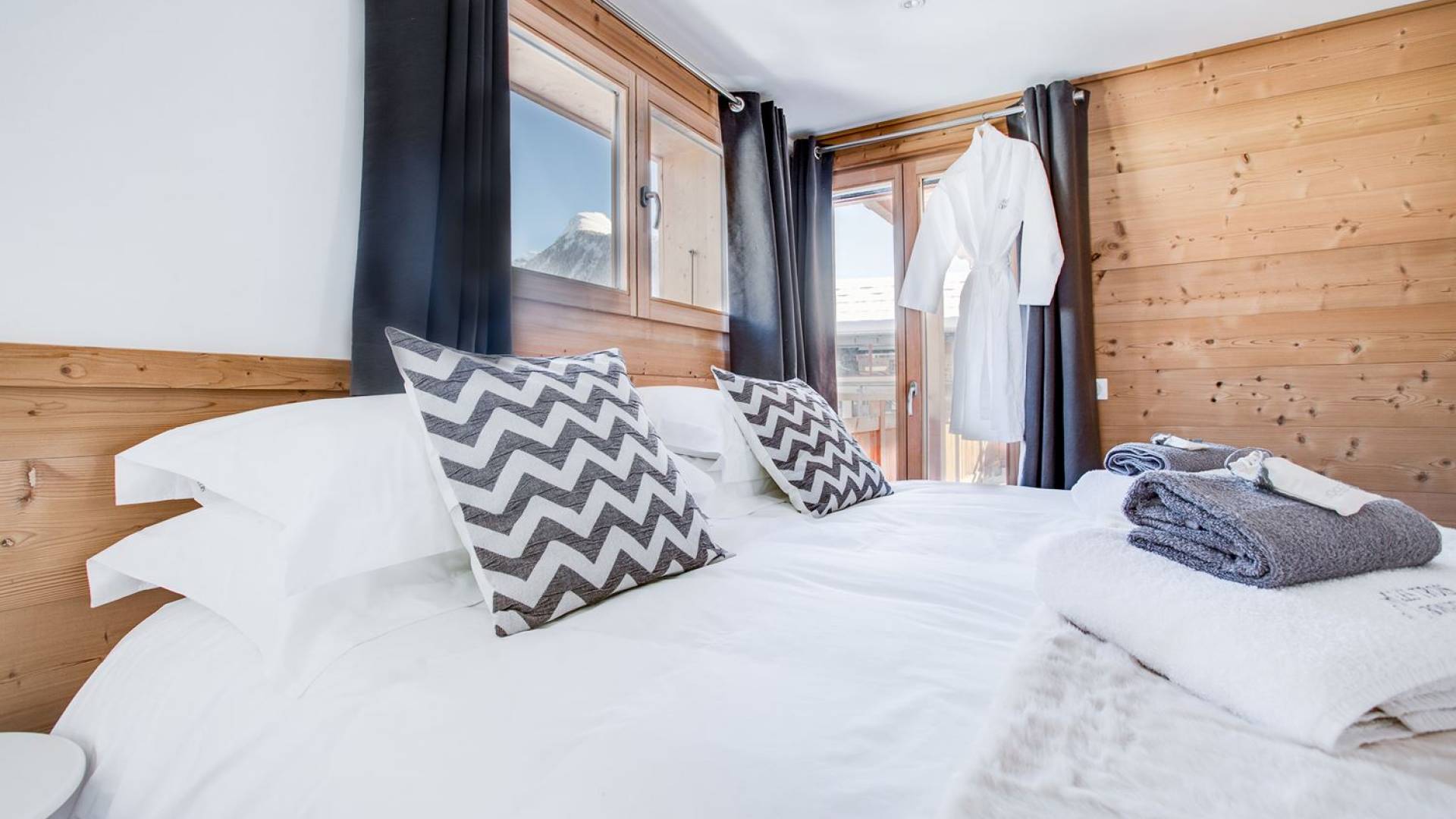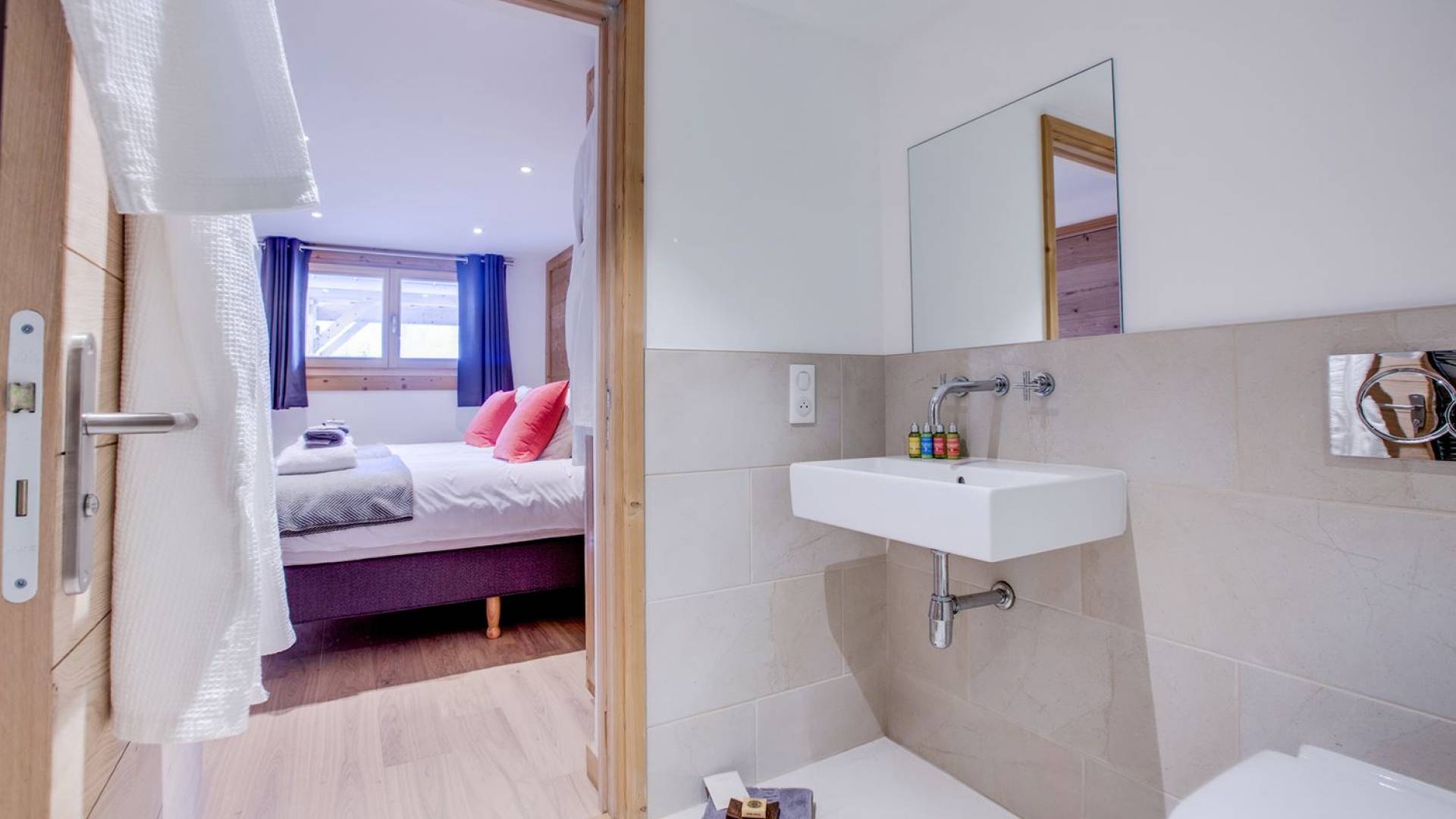 Les chambres 4 et 5 sont situées à l'étage dans le haut toit en pente et ces chambres lumineuses offrent de superbes vues. La chambre 4 a un balcon Juliette avec des doubles portes donnant sur le jardin et les montagnes derrière le chalet. Le balcon de la chambre 5 est privé et couvert et offre une vue sur l'avant du chalet.