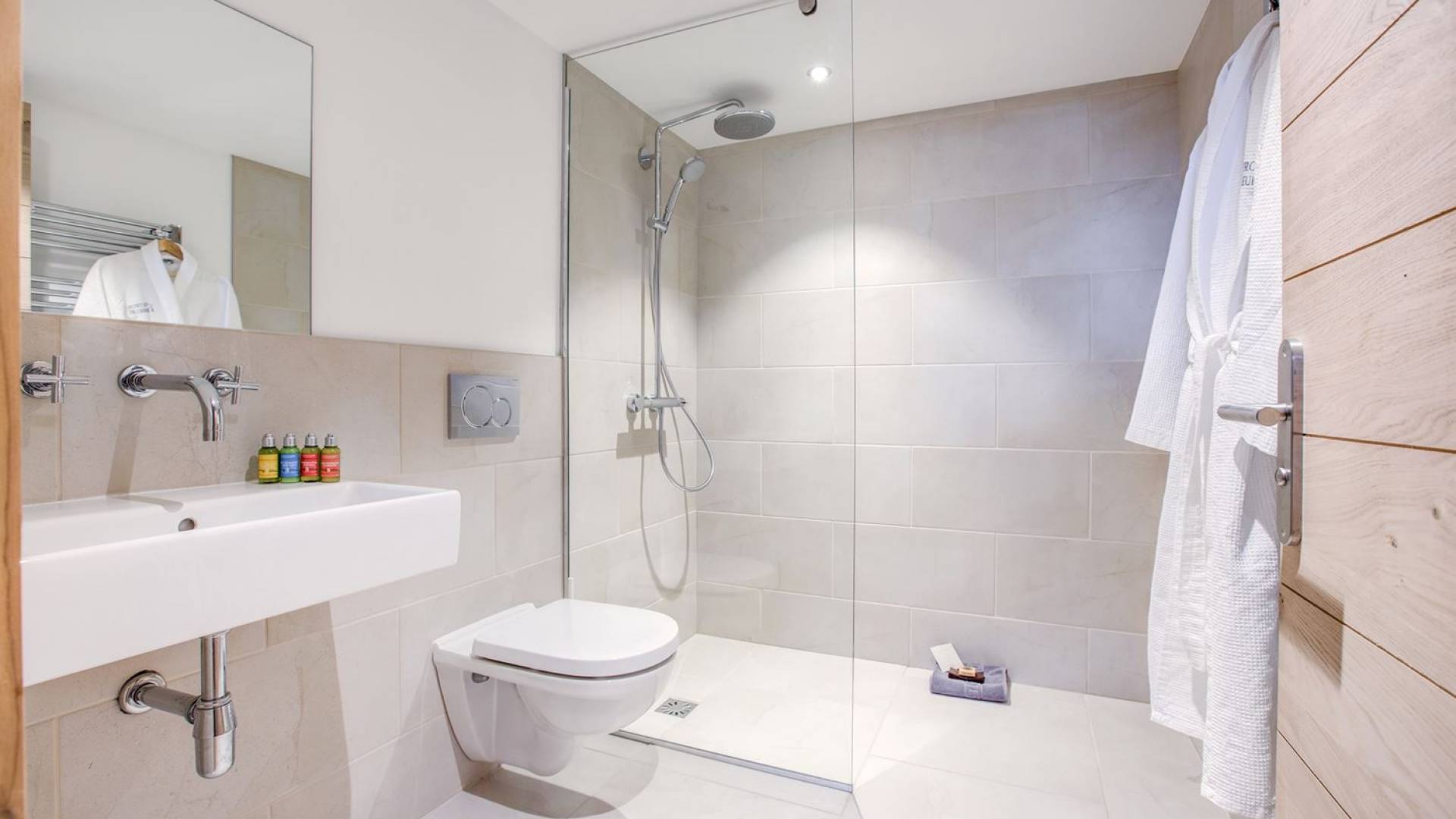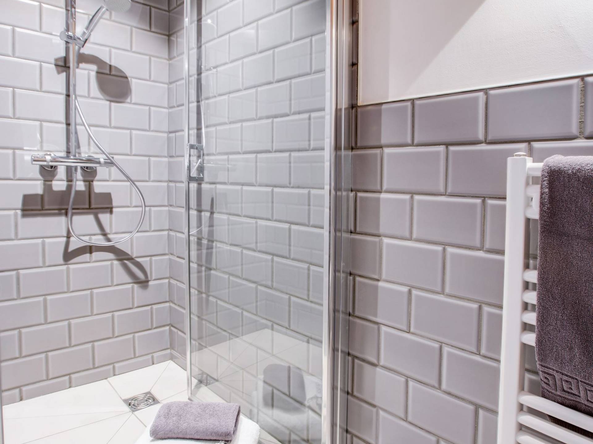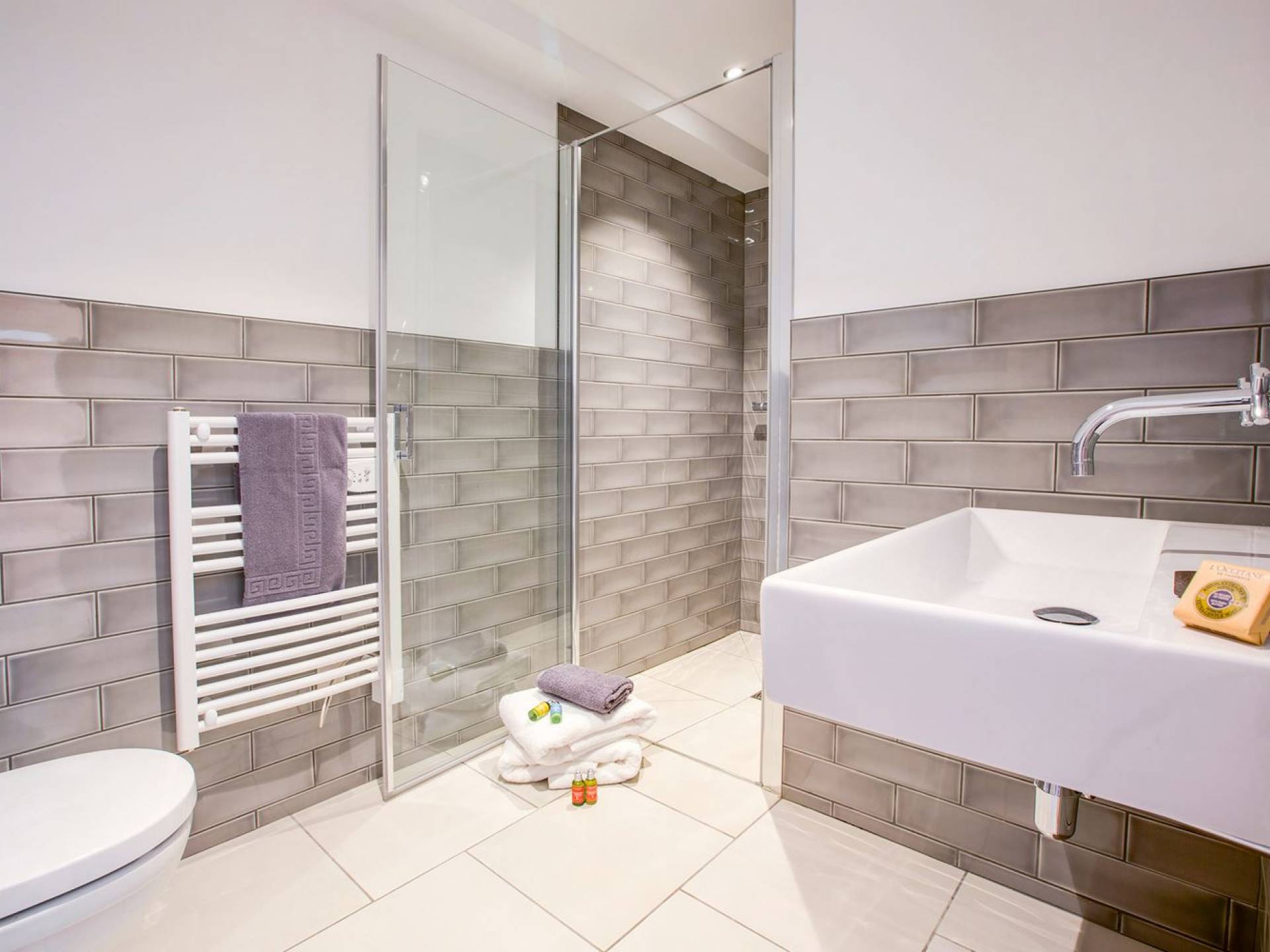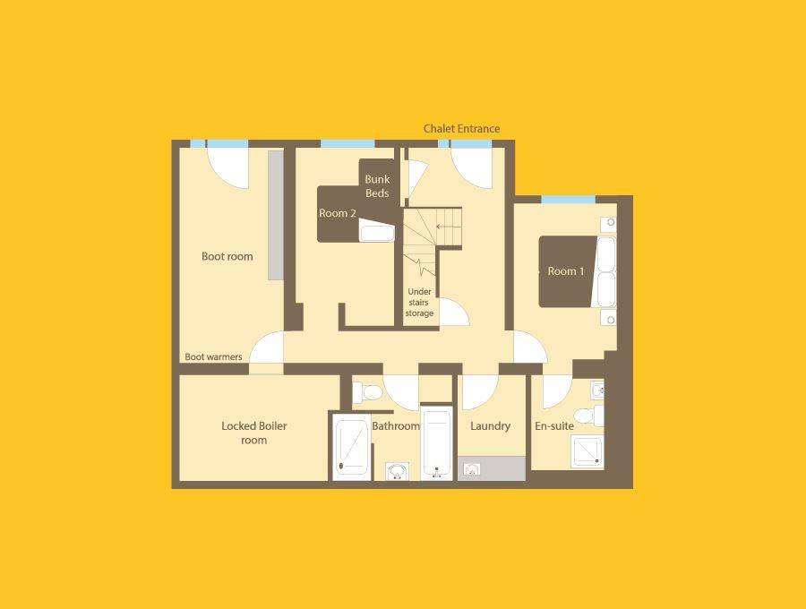 Il y a deux chambres au rez-de-chaussée ; La chambre 1 est une spacieuse salle de bains double (ou twin) et la chambre 2 est une chambre familiale avec un lit double (ou twin) et un lit superposé simple au-dessus. La grande salle de bain privée de la chambre familiale se trouve de l'autre côté du couloir et dispose d'une baignoire et d'une douche à l'italienne.