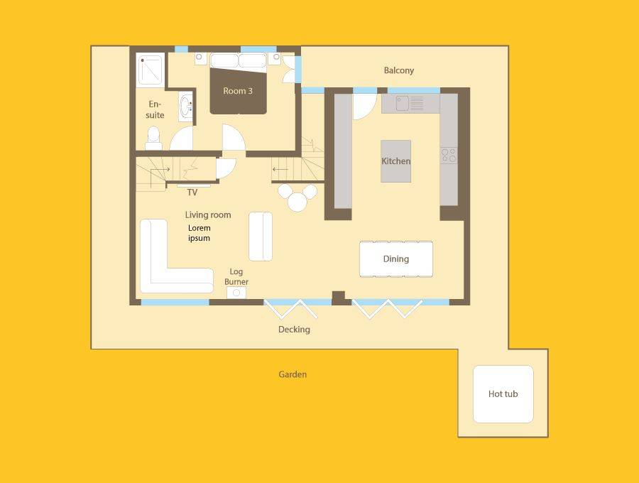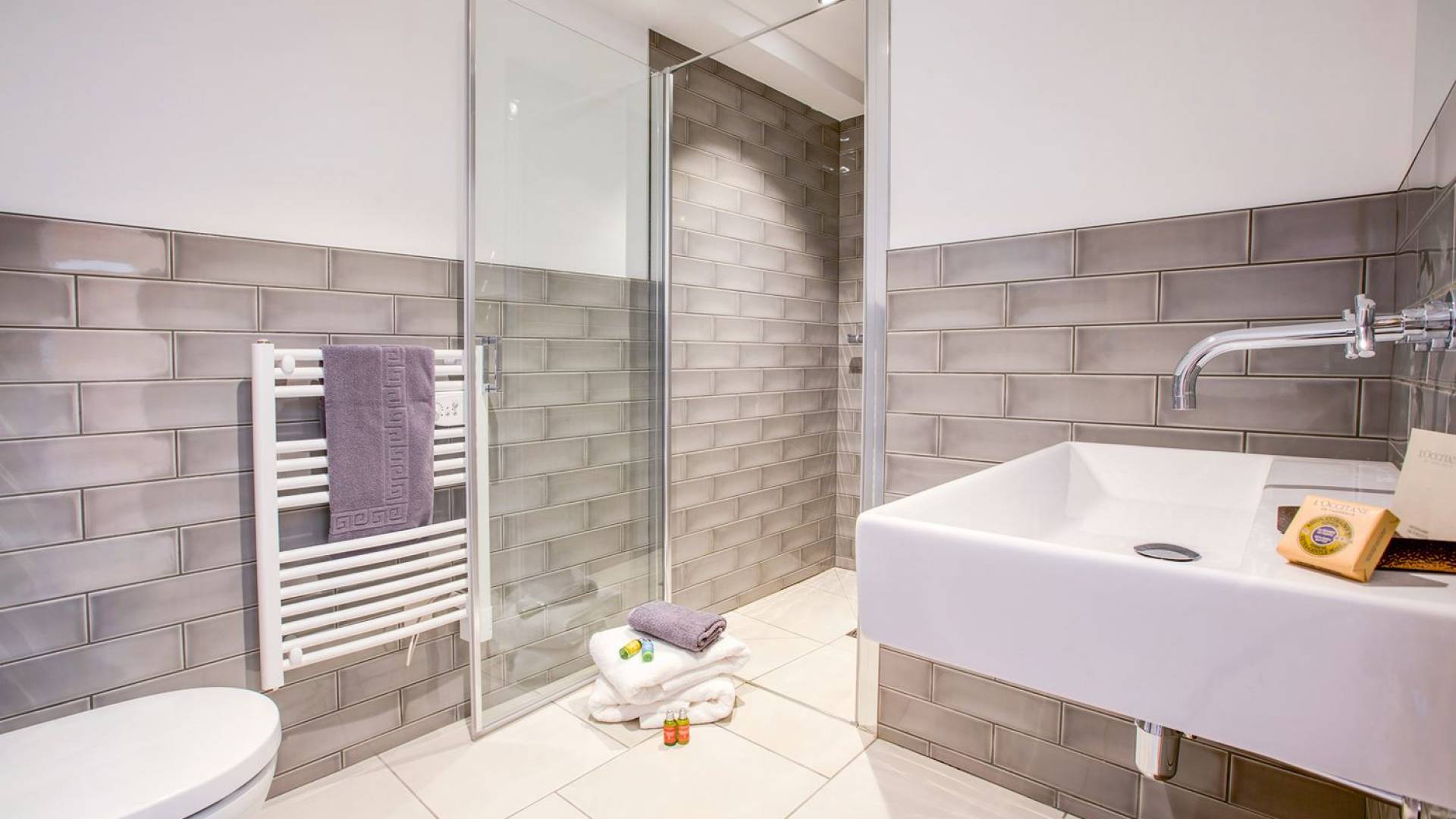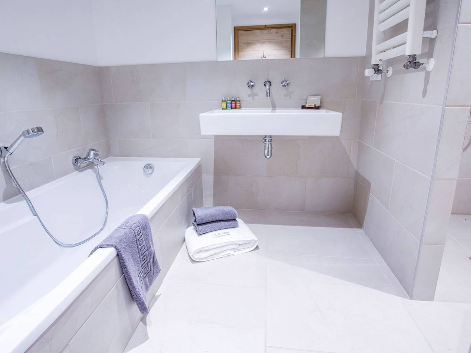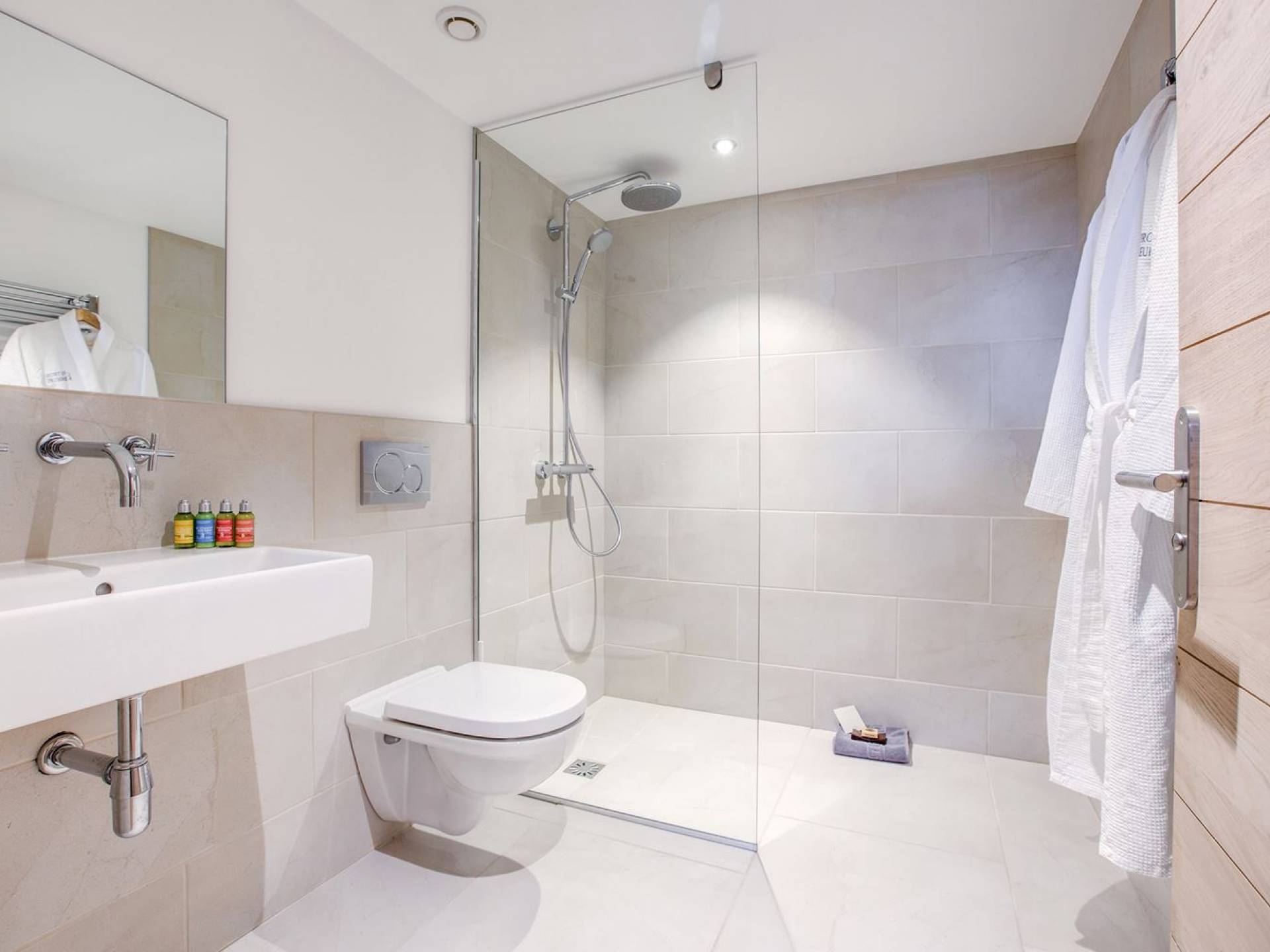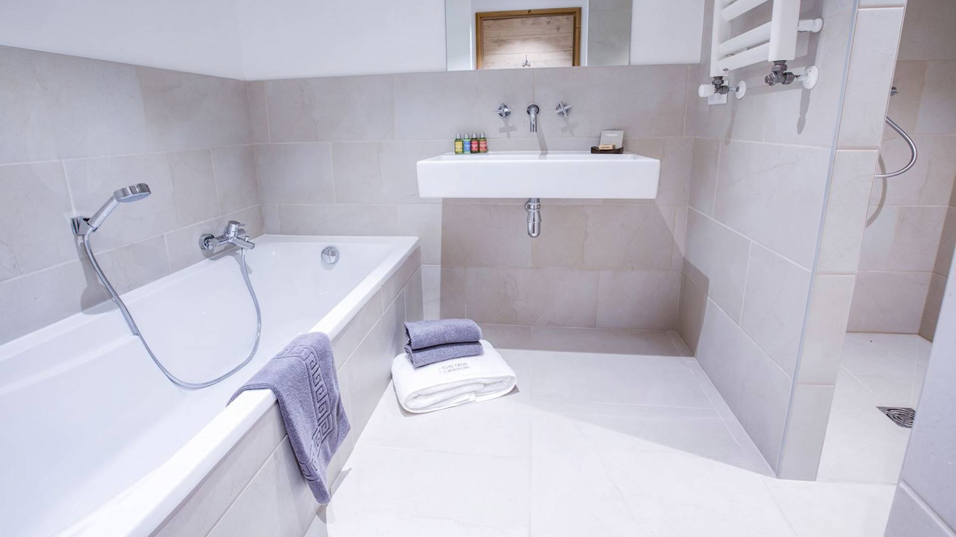 Il y a deux chambres au rez-de-chaussée ; La chambre 1 est une spacieuse salle de bains double (ou twin) et la chambre 2 est une chambre familiale avec un lit double (ou twin) et un lit superposé simple au-dessus. La grande salle de bain privée de la chambre familiale se trouve de l'autre côté du couloir et dispose d'une baignoire et d'une douche à l'italienne.
