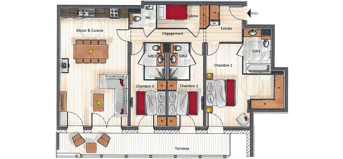L'Appartement B101, situé au 1er étage de la Résidence Annapurna Les Gets, d'une superficie de 114 m², est parfait pour accueillir 8 personnes. Cet appartement dispose de trois chambres avec un lit double, d'une chambre cabine avec un lit superposé et de trois salles de bains. Le salon avec télévision et cheminée dispose également d'une cuisine entièrement équipée et d'un balcon. Pendant vos vacances, vous pourrez bénéficier d'une place de parking dans le parking privé, d'un casier à skis et d'un accès Wifi.