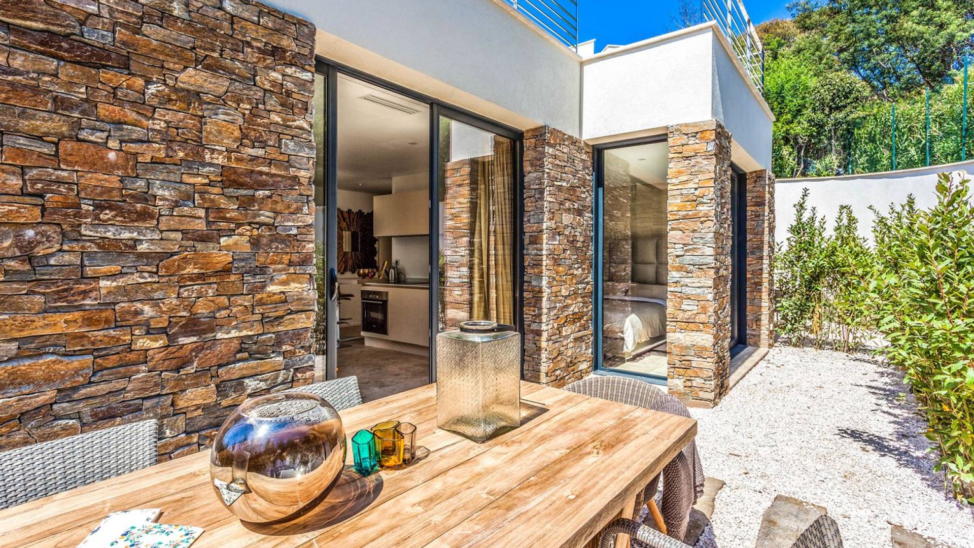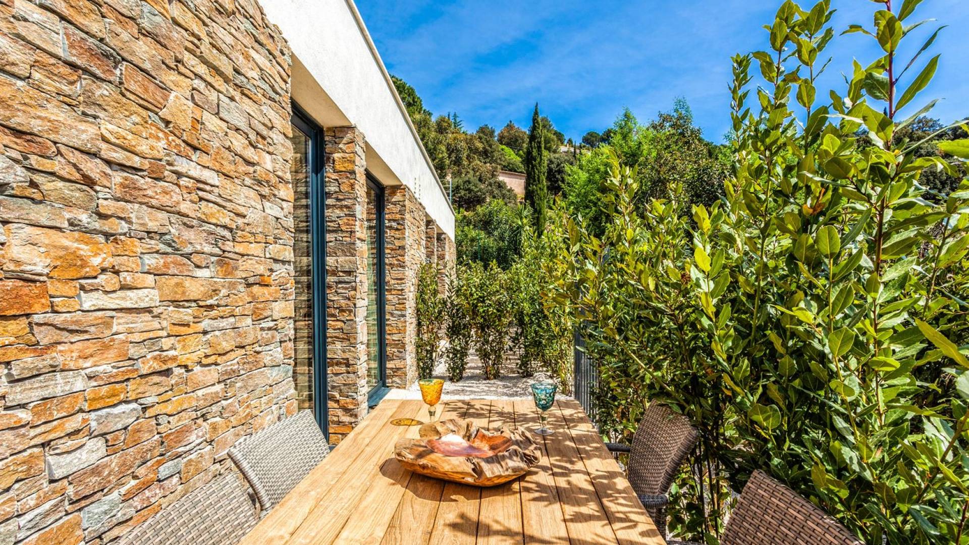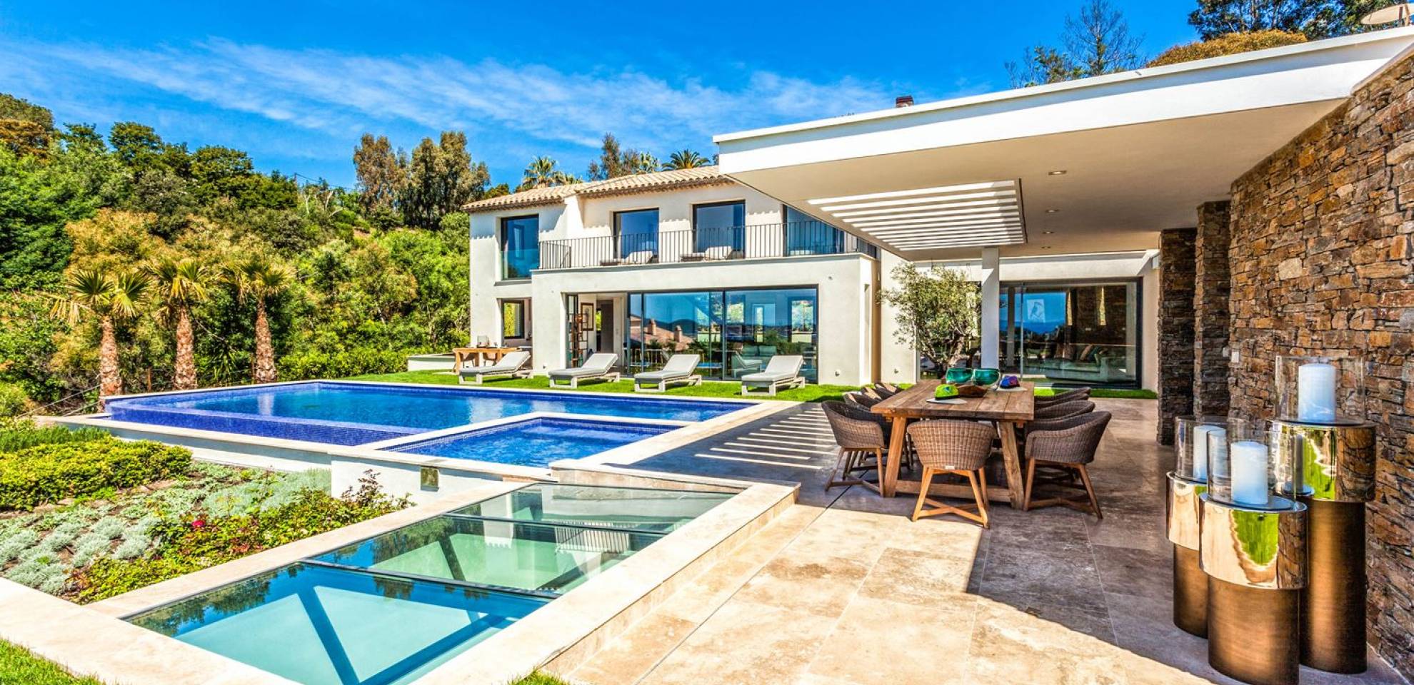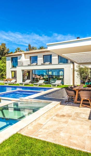 L'espace extérieur est tout aussi magnifique et se compose d'une piscine à débordement chauffée et d'un immense jacuzzi. Le pool house est équipé d'un barbecue et l'immense table en bois offre la plus belle vue sur l'océan et les Iles d'Or.
