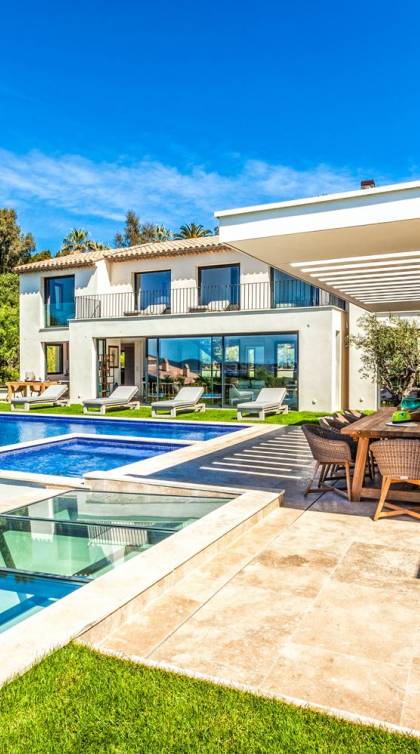Colibri Estate Saint Tropez est une location de villa de luxe avec 10 chambres et une piscine privée. Villa Colibri est une propriété contemporaine nouvellement construite idéalement située à La Croix Valmer et à proximité de Saint Tropez et des plages de Ramatuelle et Gigaro. La propriété a une vue imprenable sur l'océan sur les îles d'or et les vignobles. La propriété est dans un environnement très calme et se compose de la villa principale et de 3 appartements de luxe. La villa et les appartements sont élégamment décorés et meublés avec des meubles design exclusifs.