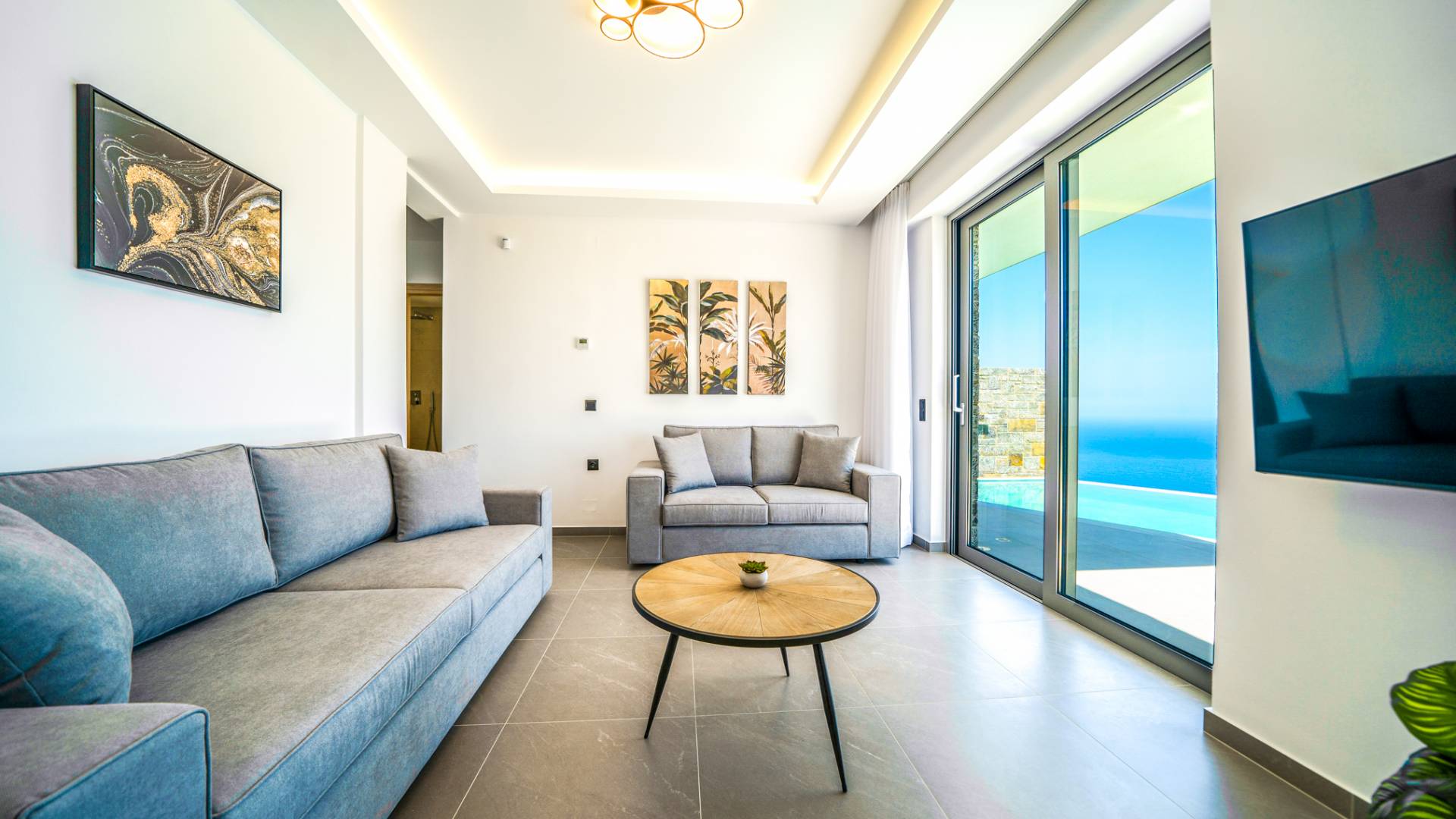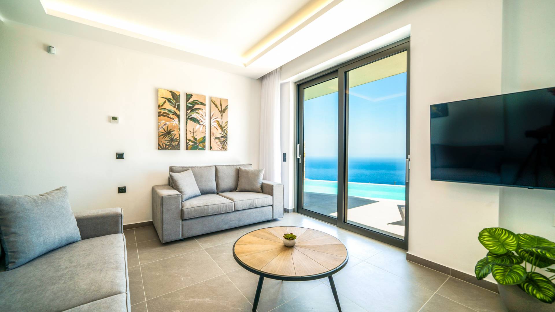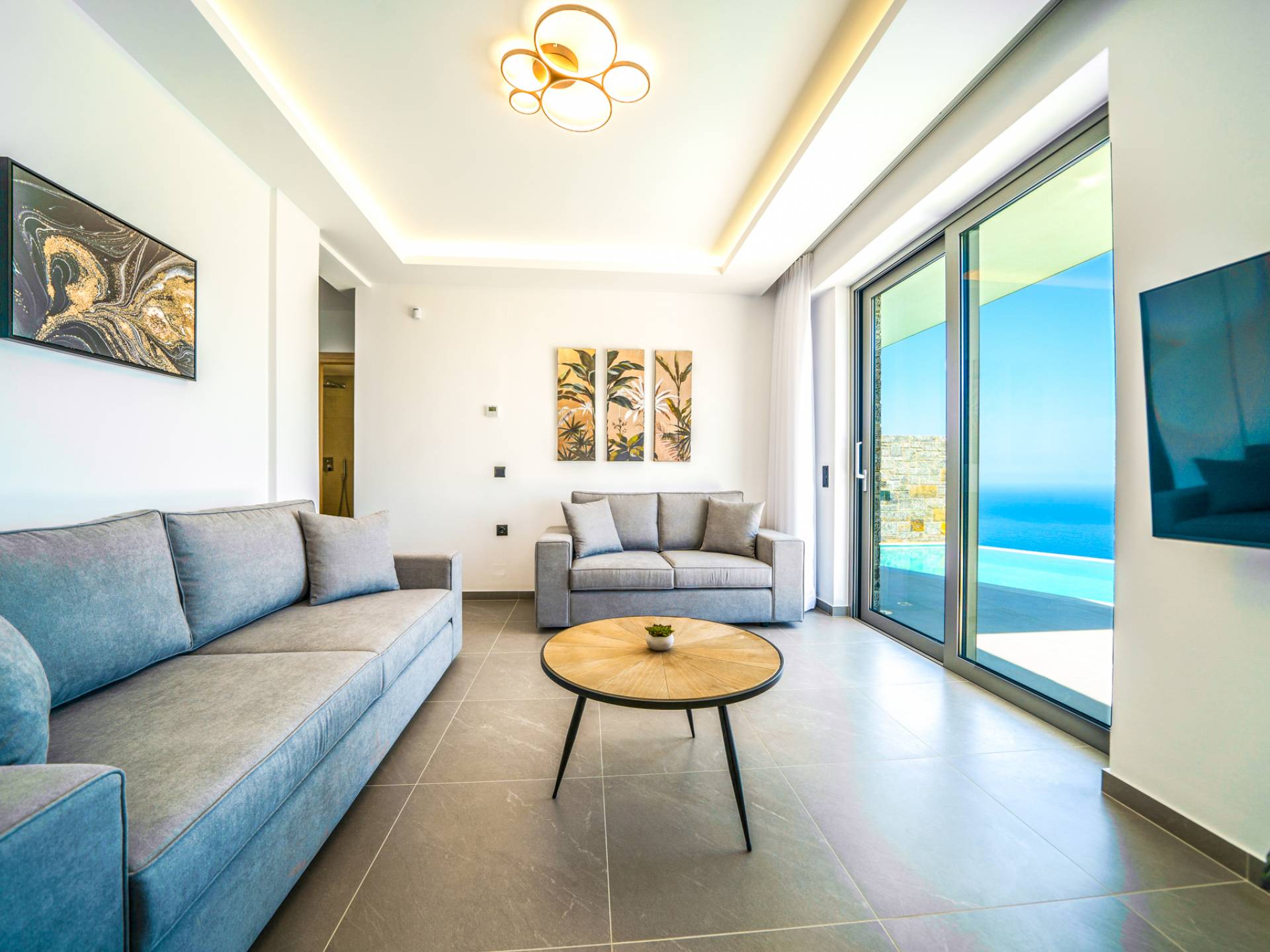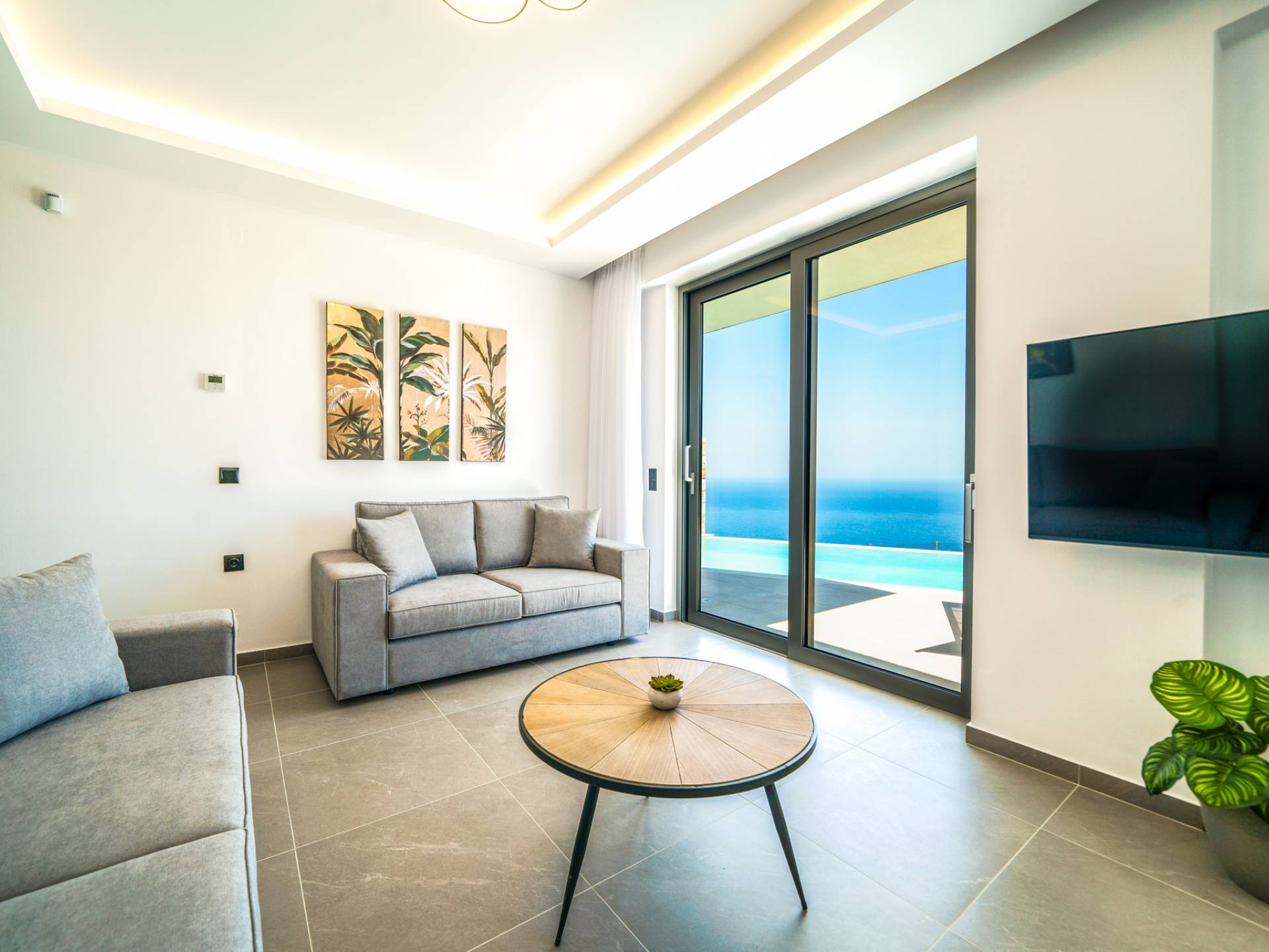Le salon vous accueille avec un coin salon élégant avec une télévision intelligente de 50 pouces, parfait pour des soirées de détente tandis que vous explorez plus loin, vous serez enchanté par le point central du salon : un spacieux véranda offrant une vue imprenable sur la mer, vous invitant à vous prélasser dans la beauté de la nature.