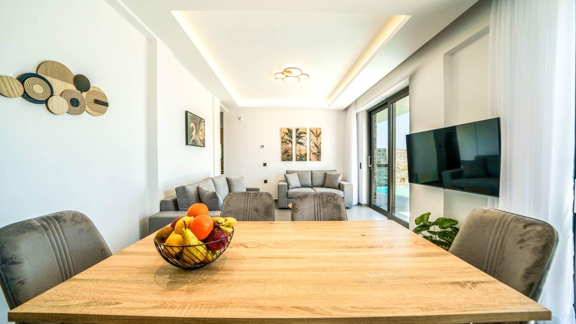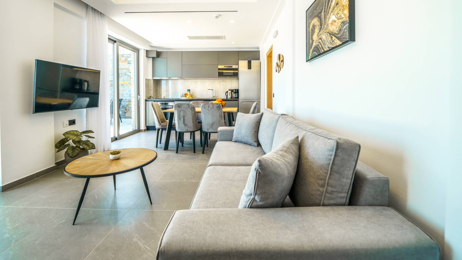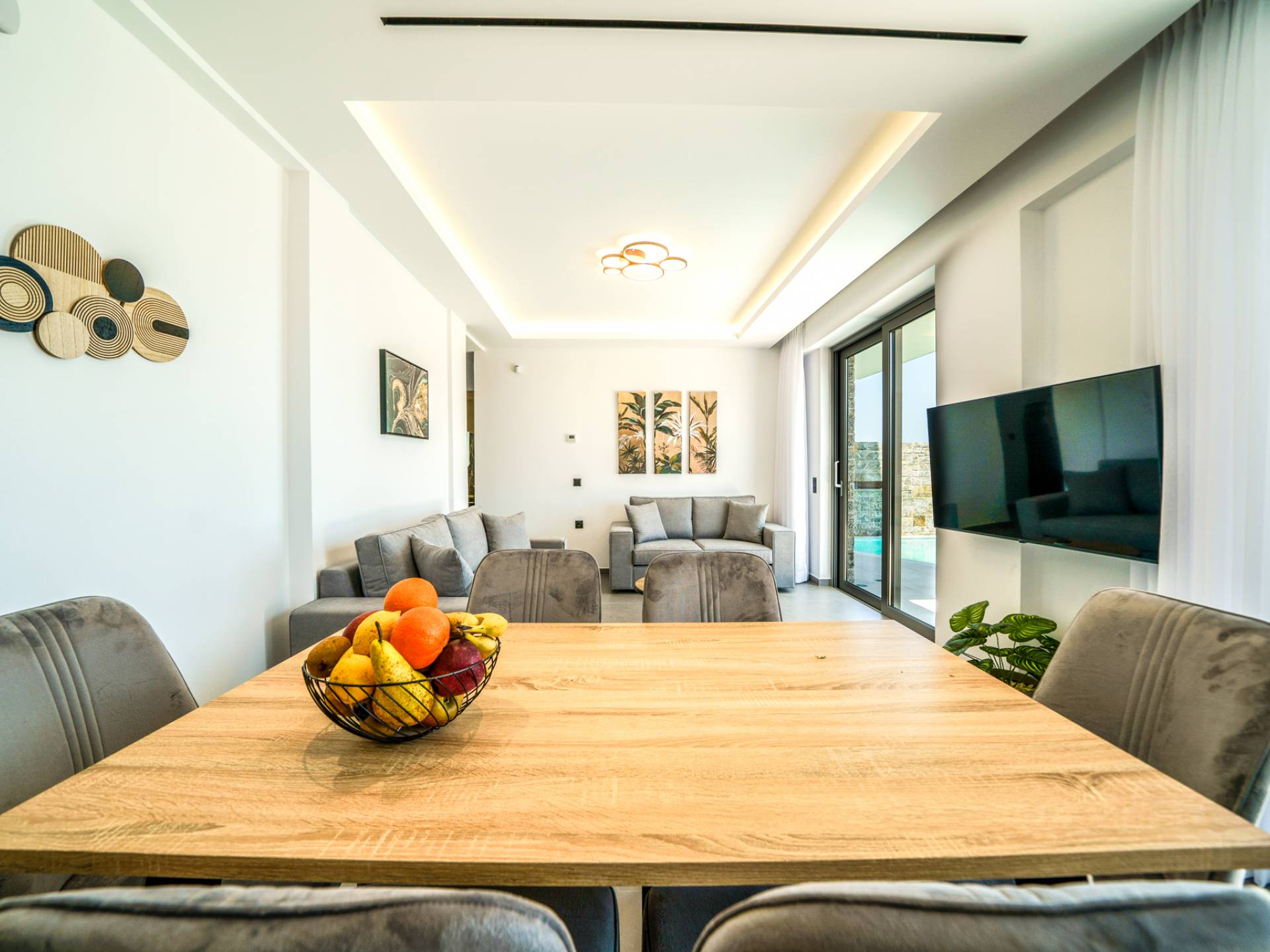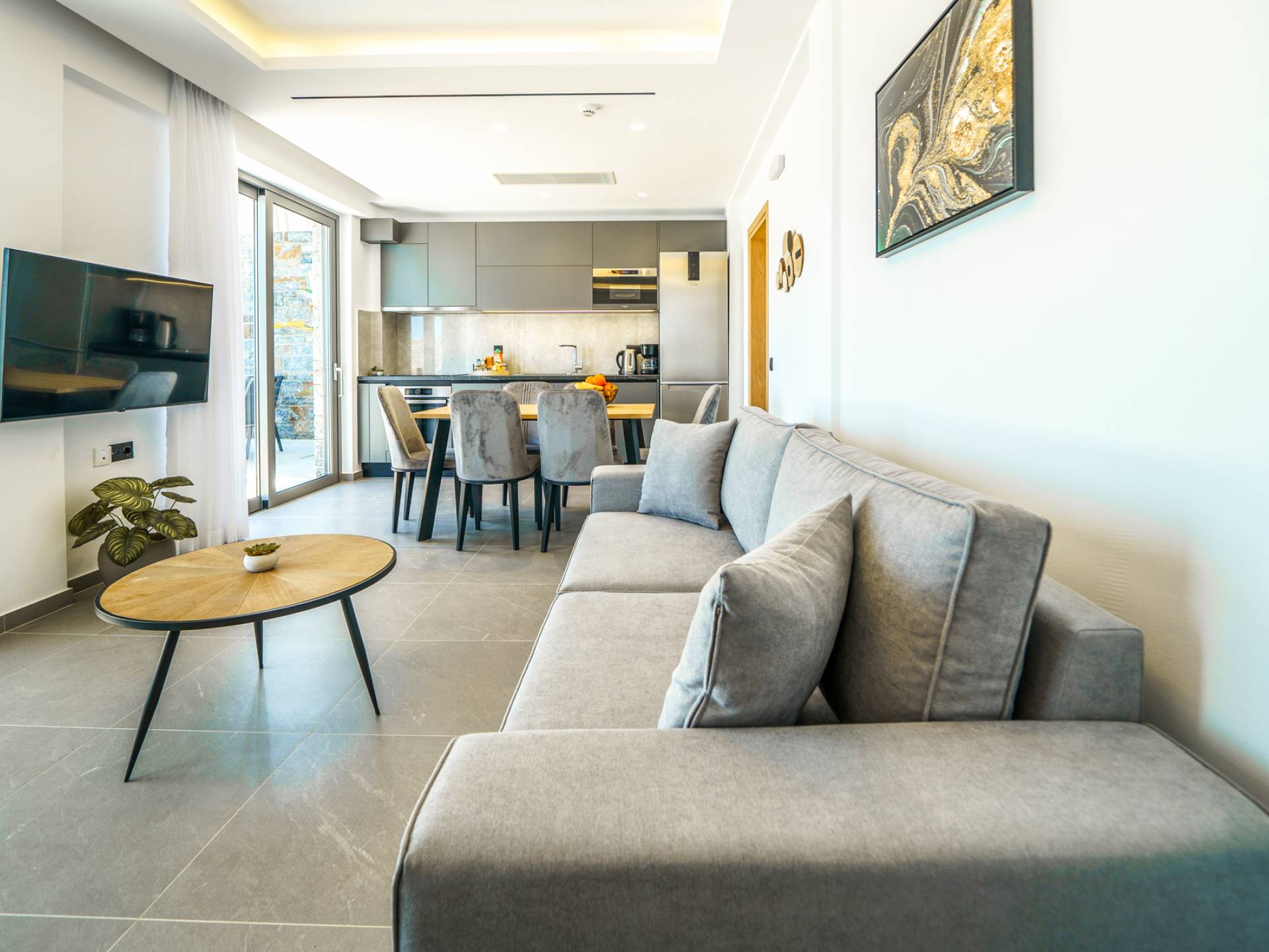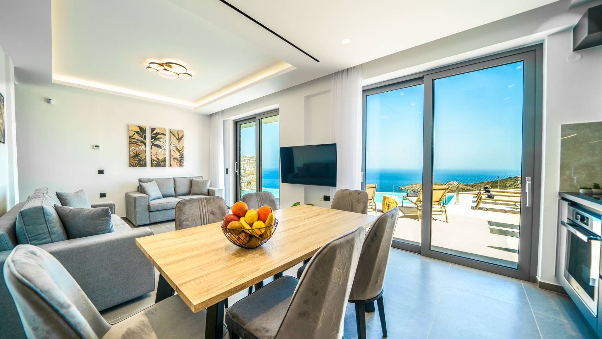 Le salon vous accueille avec un coin salon élégant avec une télévision intelligente de 50 pouces, parfait pour des soirées de détente tandis que vous explorez plus loin, vous serez enchanté par le point central du salon : un spacieux véranda offrant une vue imprenable sur la mer, vous invitant à vous prélasser dans la beauté de la nature.