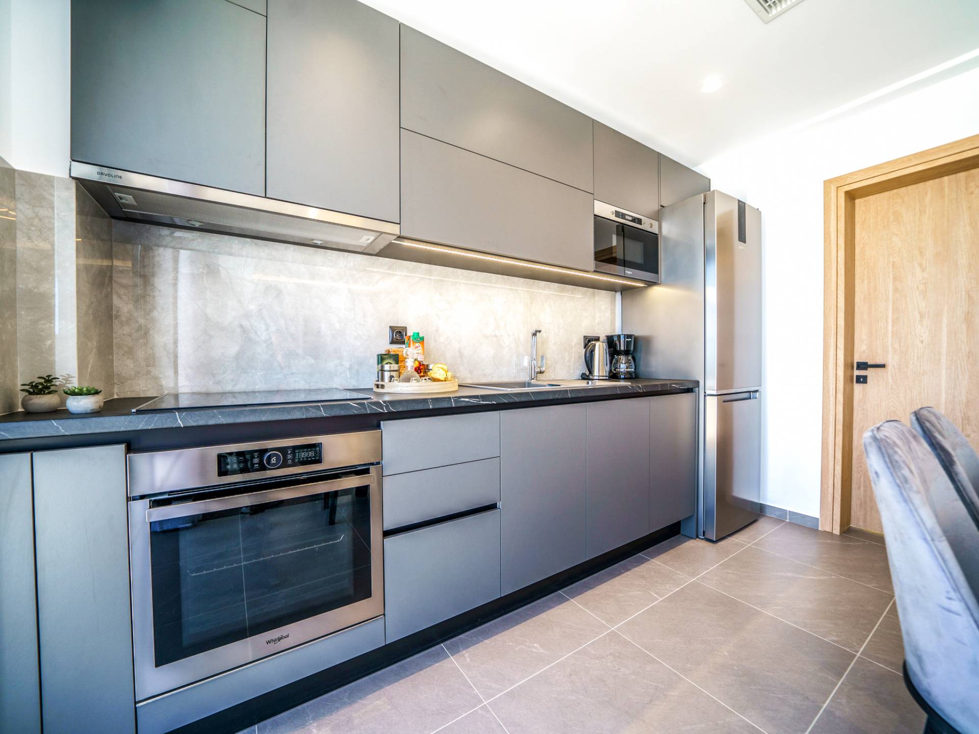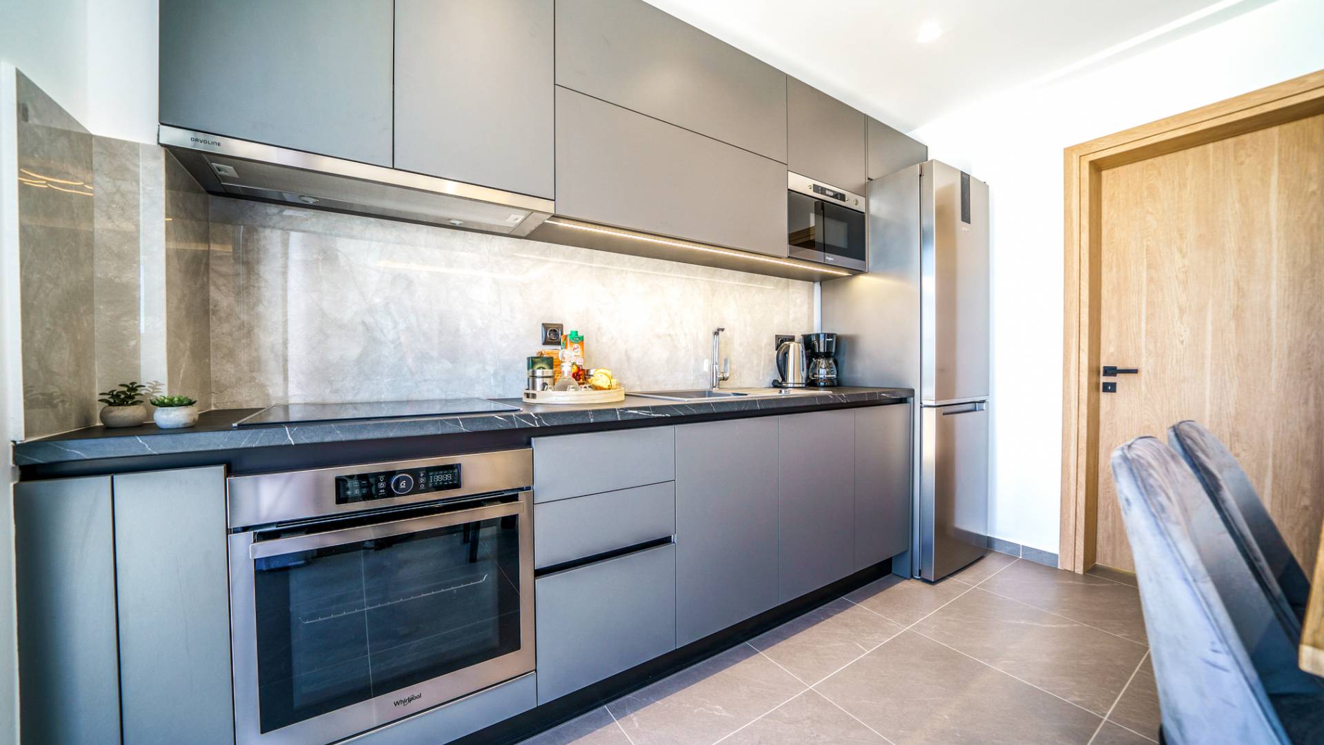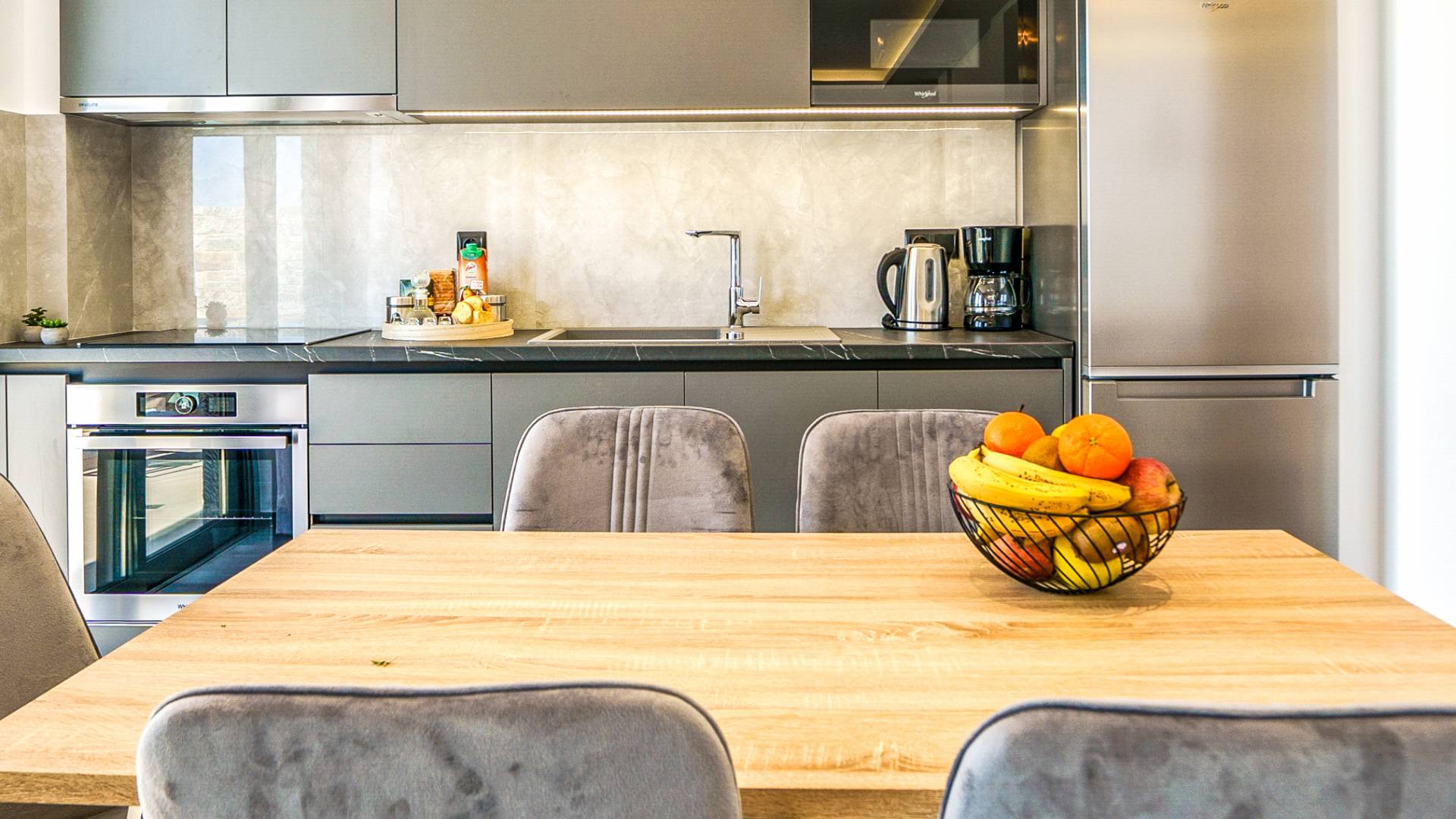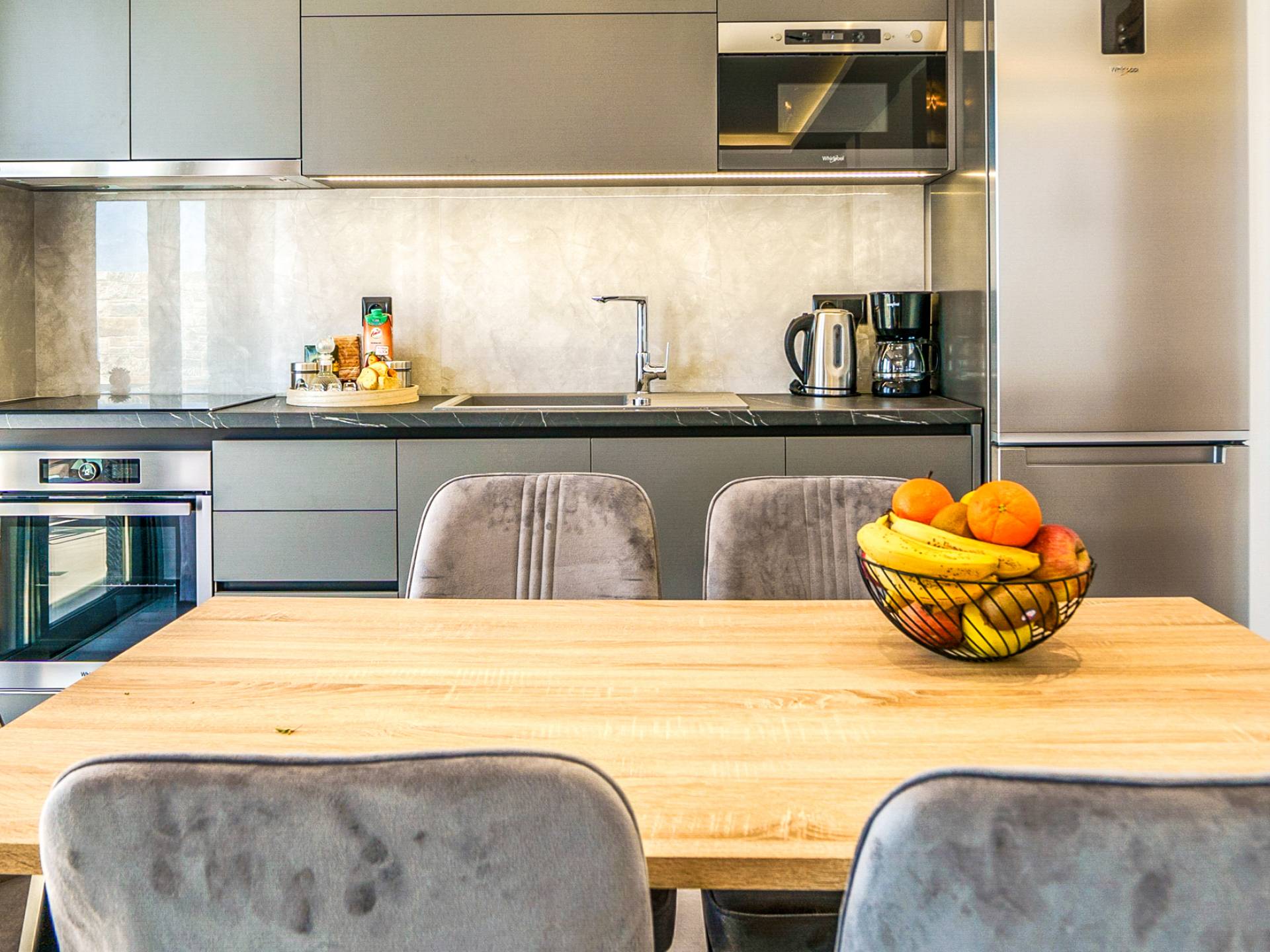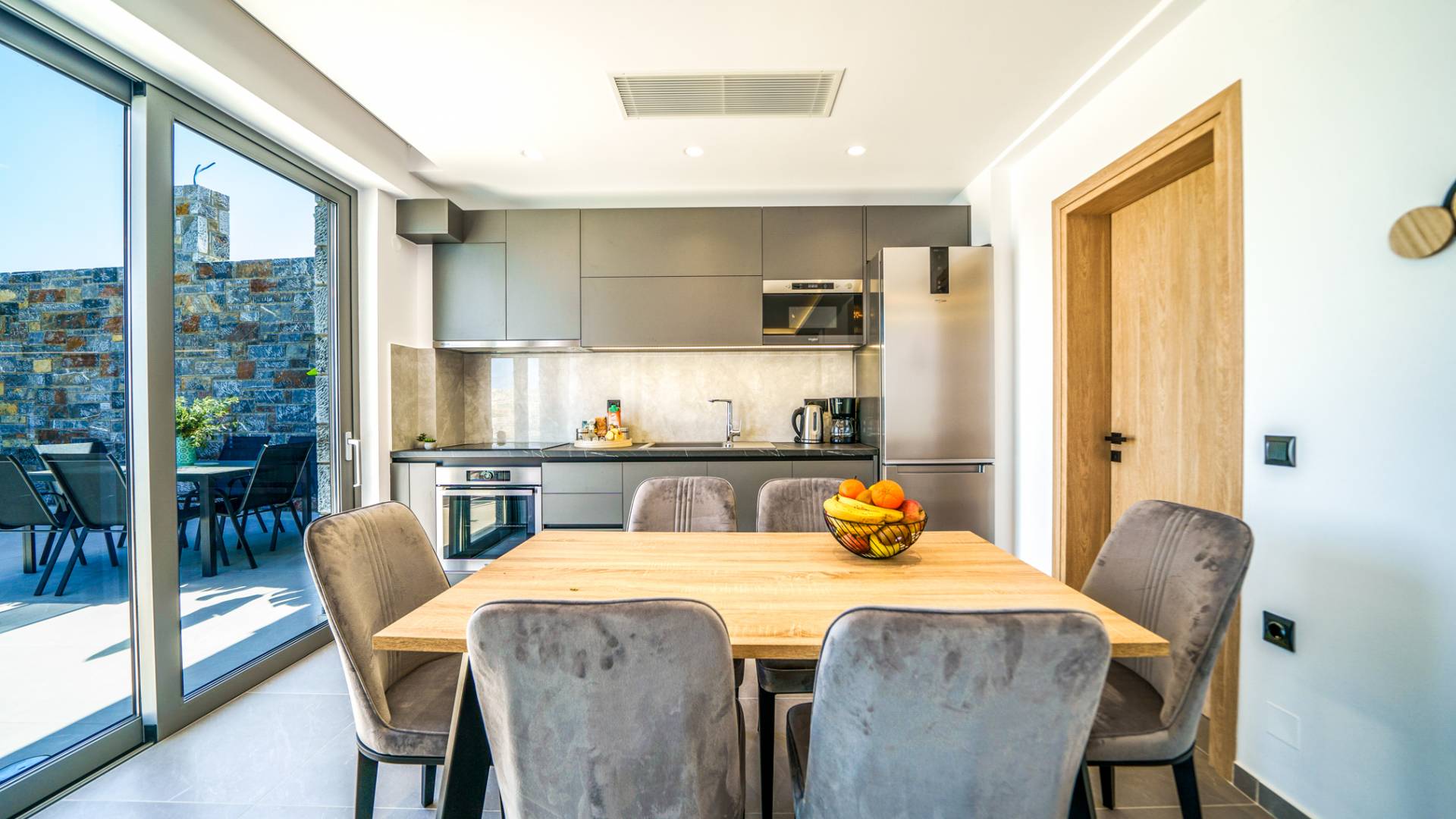 Adjacent au salon, vous découvrirez une cuisine entièrement équipée pouvant répondre à toutes vos envies culinaires, ainsi qu'une table à manger adjacente pour 6 personnes avec en toile de fond des vues imprenables à travers de grandes fenêtres.