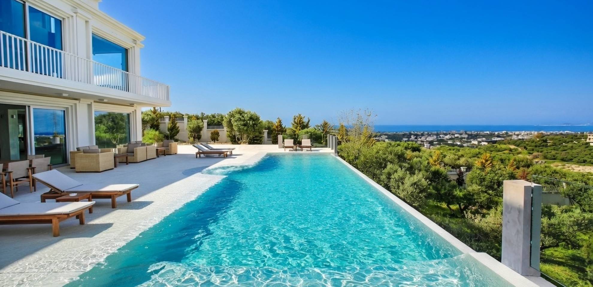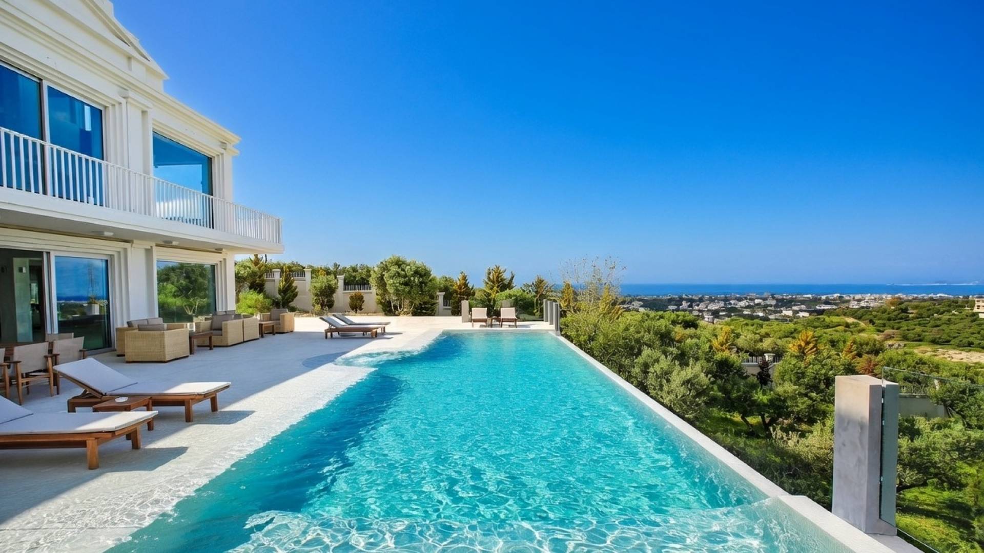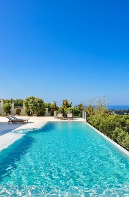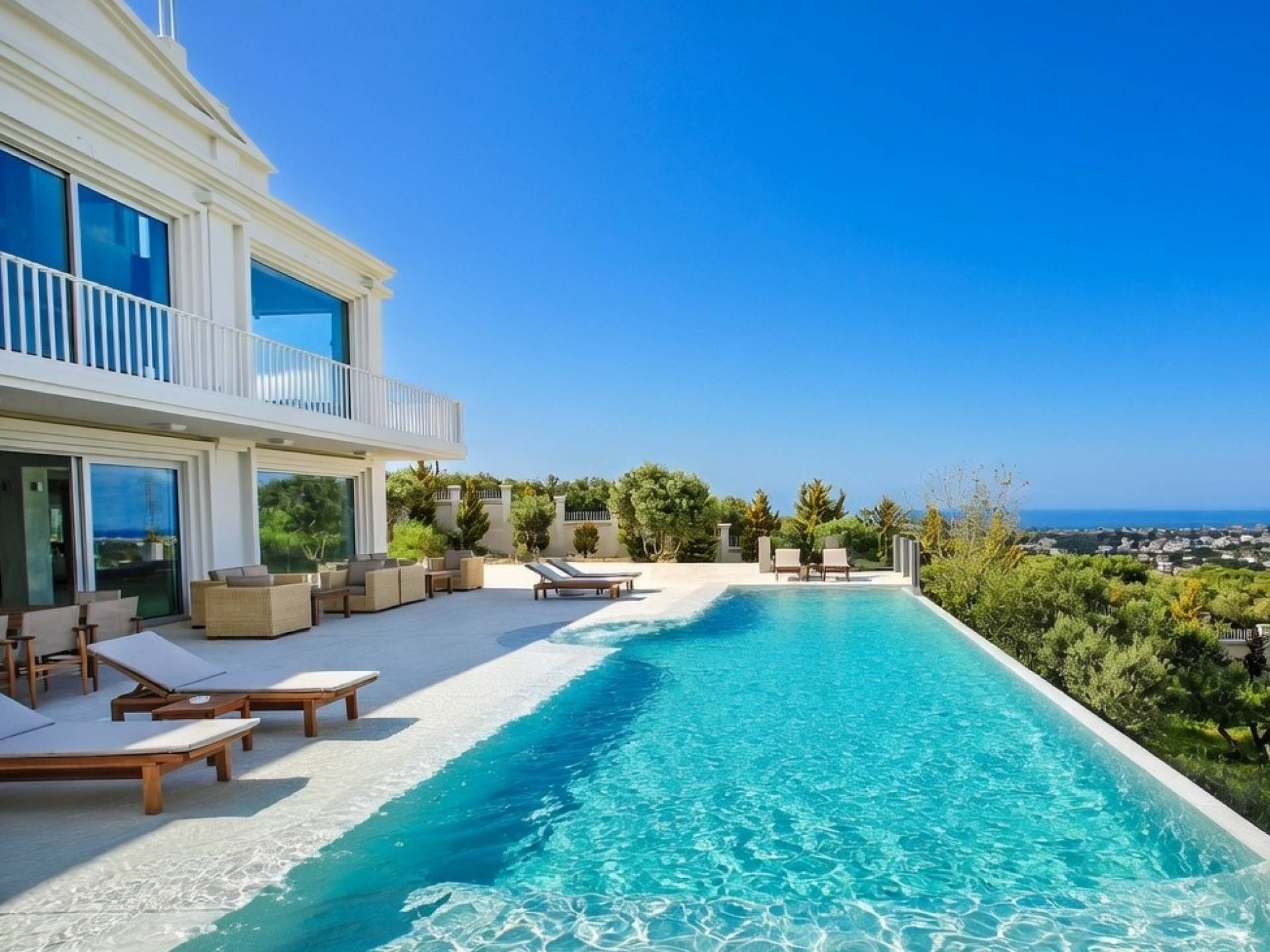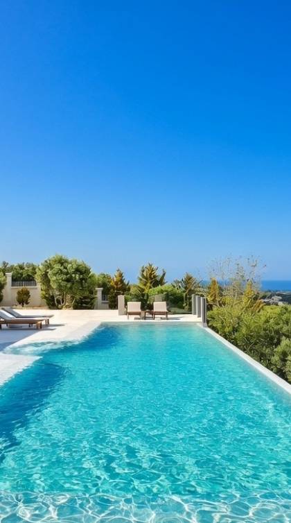 Imperial Sky Villa Crete est une location de villa de luxe avec 4 chambres et une piscine privée. Dans un environnement calme et verdoyant entouré d'oliviers et d'arbres fruitiers se trouve Imperial Sky Villa Crete, une luxueuse villa avec 470 m² d'espace intérieur et 2000 m² d'espace extérieur et de jardins, avec une piscine extérieure de 15 m de long et une piscine intérieure chauffée de 18 m². Il s'agit d'un bâtiment impressionnant au design unique, avec des éléments d'architecture néoclassique combinés à des lignes modernes. Le marbre grec, le bois de chêne naturel et le verre sont les matériaux dominants.