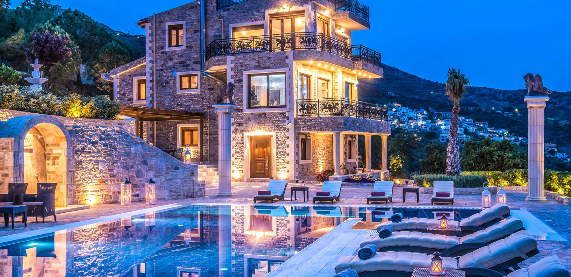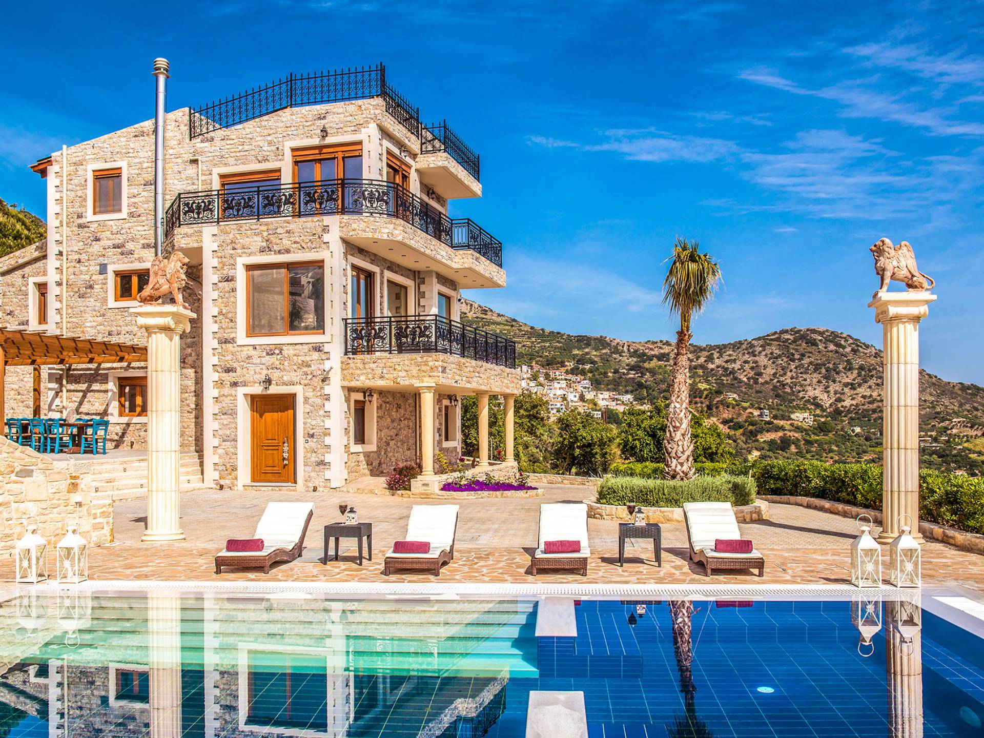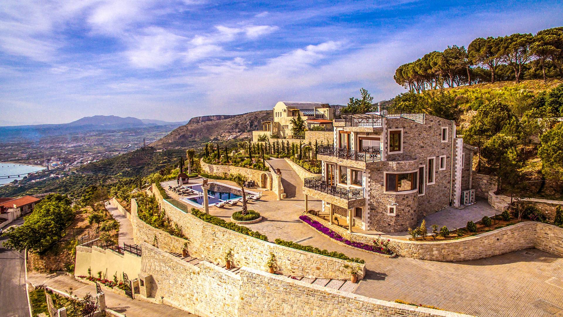 Ici, le voyageur rencontre une véritable retraite privée, protégée et entourée de murs de pierre solides mais élégants qui évoquent les anciens murs entourant la ville d'Héraklion, laissés par les colons vénitiens médiévaux. À l'intérieur des murs et autour de la maison se trouvent de magnifiques allées de jardin qui évoquent des jardins anciens de l'Antiquité. Les clients seront immergés dans un Eden privé, rempli de fleurs et d'arbres parfumés qui surplombent les teintes bleues spectaculaires de la mer Méditerranée. Cependant, ce paradis n'est pas si éloigné que les clients se sentiront coupés de toute la joie que la Crète a à offrir. Une courte promenade dans la montagne mène les clients à certains des meilleurs restaurants de l'île dans les meilleures tavernes. Après un repas digne des dieux, les clients peuvent retourner à la villa pour se baigner dans la luxueuse piscine à débordement et nager la fine ligne qui brouille leur vue avec la vue panoramique sur la mer Méditerranée.