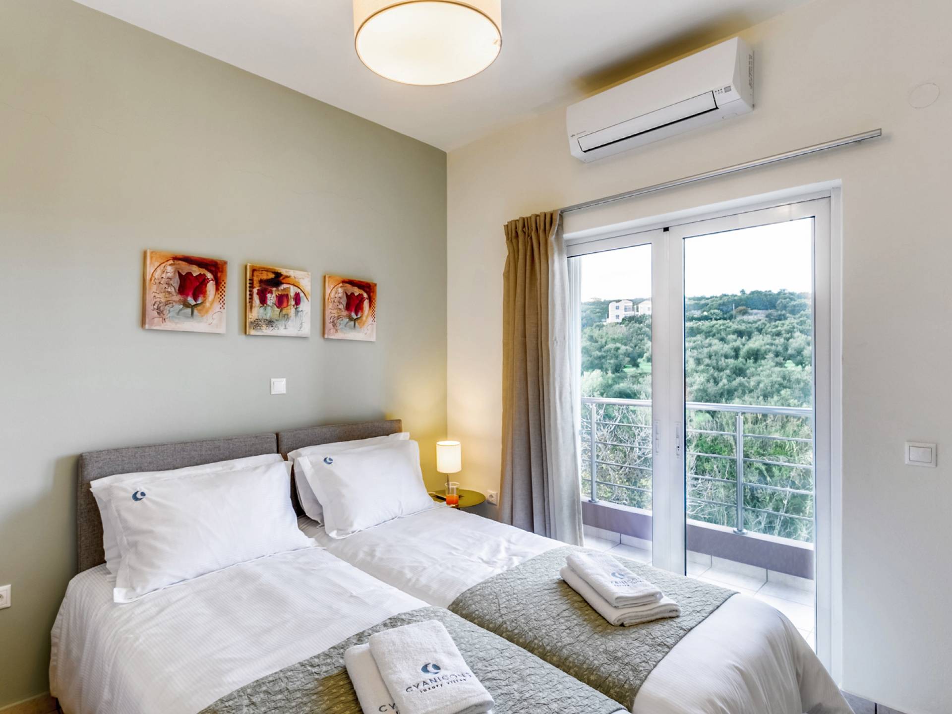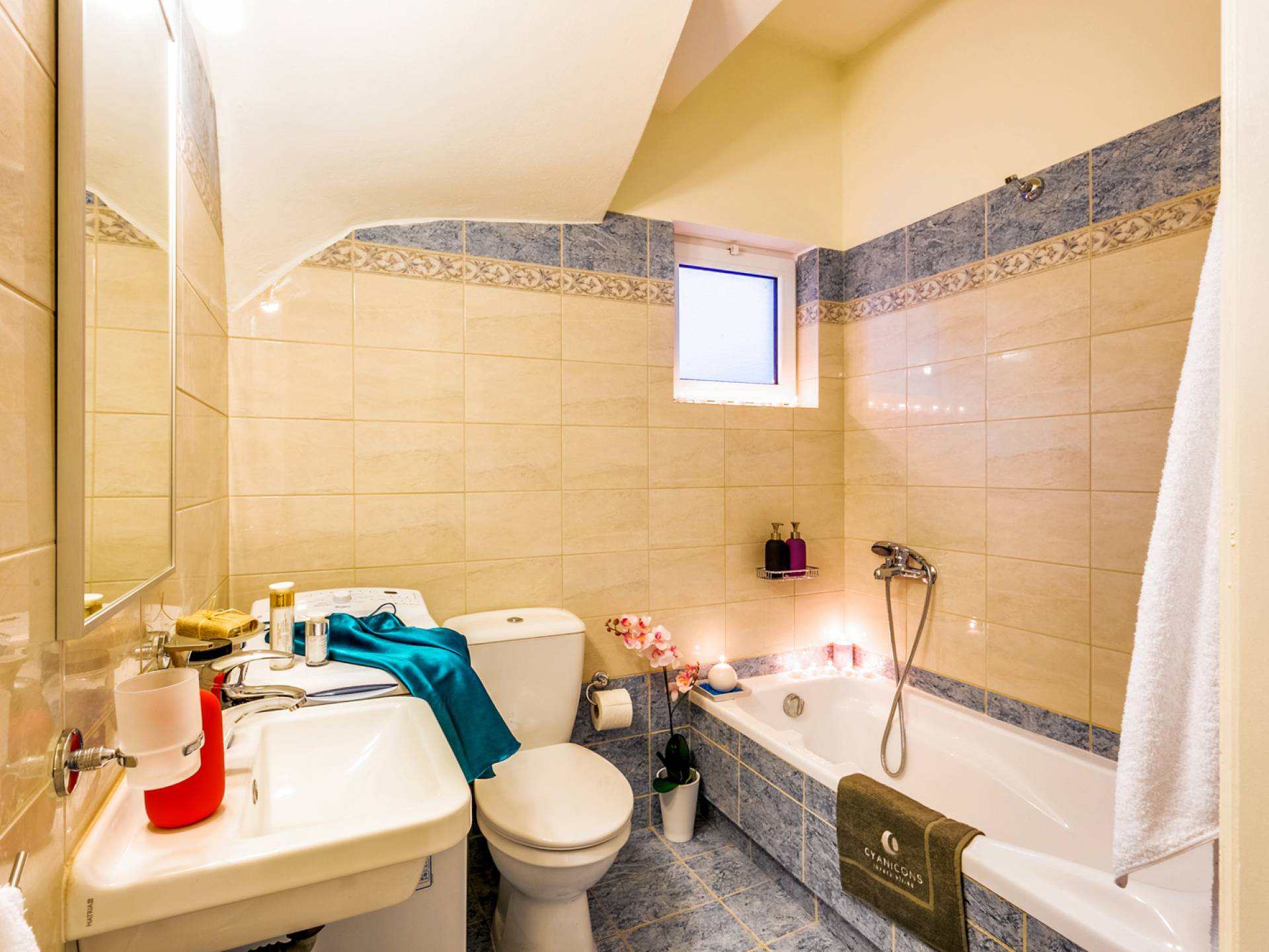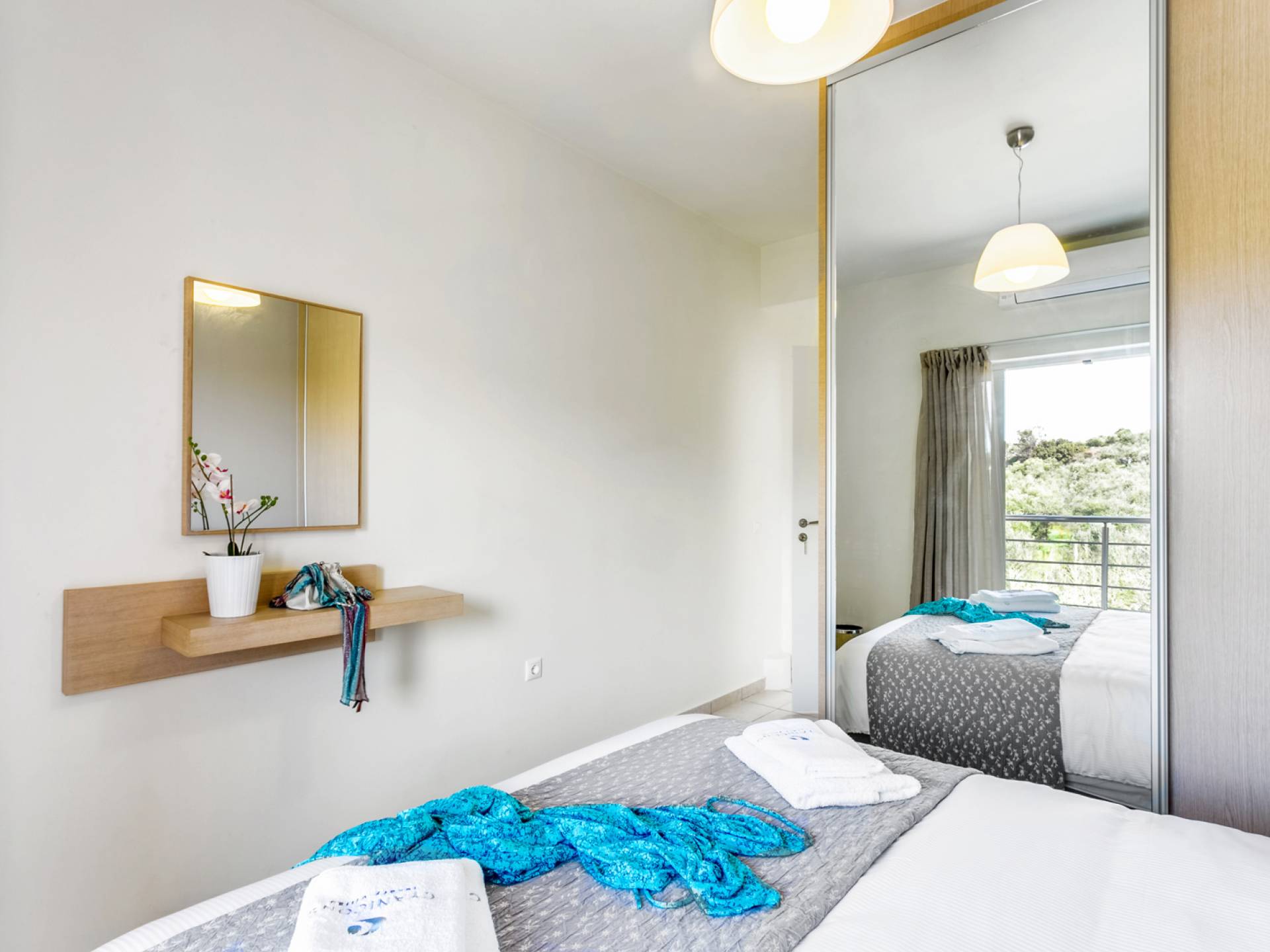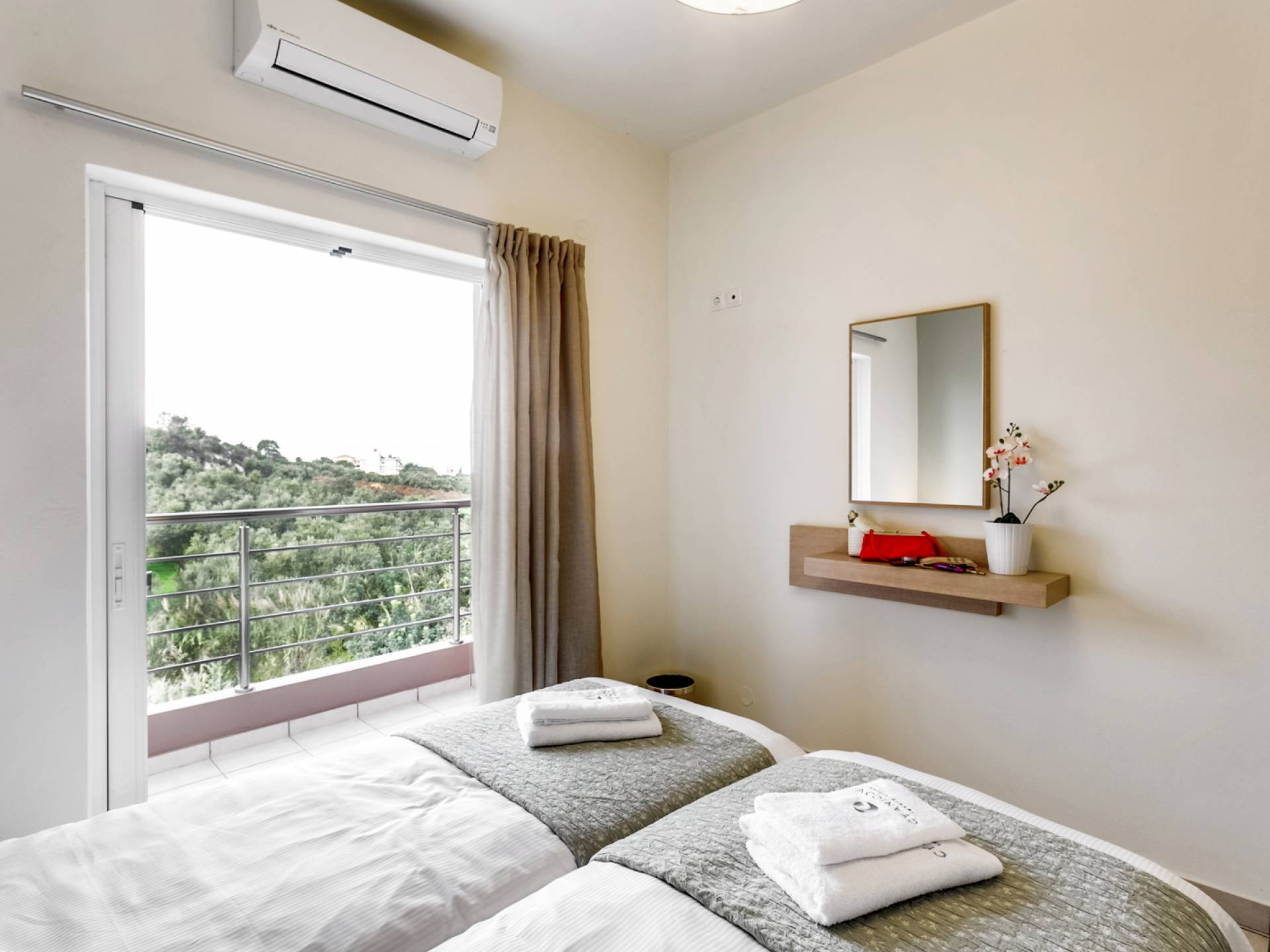 La vue pittoresque sur la mer et les montagnes est extrêmement accueillante et promet de vous offrir des souvenirs inoubliables. La confortable salle de bains au rez-de-chaussée intègre le caractère unique de l'Almyrida Villa Chania, avec une baignoire spacieuse et une machine à laver. La chambre située au rez-de-chaussée offre 2 lits simples qui peuvent être convertis en lit double sur demande. Enfin, il y a des armoires spacieuses et un miroir intégral.