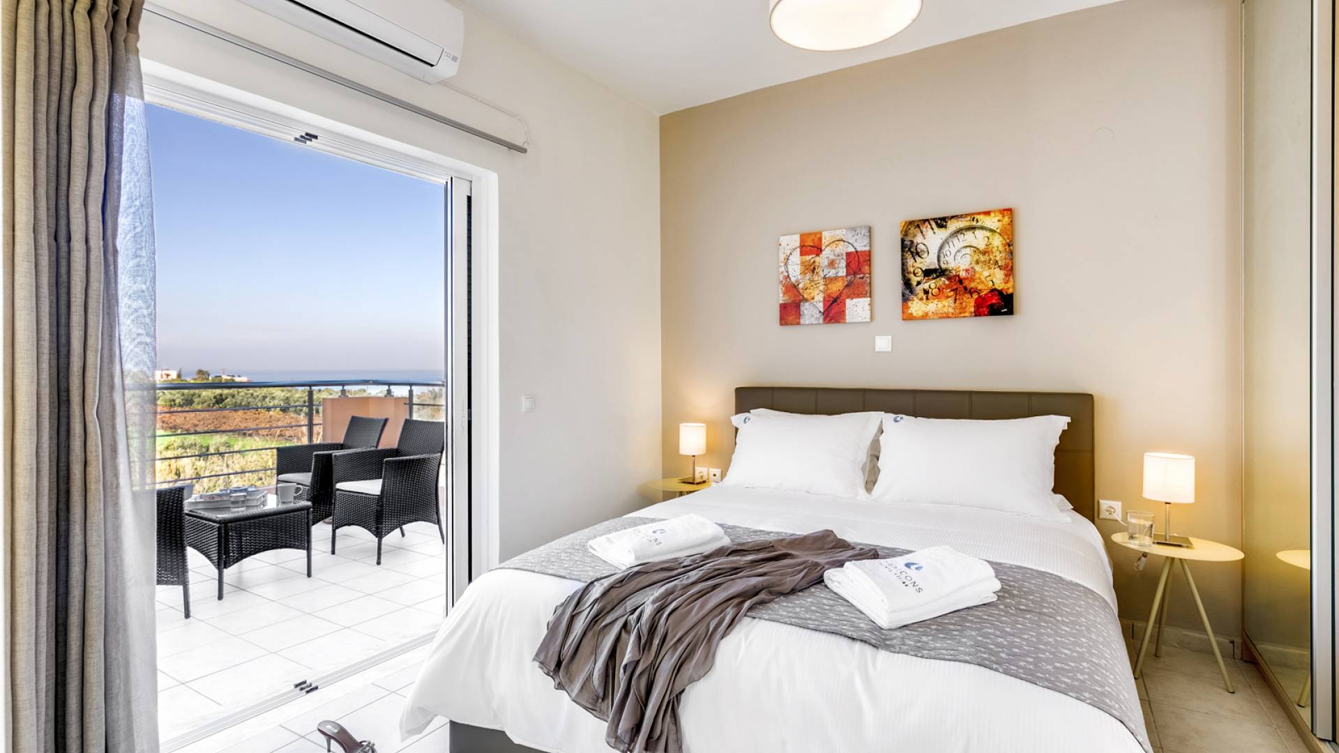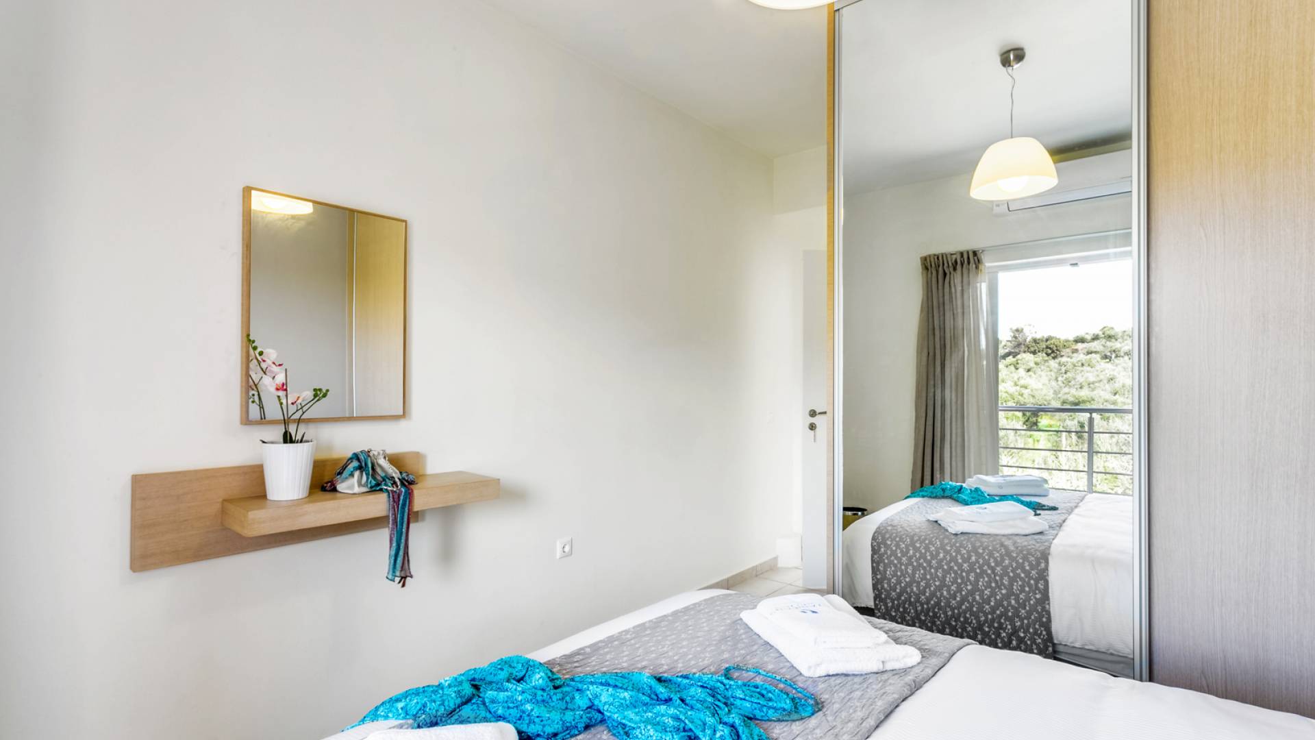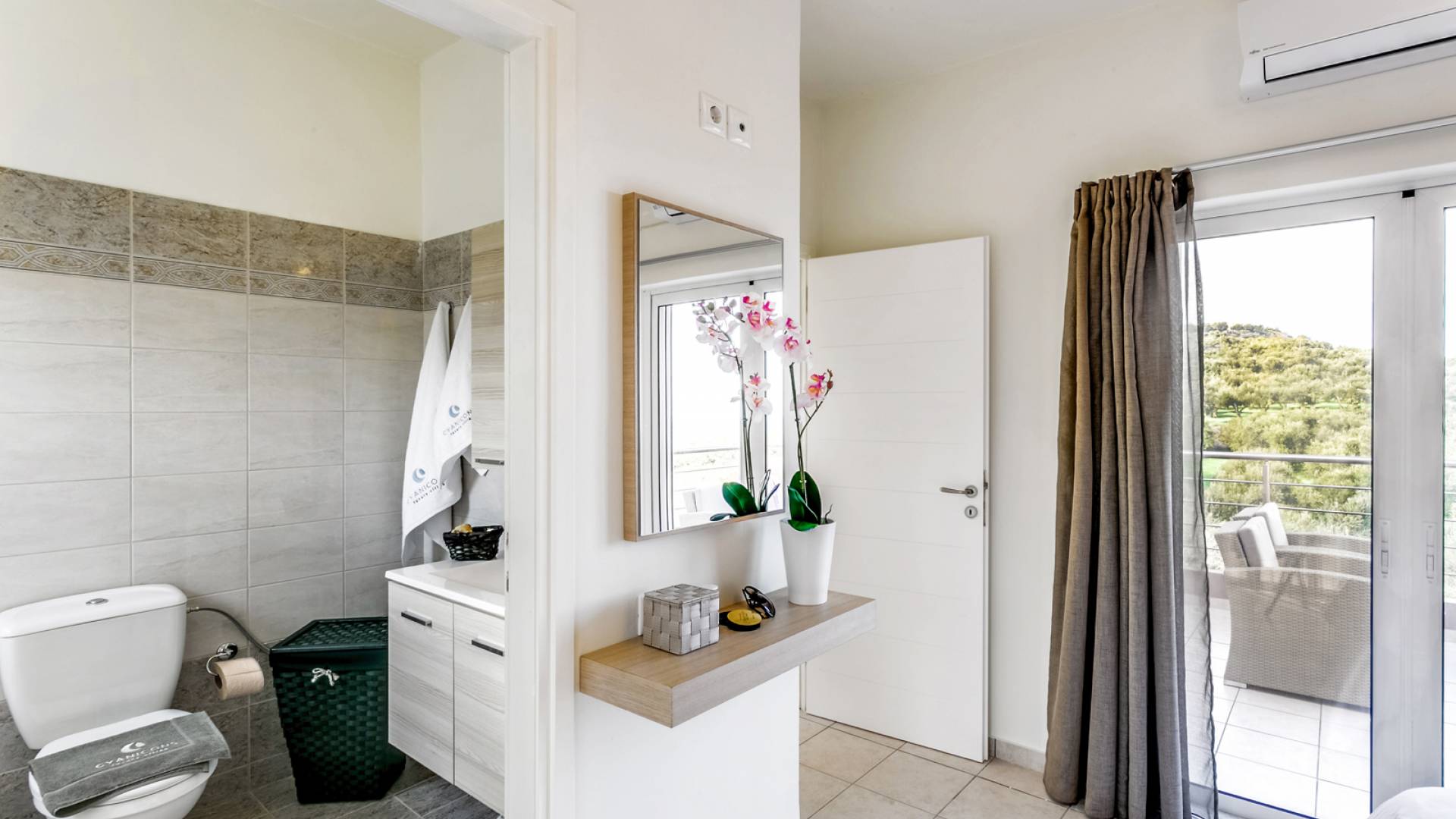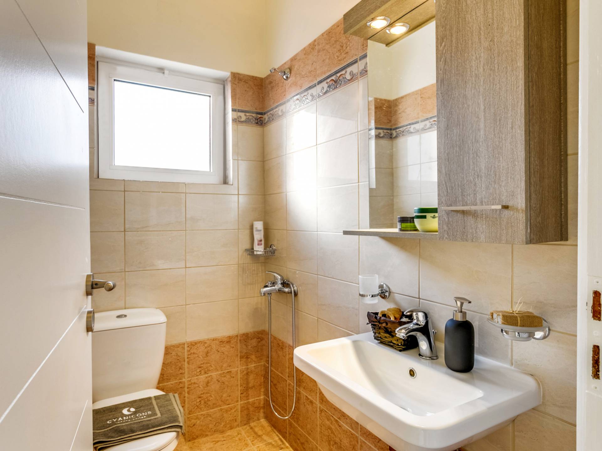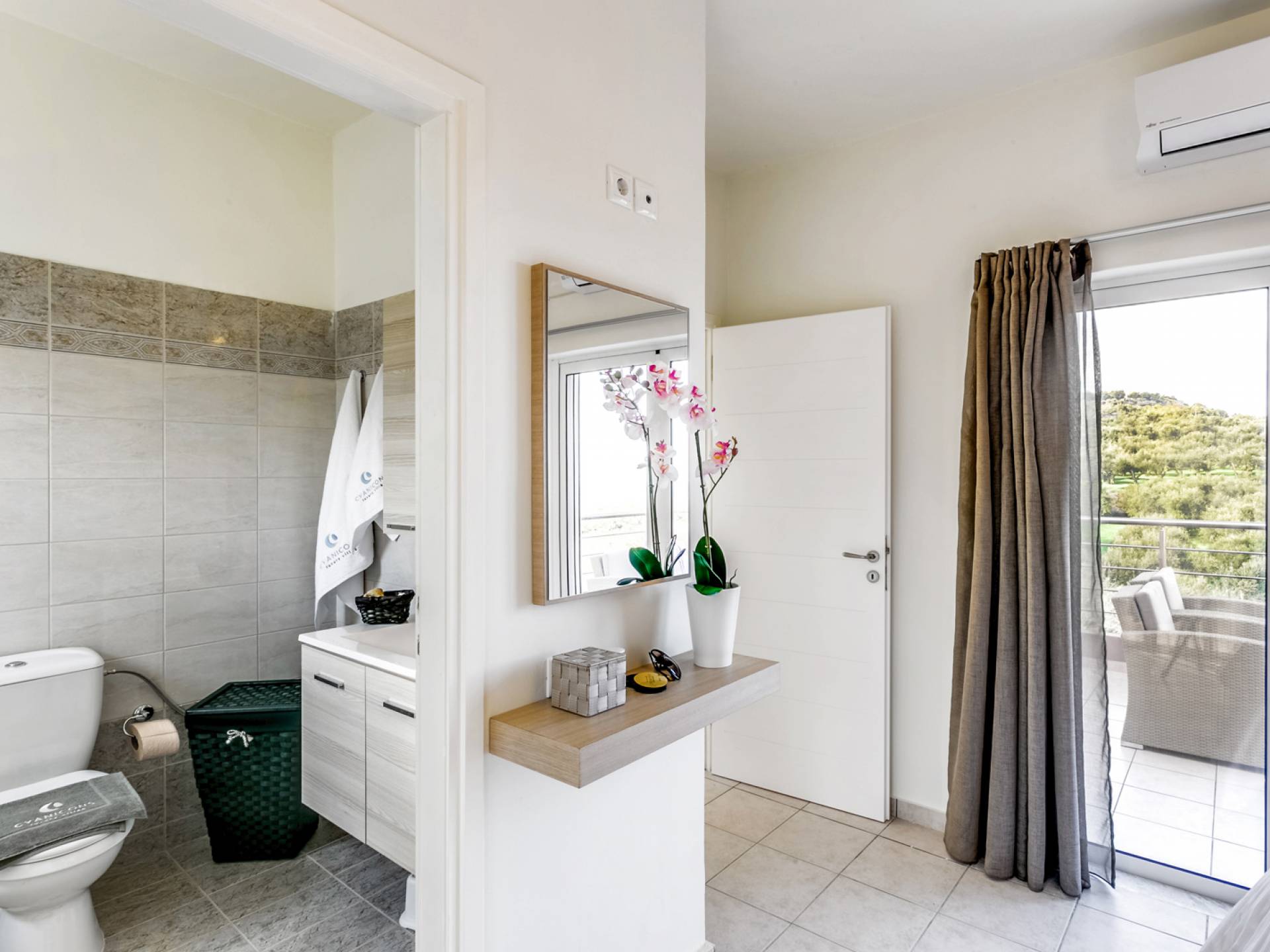 La vue pittoresque sur la mer et les montagnes est extrêmement accueillante et promet de vous offrir des souvenirs inoubliables. La confortable salle de bains au rez-de-chaussée intègre le caractère unique de l'Almyrida Villa Chania, avec une baignoire spacieuse et une machine à laver. La chambre située au rez-de-chaussée offre 2 lits simples qui peuvent être convertis en lit double sur demande. Enfin, il y a des armoires spacieuses et un miroir intégral.