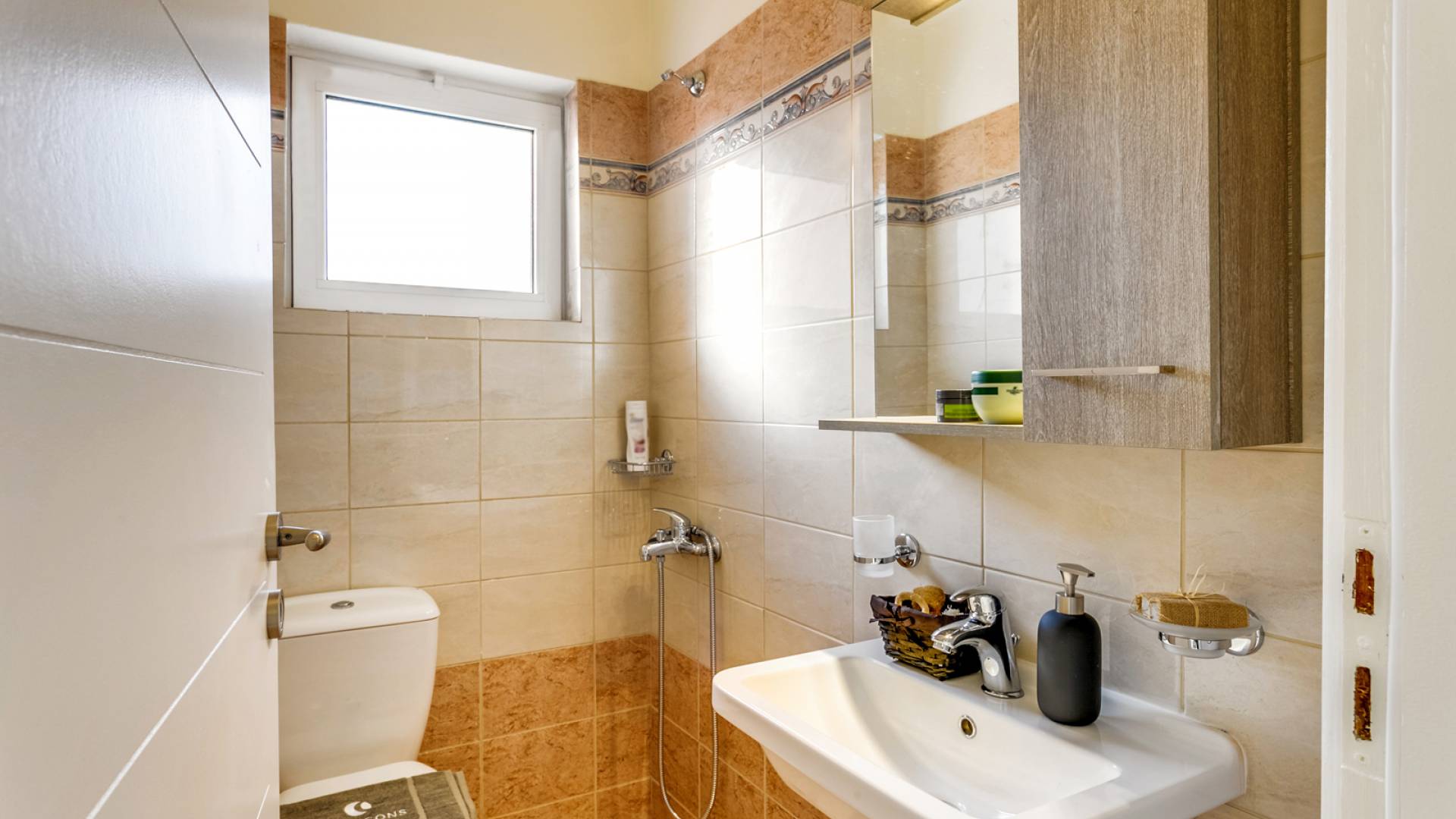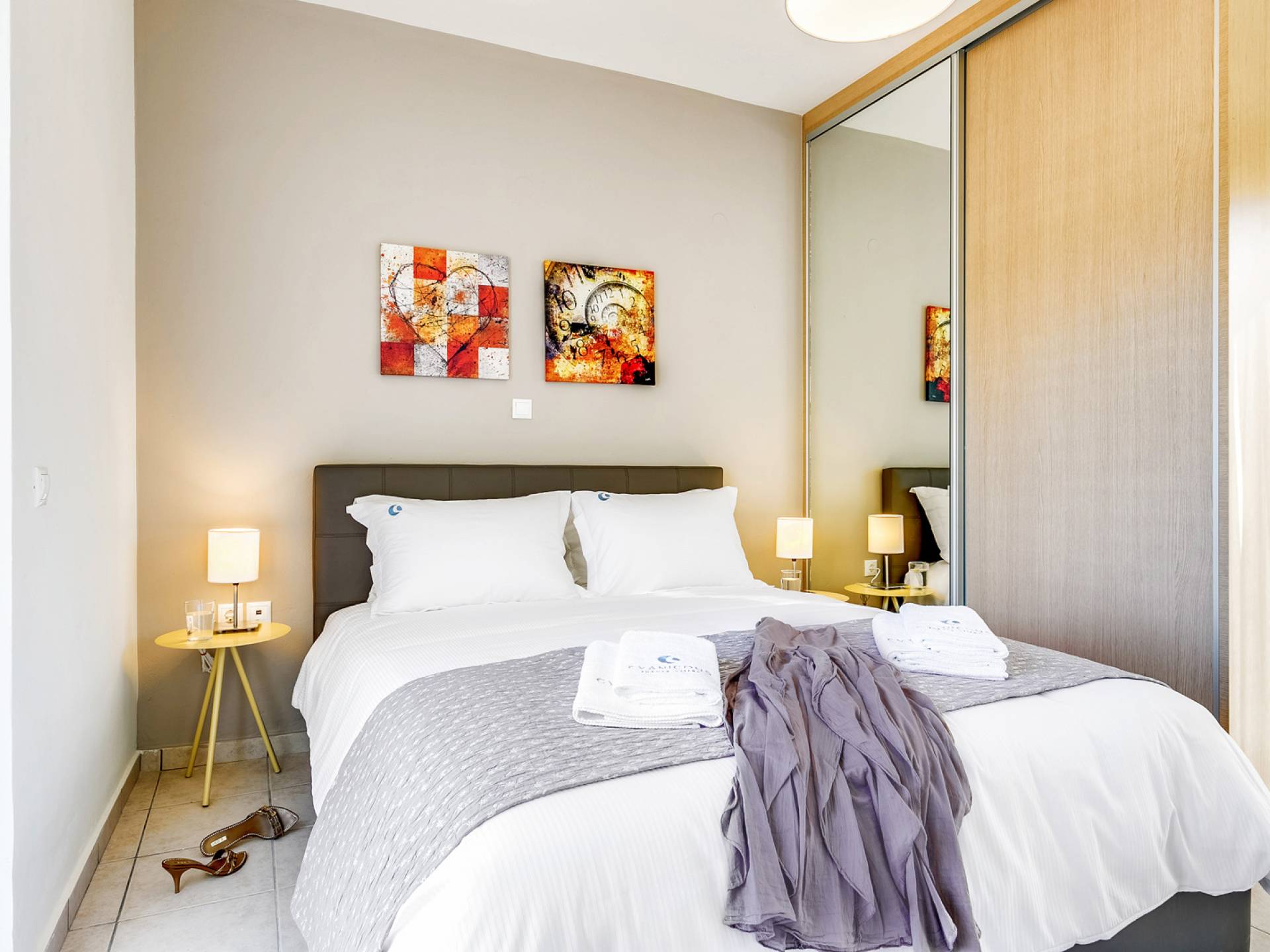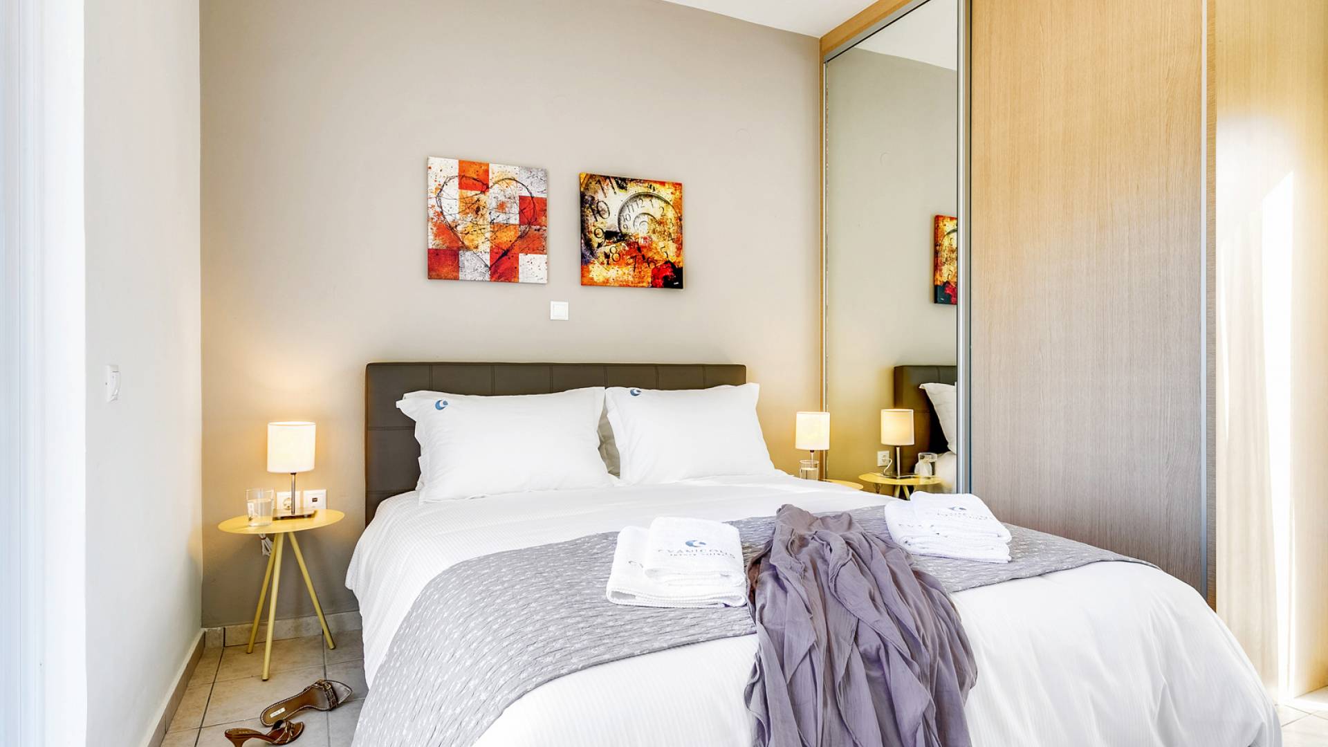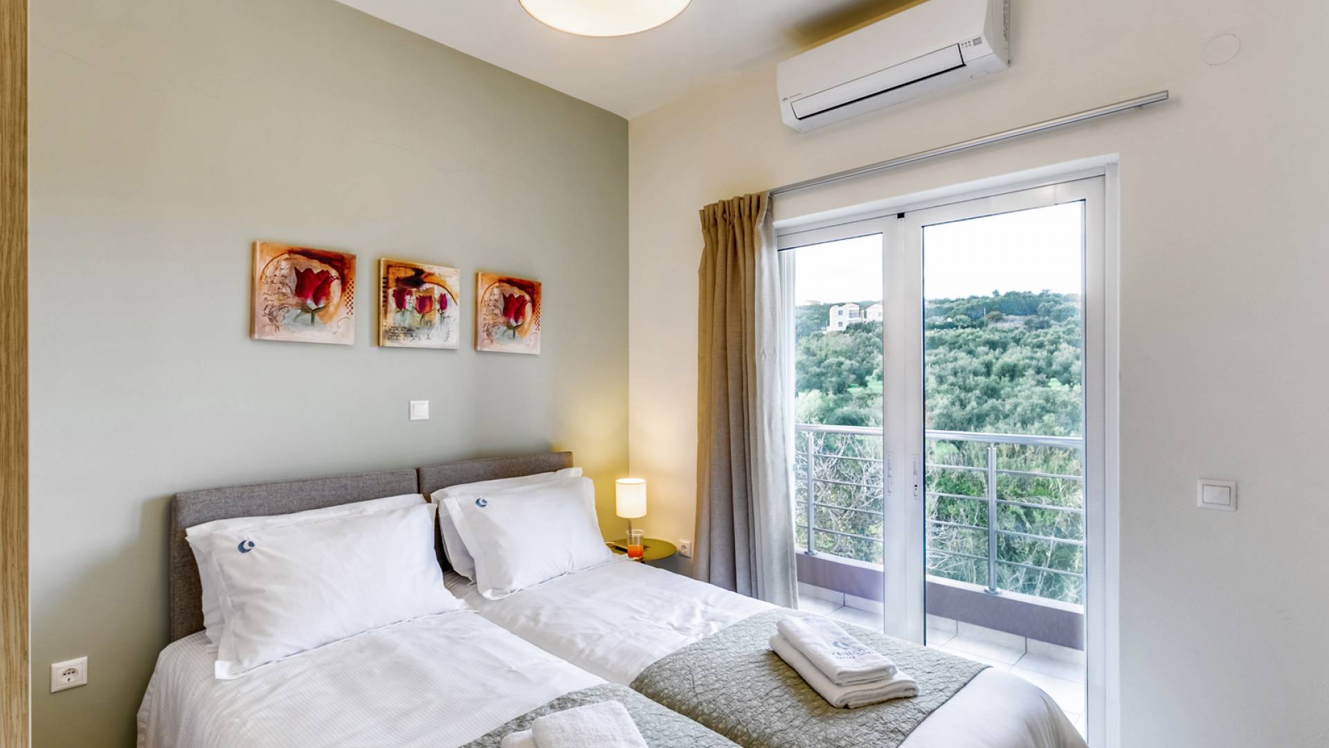 La vue pittoresque sur la mer et les montagnes est extrêmement accueillante et promet de vous offrir des souvenirs inoubliables. La confortable salle de bains au rez-de-chaussée intègre le caractère unique de l'Almyrida Villa Chania, avec une baignoire spacieuse et une machine à laver. La chambre située au rez-de-chaussée offre 2 lits simples qui peuvent être convertis en lit double sur demande. Enfin, il y a des armoires spacieuses et un miroir intégral.