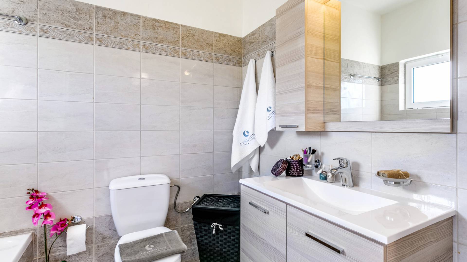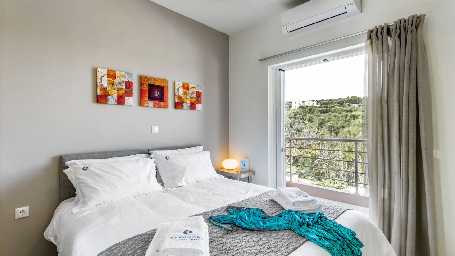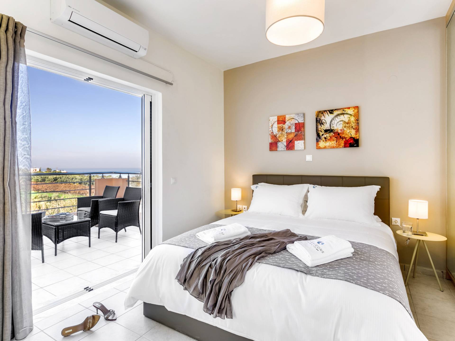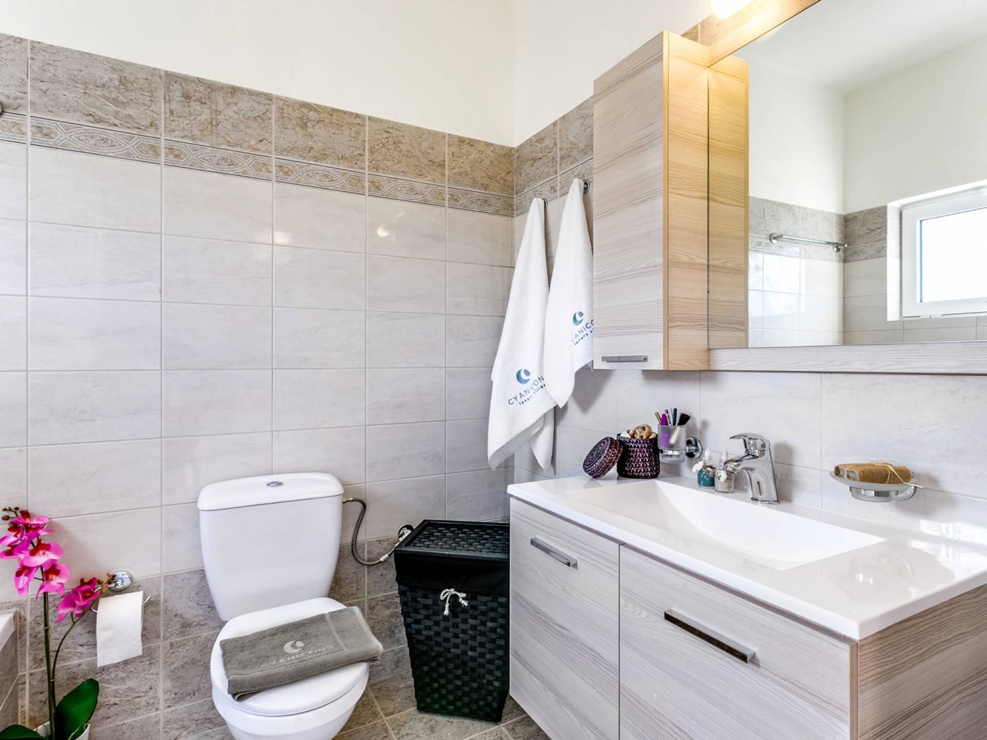 Au deuxième niveau, il y a une chambre principale qui dispose d'un lit double confortable et d'une luxueuse salle de bains privative avec baignoire. Il y a aussi une deuxième chambre avec deux lits simples (sur demande, les lits peuvent être transformés en un lit double) et un WC avec douche. Des matériaux nobles, une esthétique moderne et la passion du détail créent une ambiance enchanteresse sur tout le sol, qui est accentuée par la vue imprenable sur la mer sans fin et les montagnes fascinantes.
