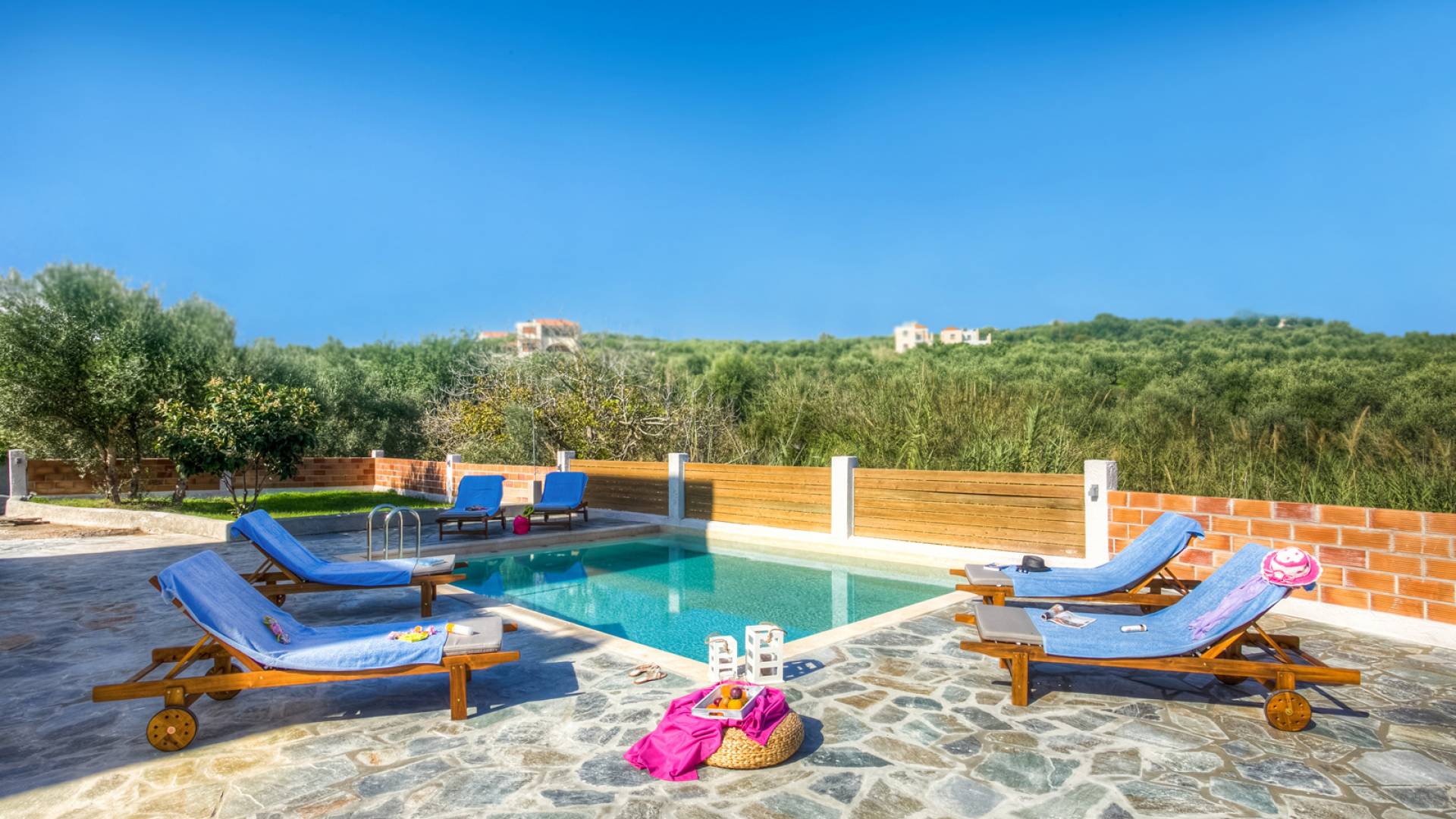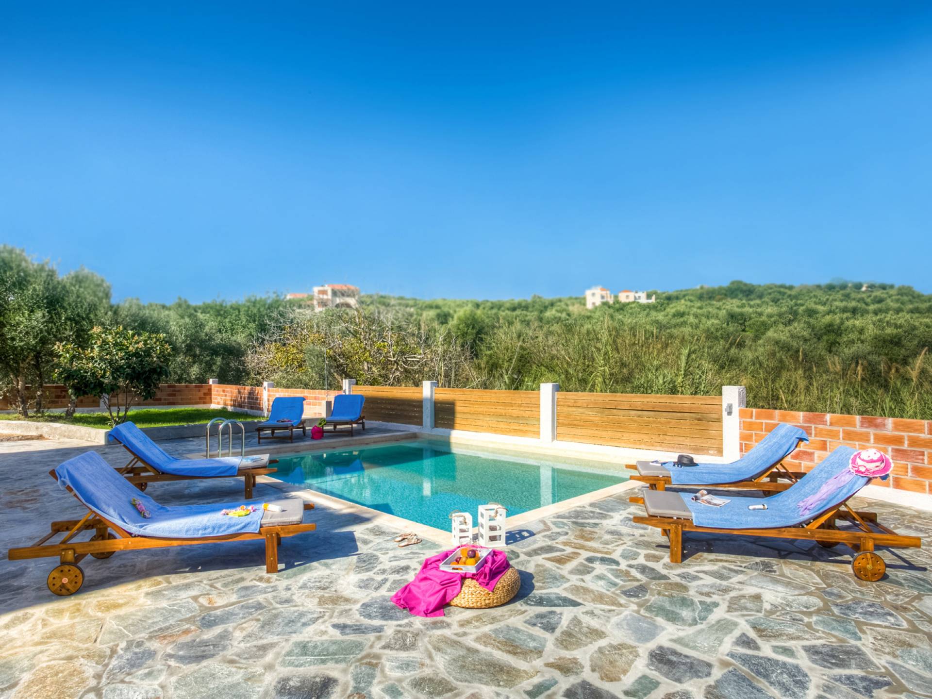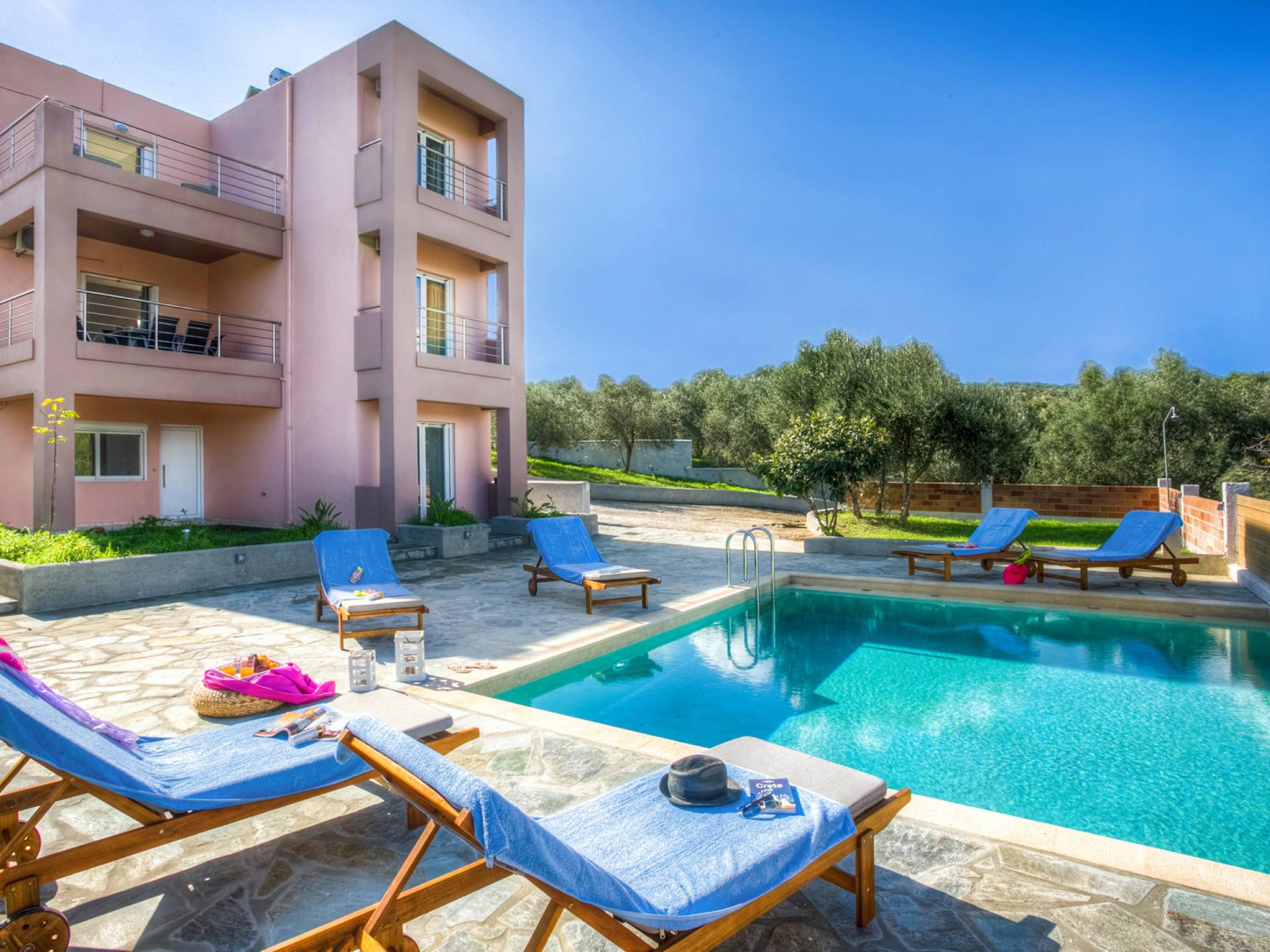 À l'extérieur, un seul coup d'œil suffit pour tomber amoureux du bel espace extérieur de la Villa Almyrida. La cour spacieuse est construite avec des pierres Kristo. Un chemin en pente mène directement à la piscine privée. Des chaises longues confortables vous accueillent pour profiter du beau temps crétois pendant que vous vous détendez sous le soleil grec doré. Les balcons qui entourent la villa offrent des coins cosy avec des fauteuils confortables, idéaux pour lire, se détendre ou simplement profiter de l'ambiance de votre environnement. Une table à manger en plein air est prête à vous accueillir, vous et vos amis ou votre famille, pendant que vous savourez le goût unique de la cuisine méditerranéenne ! La place de parking de la villa peut accueillir deux voitures.