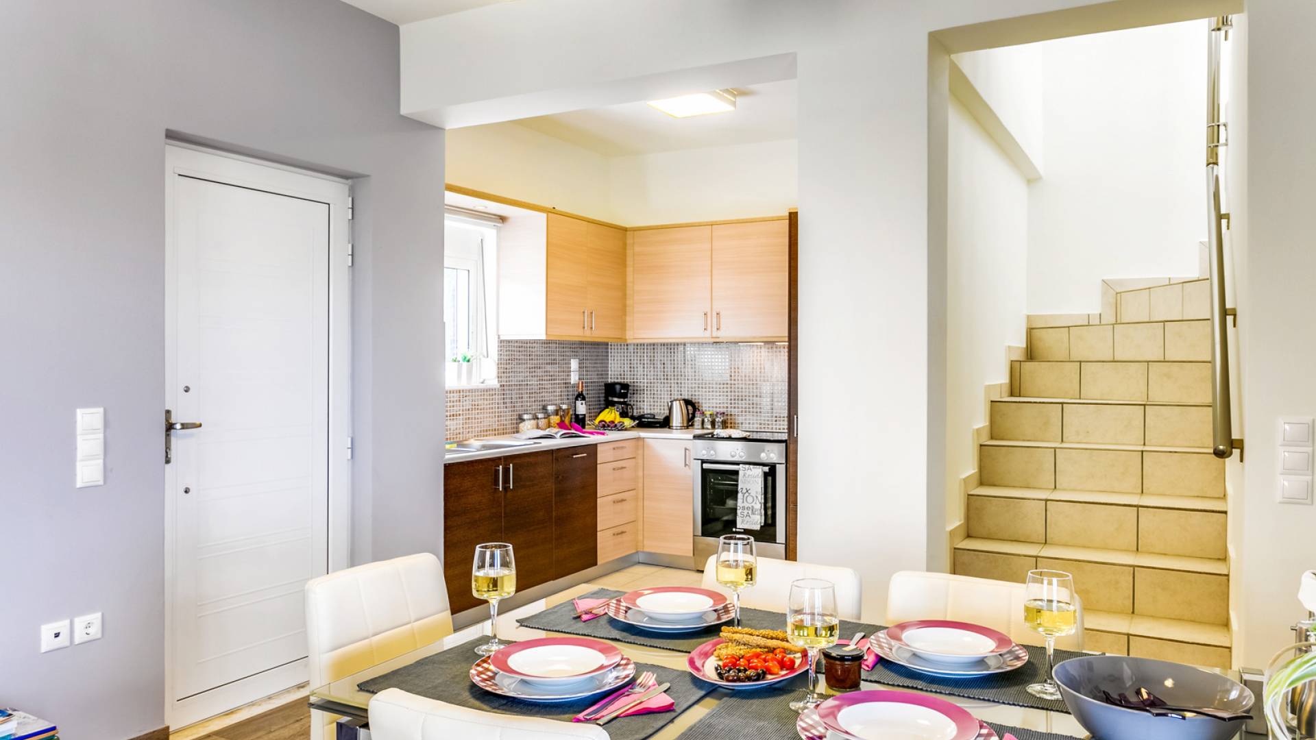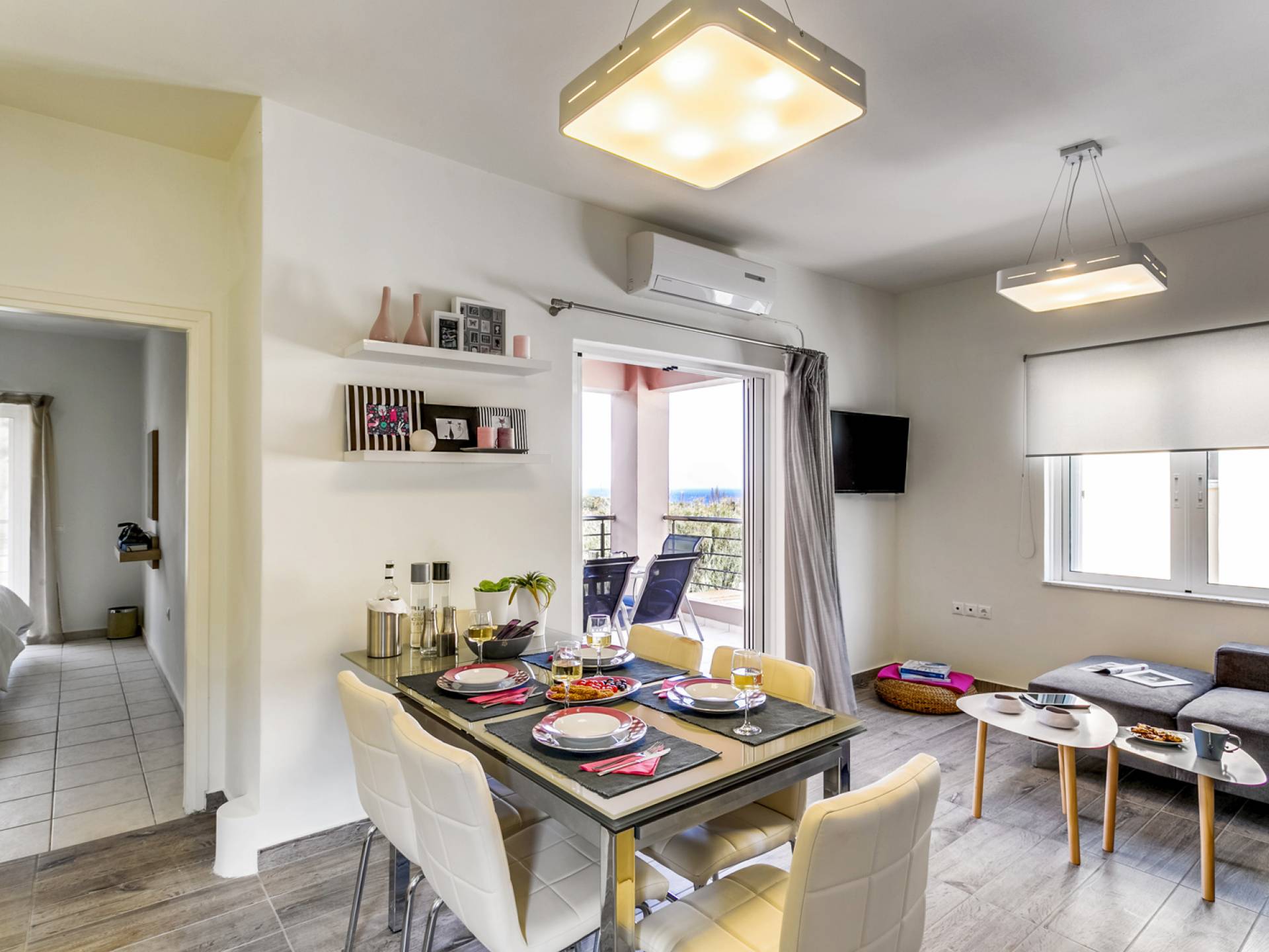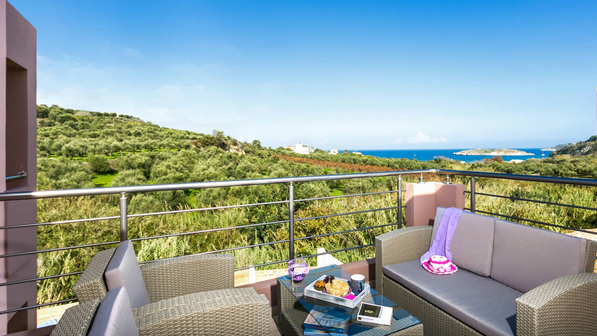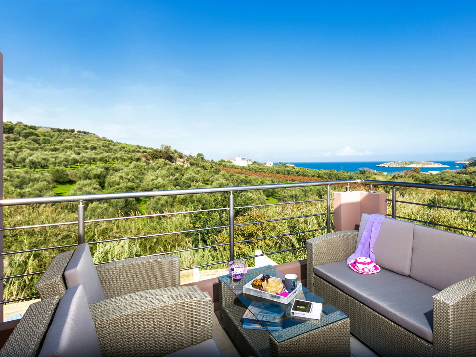 À l'extérieur, un seul coup d'œil suffit pour tomber amoureux du bel espace extérieur de la Villa Almyrida. La cour spacieuse est construite avec des pierres Kristo. Un chemin en pente mène directement à la piscine privée. Des chaises longues confortables vous accueillent pour profiter du beau temps crétois pendant que vous vous détendez sous le soleil grec doré. Les balcons qui entourent la villa offrent des coins cosy avec des fauteuils confortables, idéaux pour lire, se détendre ou simplement profiter de l'ambiance de votre environnement. Une table à manger en plein air est prête à vous accueillir, vous et vos amis ou votre famille, pendant que vous savourez le goût unique de la cuisine méditerranéenne ! La place de parking de la villa peut accueillir deux voitures.