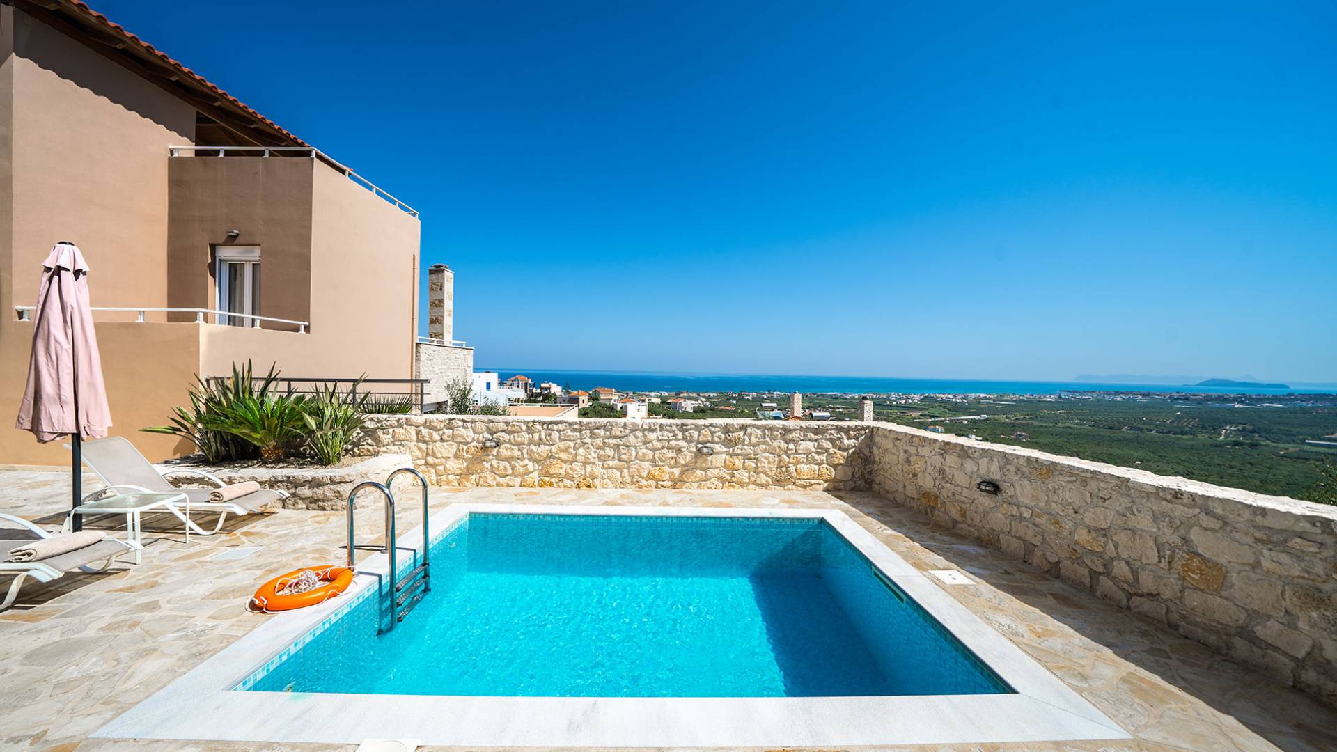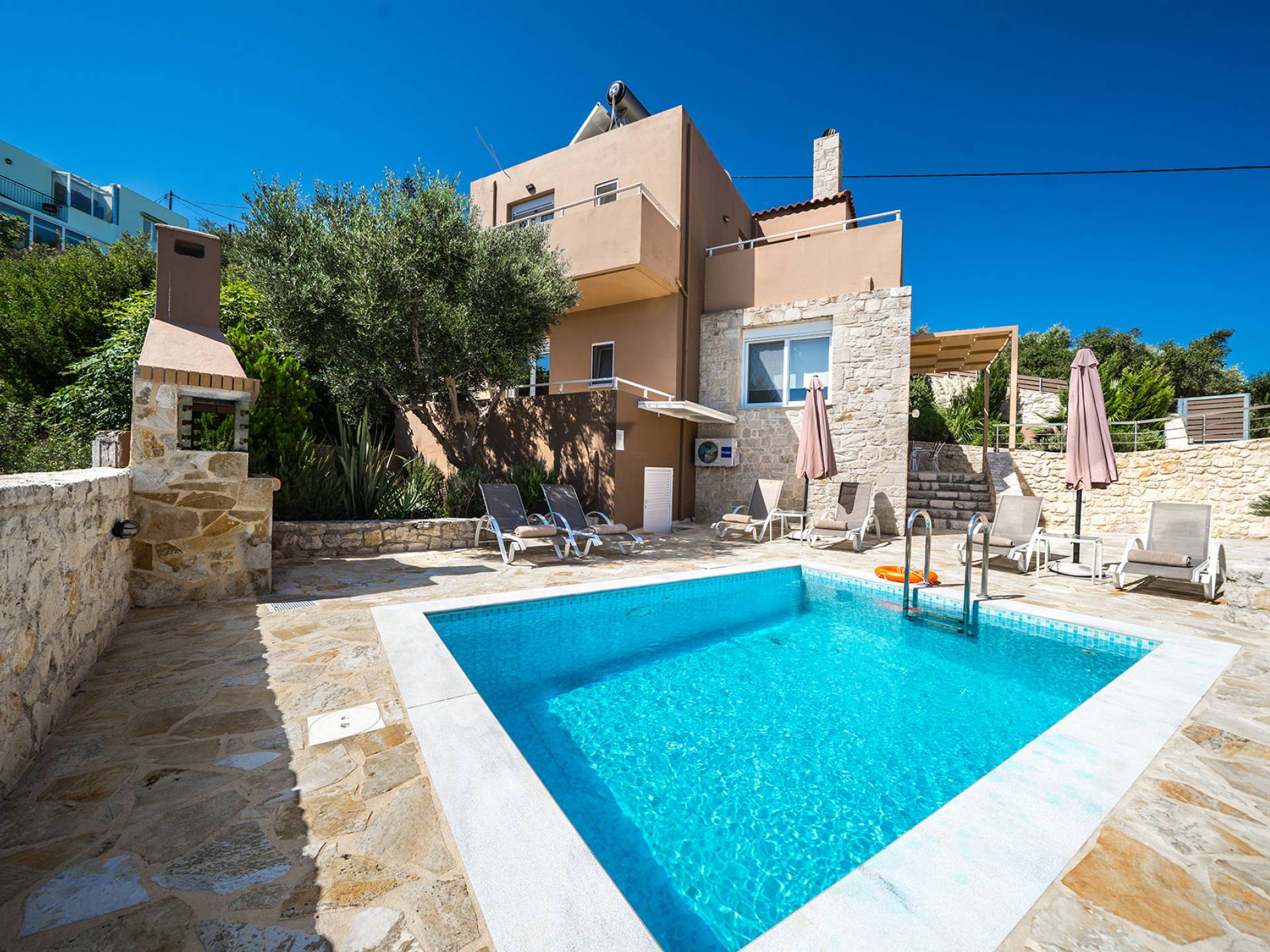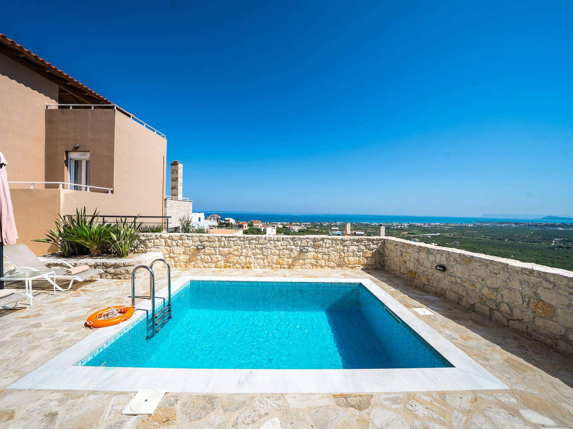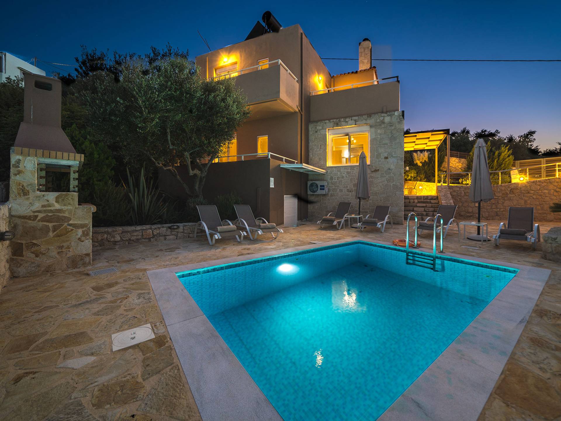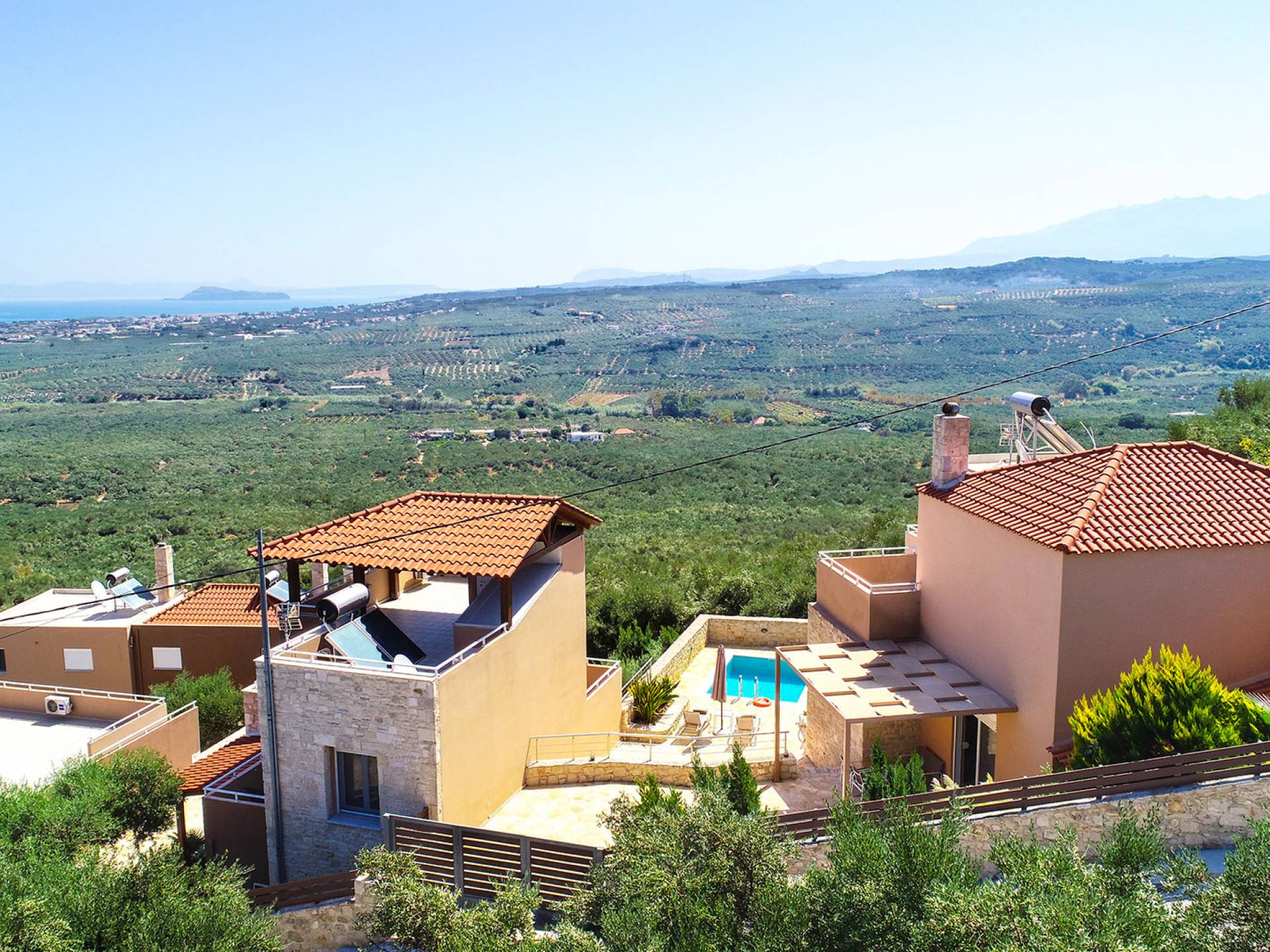 Amoena Villa à Theo Villas Chania est une location de villa de luxe avec 3 chambres et une piscine privée. La Villa Amoena est une luxueuse maisonnette néo-classique construite en hauteur avec une vue magnifique sur les oliveraies, les montagnes et la mer.