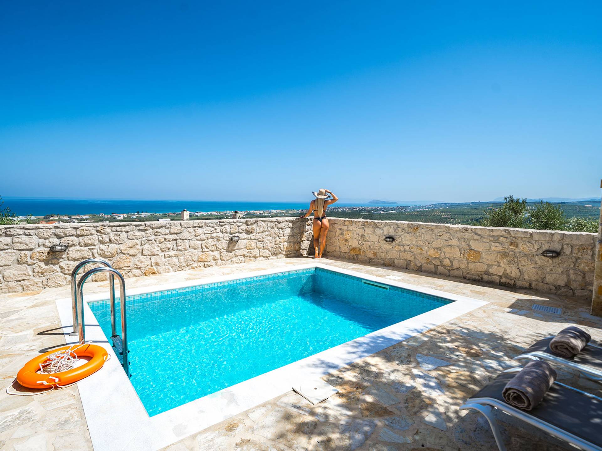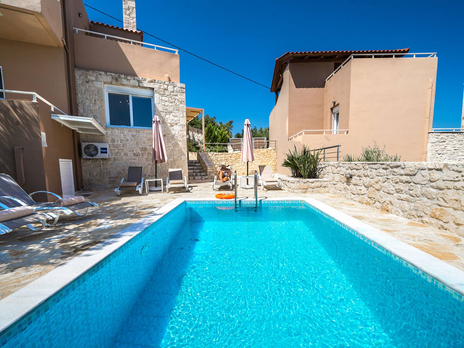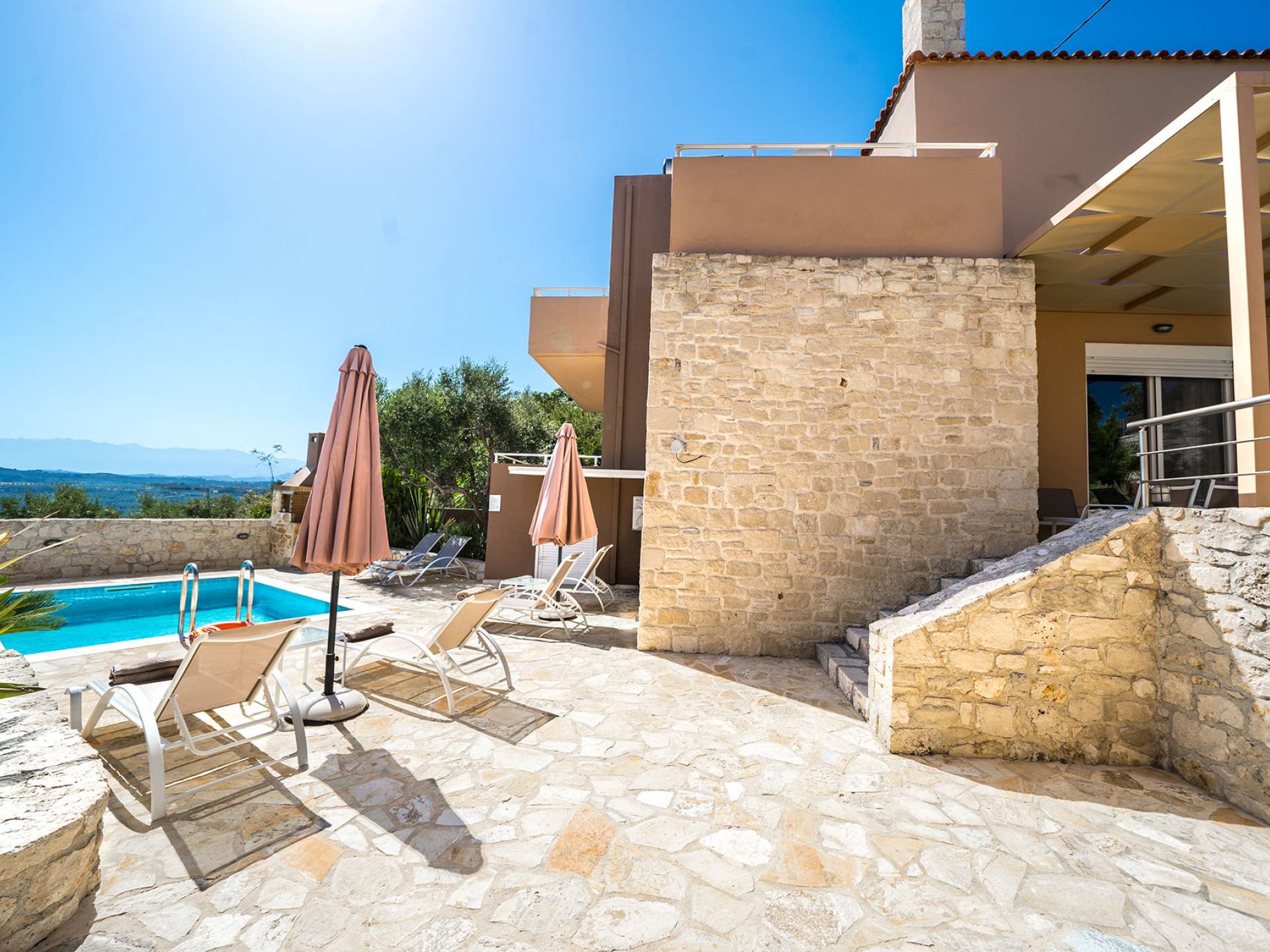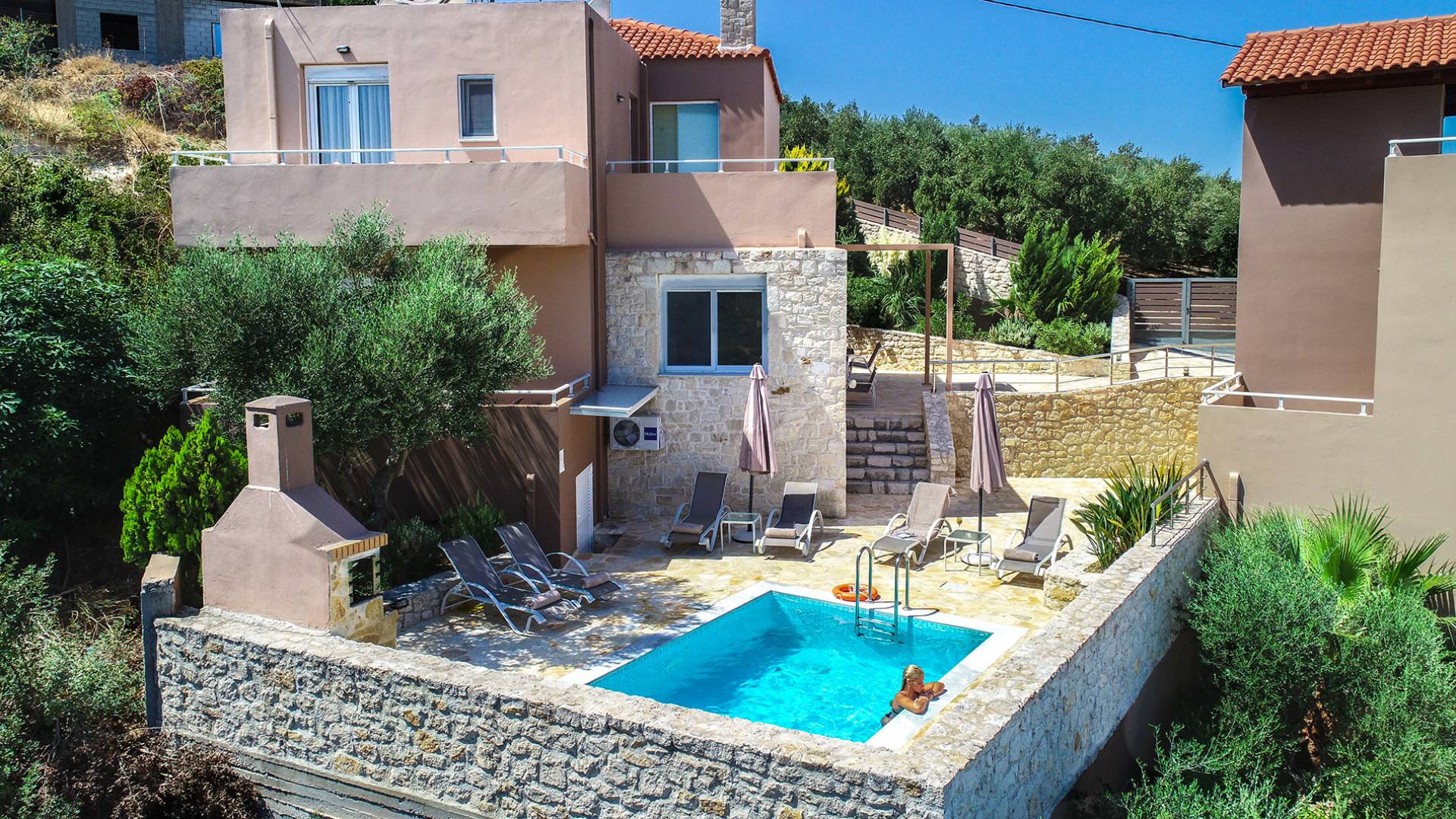 Amoena Villa à Theo Villas Chania est une location de villa de luxe avec 3 chambres et une piscine privée. La Villa Amoena est une luxueuse maisonnette néo-classique construite en hauteur avec une vue magnifique sur les oliveraies, les montagnes et la mer.