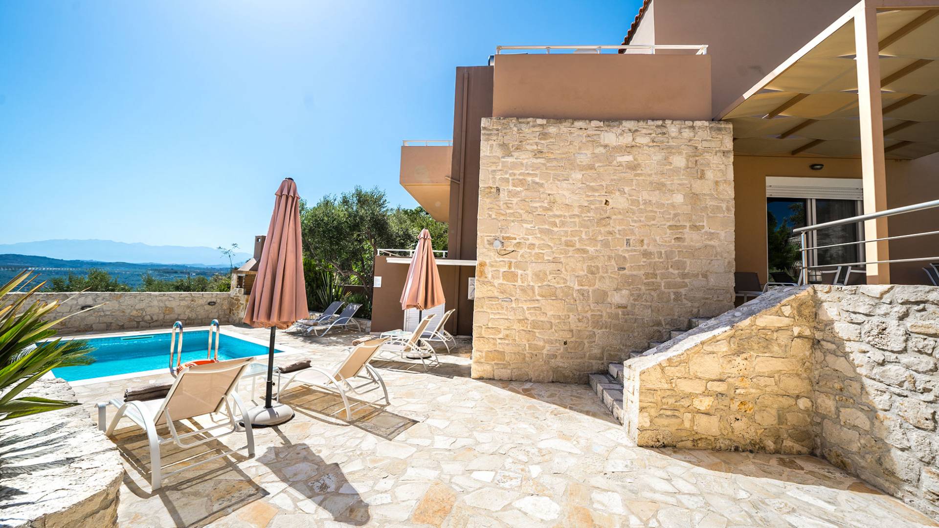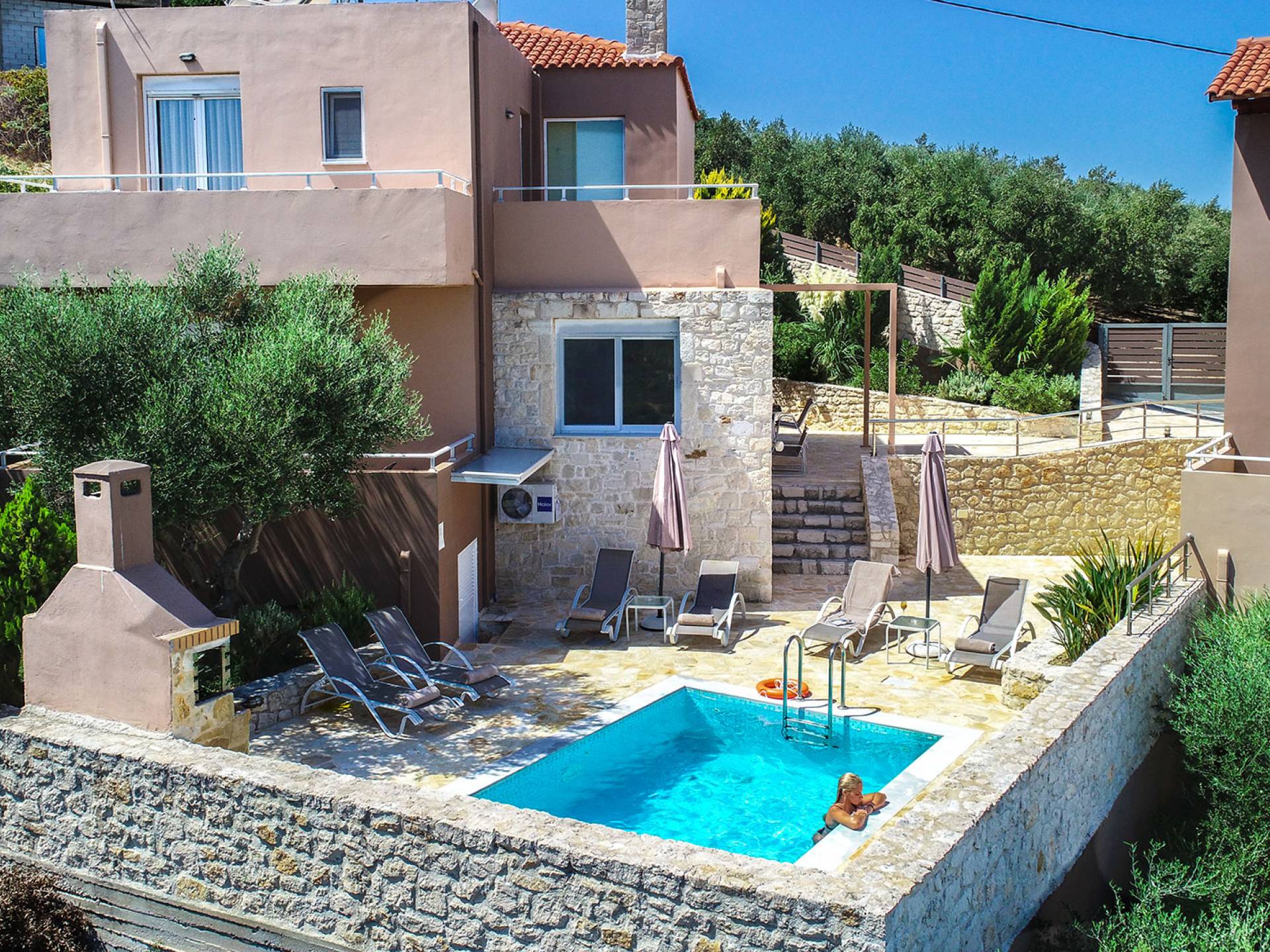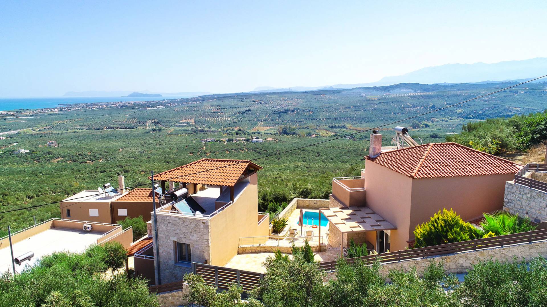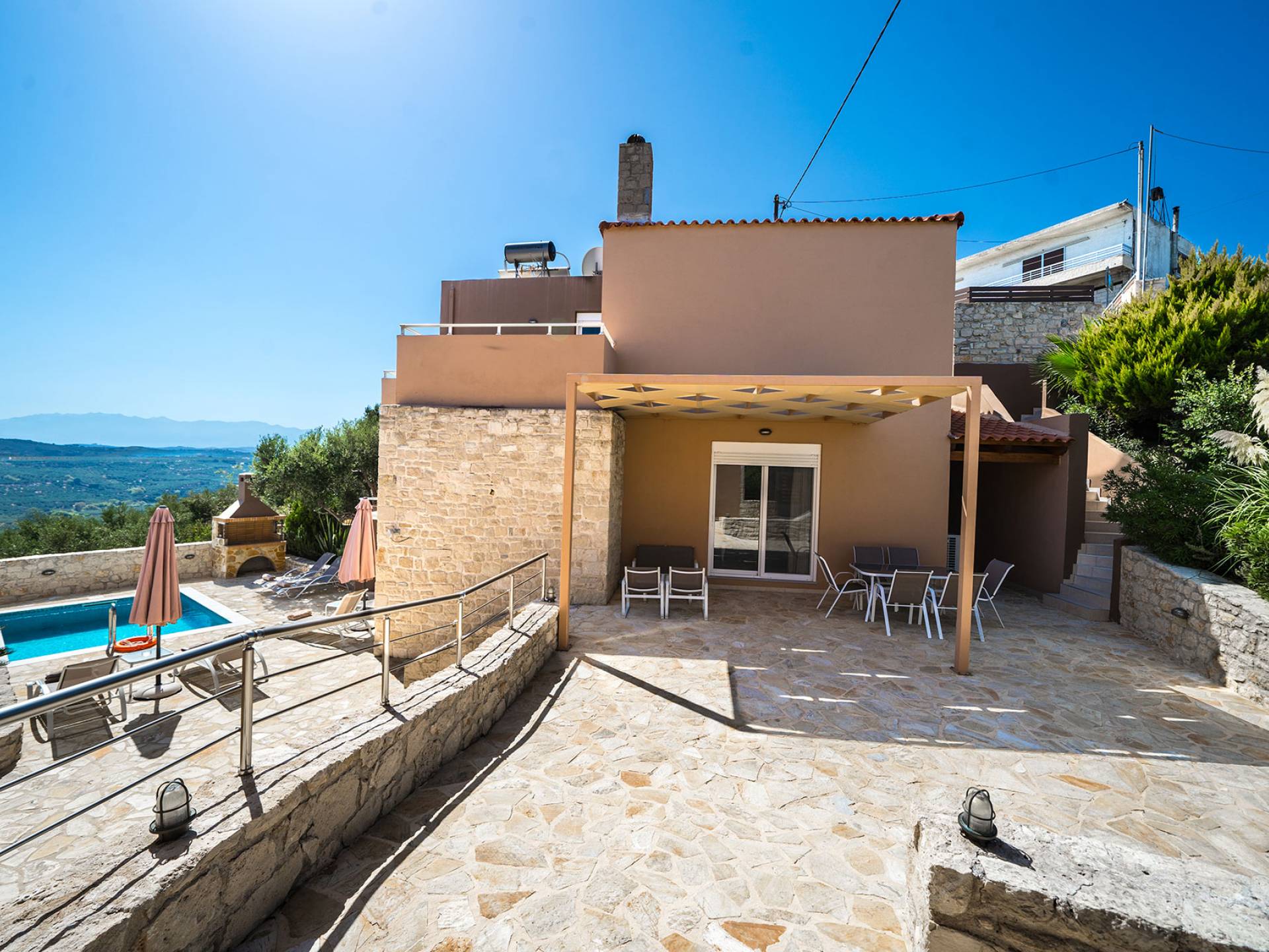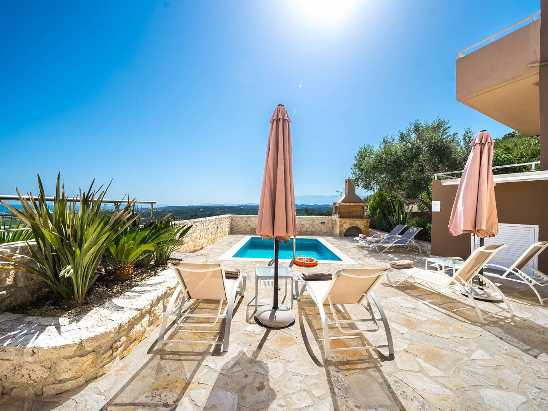Amoena Villa à Theo Villas Chania est une location de villa de luxe avec 3 chambres et une piscine privée. La Villa Amoena est une luxueuse maisonnette néo-classique construite en hauteur avec une vue magnifique sur les oliveraies, les montagnes et la mer.