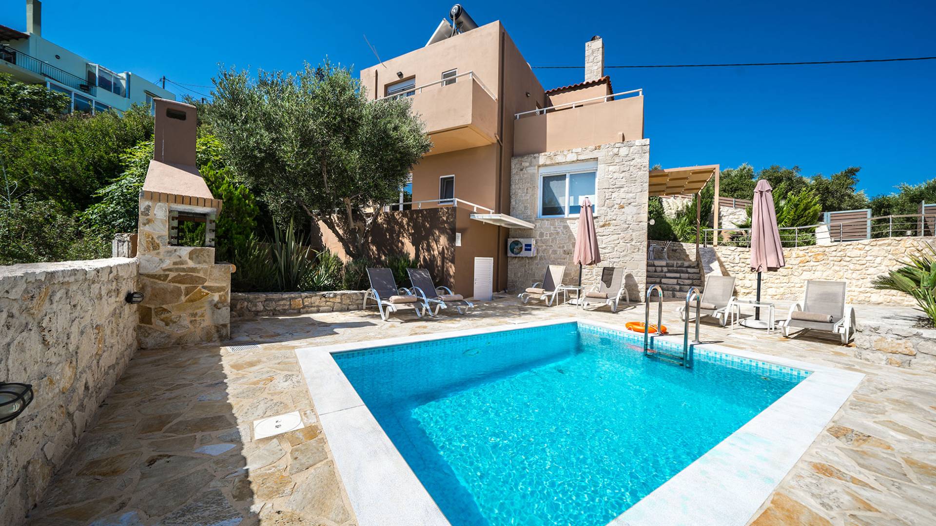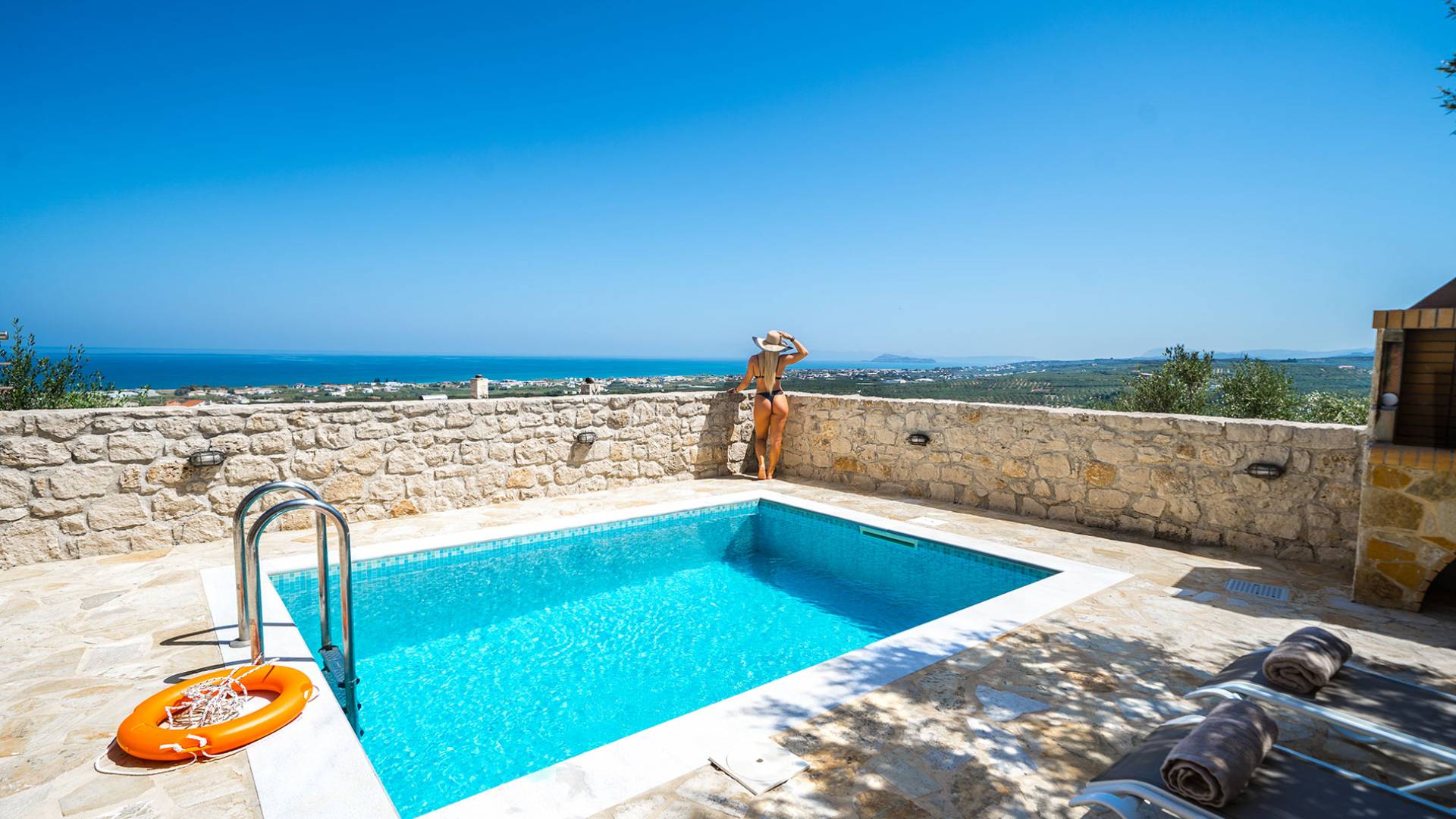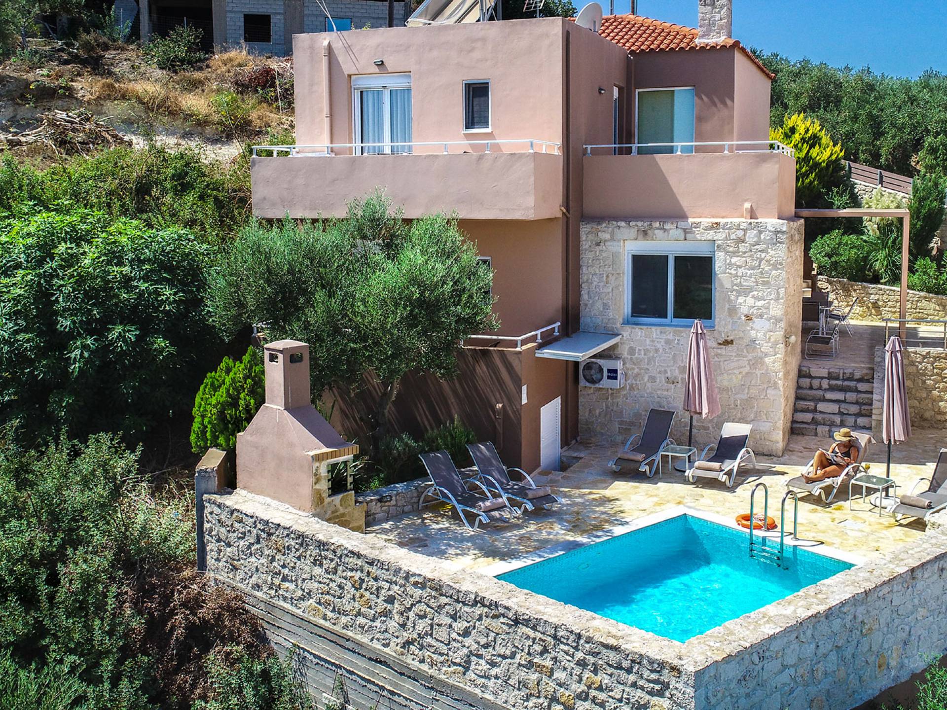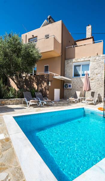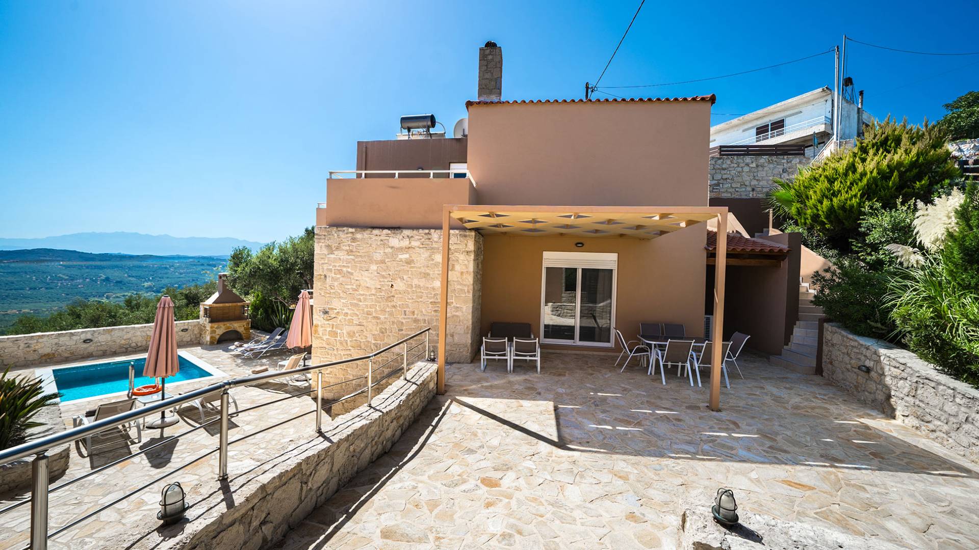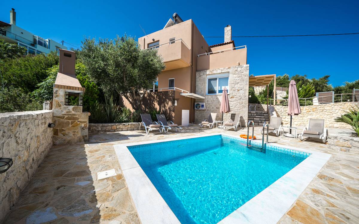 Amoena Villa à Theo Villas Chania est une location de villa de luxe avec 3 chambres et une piscine privée. La Villa Amoena est une luxueuse maisonnette néo-classique construite en hauteur avec une vue magnifique sur les oliveraies, les montagnes et la mer.