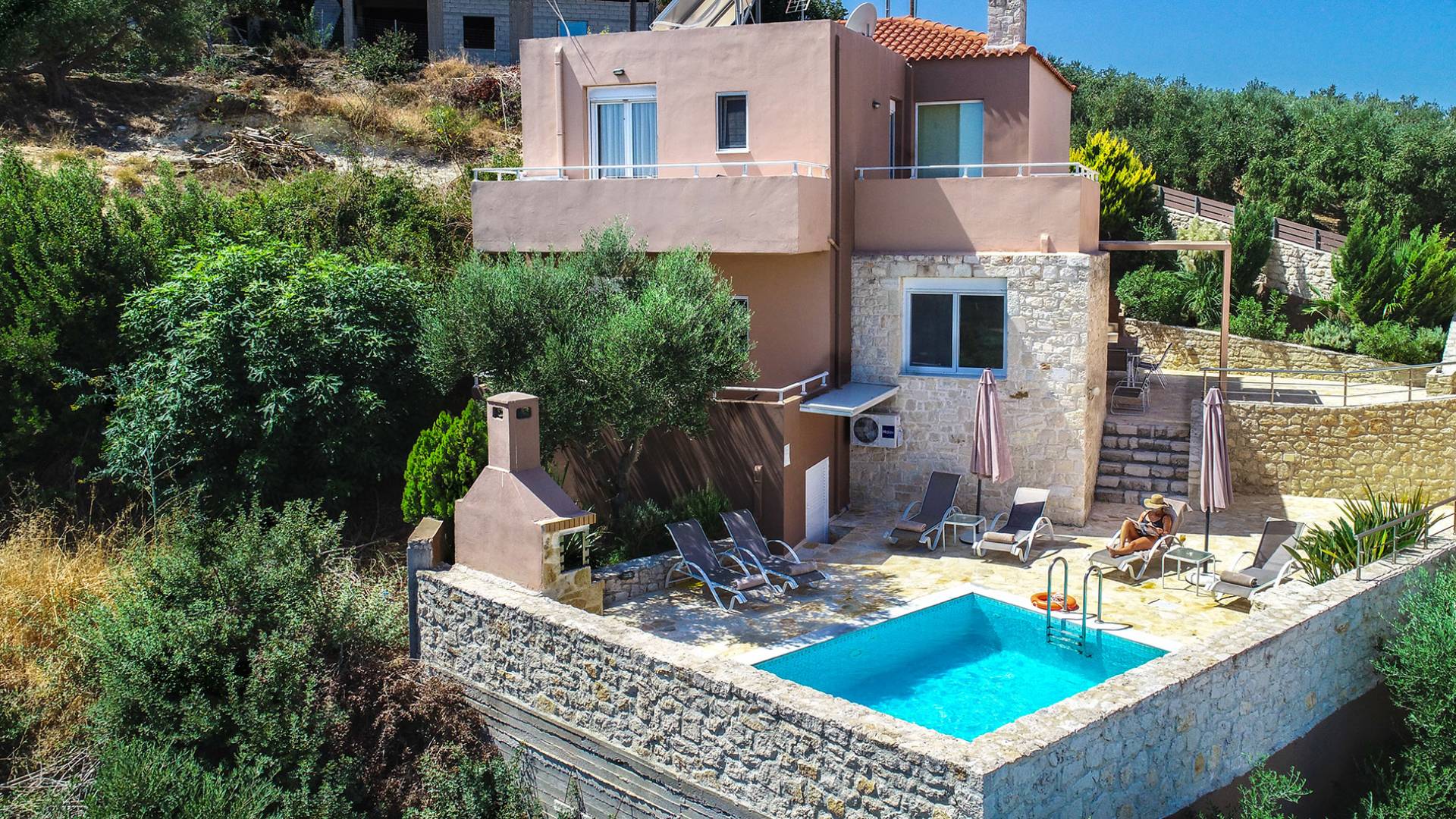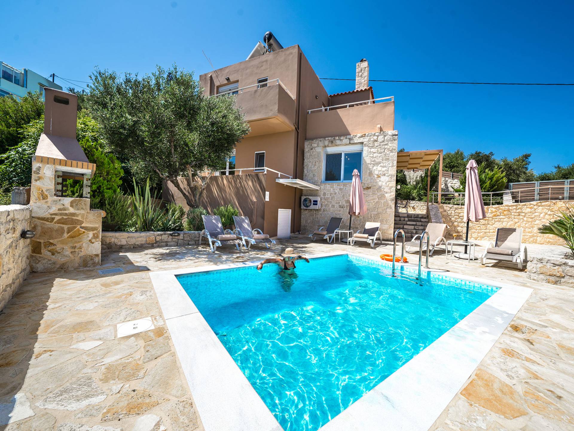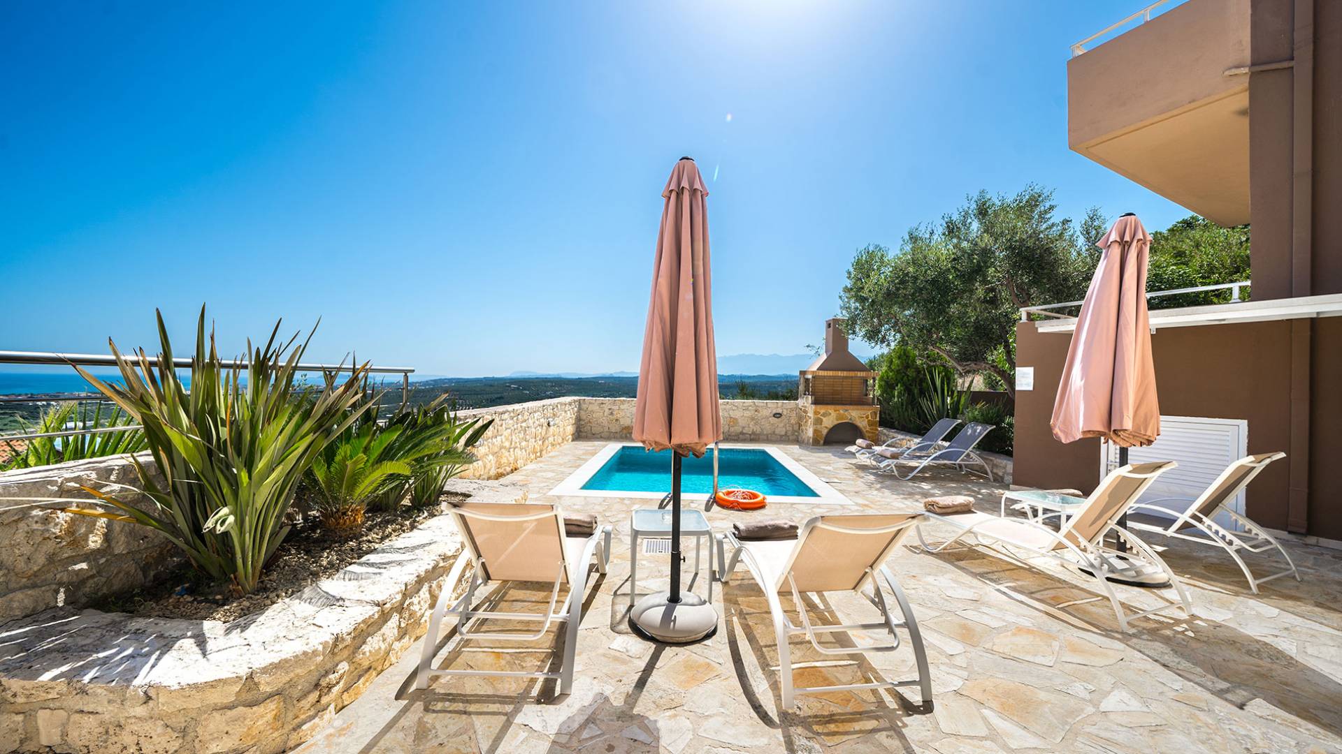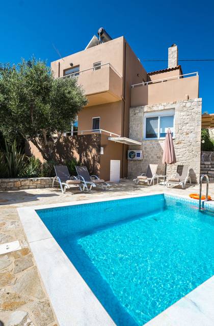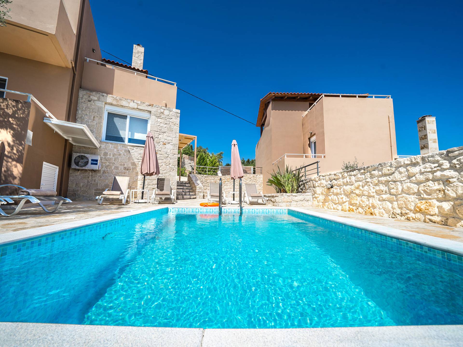 Amoena Villa à Theo Villas Chania est une location de villa de luxe avec 3 chambres et une piscine privée. La Villa Amoena est une luxueuse maisonnette néo-classique construite en hauteur avec une vue magnifique sur les oliveraies, les montagnes et la mer.