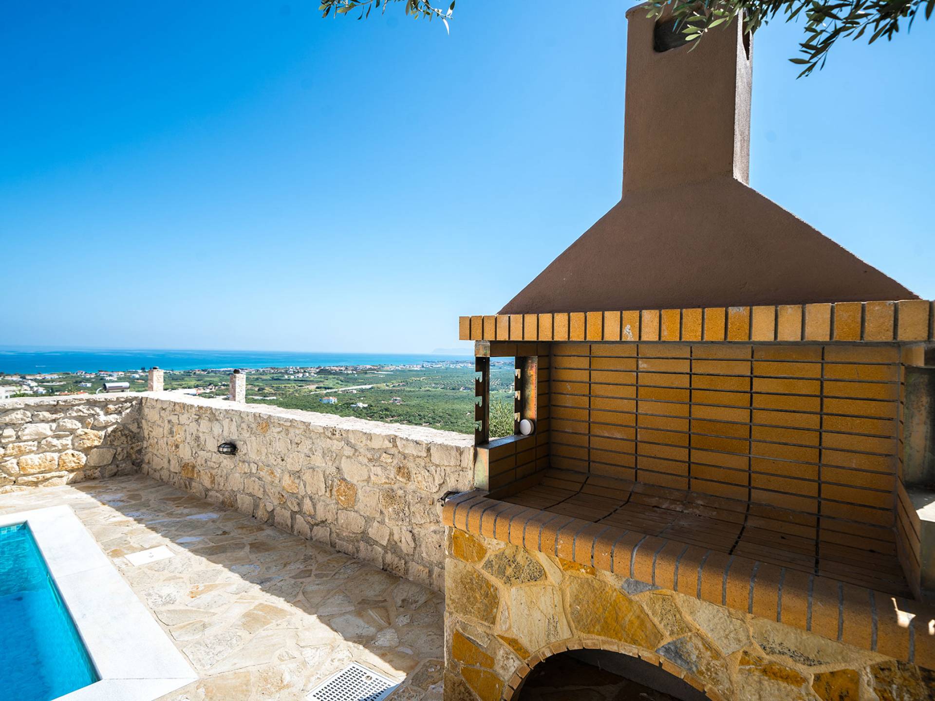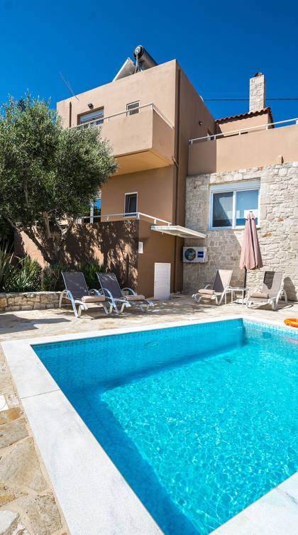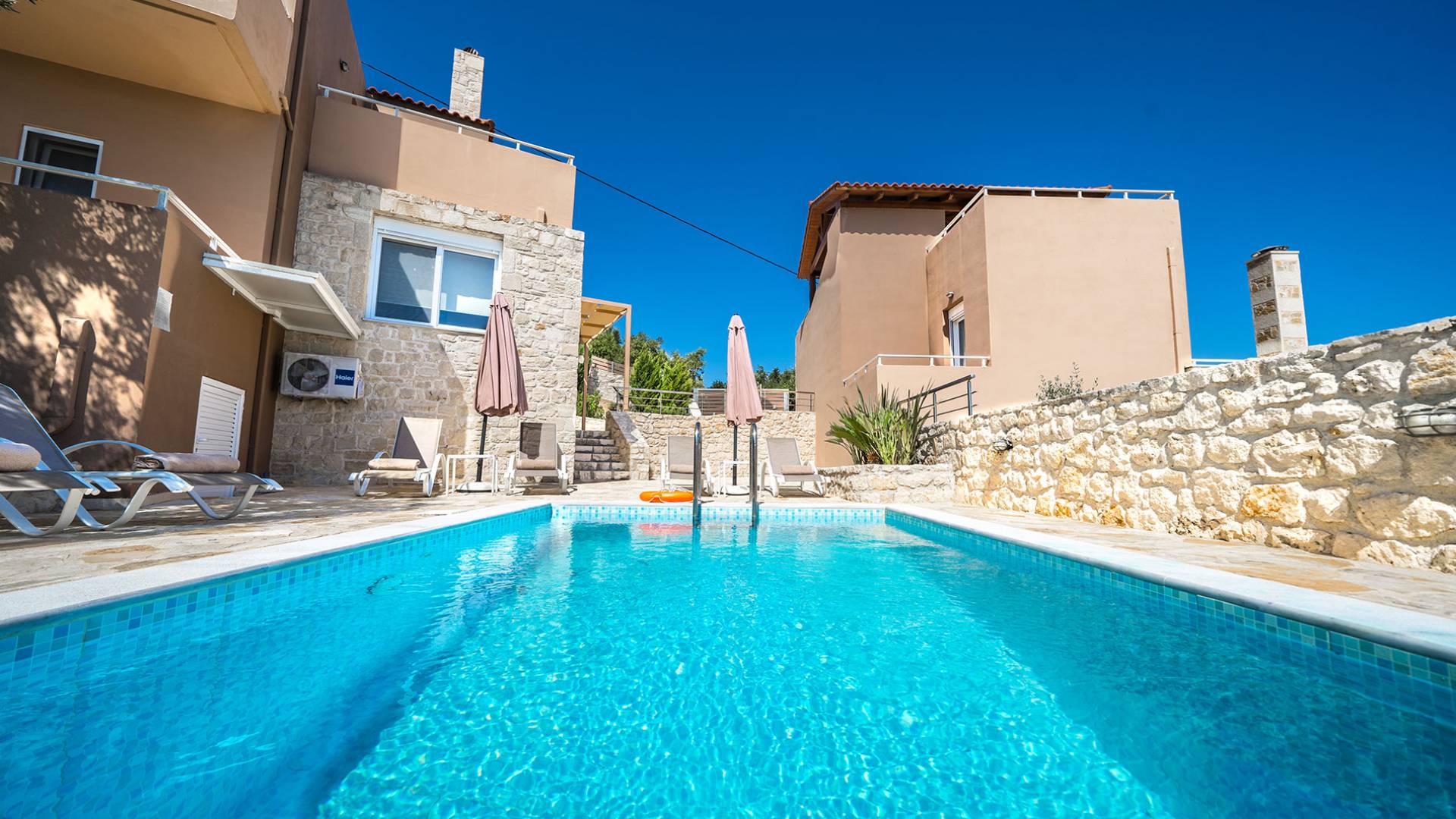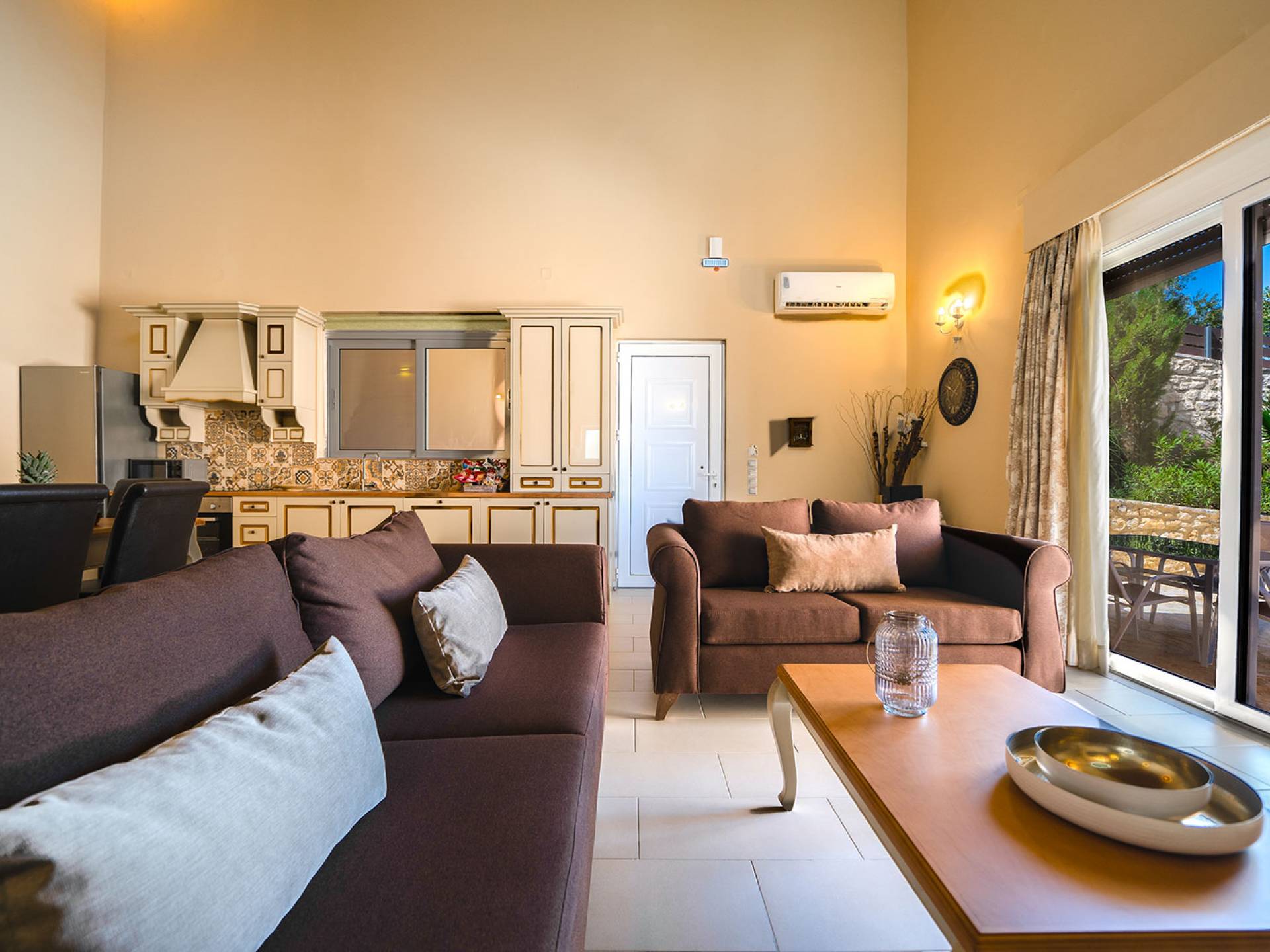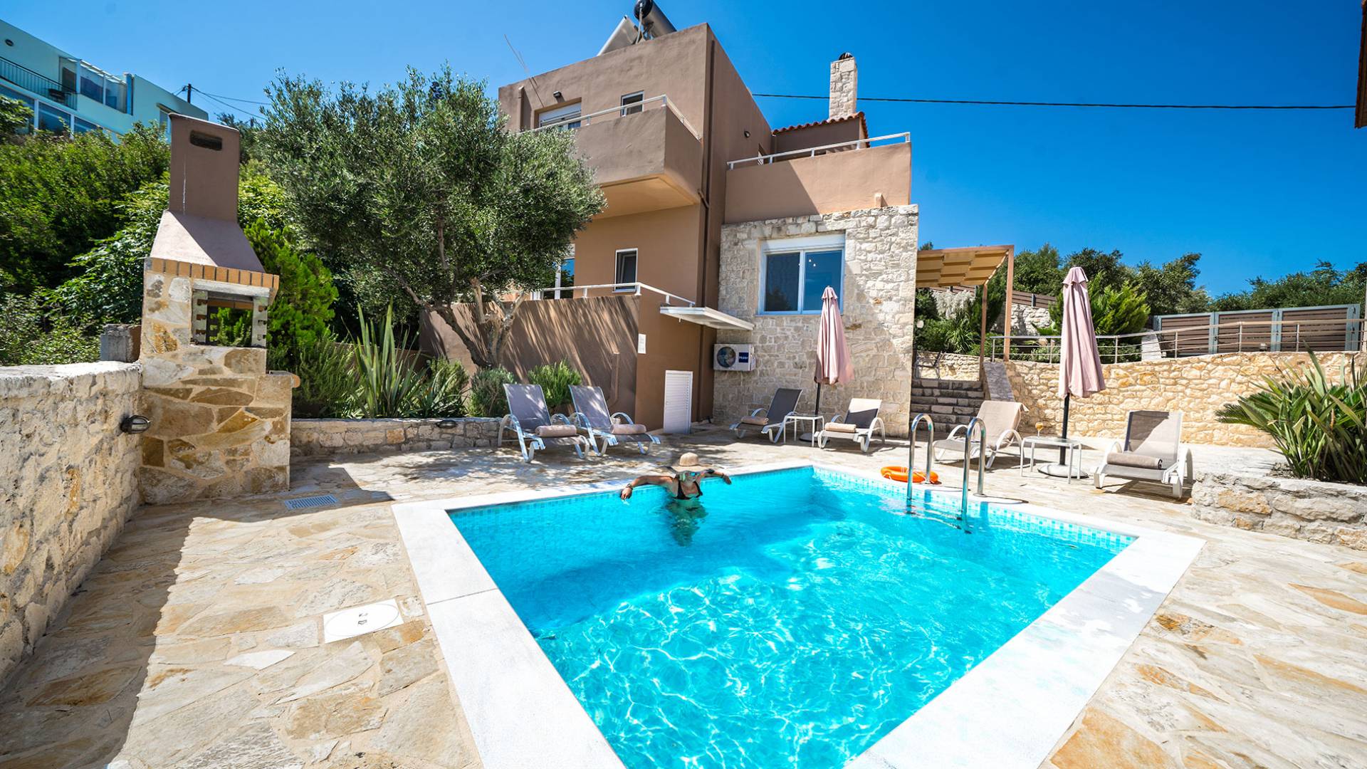 Amoena Villa à Theo Villas Chania est une location de villa de luxe avec 3 chambres et une piscine privée. La Villa Amoena est une luxueuse maisonnette néo-classique construite en hauteur avec une vue magnifique sur les oliveraies, les montagnes et la mer.