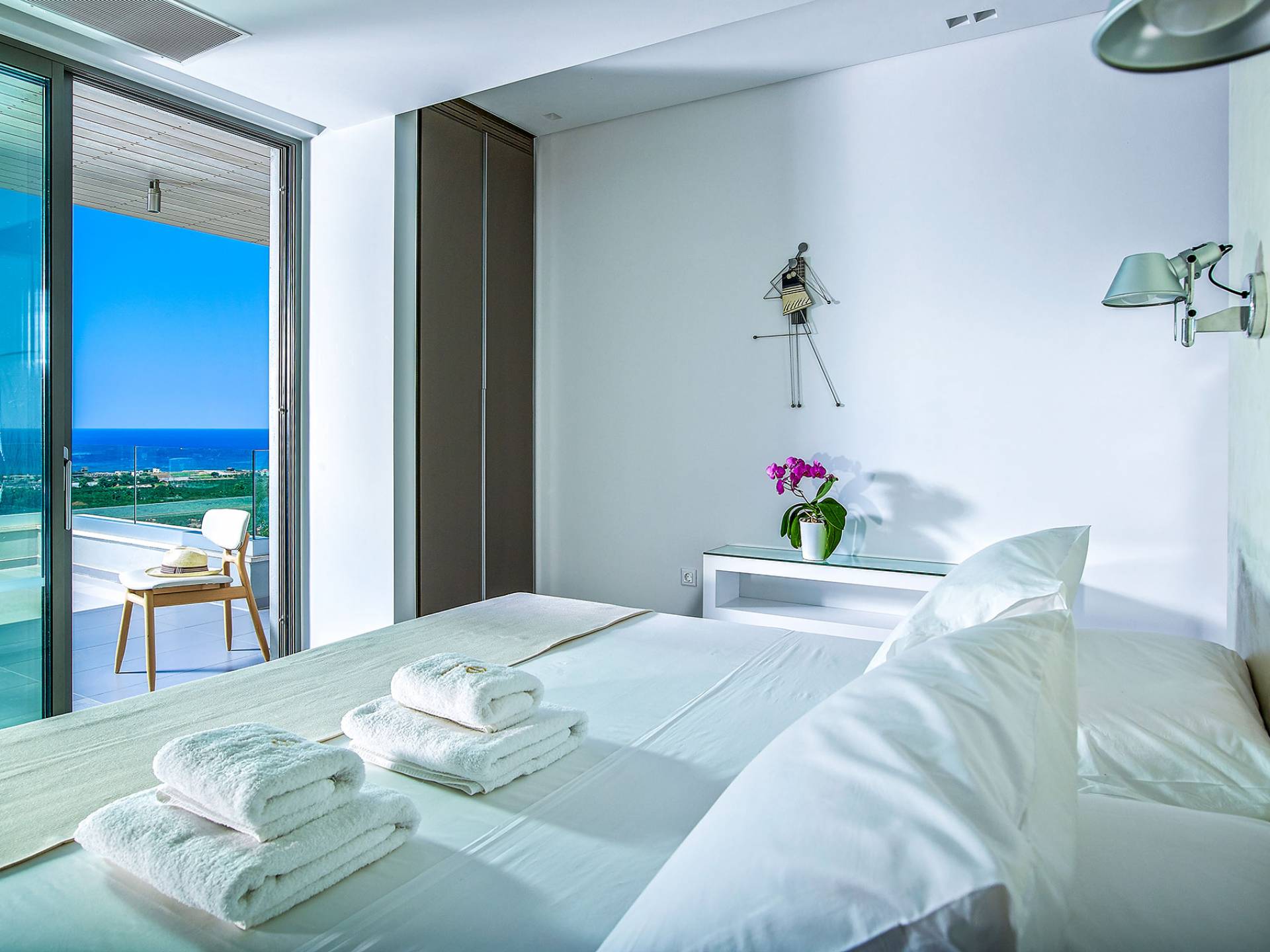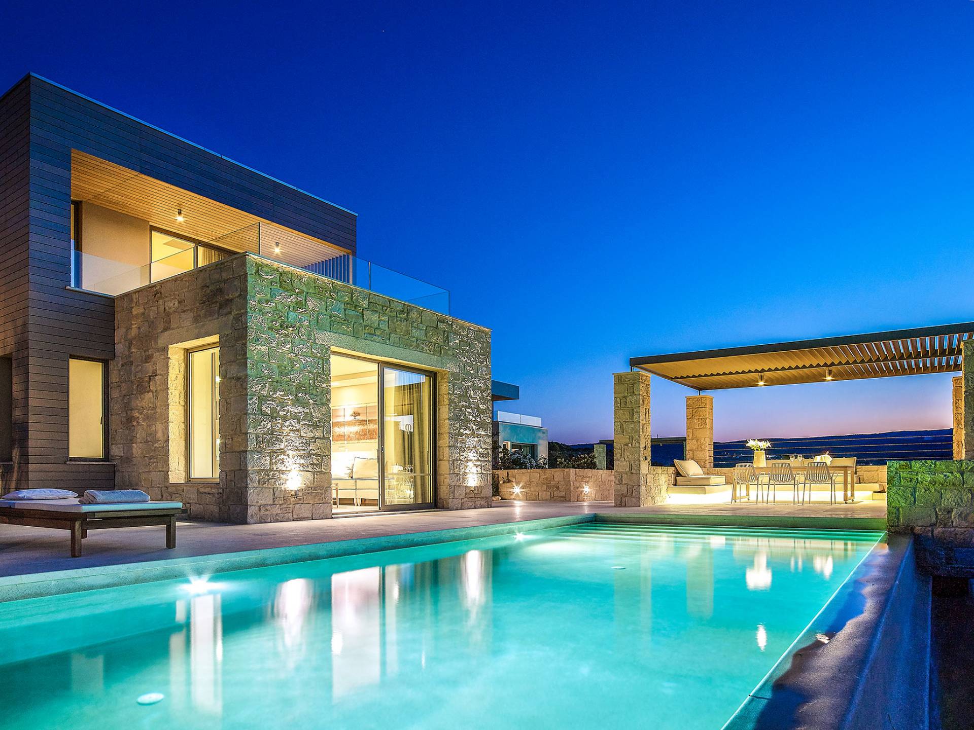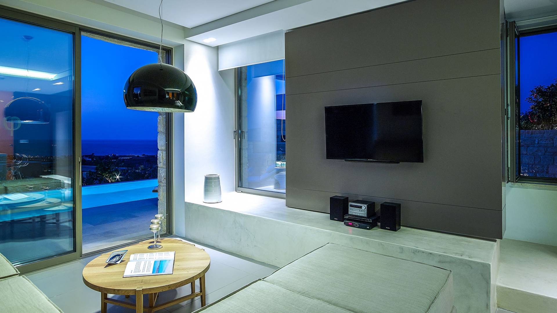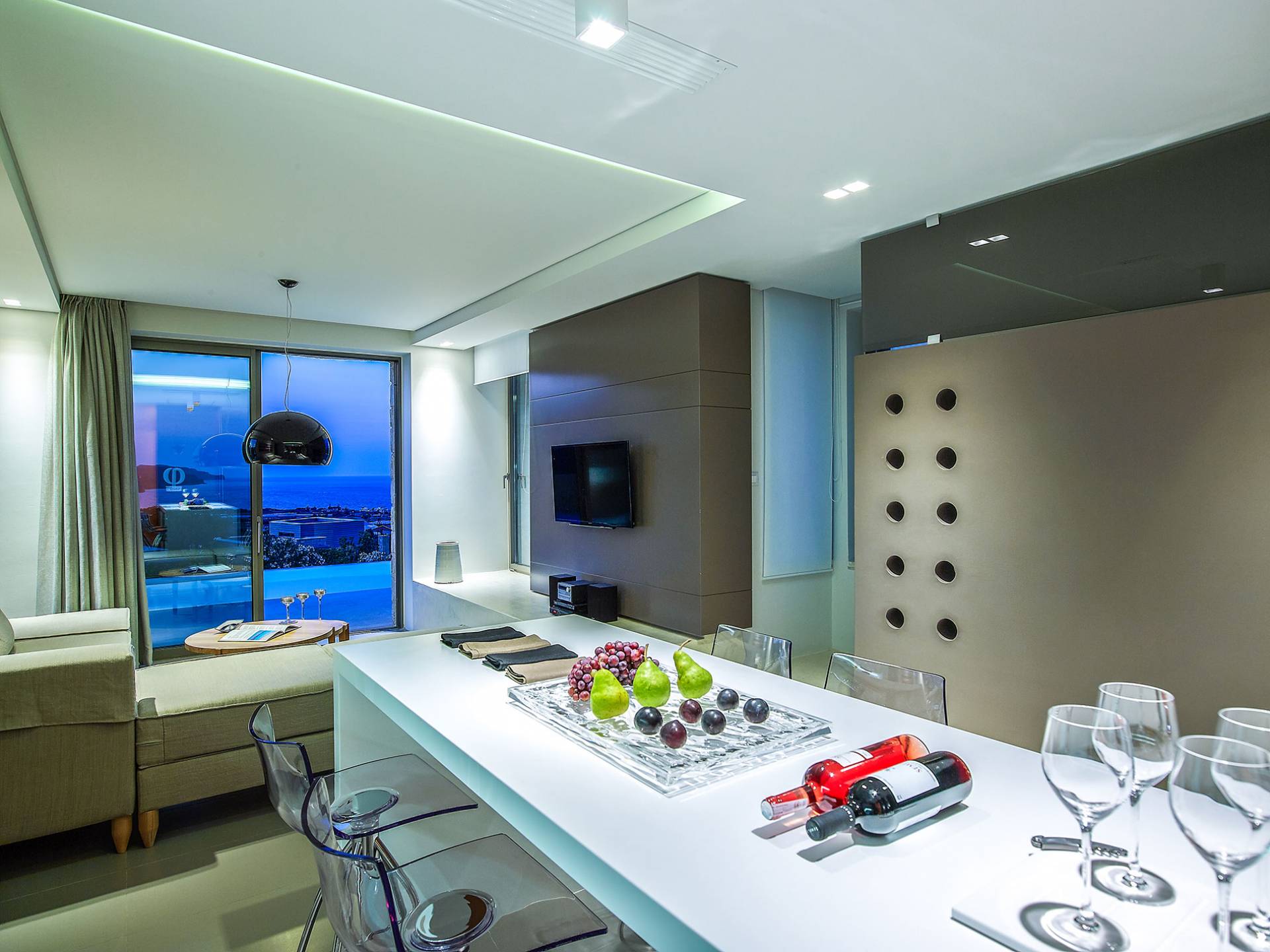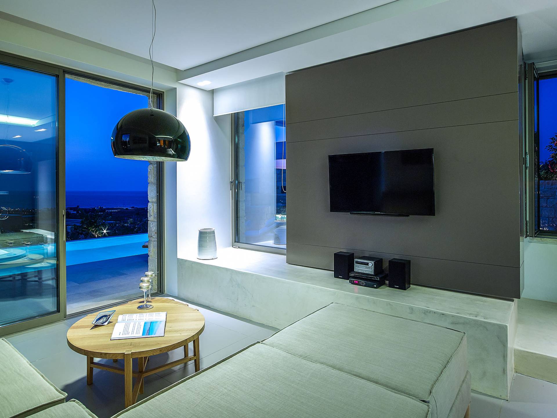 La villa est répartie sur deux étages, avec de nombreuses fenêtres qui laissent entrer la lumière du soleil offrant une vue panoramique depuis n'importe quelle pièce. Le rez-de-chaussée s'ouvre sur un salon spacieux et moderne avec une cuisine américaine équipée d'appareils électroménagers à la pointe de la technologie et comprenant des surfaces de travail élégantes en Corian et une salle à manger informelle. La chambre double/lits jumeaux du rez-de-chaussée offre le luxe d'une salle de bains privative avec douche spa à l'italienne. Un escalier mène à une chambre principale au premier étage avec un grand balcon privé orienté vers l'avant qui offre une vue imprenable sur la mer Égée et une salle de bains privative décloisonnée avec une charmante vue sur le jardin.