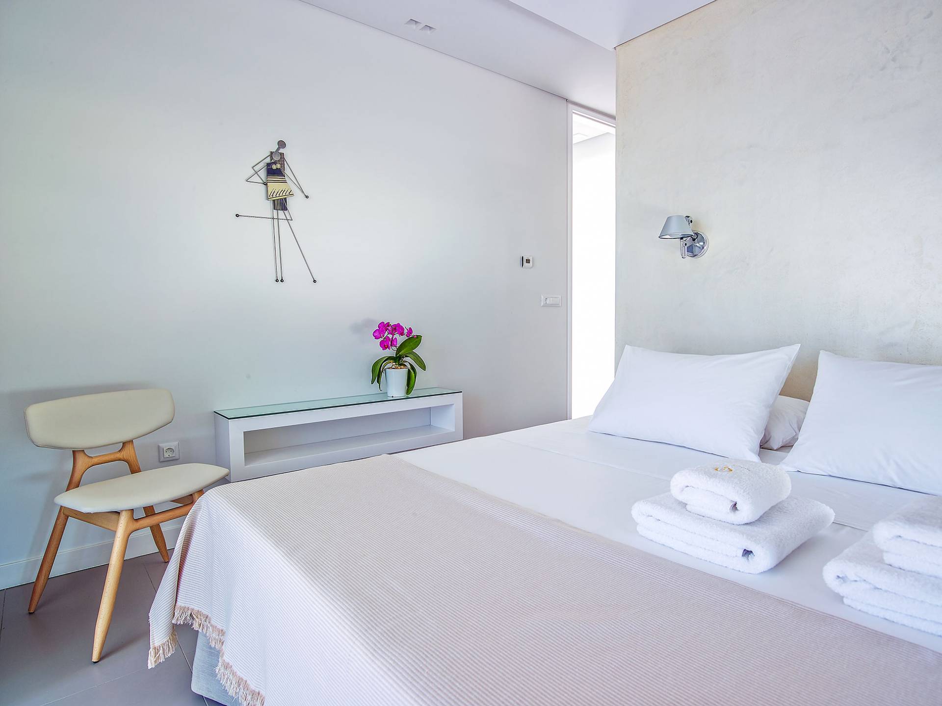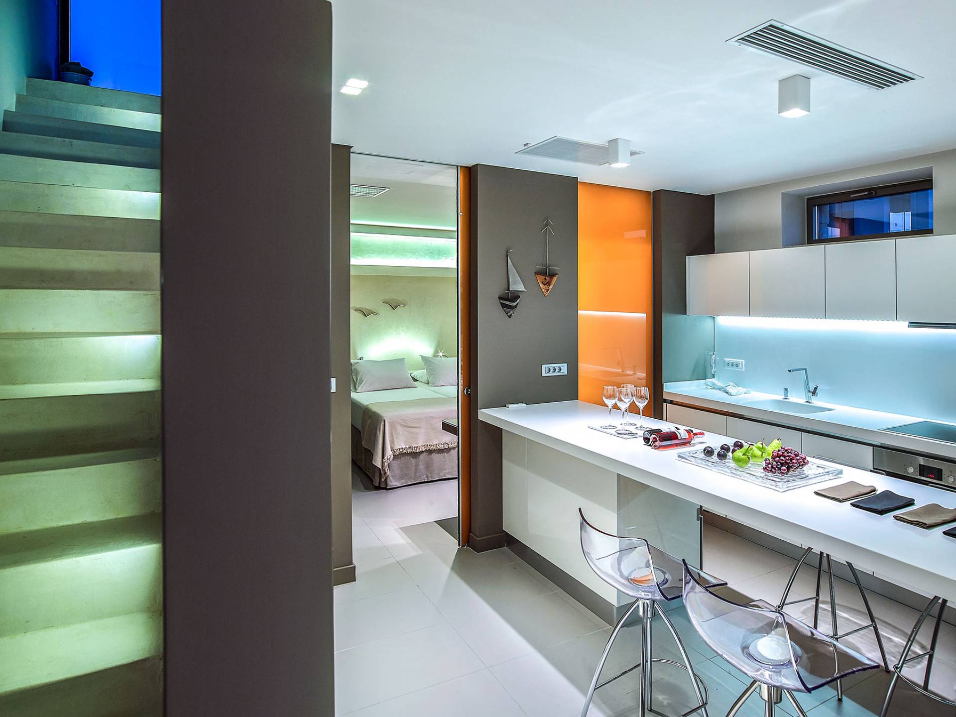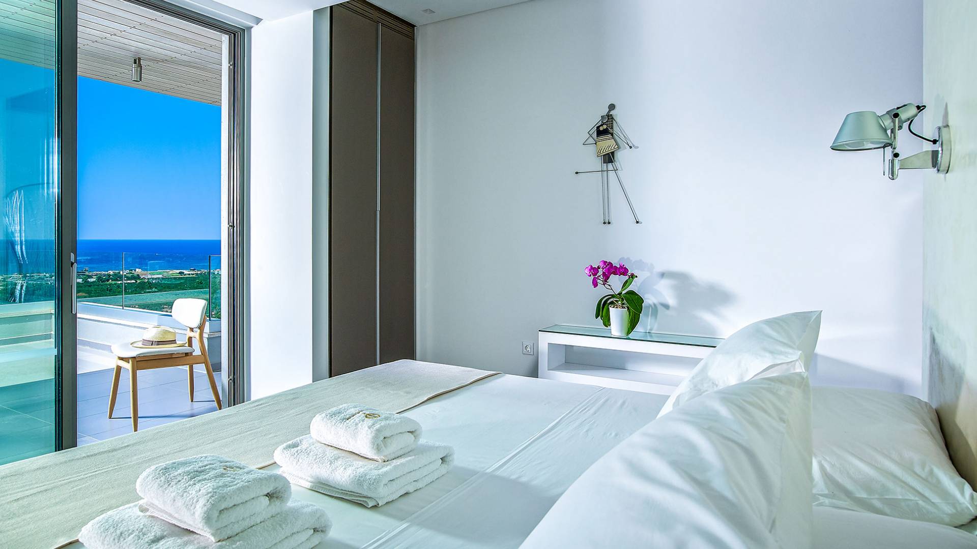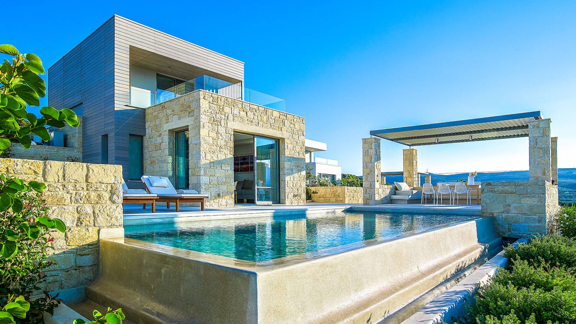 La villa est répartie sur deux étages, avec de nombreuses fenêtres qui laissent entrer la lumière du soleil offrant une vue panoramique depuis n'importe quelle pièce. Le rez-de-chaussée s'ouvre sur un salon spacieux et moderne avec une cuisine américaine équipée d'appareils électroménagers à la pointe de la technologie et comprenant des surfaces de travail élégantes en Corian et une salle à manger informelle. La chambre double/lits jumeaux du rez-de-chaussée offre le luxe d'une salle de bains privative avec douche spa à l'italienne. Un escalier mène à une chambre principale au premier étage avec un grand balcon privé orienté vers l'avant qui offre une vue imprenable sur la mer Égée et une salle de bains privative décloisonnée avec une charmante vue sur le jardin.