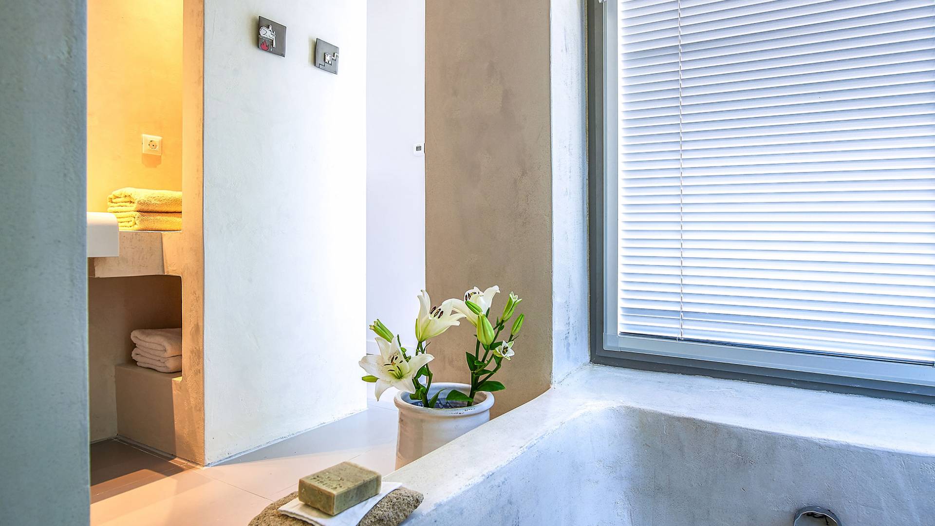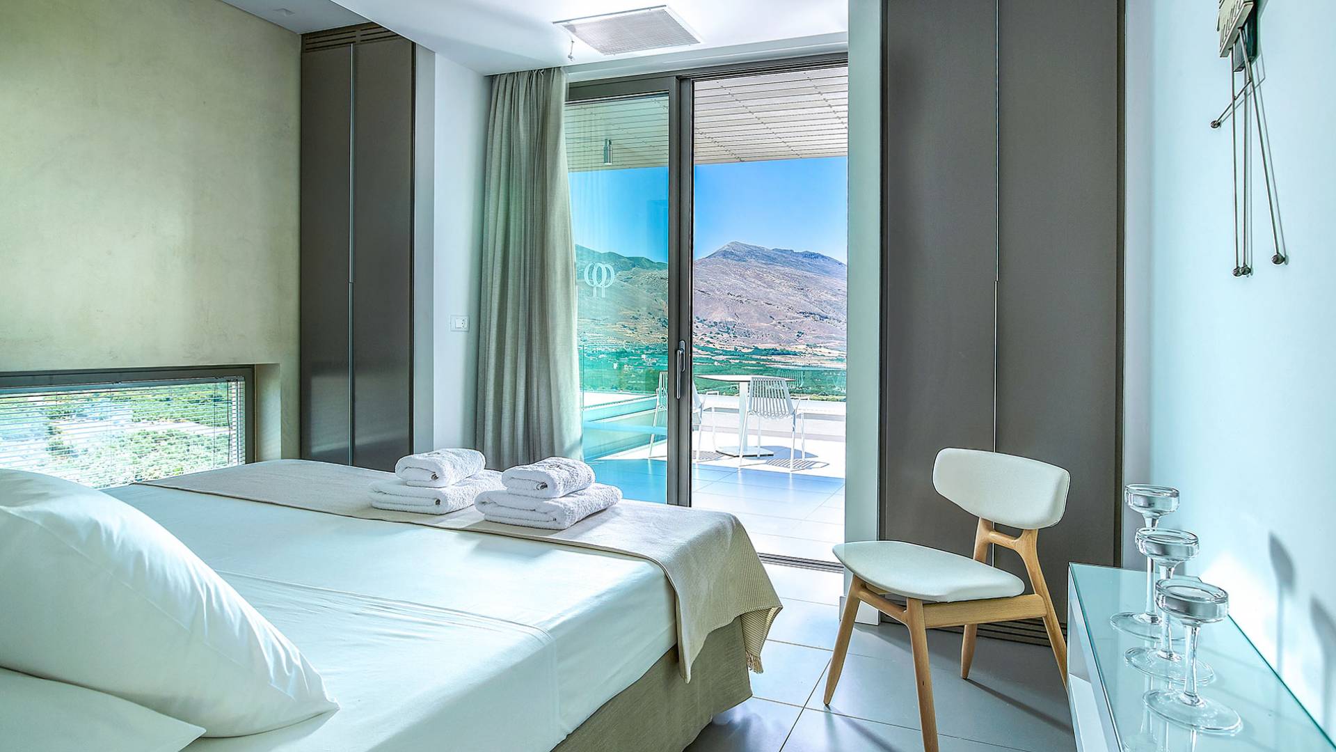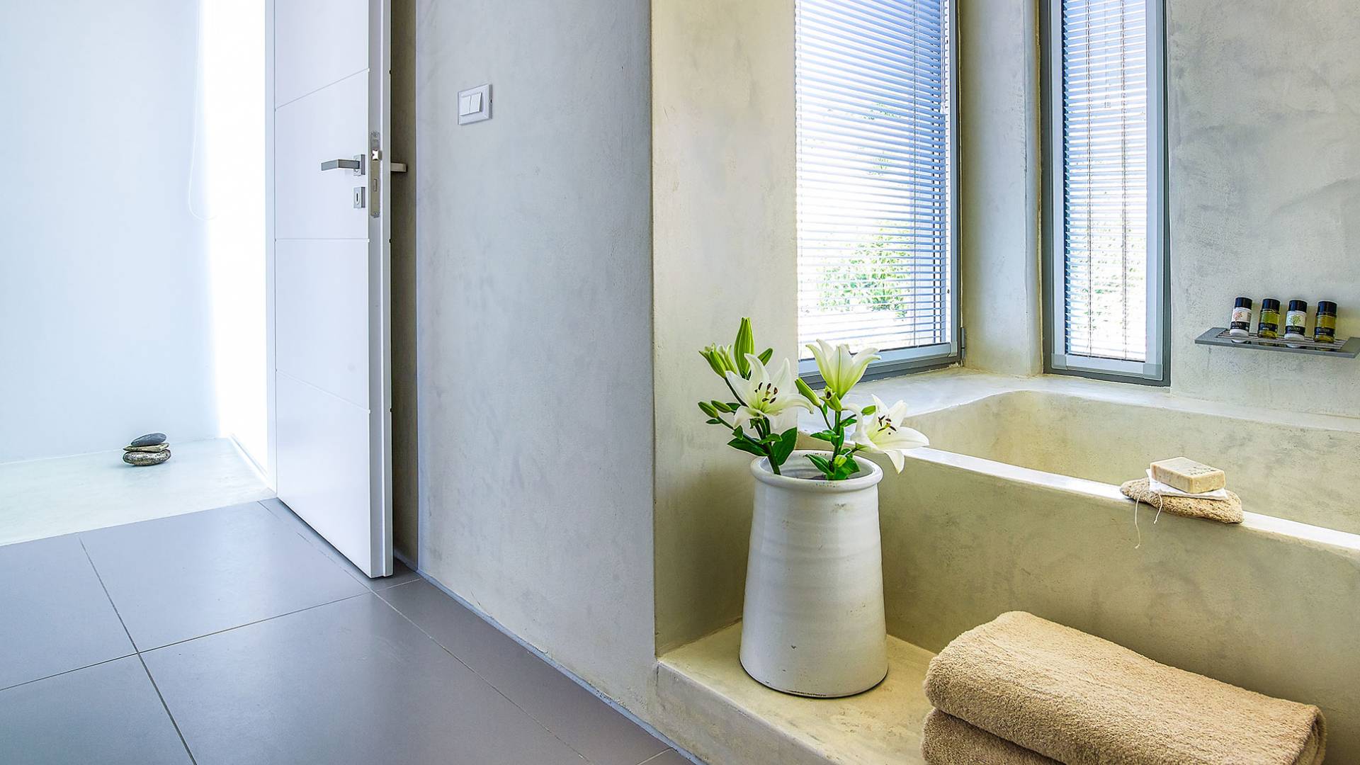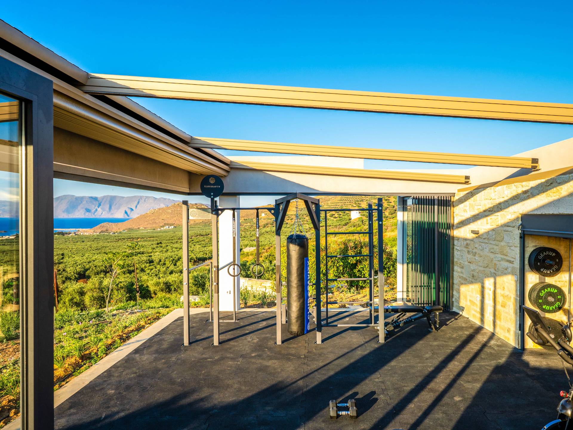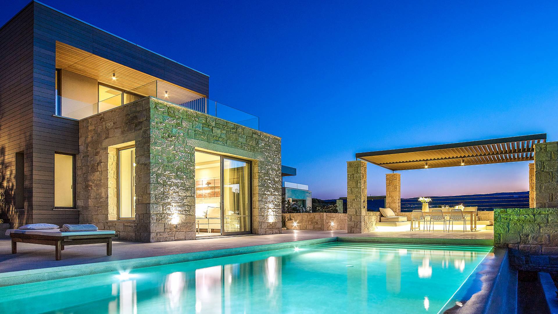 La villa est répartie sur deux étages, avec de nombreuses fenêtres qui laissent entrer la lumière du soleil offrant une vue panoramique depuis n'importe quelle pièce. Le rez-de-chaussée s'ouvre sur un salon spacieux et moderne avec une cuisine américaine équipée d'appareils électroménagers à la pointe de la technologie et comprenant des surfaces de travail élégantes en Corian et une salle à manger informelle. La chambre double/lits jumeaux du rez-de-chaussée offre le luxe d'une salle de bains privative avec douche spa à l'italienne. Un escalier mène à une chambre principale au premier étage avec un grand balcon privé orienté vers l'avant qui offre une vue imprenable sur la mer Égée et une salle de bains privative décloisonnée avec une charmante vue sur le jardin.