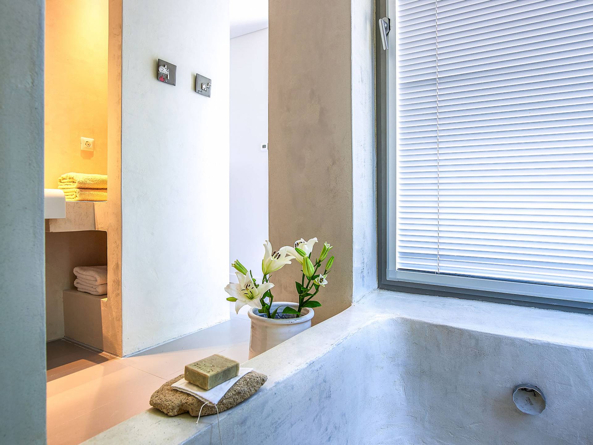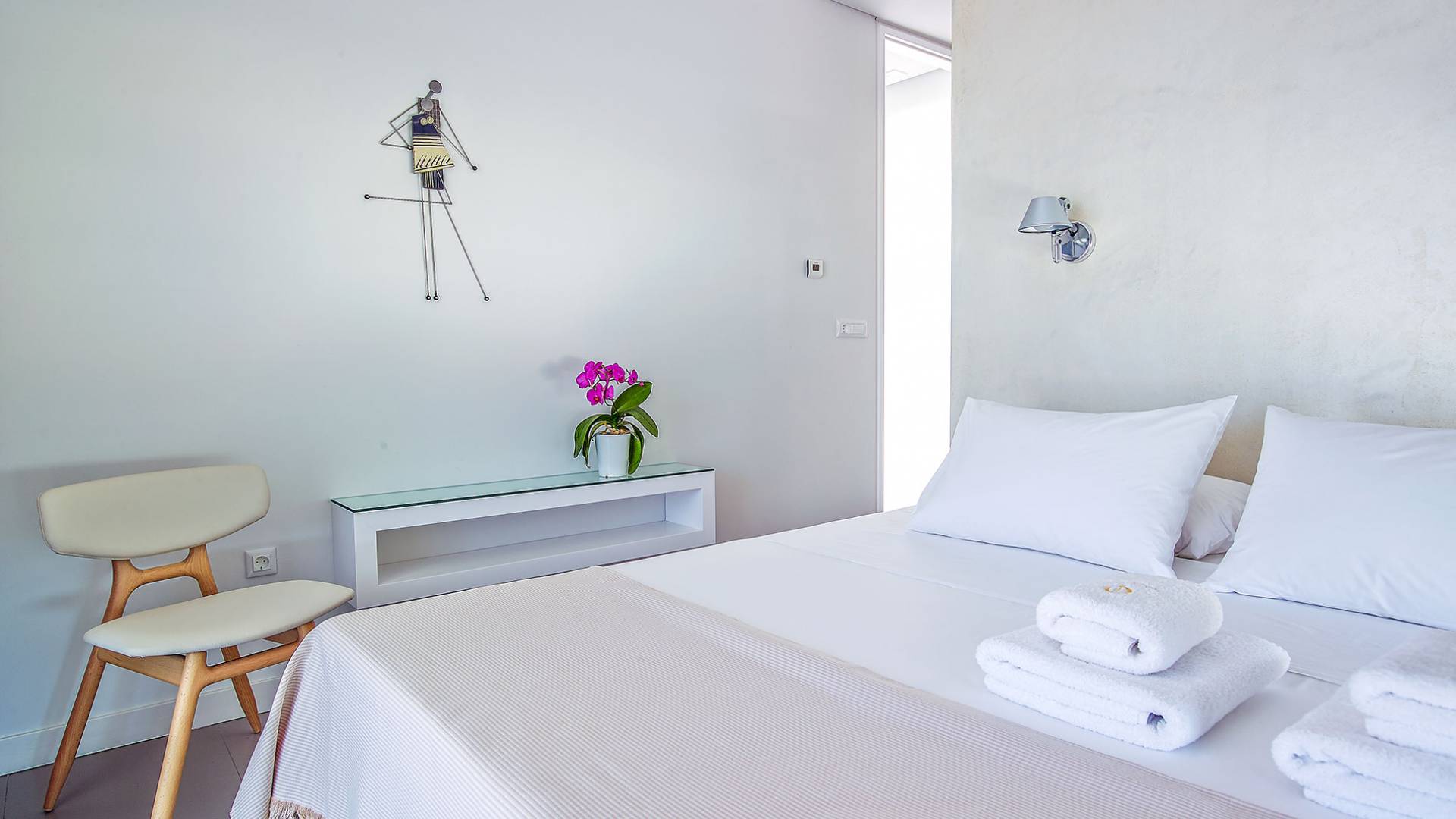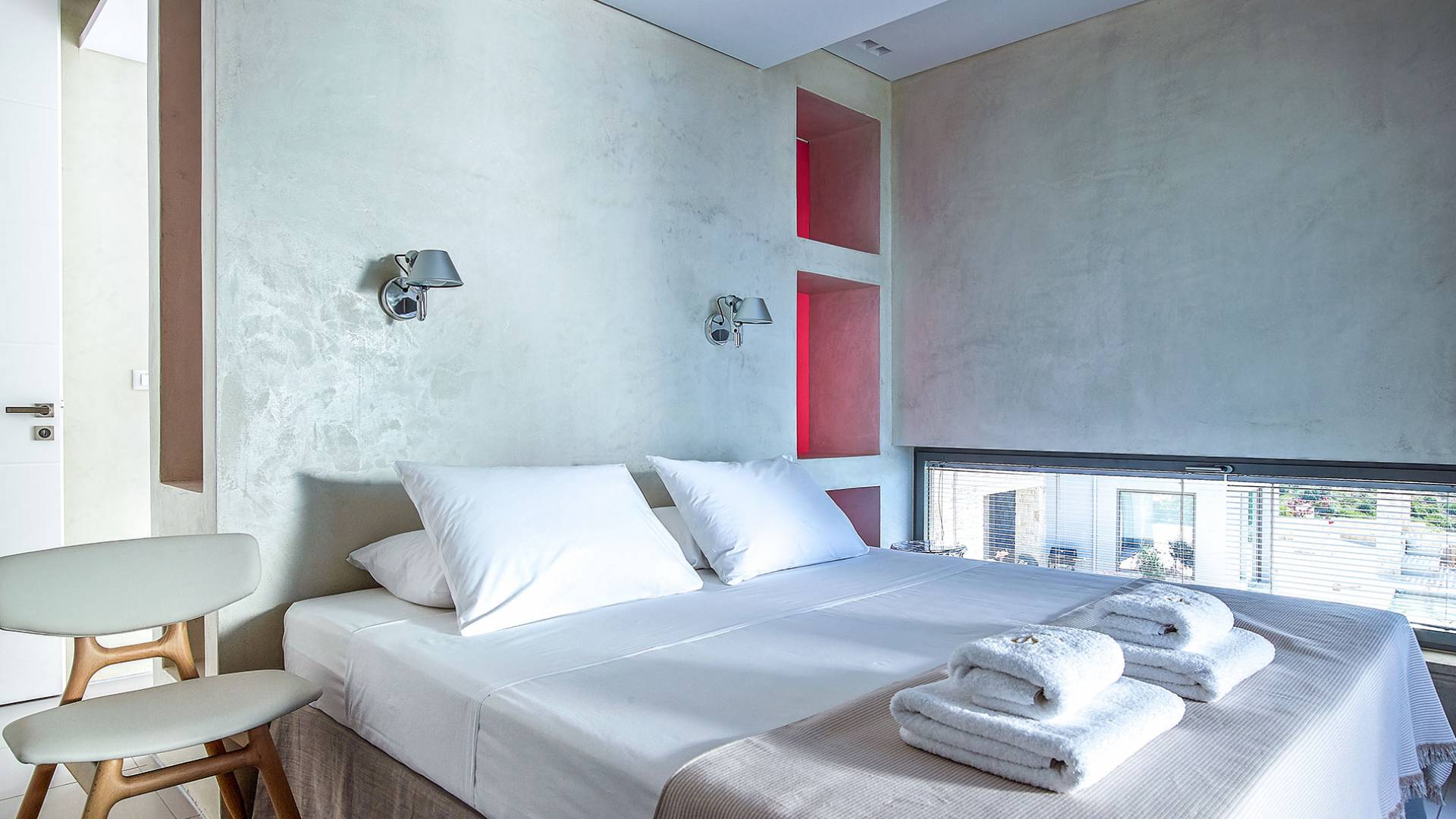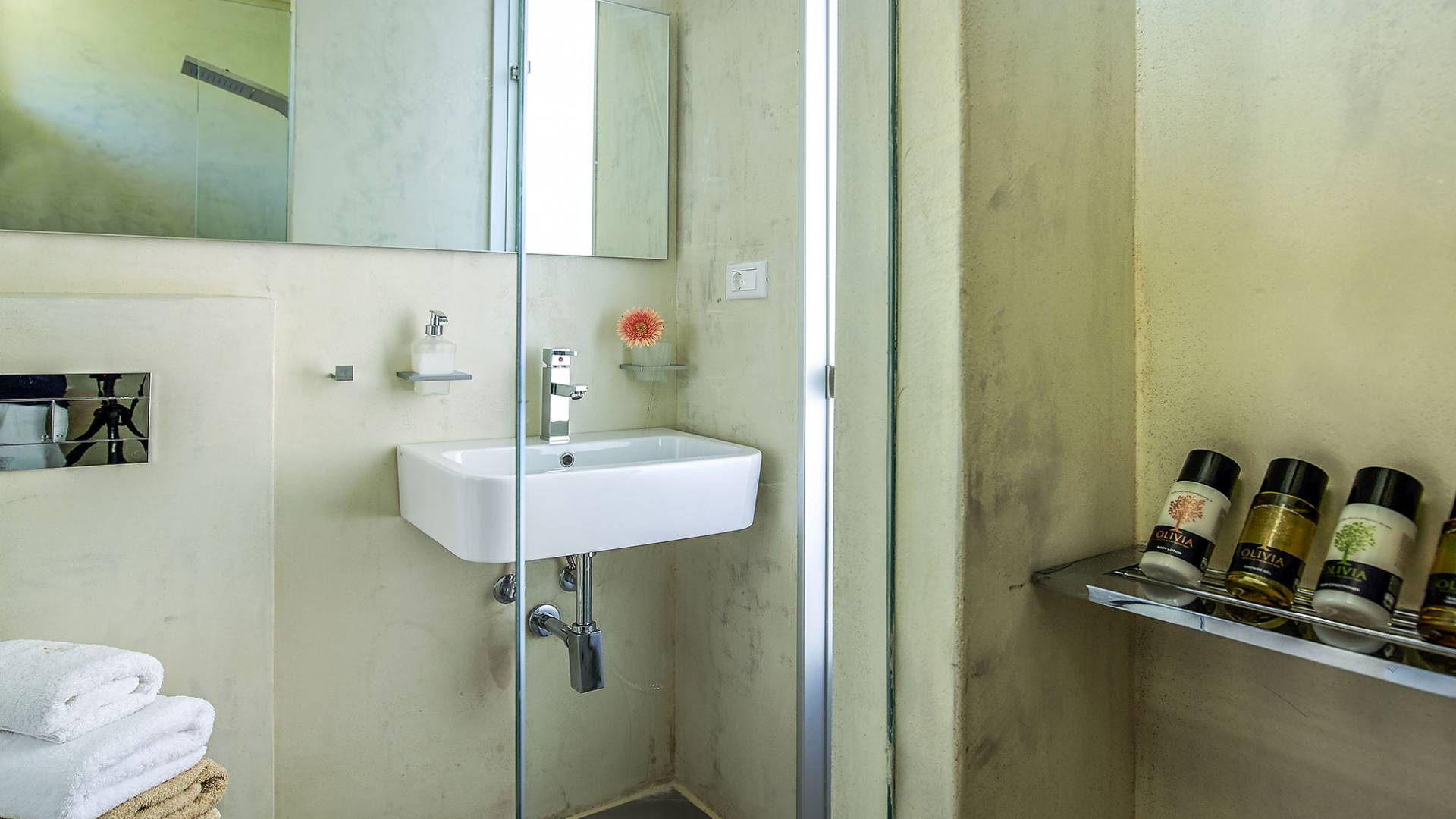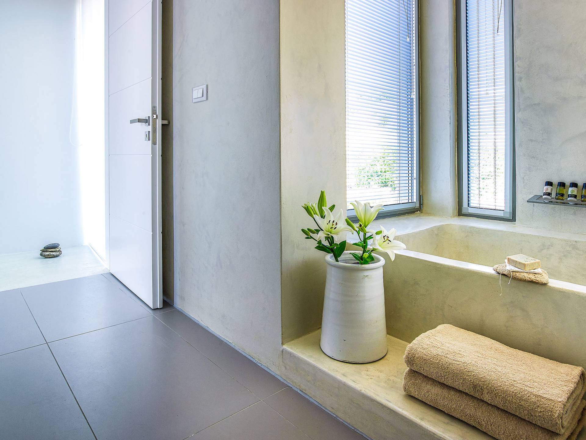 La villa est répartie sur deux étages, avec de nombreuses fenêtres qui laissent entrer la lumière du soleil offrant une vue panoramique depuis n'importe quelle pièce. Le rez-de-chaussée s'ouvre sur un salon spacieux et moderne avec une cuisine américaine équipée d'appareils électroménagers à la pointe de la technologie et comprenant des surfaces de travail élégantes en Corian et une salle à manger informelle. La chambre double/lits jumeaux du rez-de-chaussée offre le luxe d'une salle de bains privative avec douche spa à l'italienne. Un escalier mène à une chambre principale au premier étage avec un grand balcon privé orienté vers l'avant qui offre une vue imprenable sur la mer Égée et une salle de bains privative décloisonnée avec une charmante vue sur le jardin.