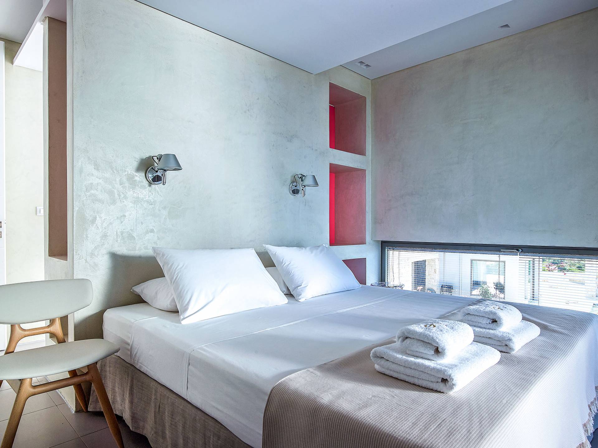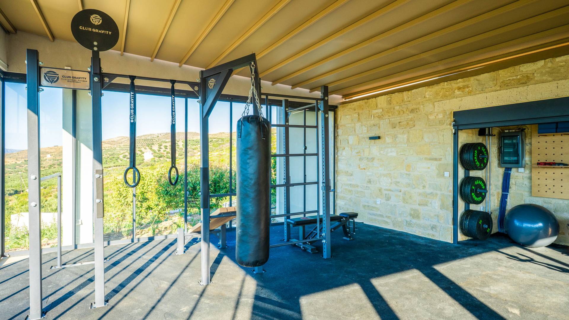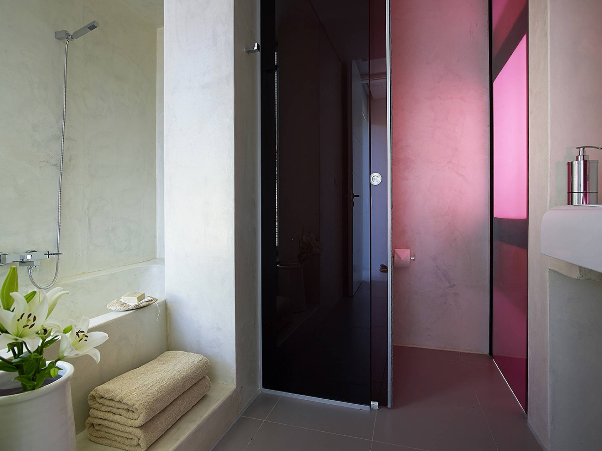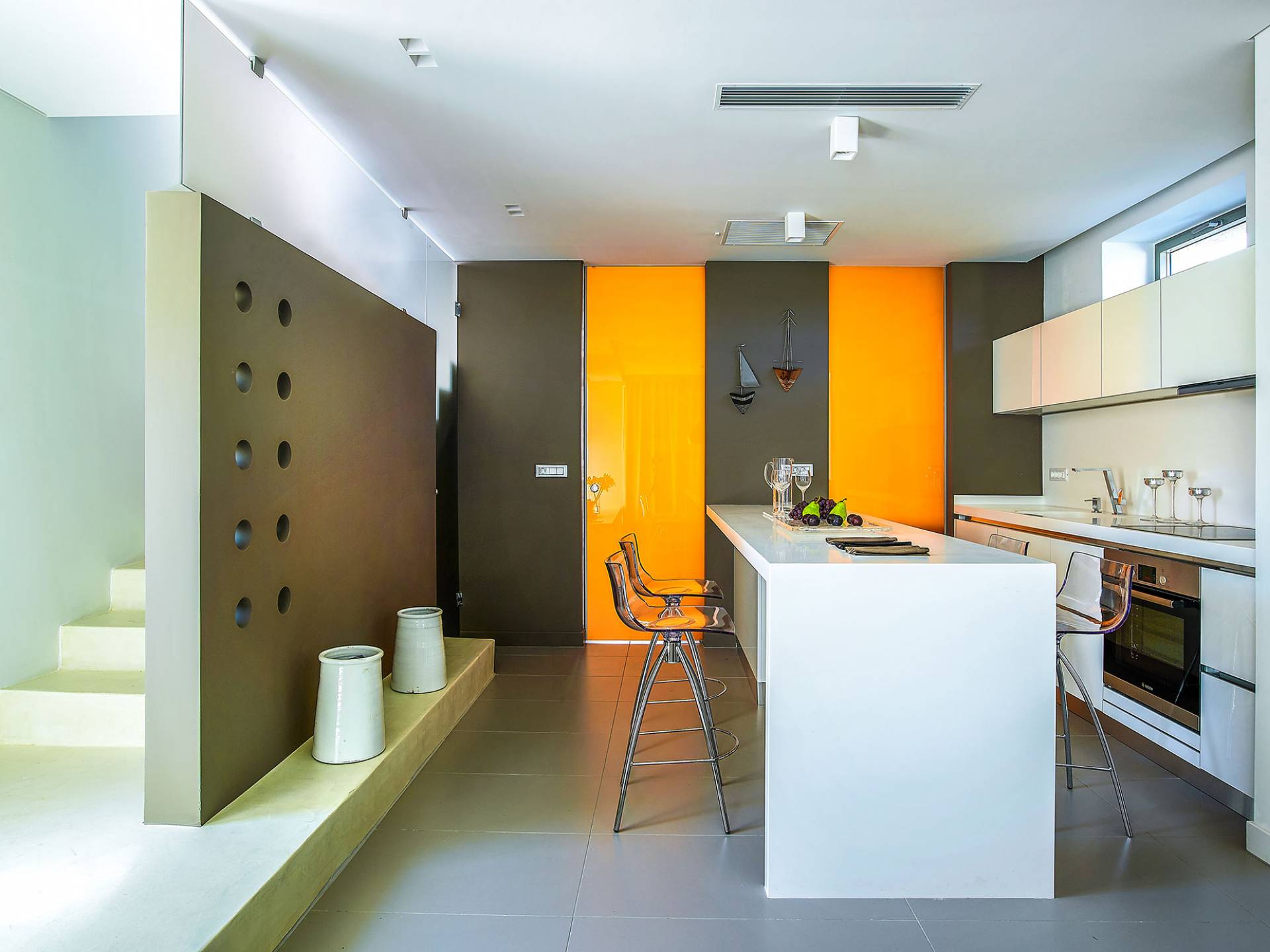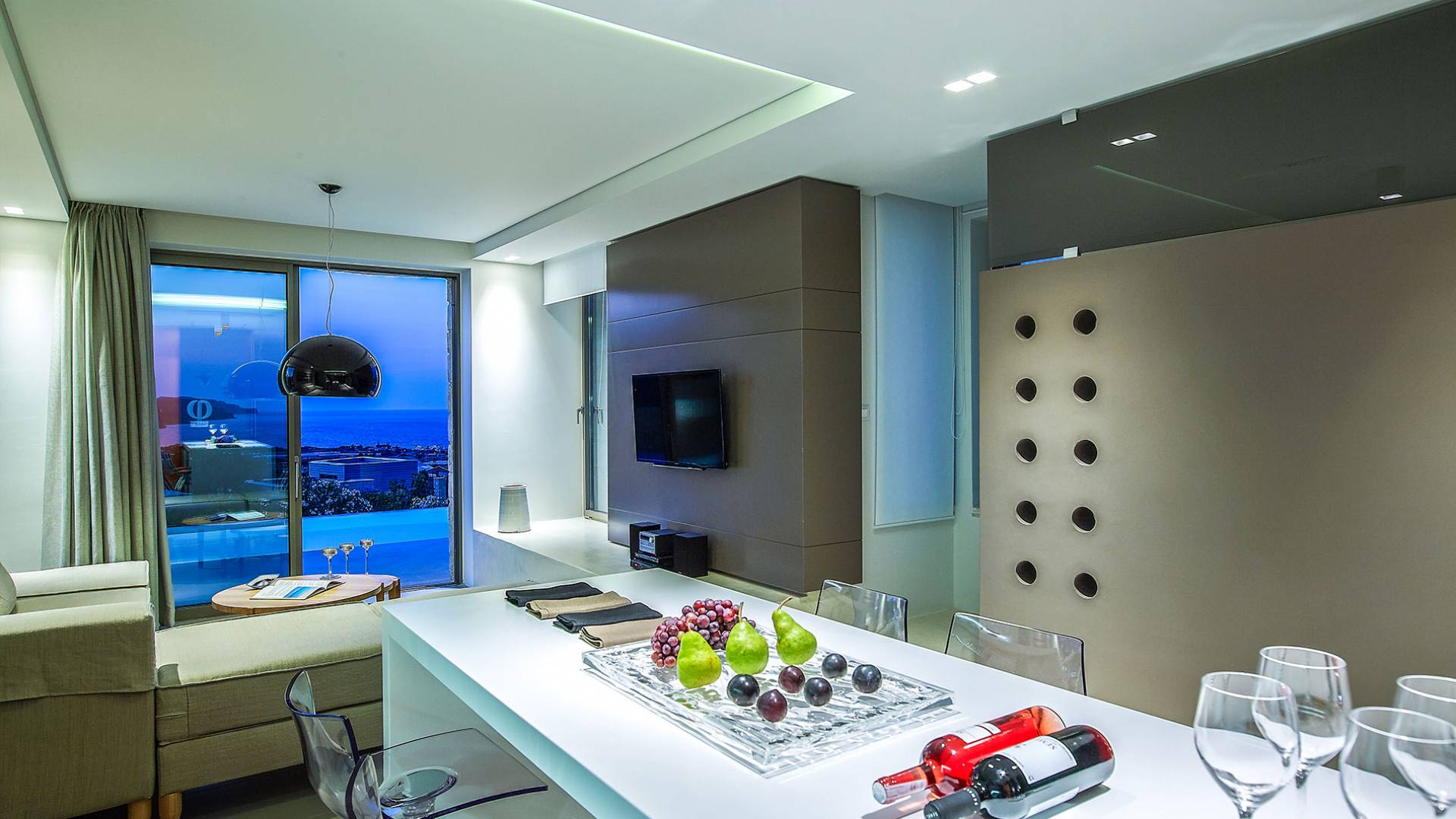 La villa est répartie sur deux étages, avec de nombreuses fenêtres qui laissent entrer la lumière du soleil offrant une vue panoramique depuis n'importe quelle pièce. Le rez-de-chaussée s'ouvre sur un salon spacieux et moderne avec une cuisine américaine équipée d'appareils électroménagers à la pointe de la technologie et comprenant des surfaces de travail élégantes en Corian et une salle à manger informelle. La chambre double/lits jumeaux du rez-de-chaussée offre le luxe d'une salle de bains privative avec douche spa à l'italienne. Un escalier mène à une chambre principale au premier étage avec un grand balcon privé orienté vers l'avant qui offre une vue imprenable sur la mer Égée et une salle de bains privative décloisonnée avec une charmante vue sur le jardin.