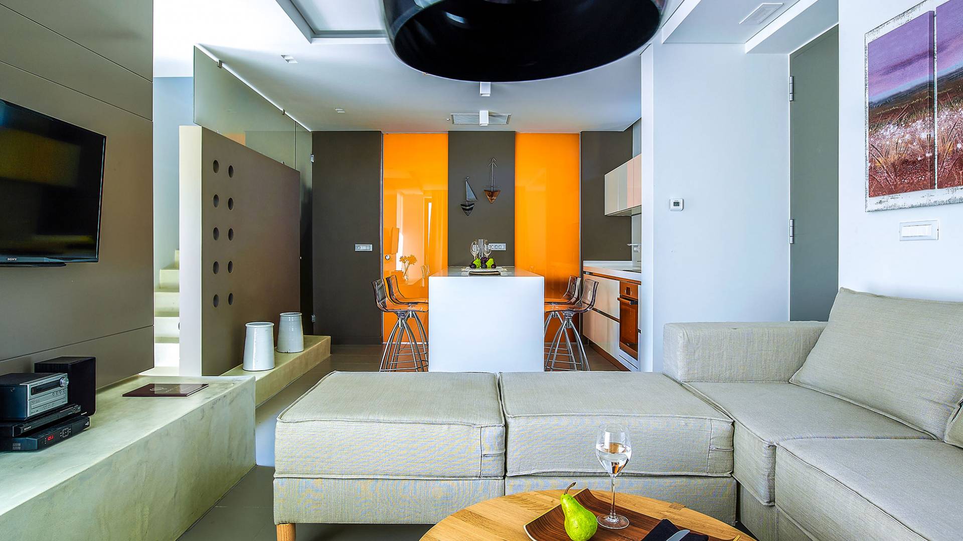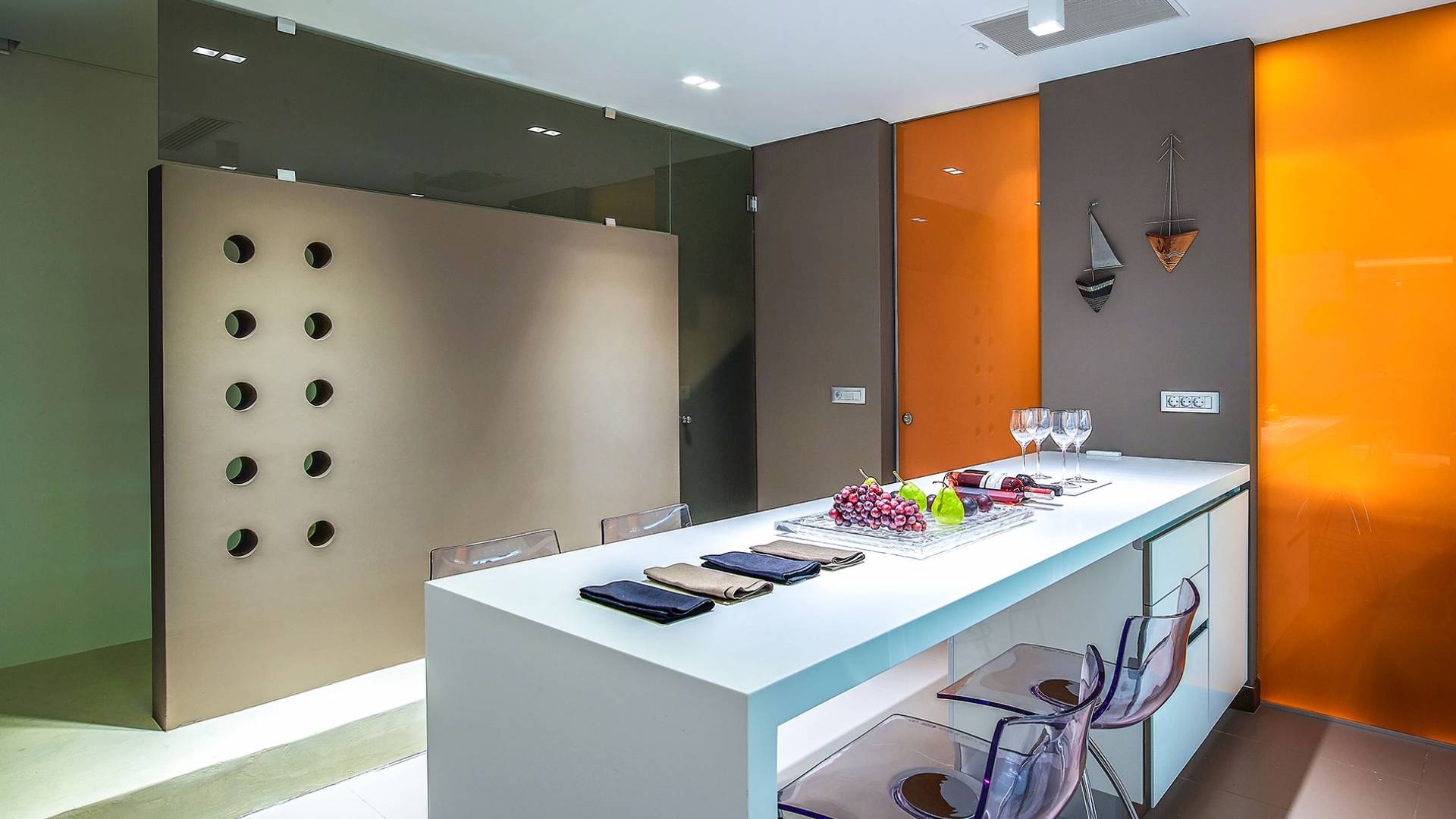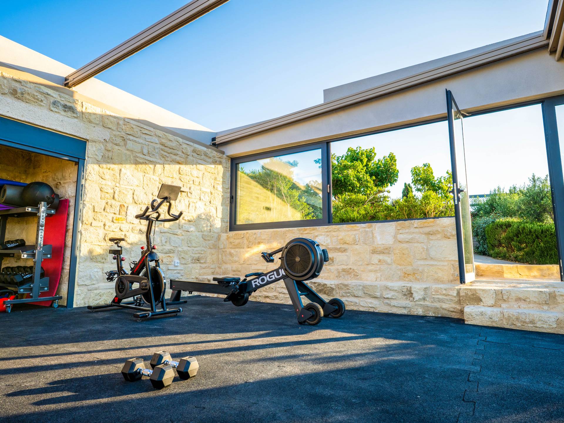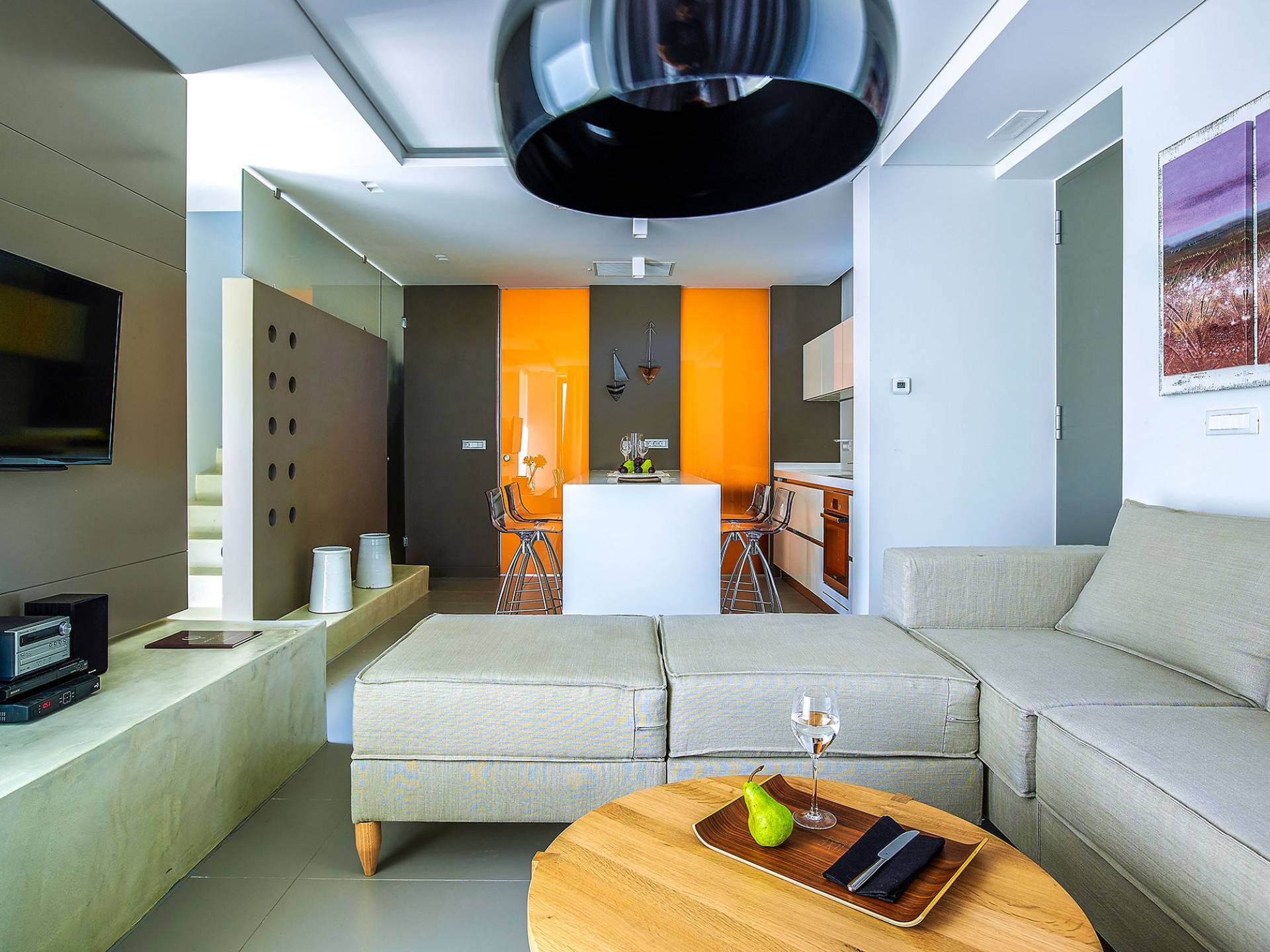 La villa est répartie sur deux étages, avec de nombreuses fenêtres qui laissent entrer la lumière du soleil offrant une vue panoramique depuis n'importe quelle pièce. Le rez-de-chaussée s'ouvre sur un salon spacieux et moderne avec une cuisine américaine équipée d'appareils électroménagers à la pointe de la technologie et comprenant des surfaces de travail élégantes en Corian et une salle à manger informelle. La chambre double/lits jumeaux du rez-de-chaussée offre le luxe d'une salle de bains privative avec douche spa à l'italienne. Un escalier mène à une chambre principale au premier étage avec un grand balcon privé orienté vers l'avant qui offre une vue imprenable sur la mer Égée et une salle de bains privative décloisonnée avec une charmante vue sur le jardin.