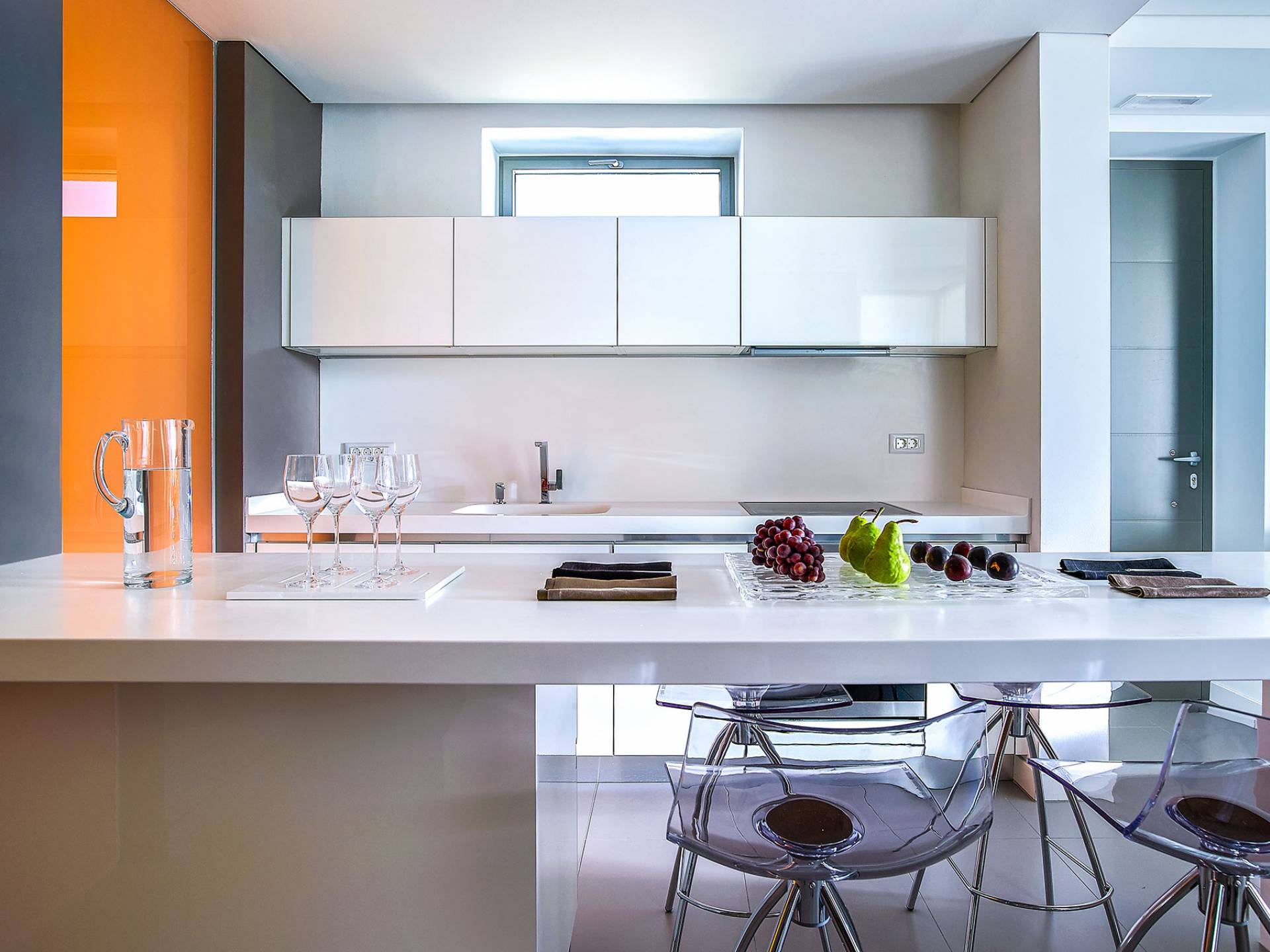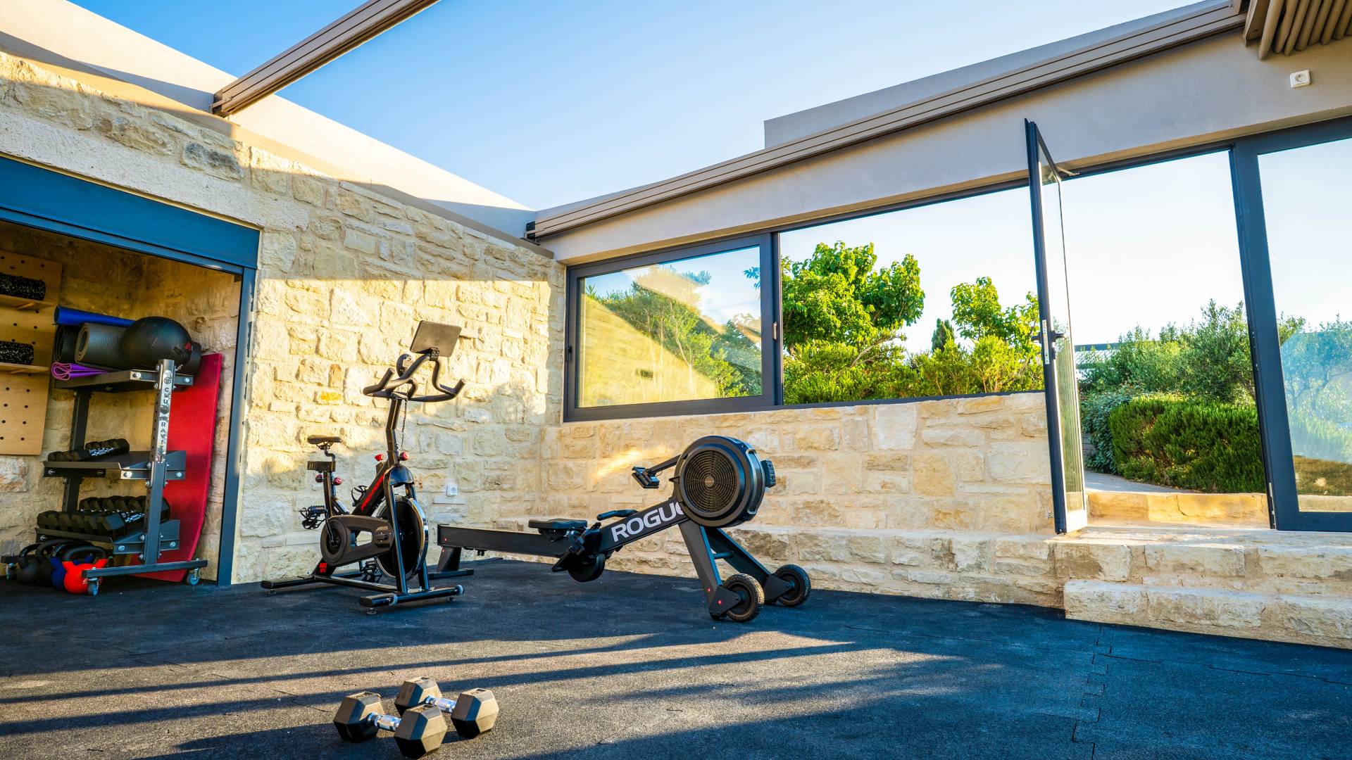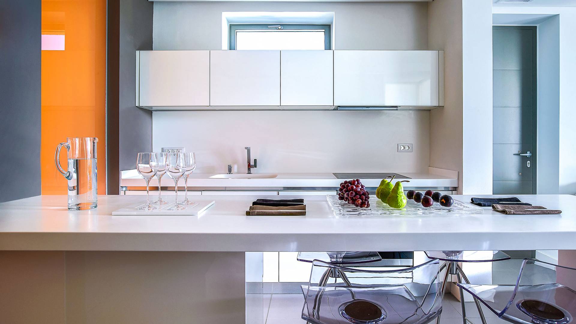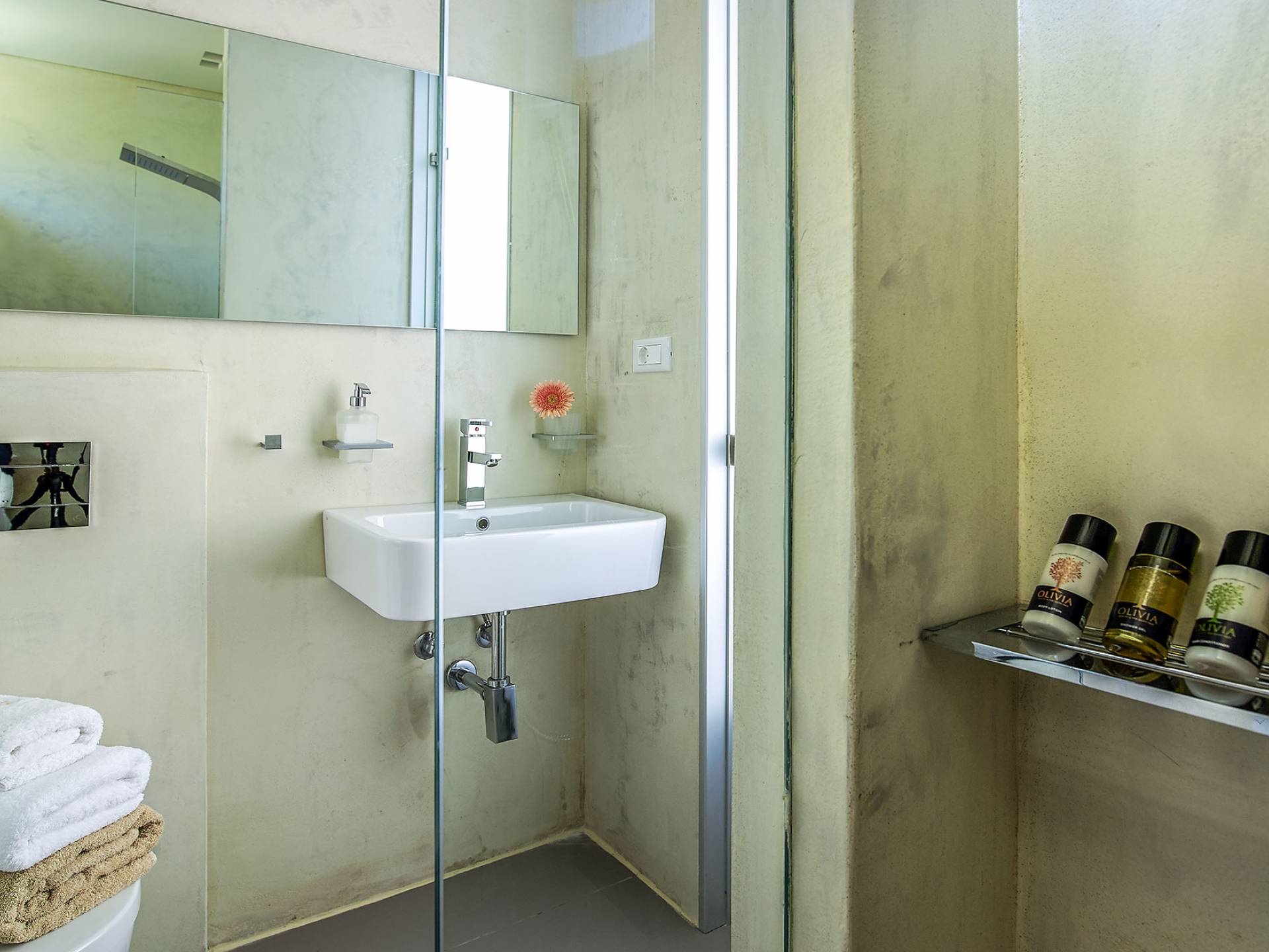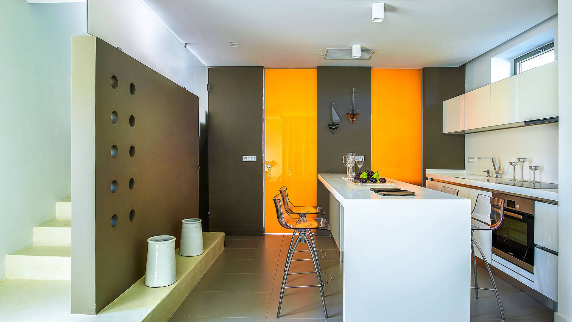 La villa est répartie sur deux étages, avec de nombreuses fenêtres qui laissent entrer la lumière du soleil offrant une vue panoramique depuis n'importe quelle pièce. Le rez-de-chaussée s'ouvre sur un salon spacieux et moderne avec une cuisine américaine équipée d'appareils électroménagers à la pointe de la technologie et comprenant des surfaces de travail élégantes en Corian et une salle à manger informelle. La chambre double/lits jumeaux du rez-de-chaussée offre le luxe d'une salle de bains privative avec douche spa à l'italienne. Un escalier mène à une chambre principale au premier étage avec un grand balcon privé orienté vers l'avant qui offre une vue imprenable sur la mer Égée et une salle de bains privative décloisonnée avec une charmante vue sur le jardin.