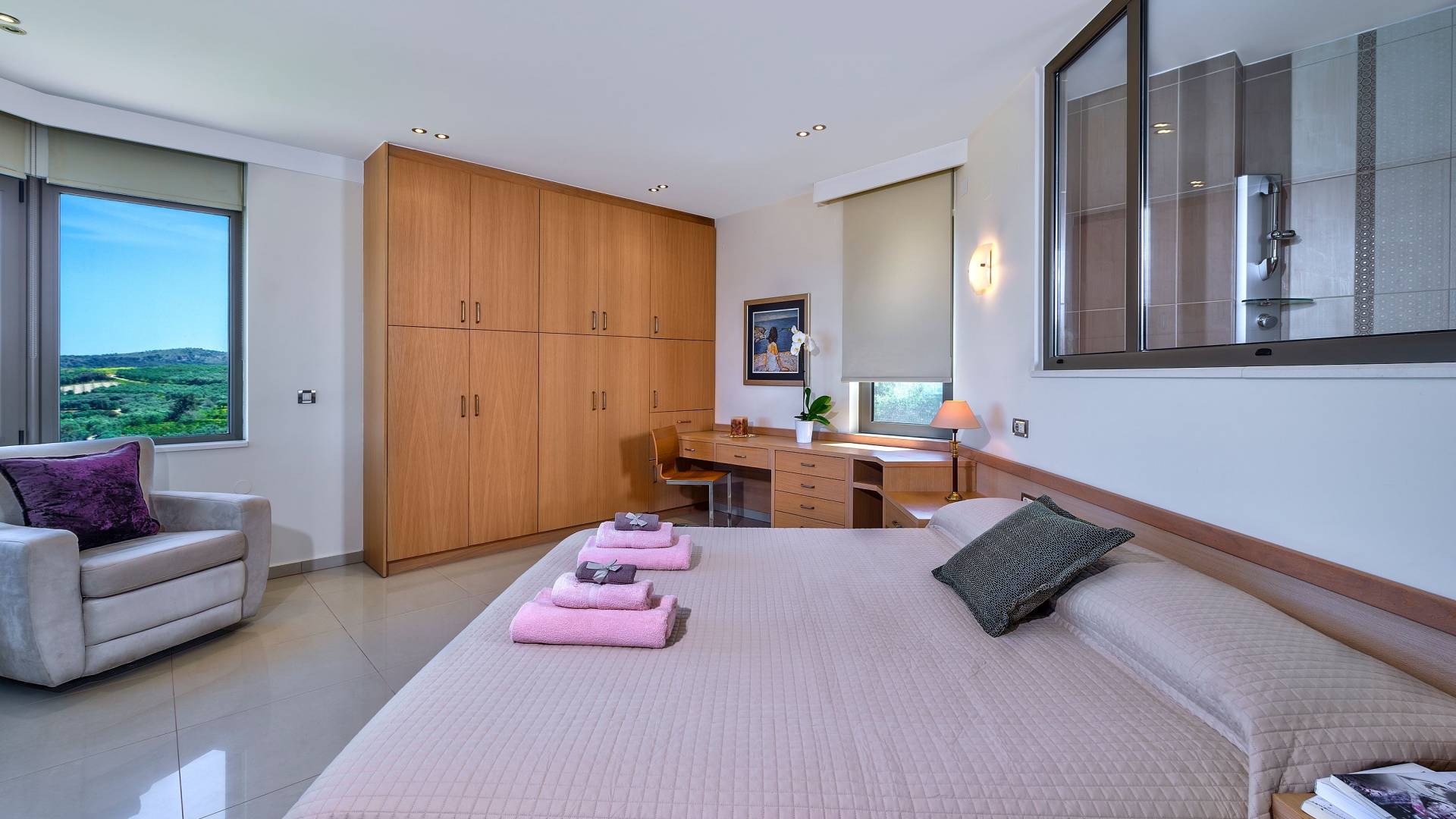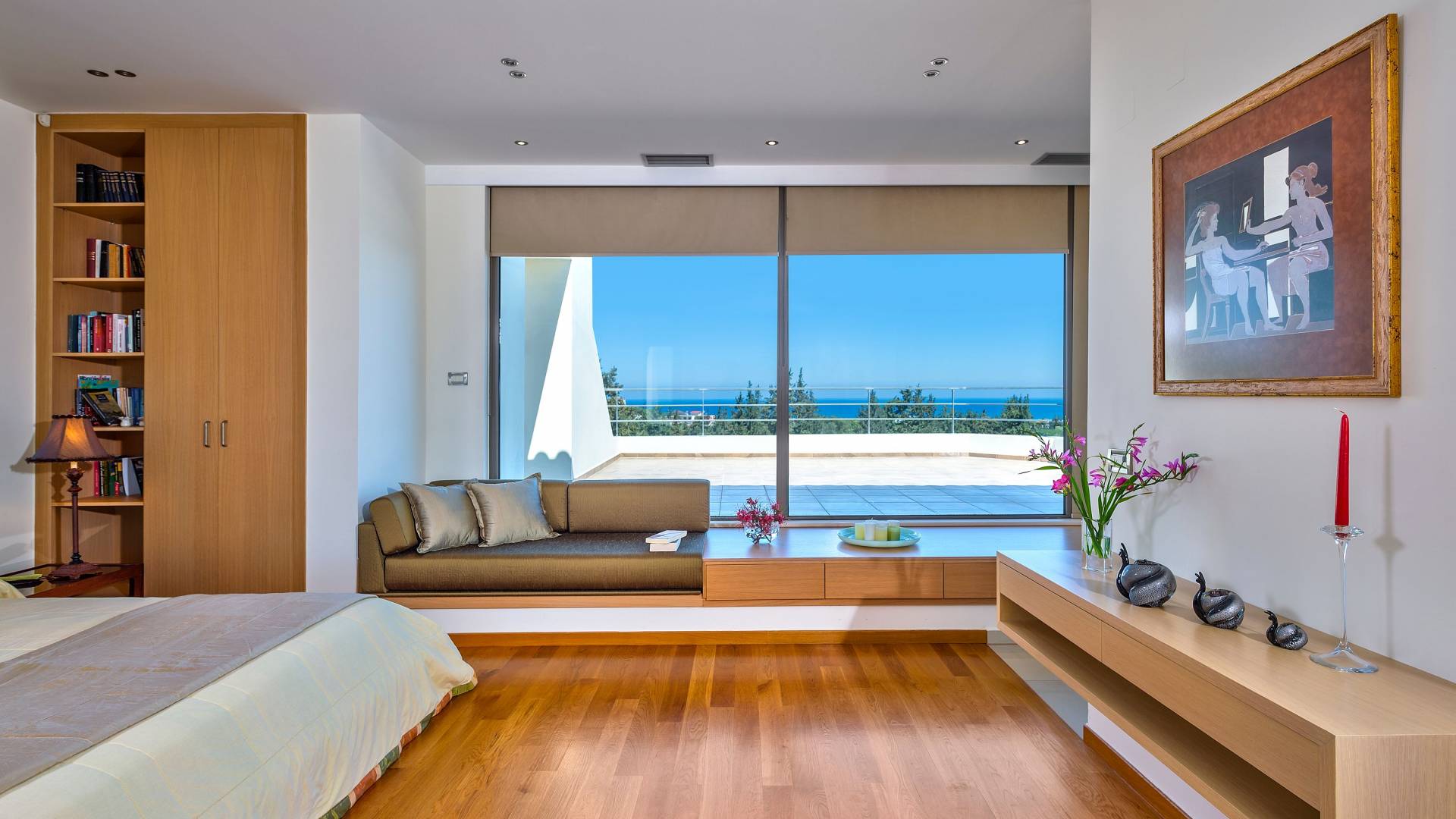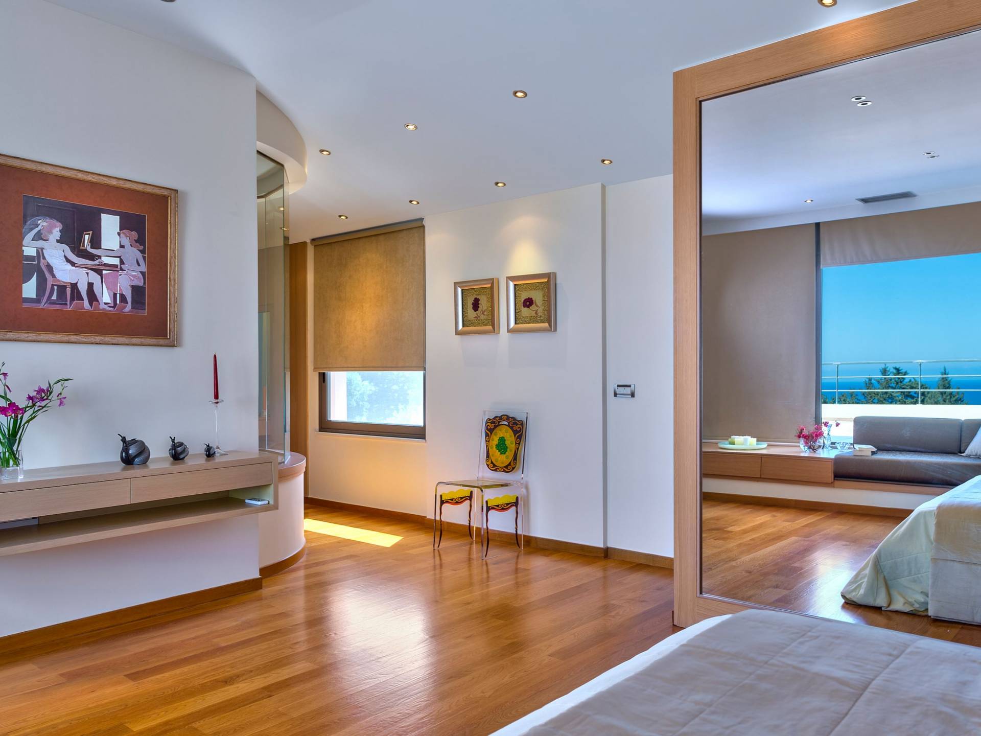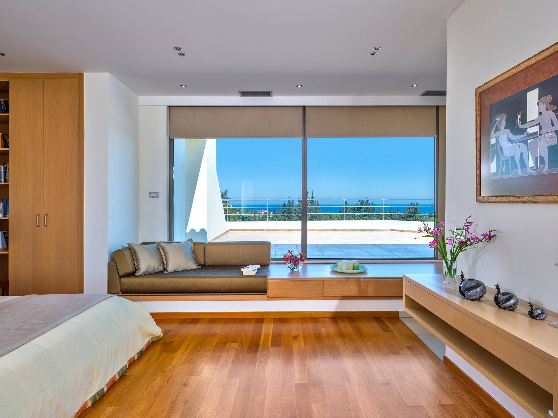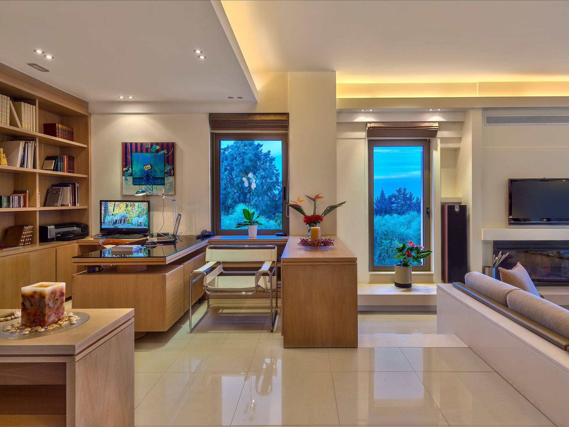 Aménagement intérieur : en entrant dans la villa Anastasia au rez-de-chaussée, vous trouverez un espace ouvert spacieux composé d'un salon avec une cheminée, d'une télévision HD par satellite de 40 pouces, d'une salle à manger intérieure et d'une cuisine entièrement équipée avec des accessoires de qualité supérieure et appareils électroménagers. Le salon s'ouvre sur une véranda avec un coin salon et une table à manger qui vous mène également à la piscine et au jardin. Un espace bureau organisé avec un système de son et un ordinateur portable et des toilettes se trouvent également au même étage. Le rez-de-chaussée accueille une chambre avec un lit king-size et une salle de bain en suite. Atteindre le premier étage par un escalier, il y a une chambre principale avec un lit king-size, un dressing et une salle de bain avec baignoire jacuzzi et douche hydro-massage. La chambre principale a accès à une grande véranda avec un coin salon qui offre une vue imprenable sur la mer.
