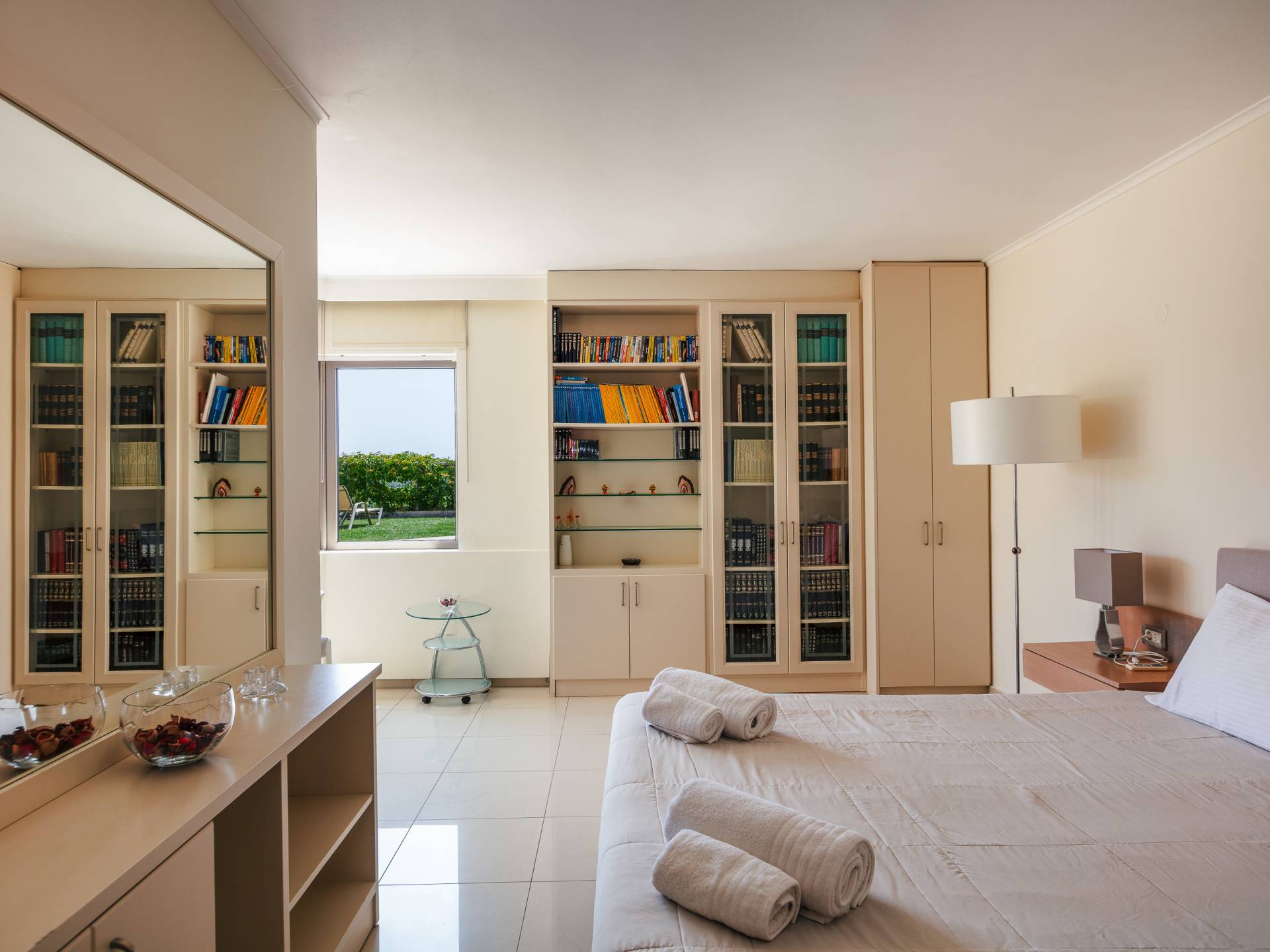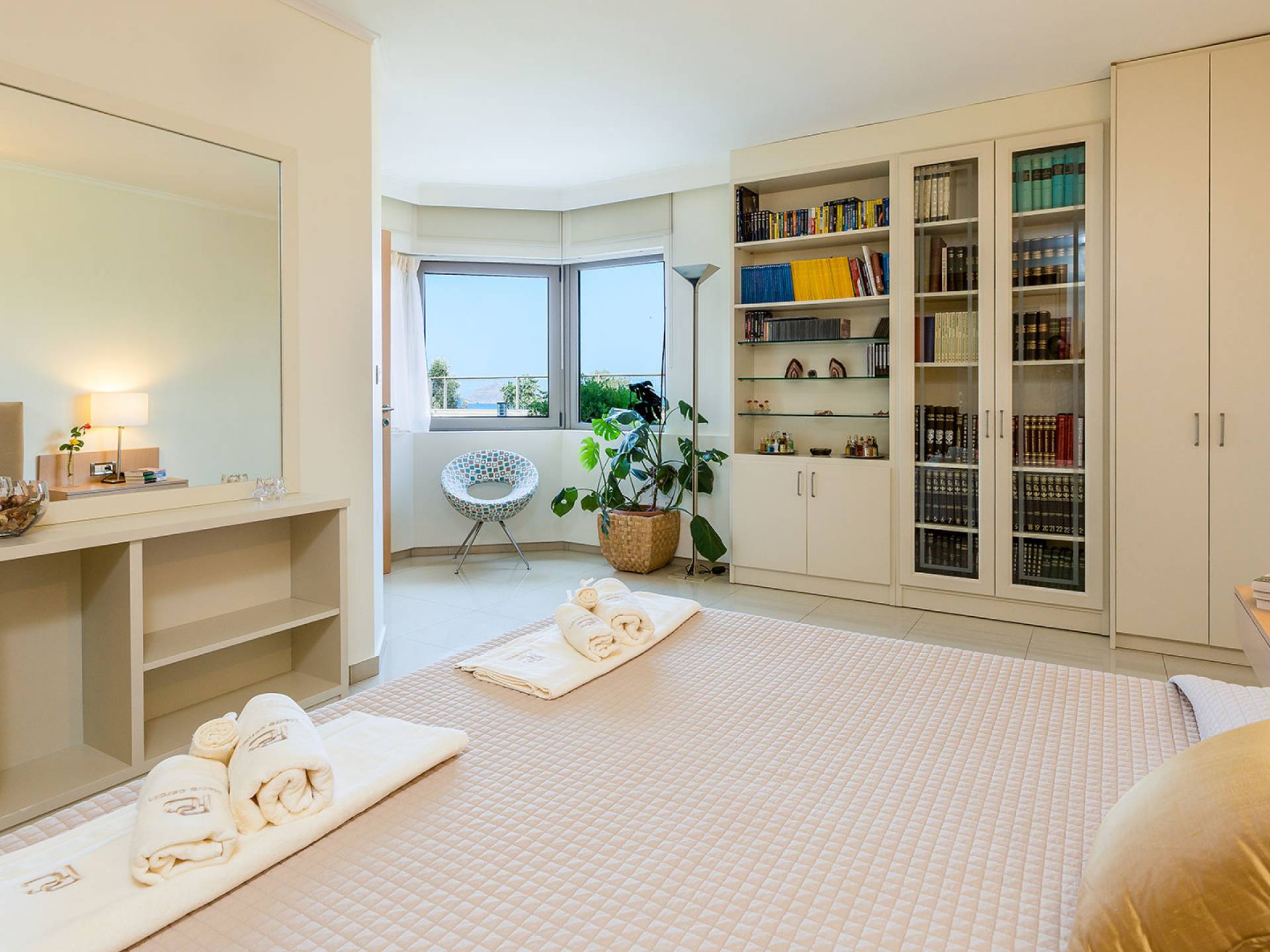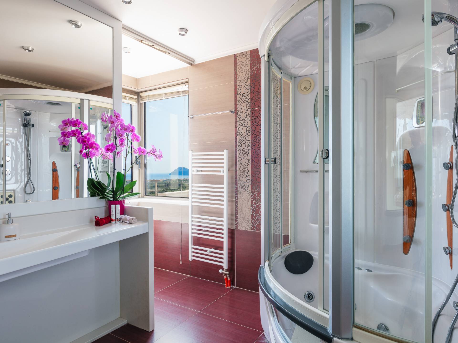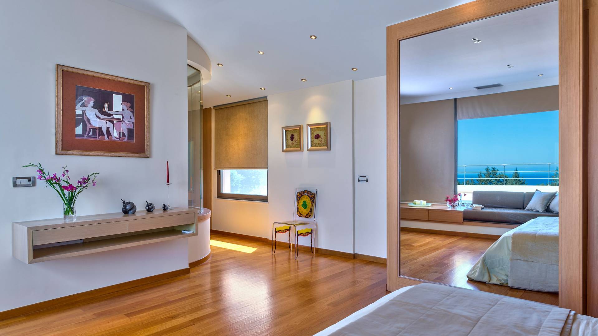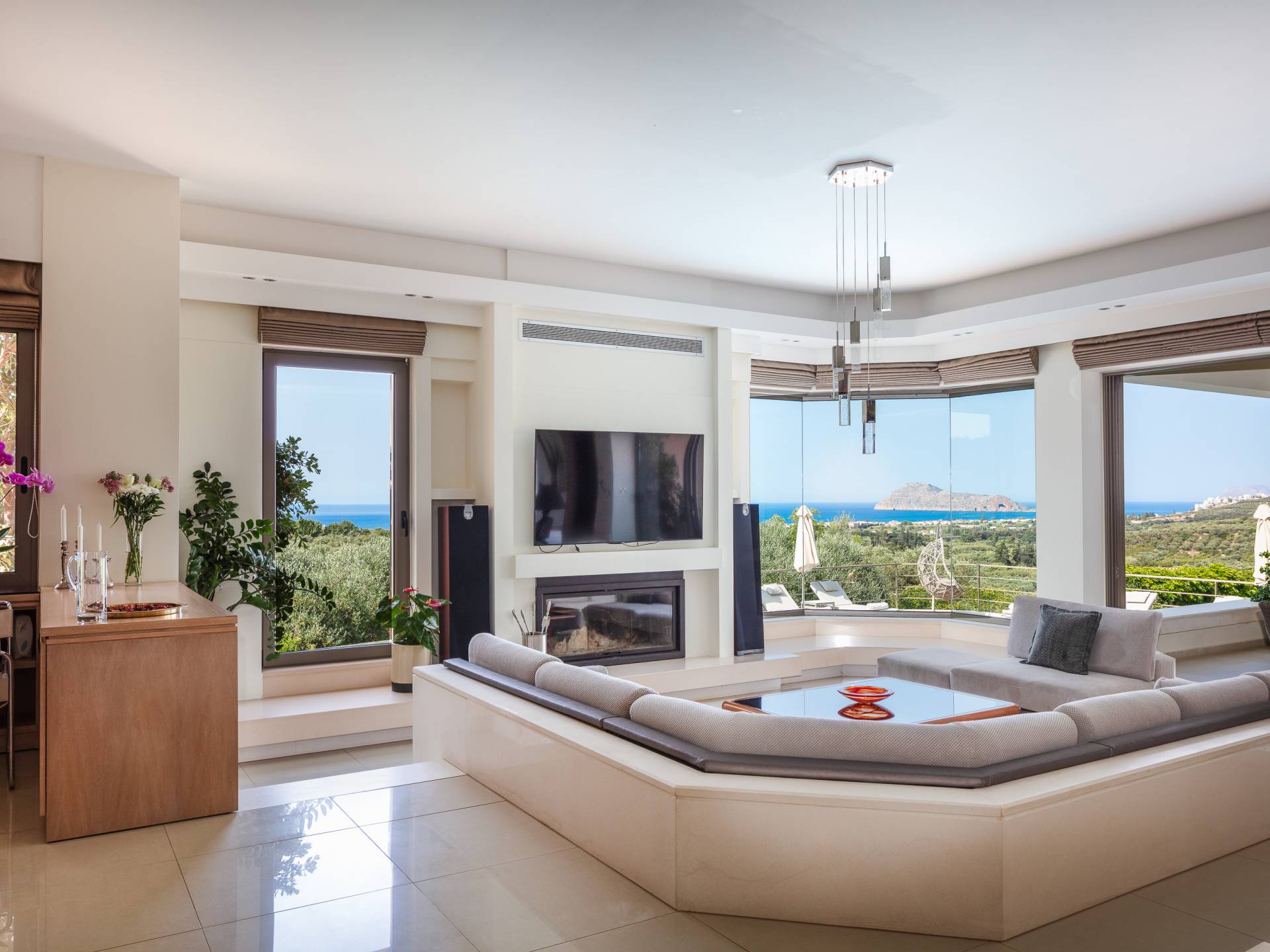 Aménagement intérieur : en entrant dans la villa Anastasia au rez-de-chaussée, vous trouverez un espace ouvert spacieux composé d'un salon avec une cheminée, d'une télévision HD par satellite de 40 pouces, d'une salle à manger intérieure et d'une cuisine entièrement équipée avec des accessoires de qualité supérieure et appareils électroménagers. Le salon s'ouvre sur une véranda avec un coin salon et une table à manger qui vous mène également à la piscine et au jardin. Un espace bureau organisé avec un système de son et un ordinateur portable et des toilettes se trouvent également au même étage. Le rez-de-chaussée accueille une chambre avec un lit king-size et une salle de bain en suite. Atteindre le premier étage par un escalier, il y a une chambre principale avec un lit king-size, un dressing et une salle de bain avec baignoire jacuzzi et douche hydro-massage. La chambre principale a accès à une grande véranda avec un coin salon qui offre une vue imprenable sur la mer.