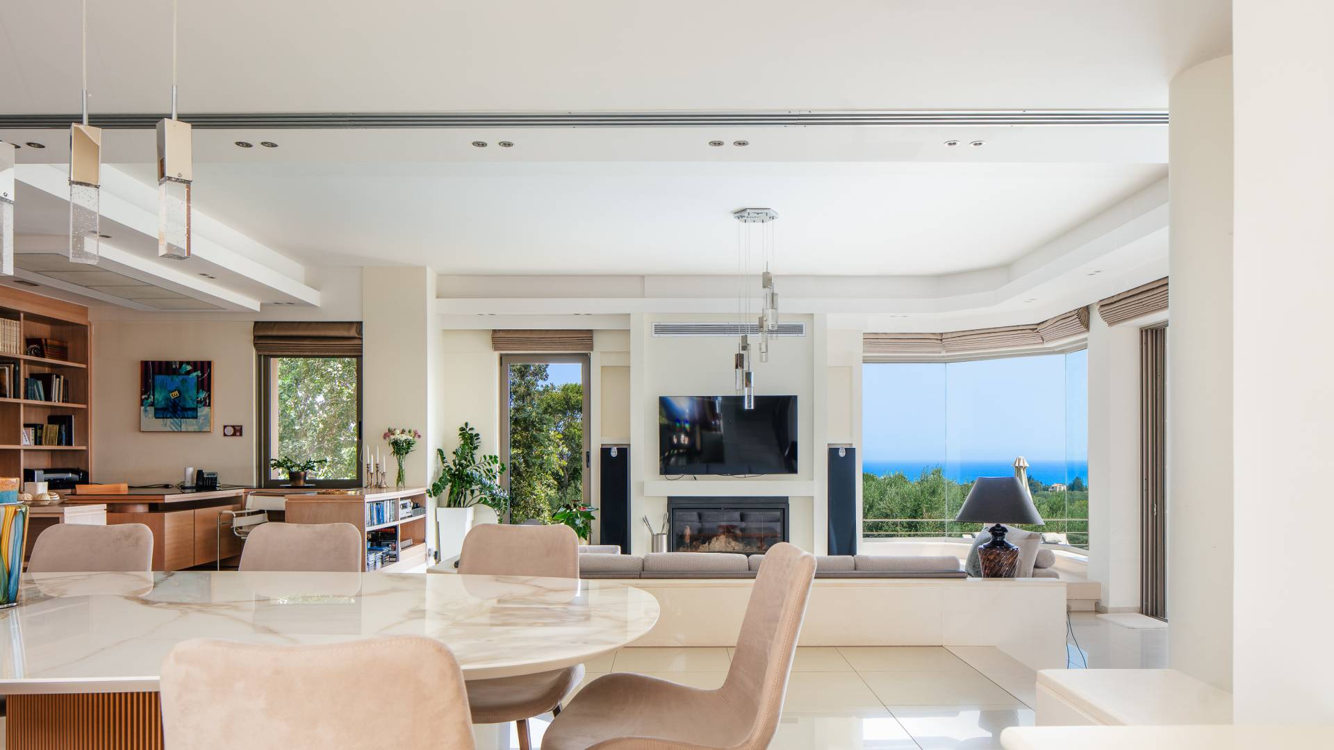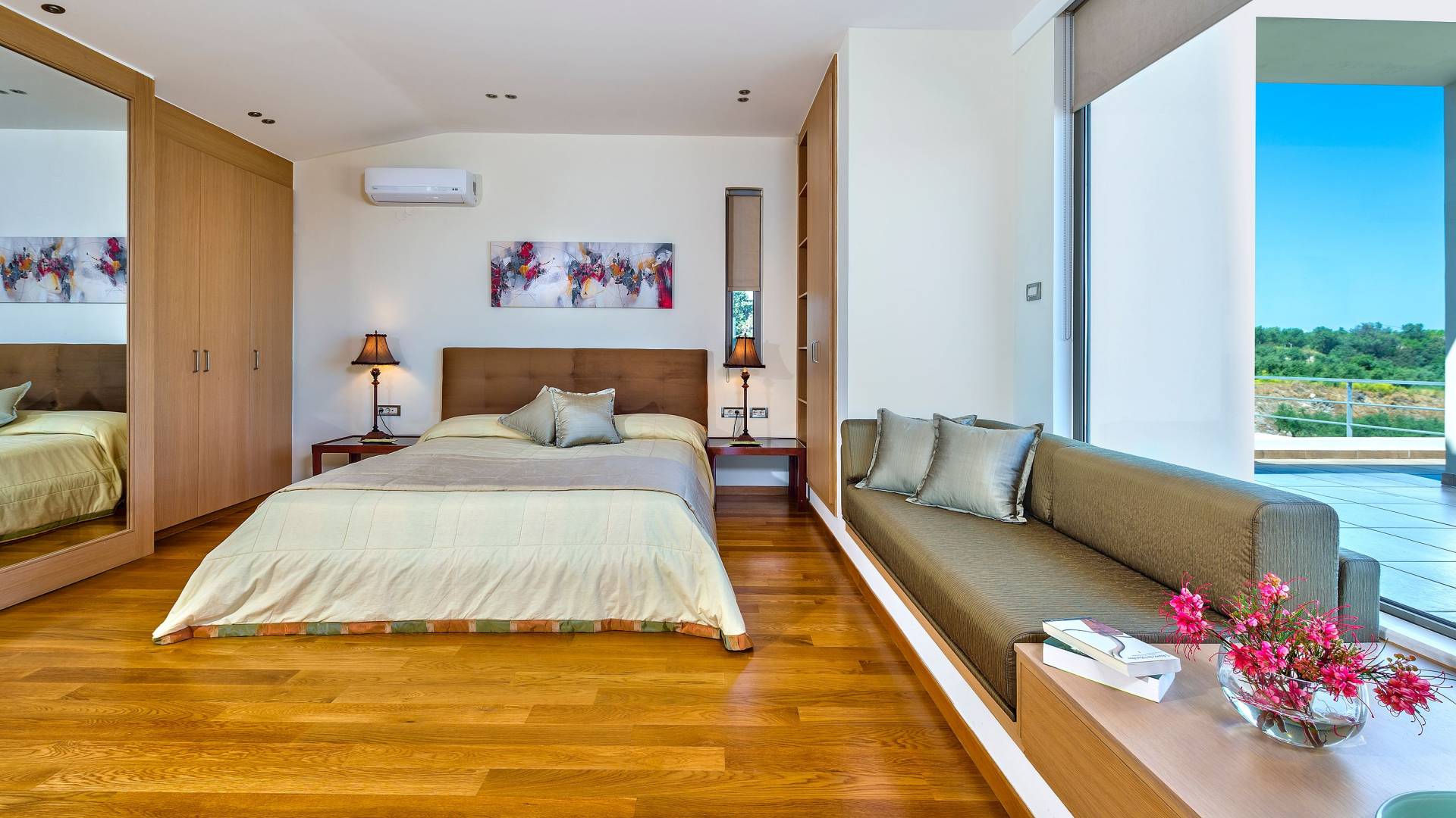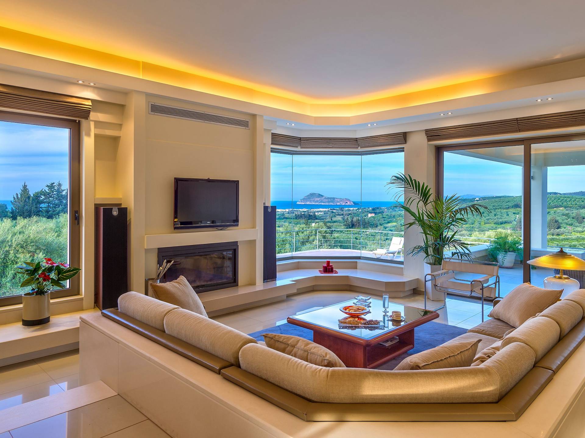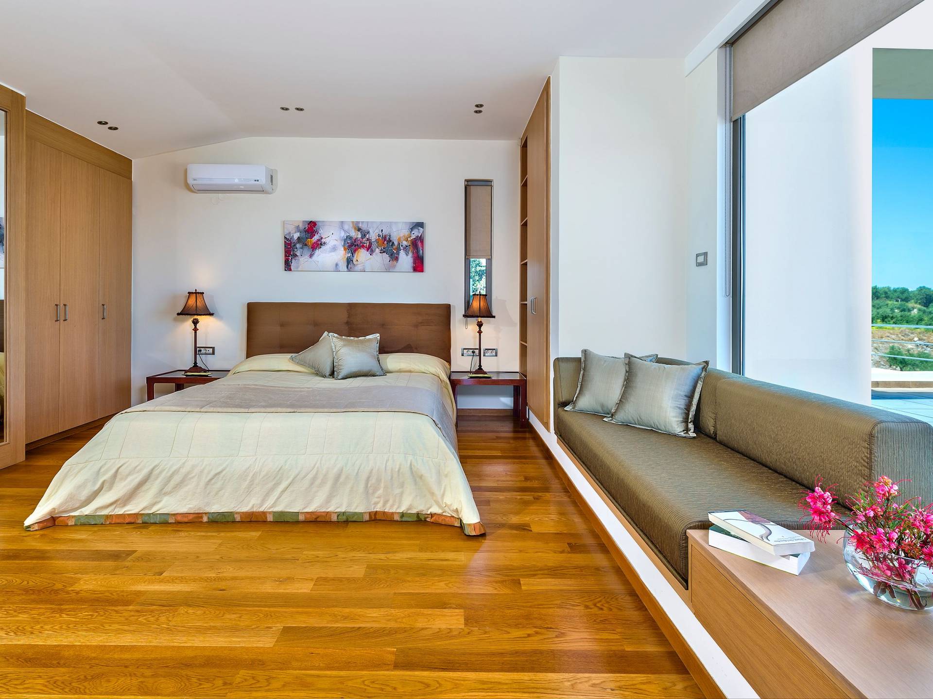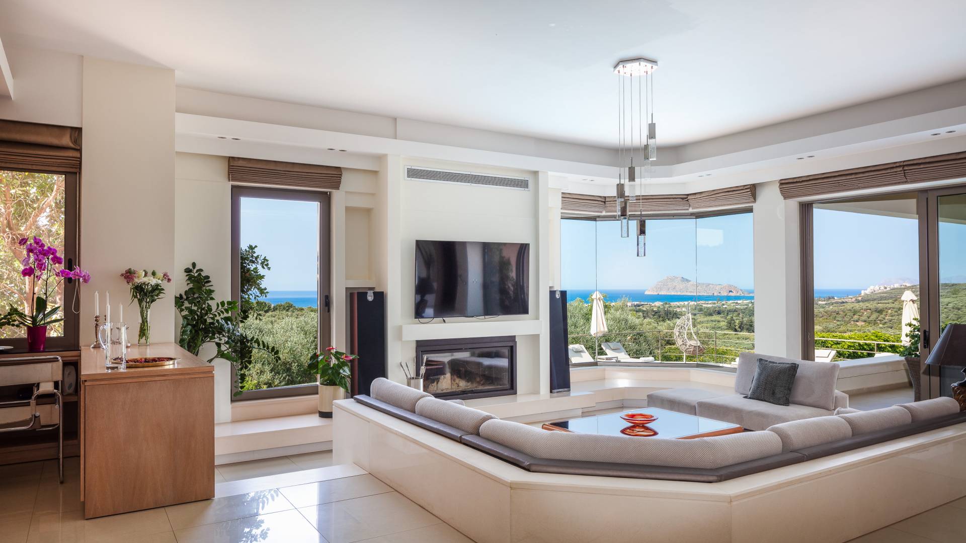 Aménagement intérieur : en entrant dans la villa Anastasia au rez-de-chaussée, vous trouverez un espace ouvert spacieux composé d'un salon avec une cheminée, d'une télévision HD par satellite de 40 pouces, d'une salle à manger intérieure et d'une cuisine entièrement équipée avec des accessoires de qualité supérieure et appareils électroménagers. Le salon s'ouvre sur une véranda avec un coin salon et une table à manger qui vous mène également à la piscine et au jardin. Un espace bureau organisé avec un système de son et un ordinateur portable et des toilettes se trouvent également au même étage. Le rez-de-chaussée accueille une chambre avec un lit king-size et une salle de bain en suite. Atteindre le premier étage par un escalier, il y a une chambre principale avec un lit king-size, un dressing et une salle de bain avec baignoire jacuzzi et douche hydro-massage. La chambre principale a accès à une grande véranda avec un coin salon qui offre une vue imprenable sur la mer.