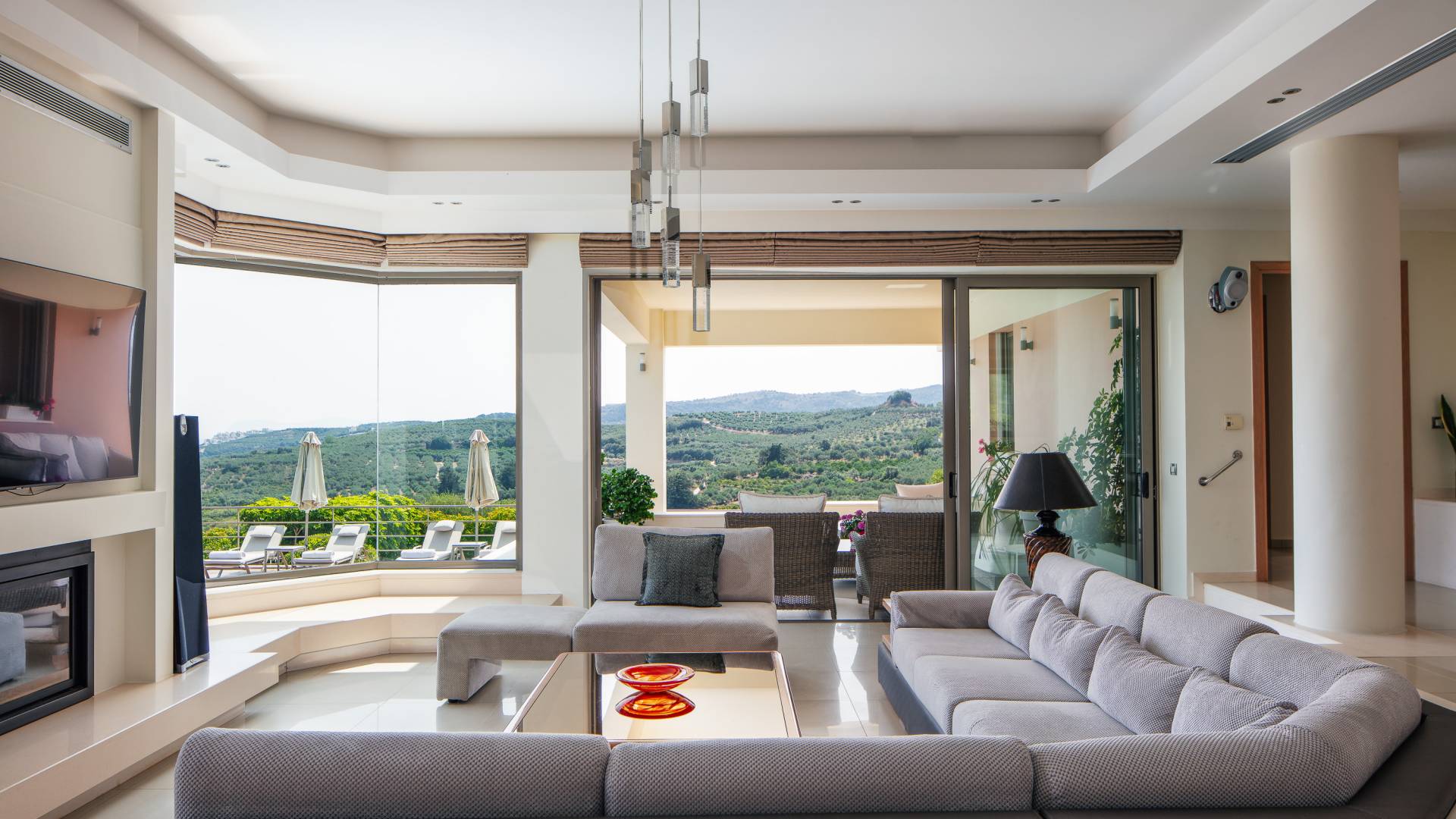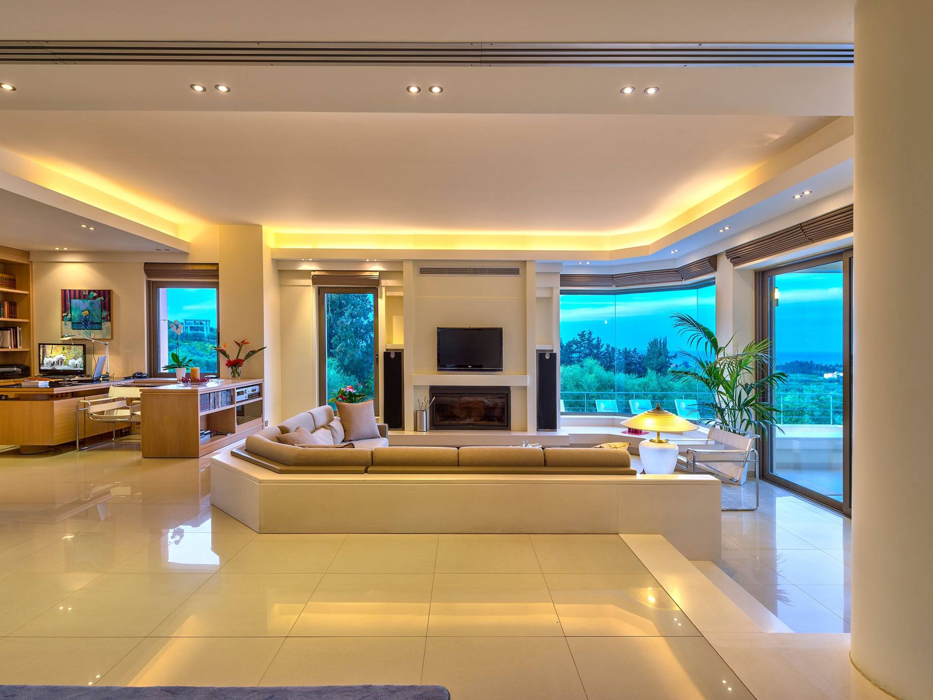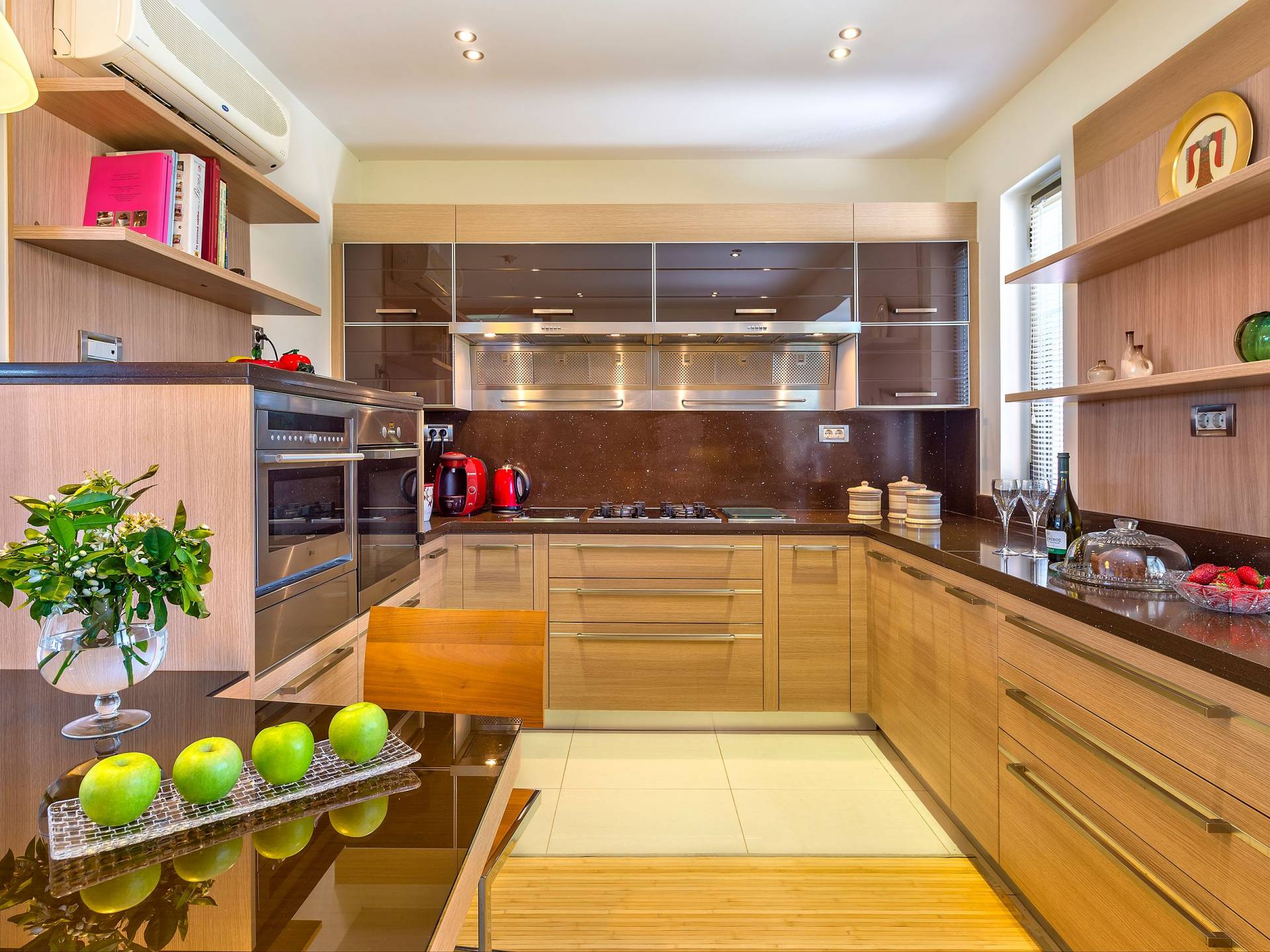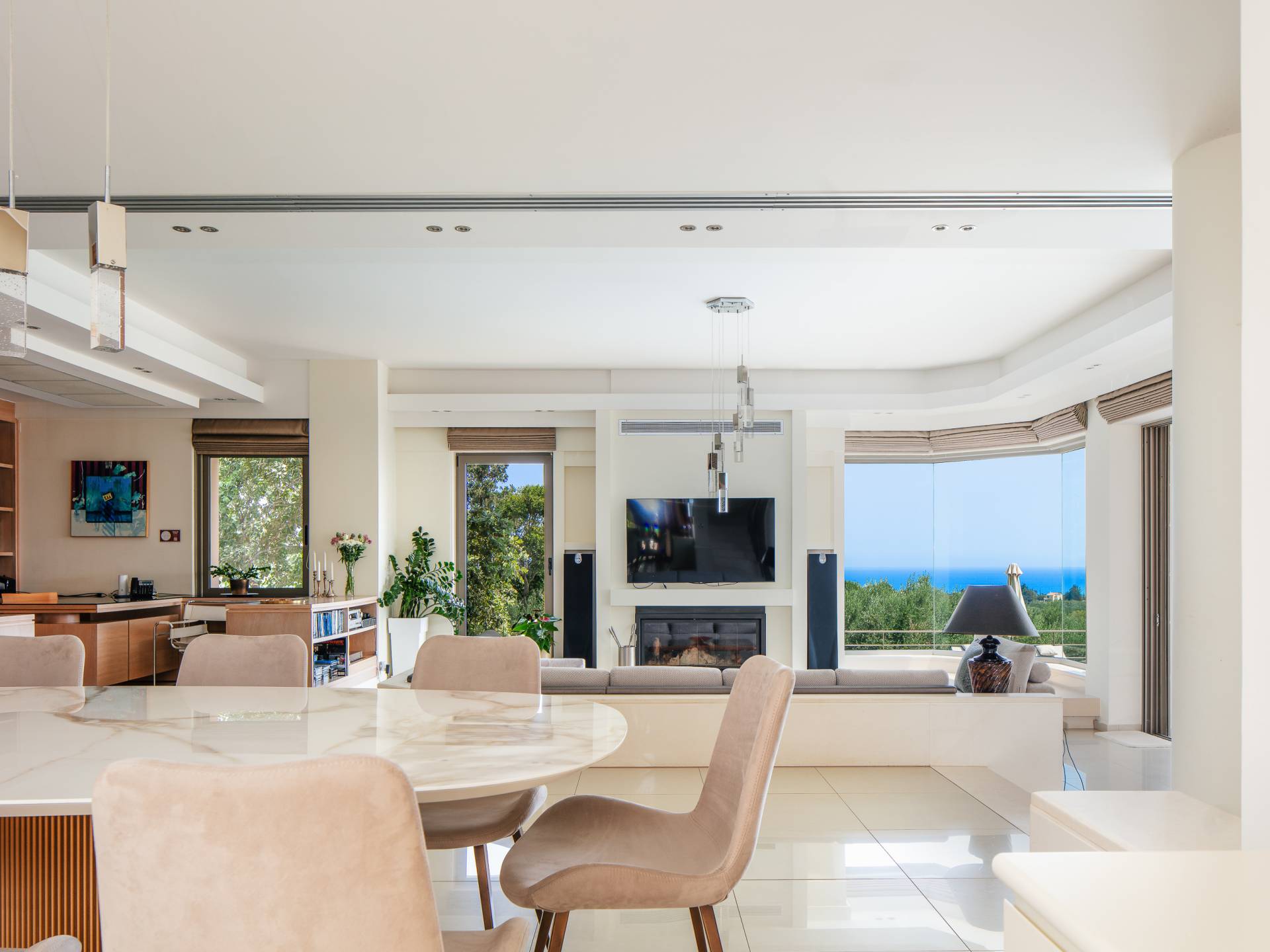 Aménagement intérieur : en entrant dans la villa Anastasia au rez-de-chaussée, vous trouverez un espace ouvert spacieux composé d'un salon avec une cheminée, d'une télévision HD par satellite de 40 pouces, d'une salle à manger intérieure et d'une cuisine entièrement équipée avec des accessoires de qualité supérieure et appareils électroménagers. Le salon s'ouvre sur une véranda avec un coin salon et une table à manger qui vous mène également à la piscine et au jardin. Un espace bureau organisé avec un système de son et un ordinateur portable et des toilettes se trouvent également au même étage. Le rez-de-chaussée accueille une chambre avec un lit king-size et une salle de bain en suite. Atteindre le premier étage par un escalier, il y a une chambre principale avec un lit king-size, un dressing et une salle de bain avec baignoire jacuzzi et douche hydro-massage. La chambre principale a accès à une grande véranda avec un coin salon qui offre une vue imprenable sur la mer.