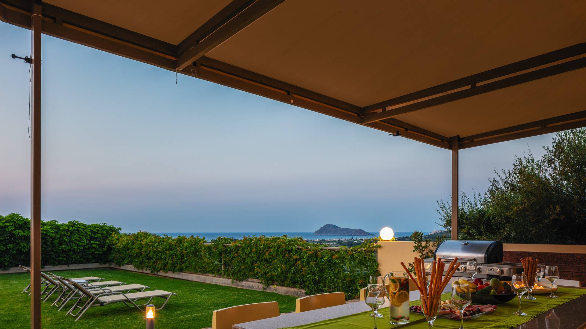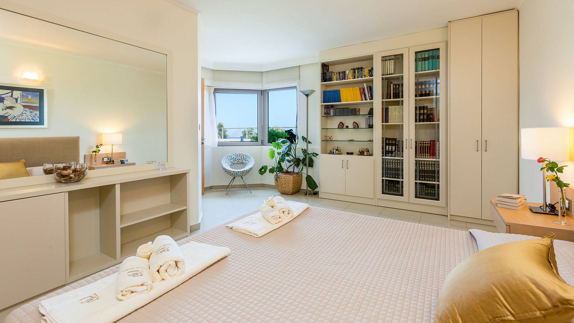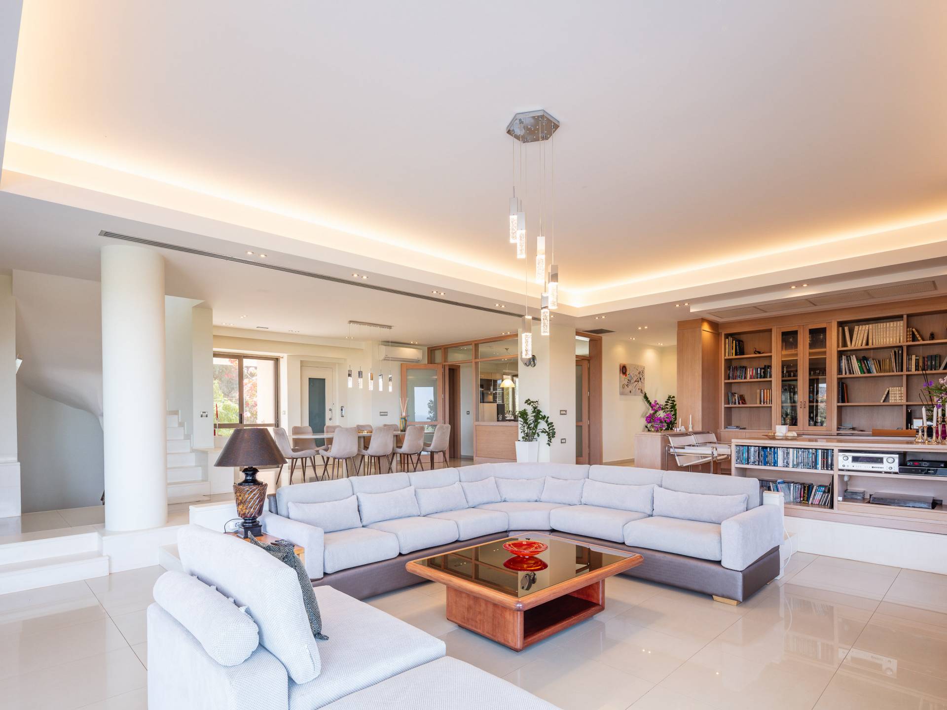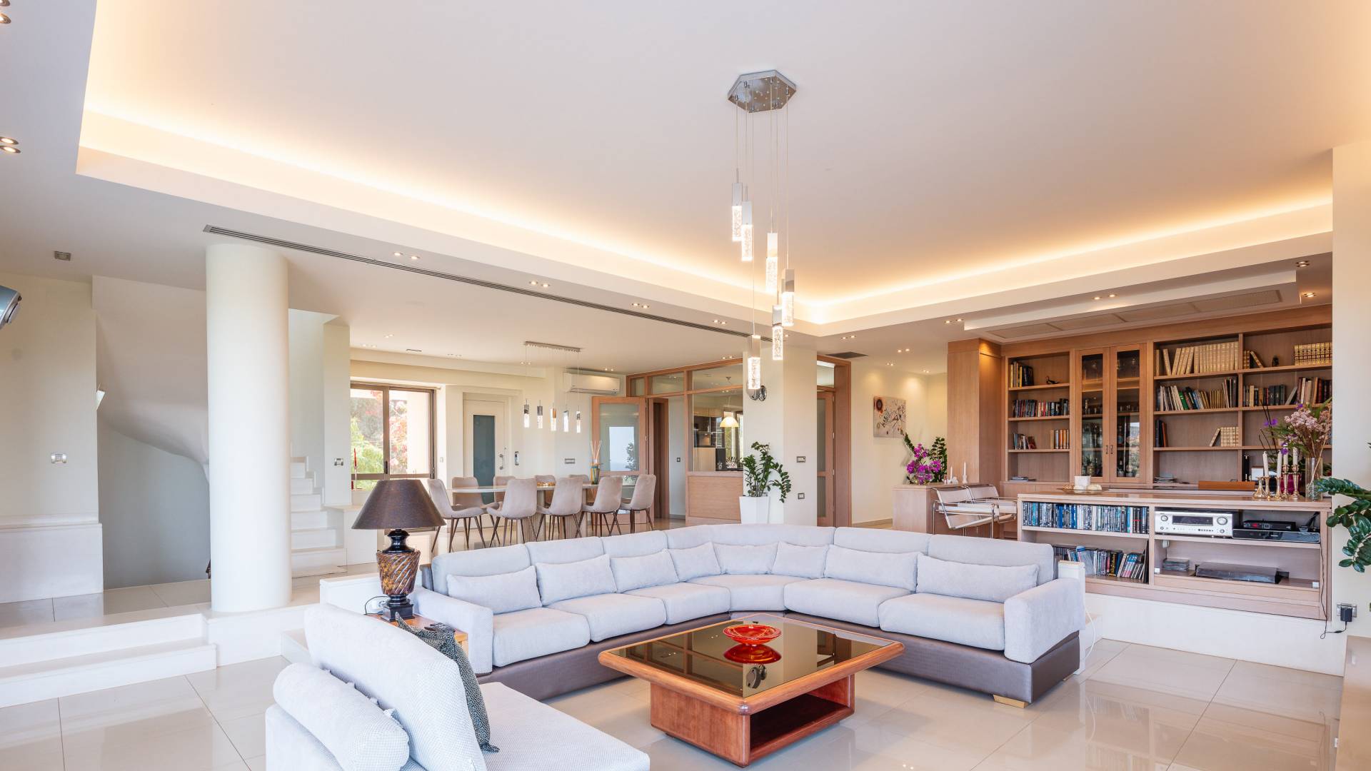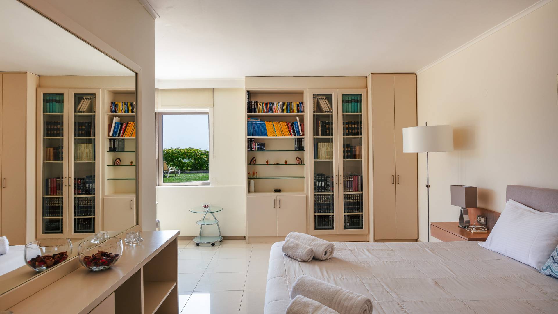 Aménagement intérieur : en entrant dans la villa Anastasia au rez-de-chaussée, vous trouverez un espace ouvert spacieux composé d'un salon avec une cheminée, d'une télévision HD par satellite de 40 pouces, d'une salle à manger intérieure et d'une cuisine entièrement équipée avec des accessoires de qualité supérieure et appareils électroménagers. Le salon s'ouvre sur une véranda avec un coin salon et une table à manger qui vous mène également à la piscine et au jardin. Un espace bureau organisé avec un système de son et un ordinateur portable et des toilettes se trouvent également au même étage. Le rez-de-chaussée accueille une chambre avec un lit king-size et une salle de bain en suite. Atteindre le premier étage par un escalier, il y a une chambre principale avec un lit king-size, un dressing et une salle de bain avec baignoire jacuzzi et douche hydro-massage. La chambre principale a accès à une grande véranda avec un coin salon qui offre une vue imprenable sur la mer.