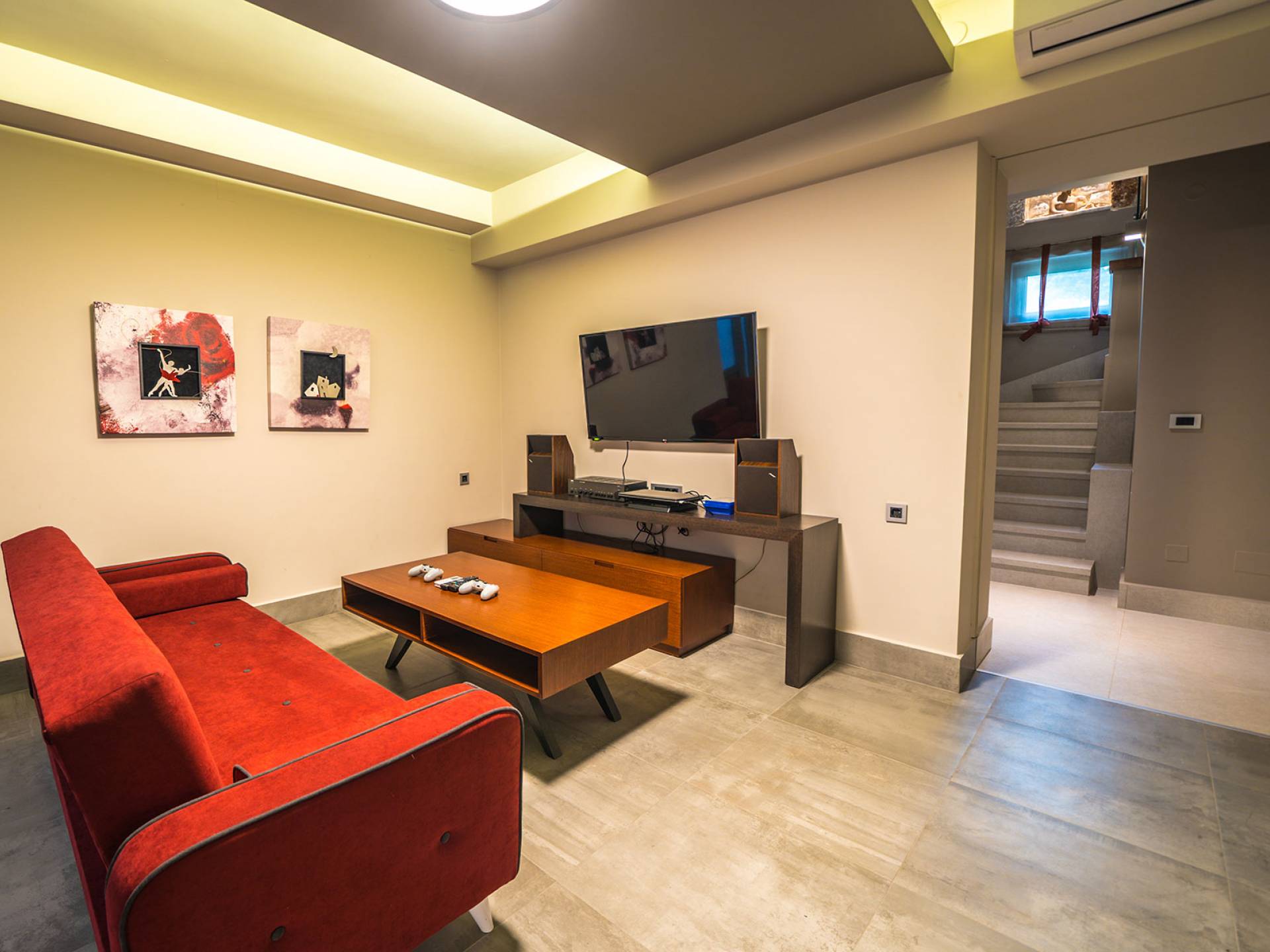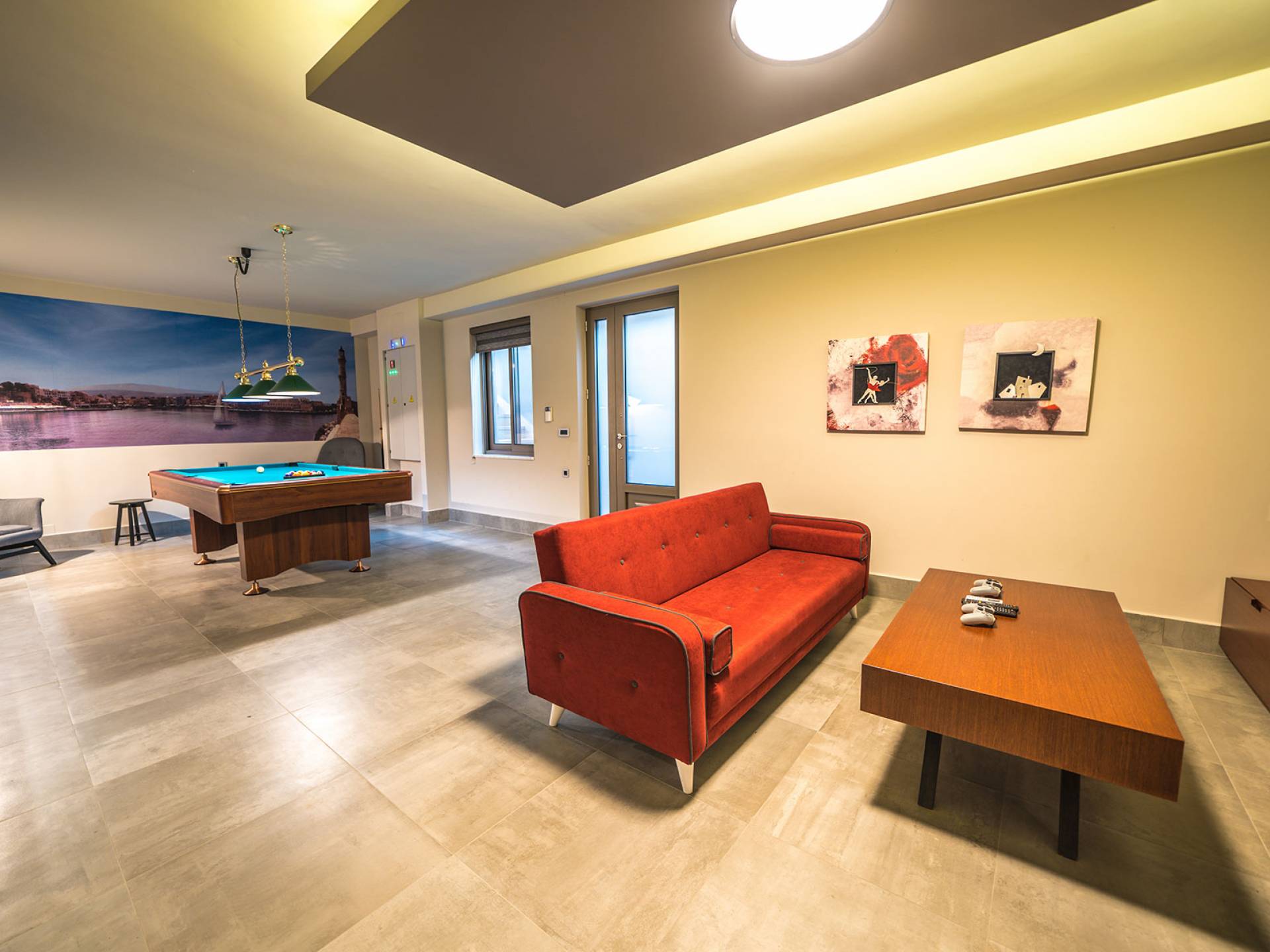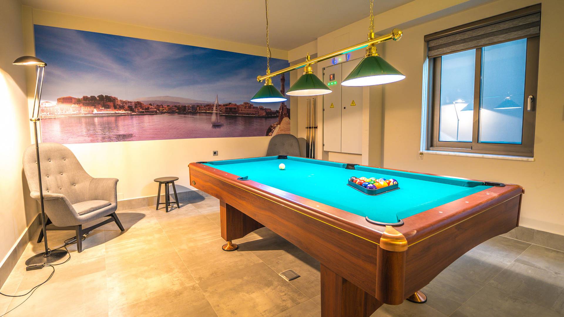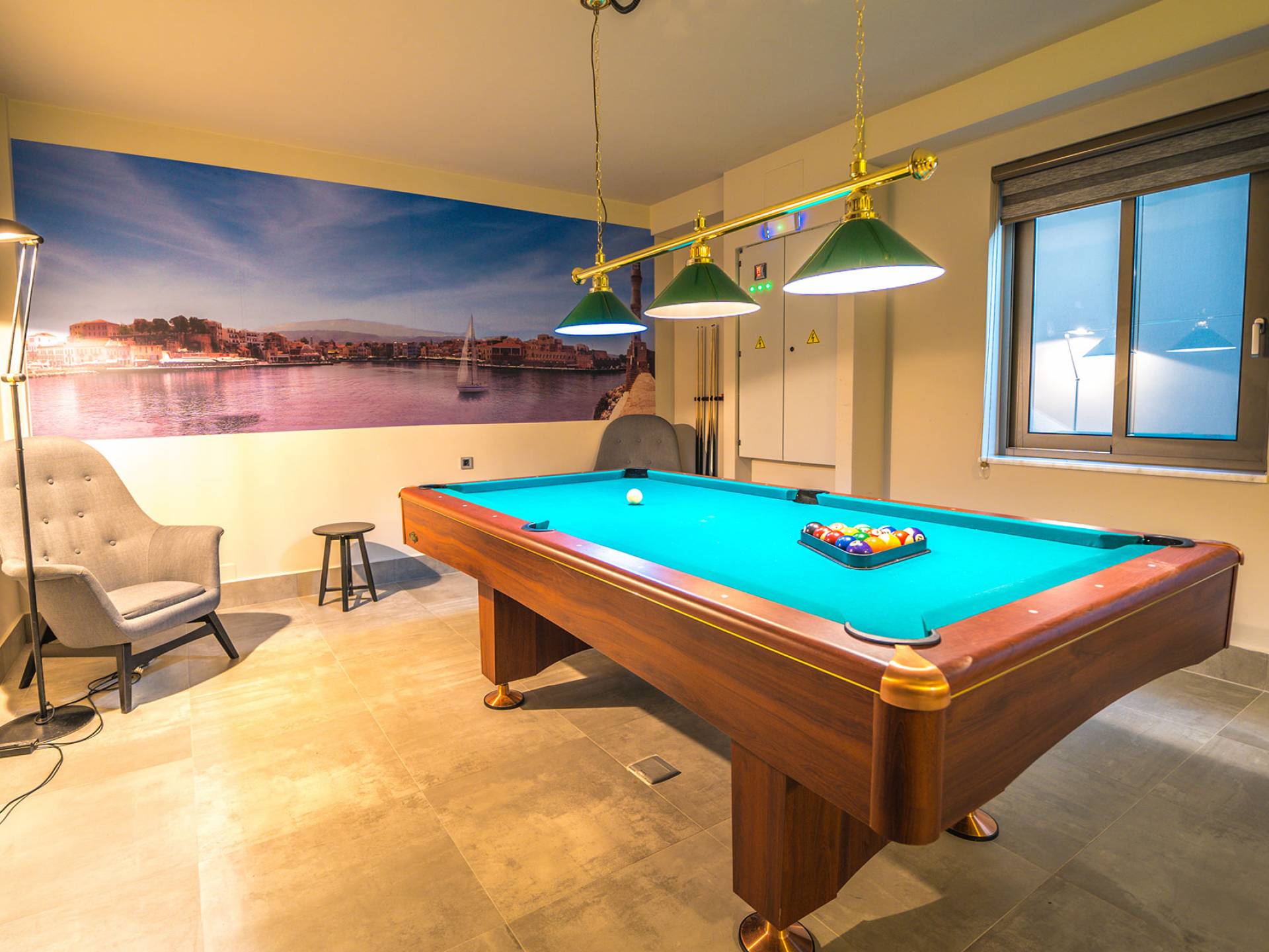 Ariadne Villa Chania se compose de 3 niveaux et peut accueillir jusqu'à 8 adultes + 1 enfant. Au rez-de-chaussée, il y a le salon principal avec de grands et confortables canapés, un coin repas et une cuisine entièrement équipée. Il y a aussi 2 chambres avec lits doubles qui partagent une salle de bain avec douche. Au premier étage, il y a une autre chambre avec un grand lit double et une salle de bain avec douche. À l'étage inférieur, il y a un autre salon, une chambre avec une salle de bain en suite et une salle de jeux avec une salle de gym et une table de billard.