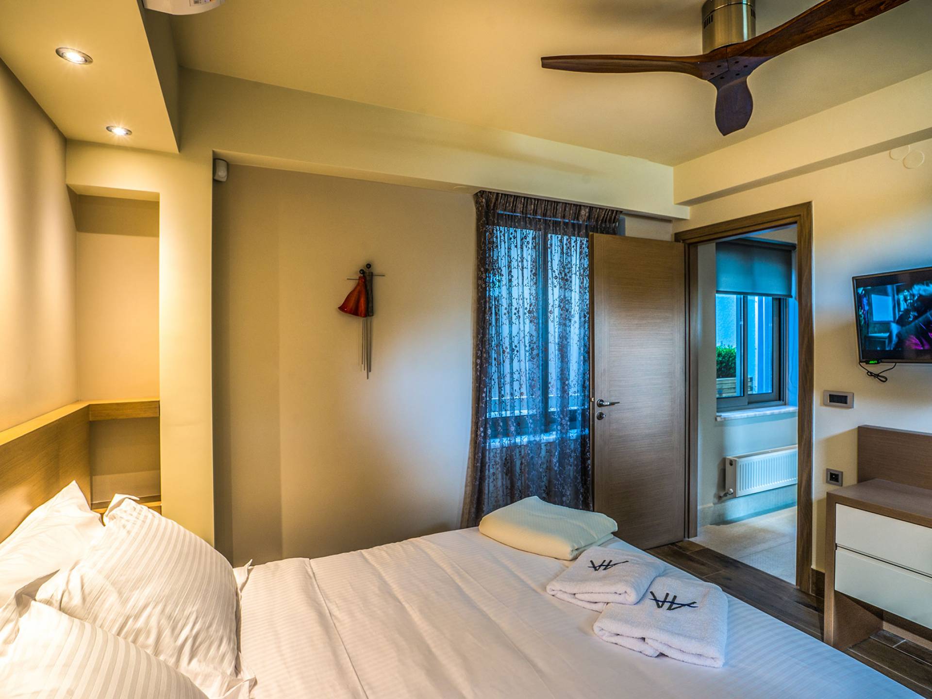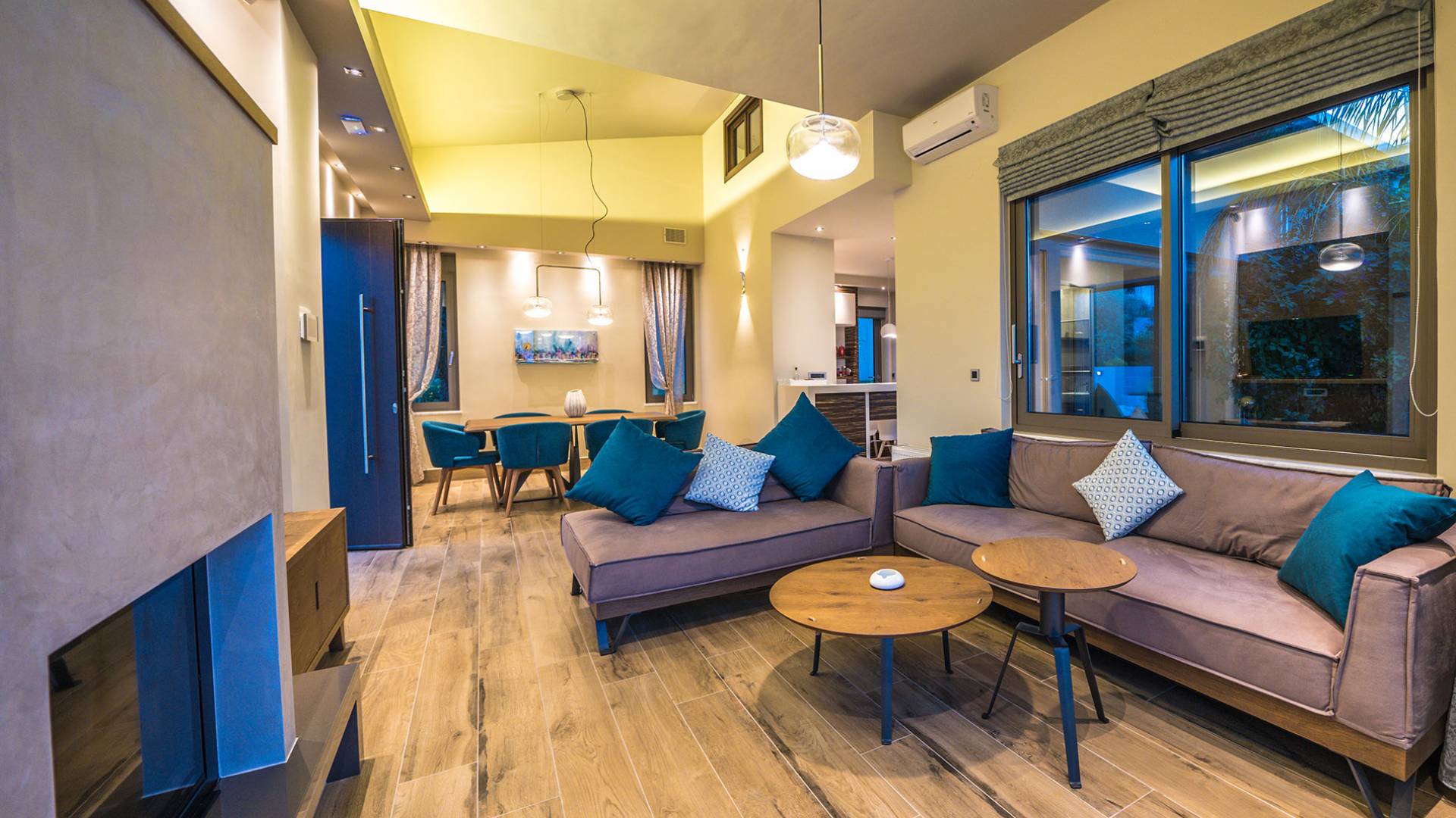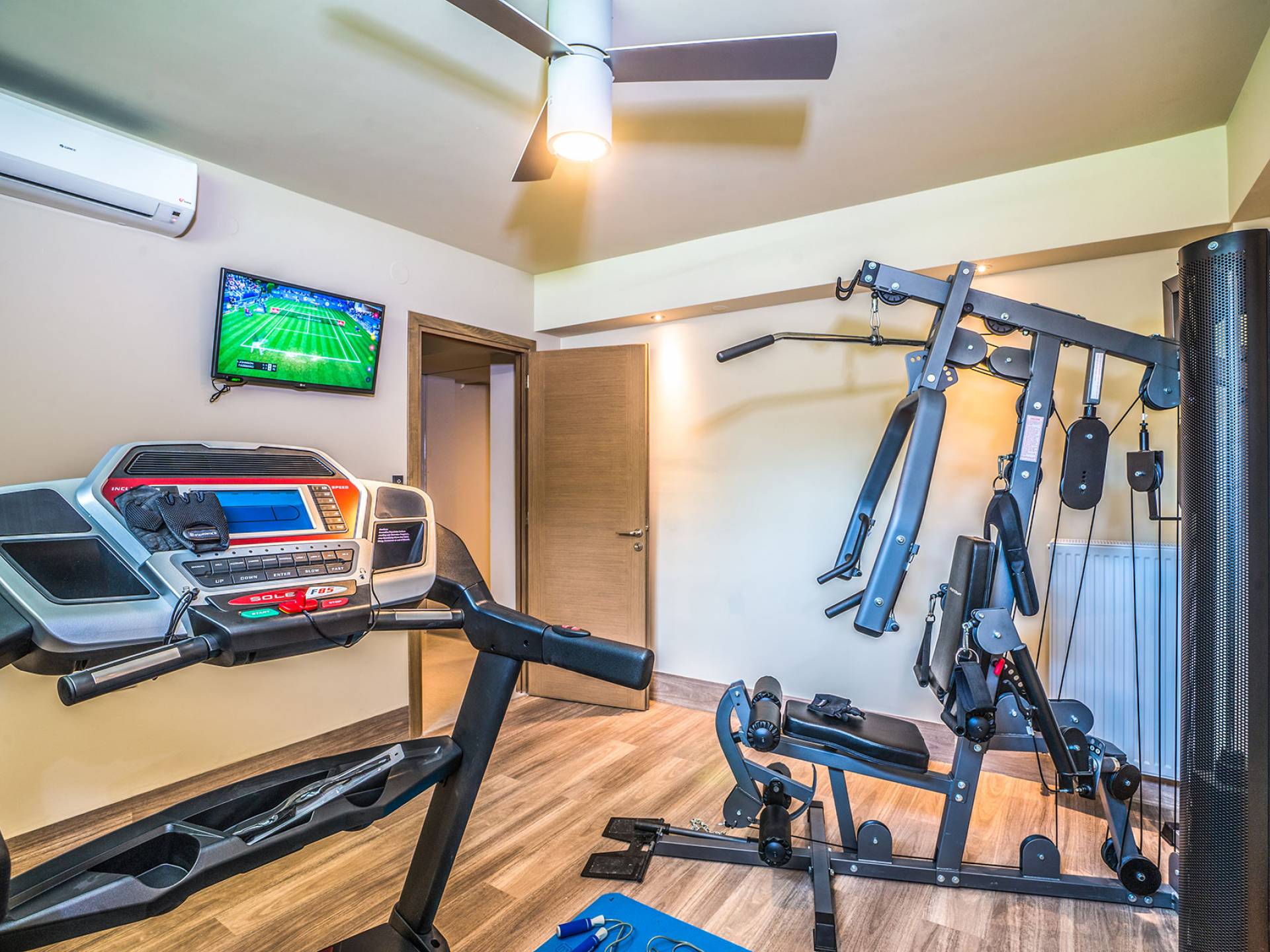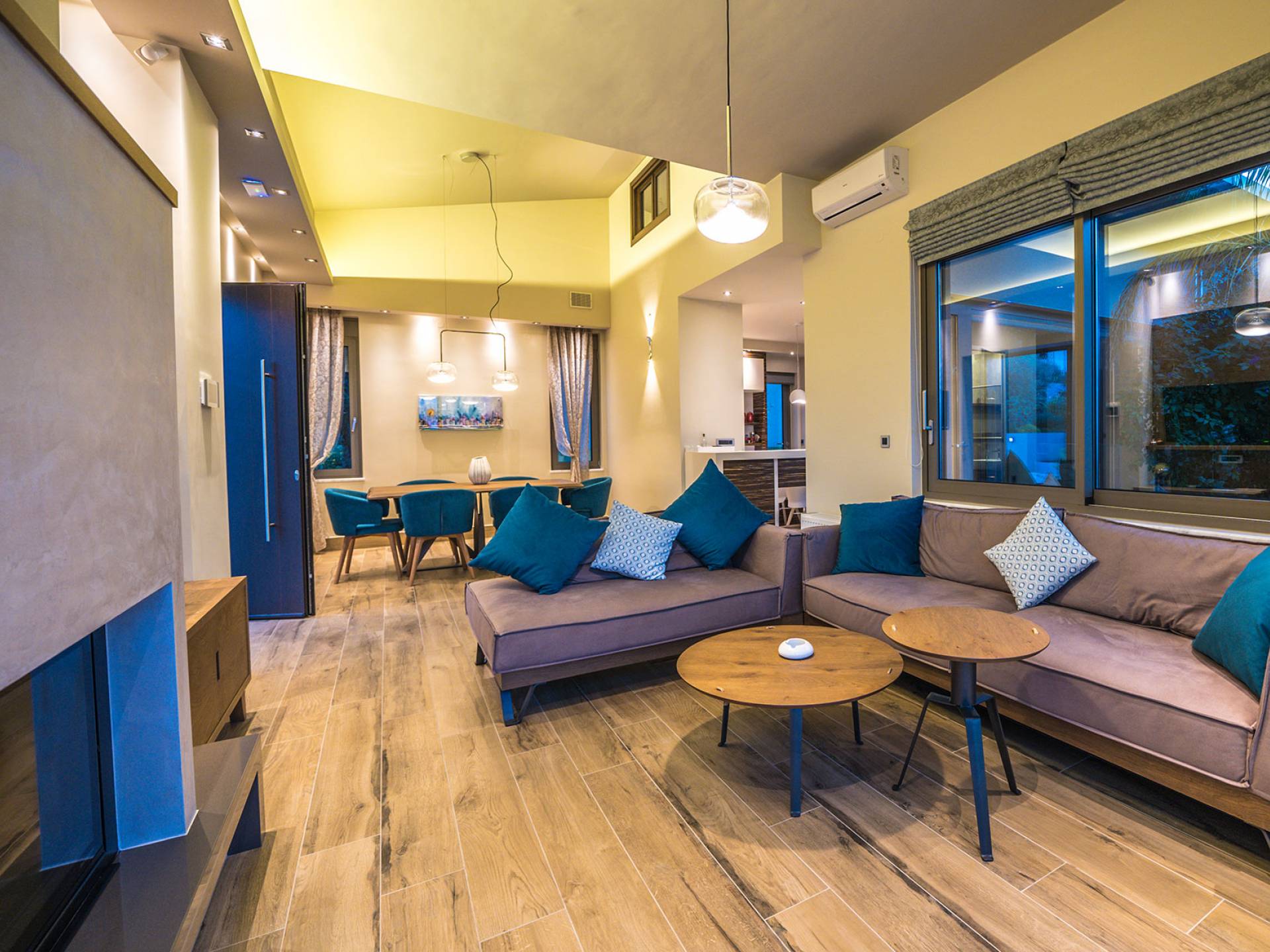 Ariadne Villa Chania se compose de 3 niveaux et peut accueillir jusqu'à 8 adultes + 1 enfant. Au rez-de-chaussée, il y a le salon principal avec de grands et confortables canapés, un coin repas et une cuisine entièrement équipée. Il y a aussi 2 chambres avec lits doubles qui partagent une salle de bain avec douche. Au premier étage, il y a une autre chambre avec un grand lit double et une salle de bain avec douche. À l'étage inférieur, il y a un autre salon, une chambre avec une salle de bain en suite et une salle de jeux avec une salle de gym et une table de billard.